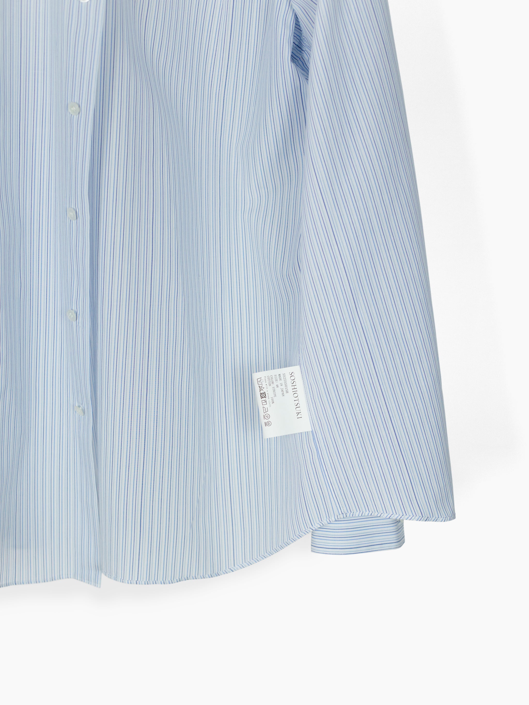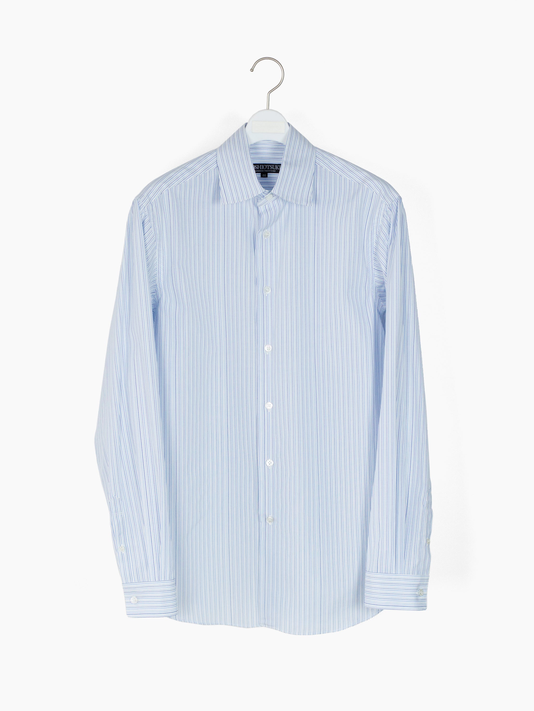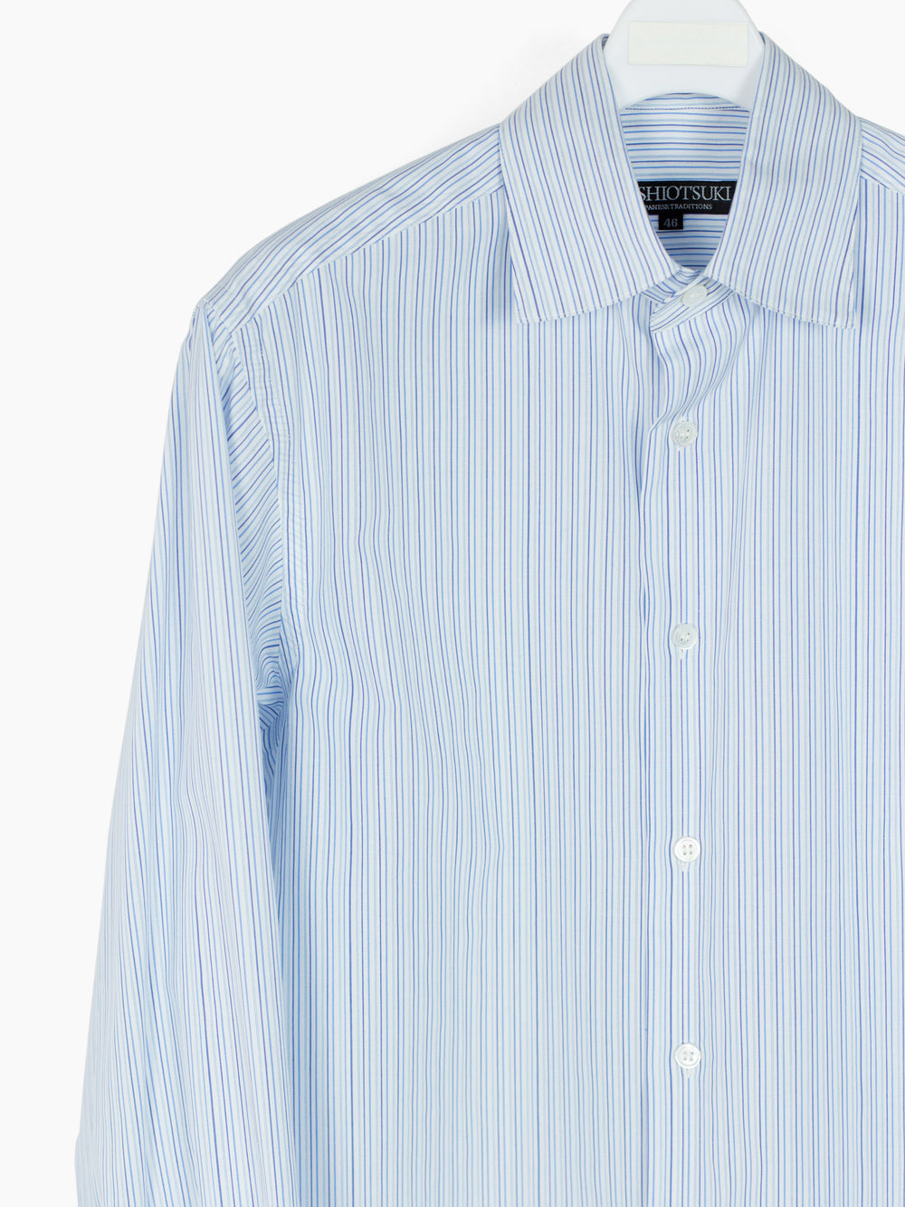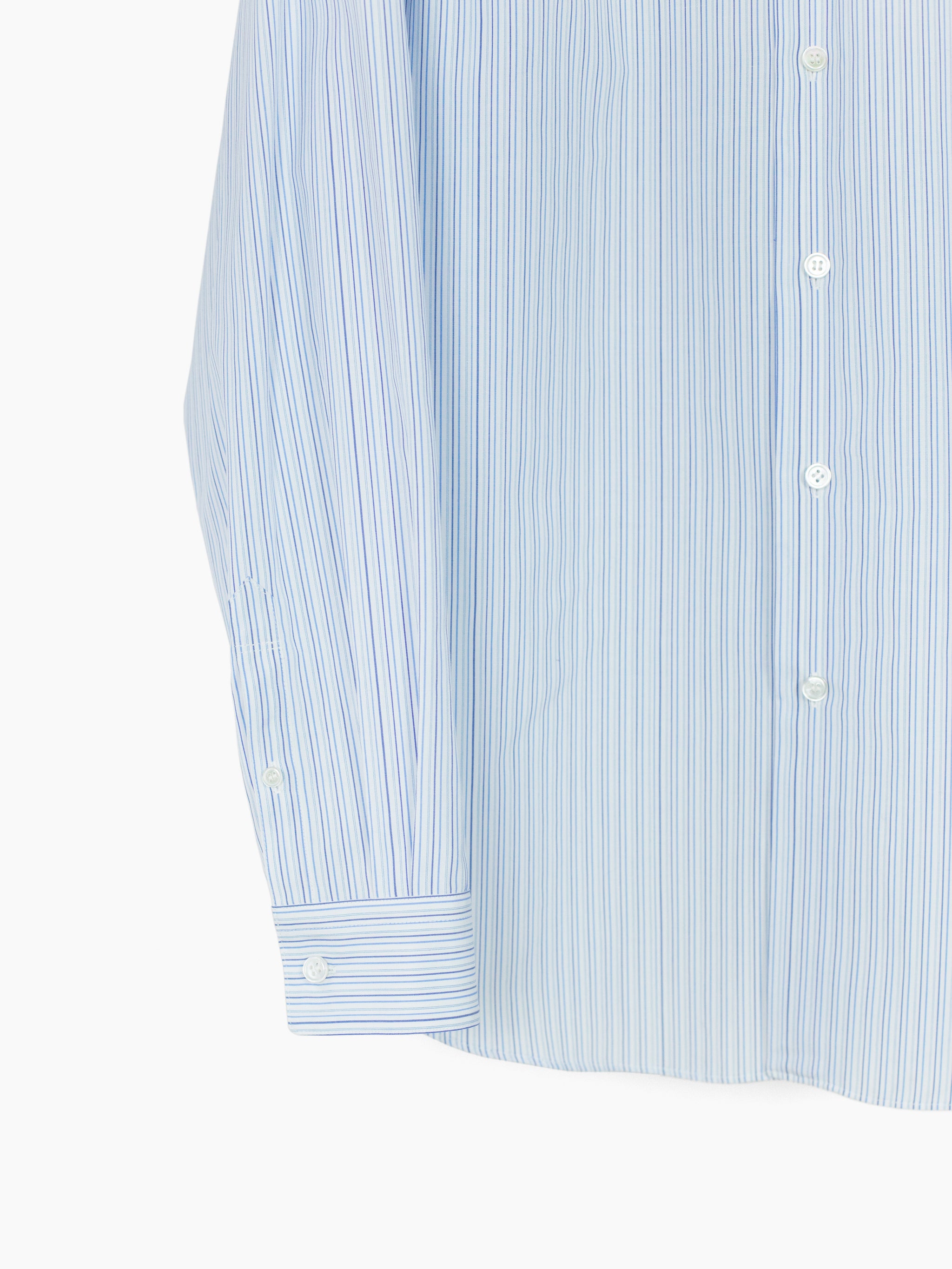 White/blue striped superfine cotton shirt with 'Manica Camicia' puckering at the sleeve cap, a subtle feminine-leaning intervention on the traditional men's button-down shirt.