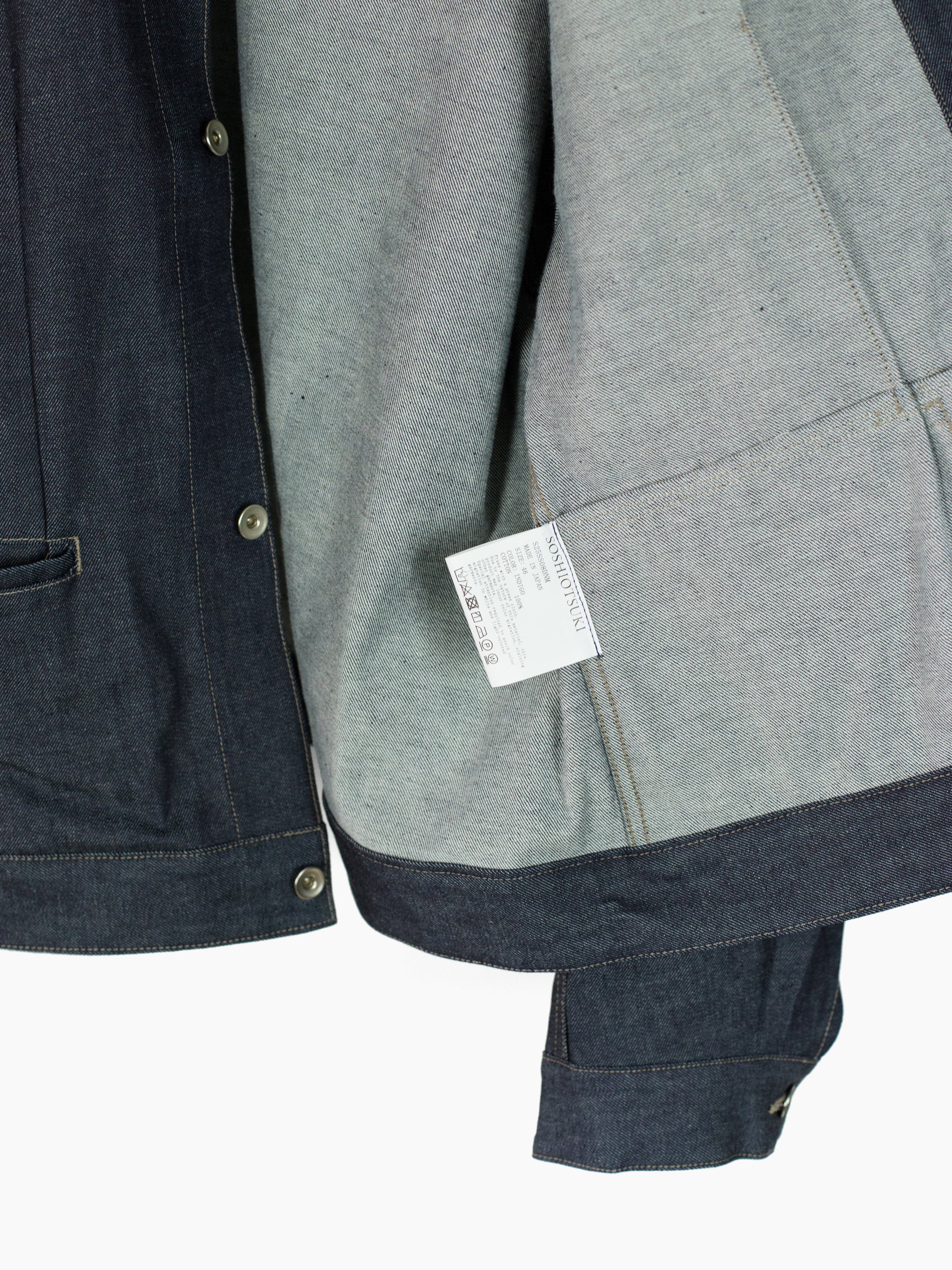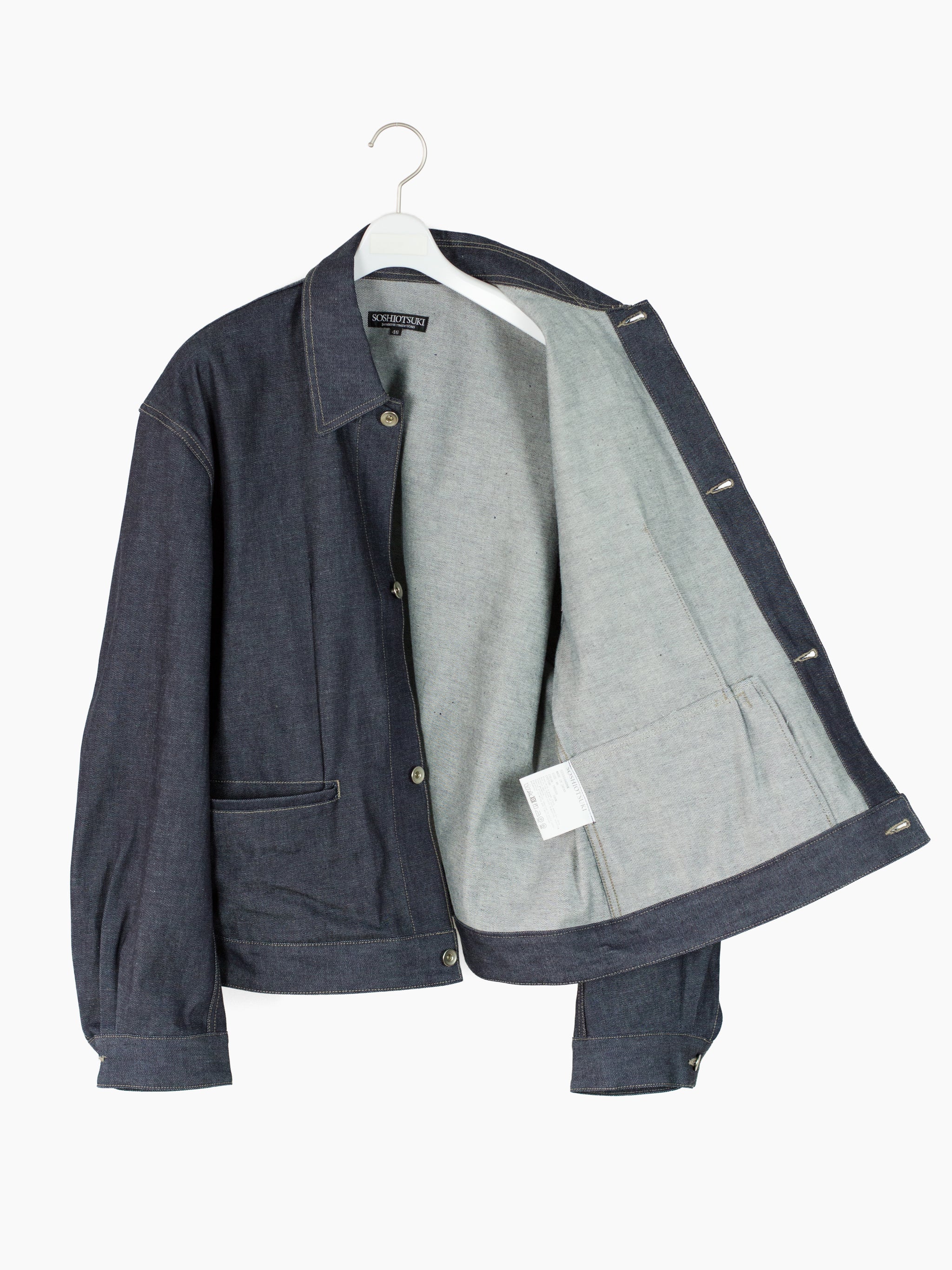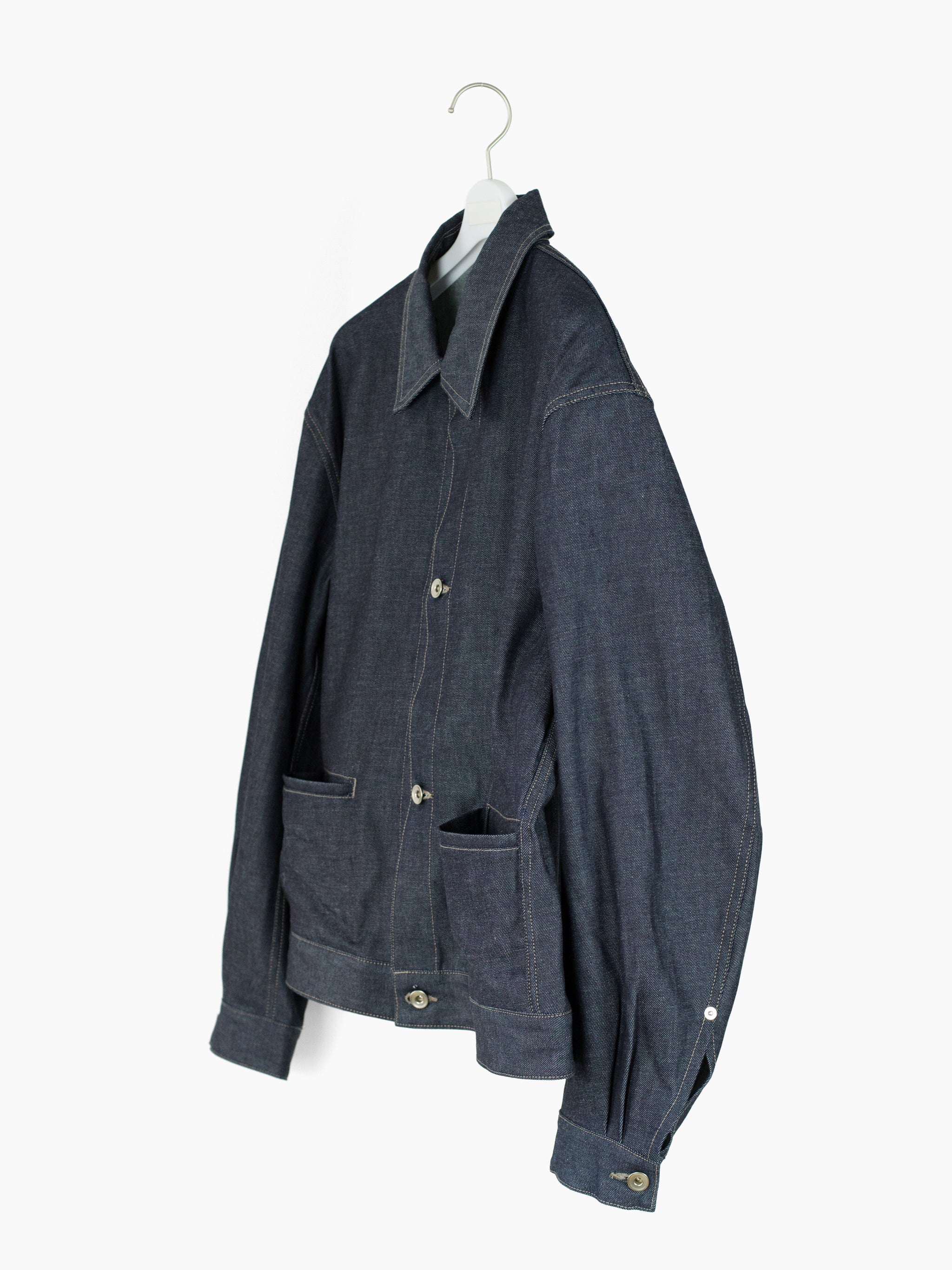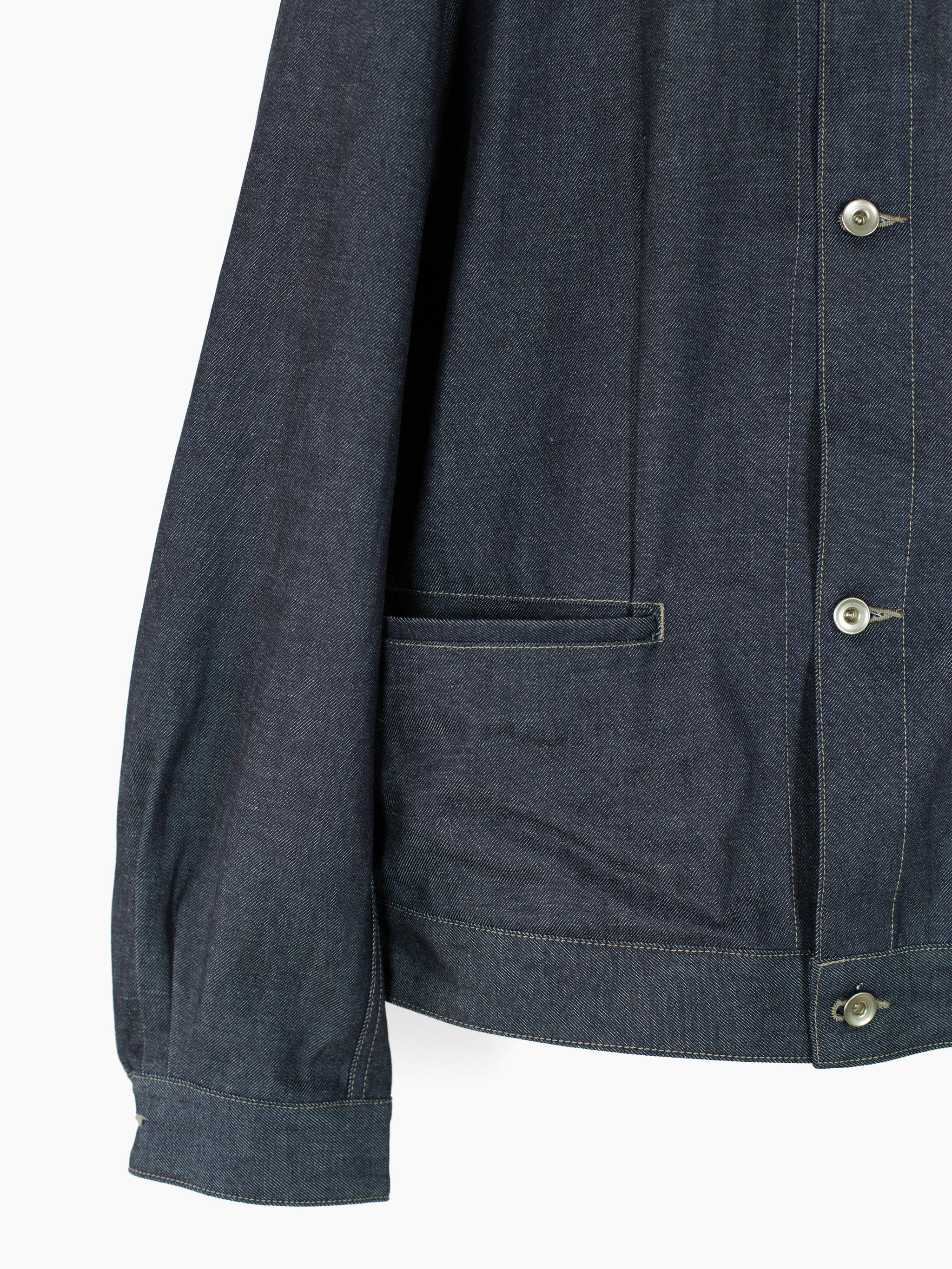 Raw Japanese denim blouson with boxy, cropped fit and sculpted curved sleeves. Waist welt pockets are pleated on the inside, making the outside edge sit off the body for ease of access and creating a subtle rounded silhouette. Brown-tone thread creates an aged, vintage feel. Shank front and cuff closure.