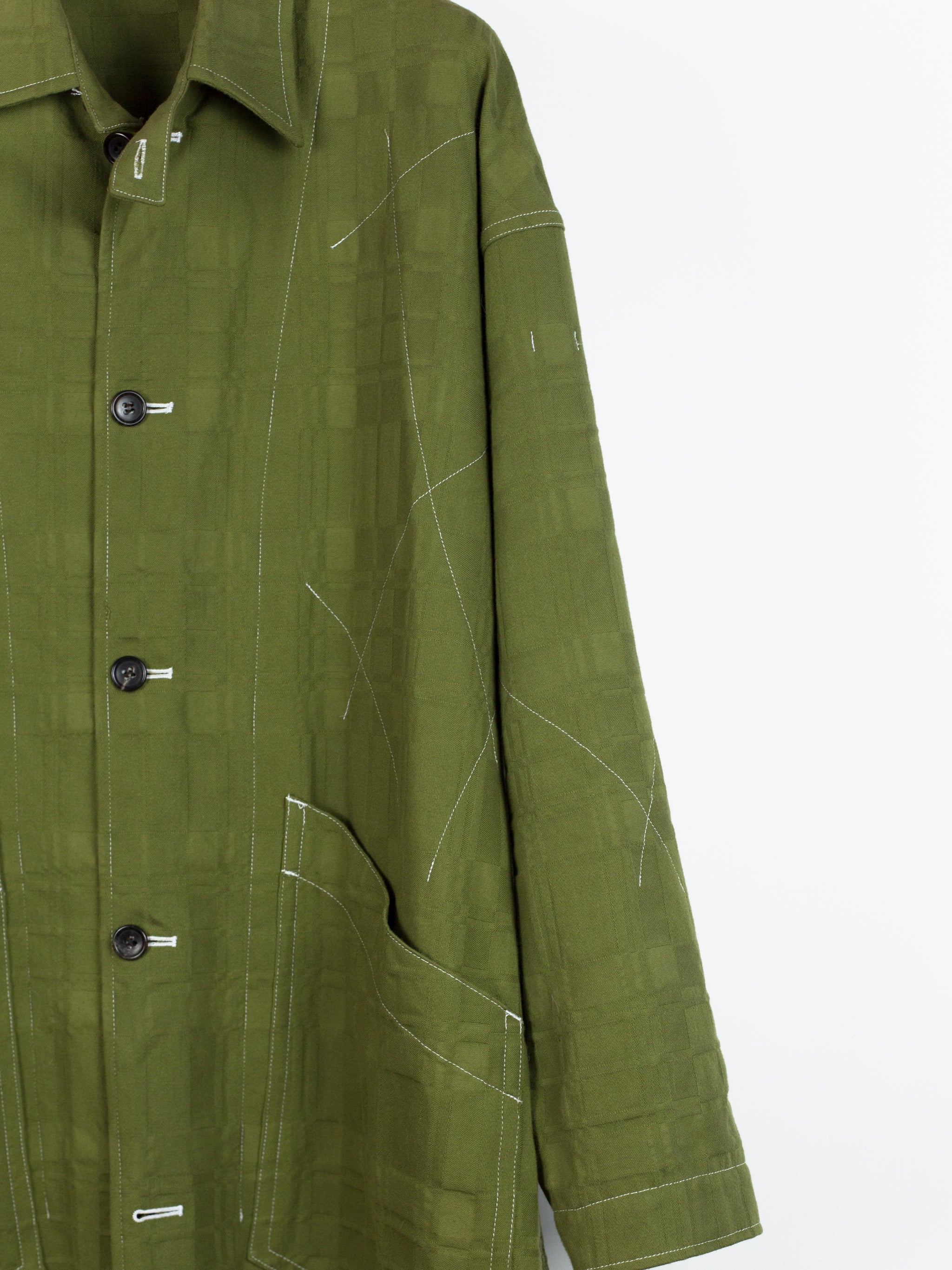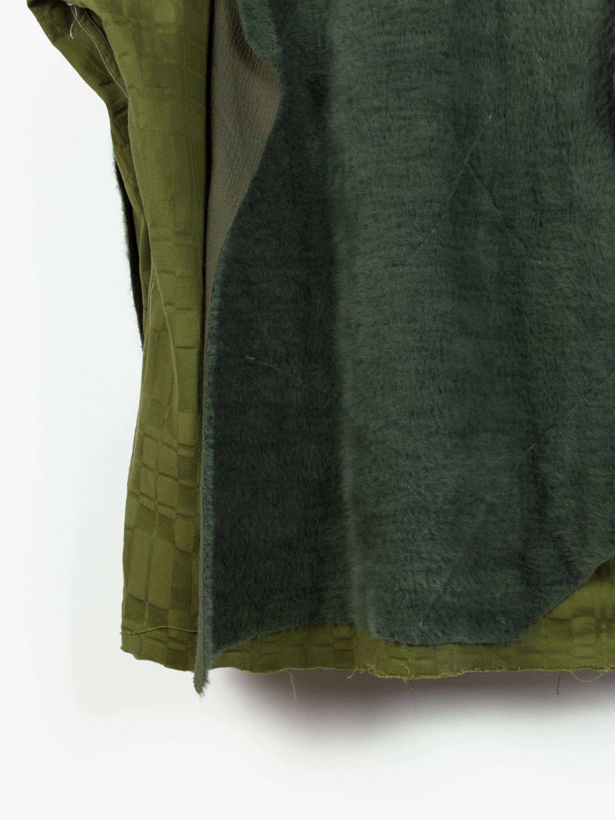Coverall coat in custom developed 100% cotton with 3D textured check pattern. The fabric is full of visual depth, dyed a beautiful grassy green shade, and has a soft and supple hand. The faux-fur (nylon/cotton blend) 'lining' is cut as numerous abstract panels and sewn on with long, curved stitchlines, fastened almost like a collage with floating edges left to drape and float off the face fabric. The coat is constructed with welted seams and tags hidden in the patch pockets so it can be worn reversed to show the lining patches on the outside. Boxy oversize shoulder with low armpits means it suits M-L flexibly with a relaxed fit and super easy wearing experience.
