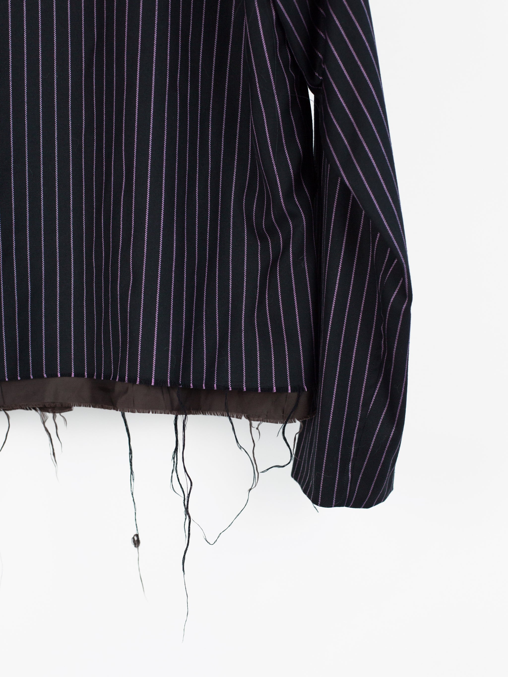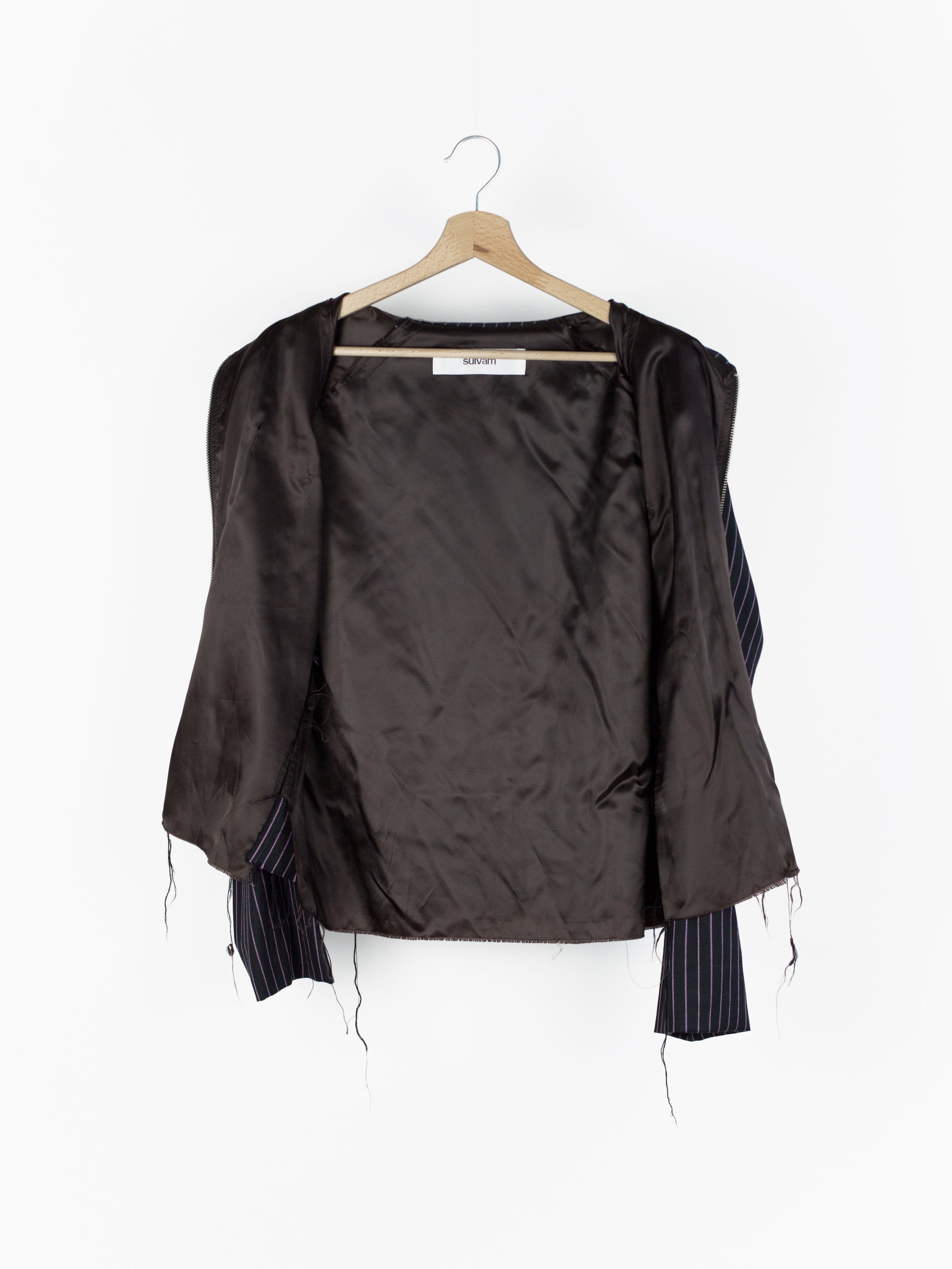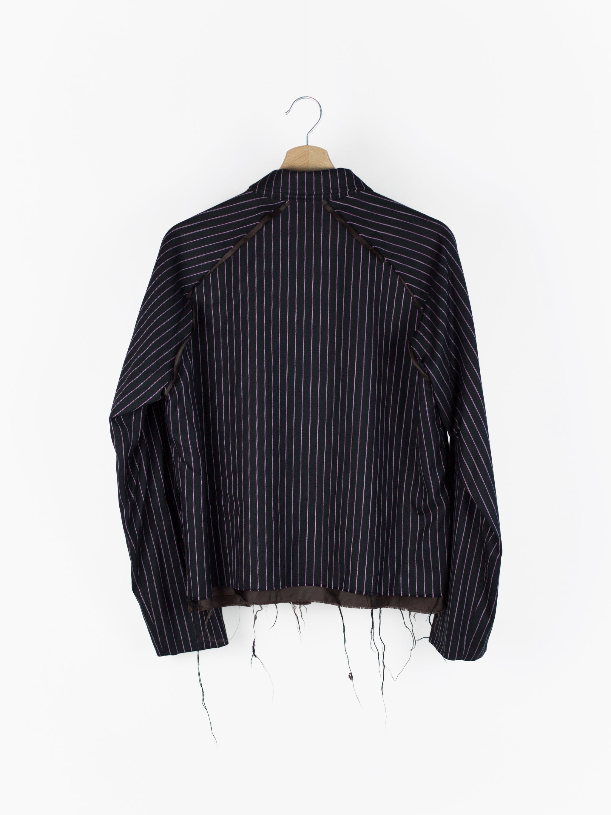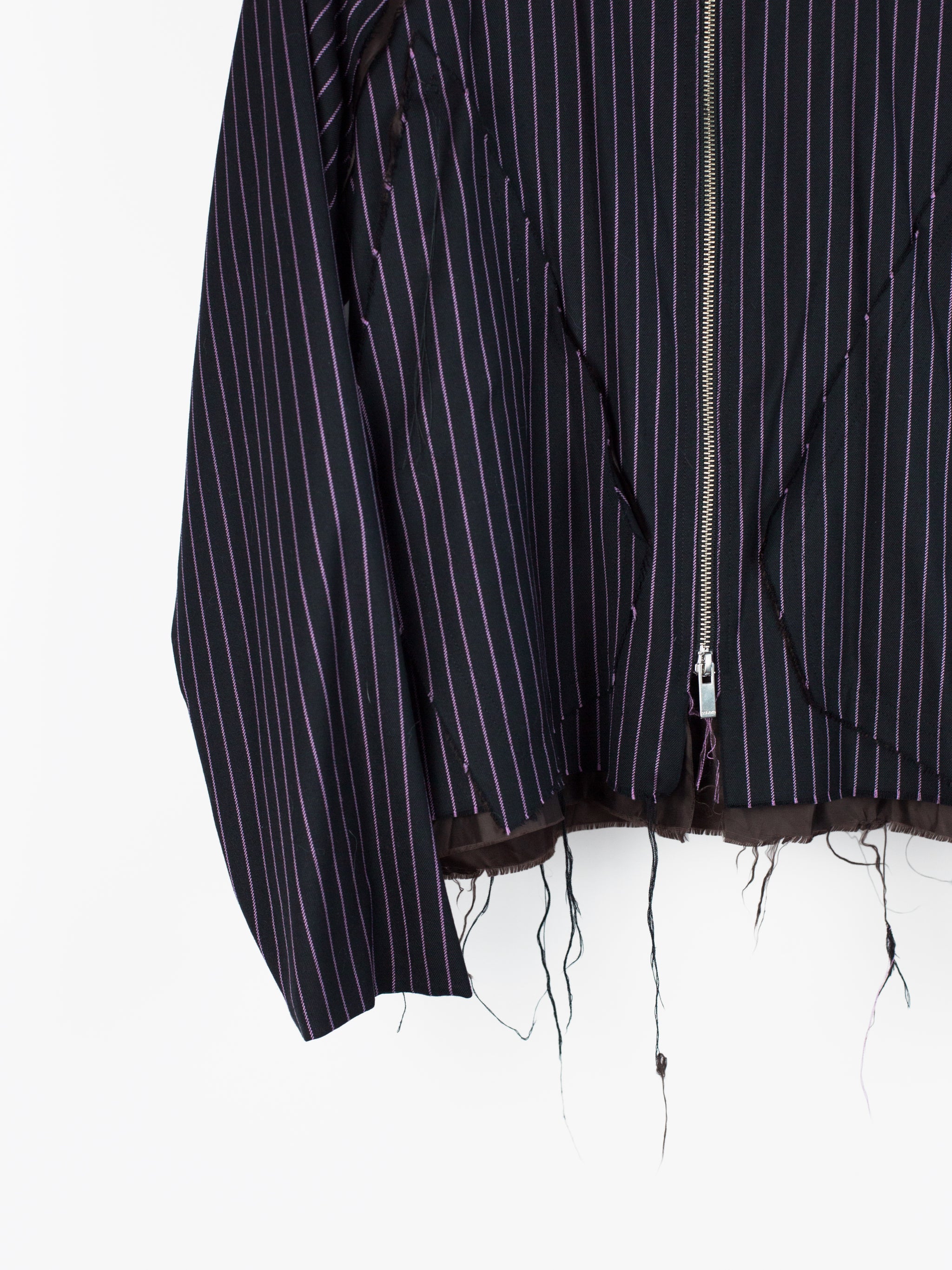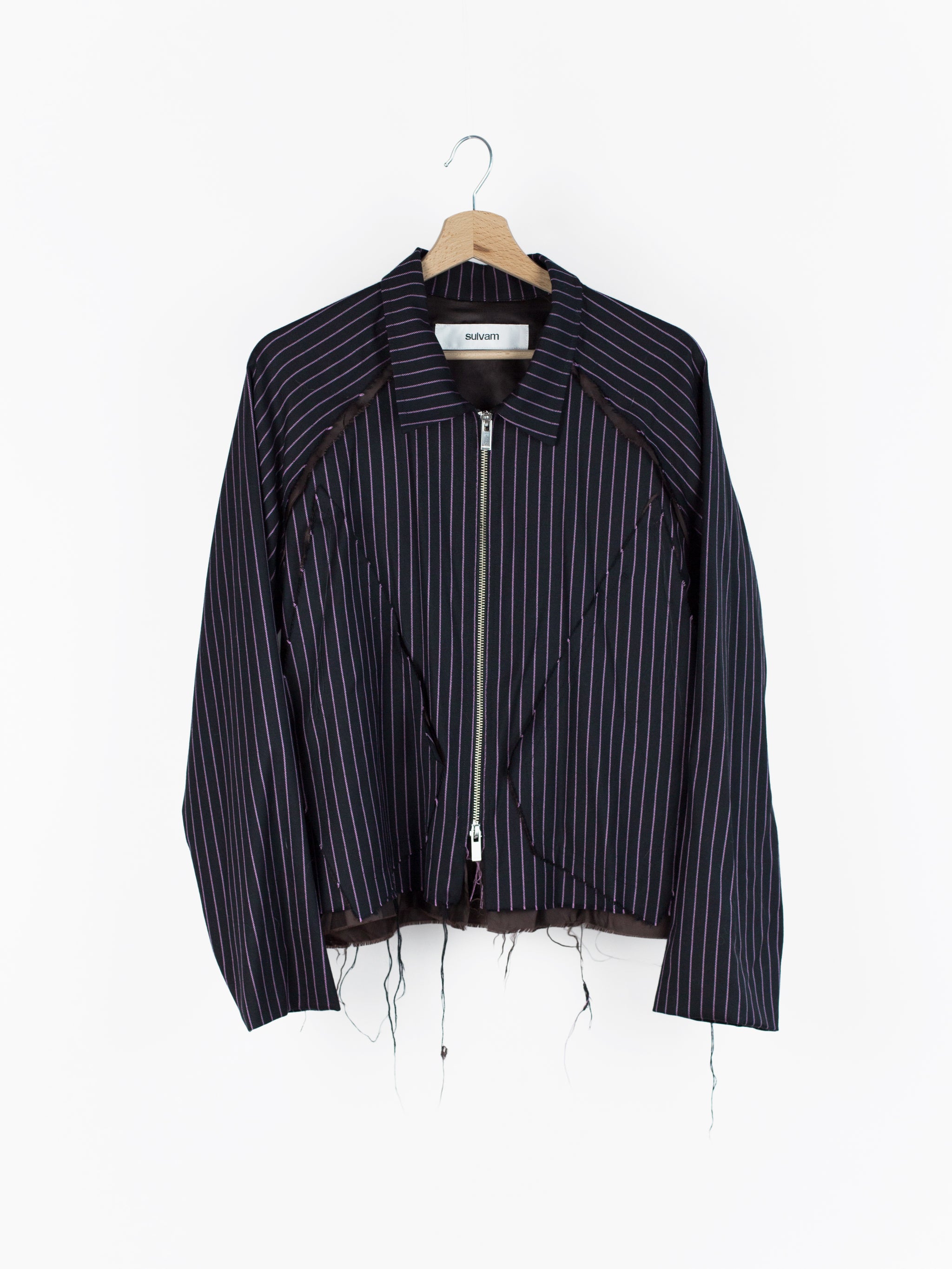 Pink stripe gabardine wool contrasts against a deep purple-brown cupro lining to create a visually layered, deconstructed swing blouson. Cropped, slim, and sleek, it features signature Sulvam elements such as exposed raw lining along the raglan shoulder construction, layered abstract patch pockets, and an unfinished semi-open back seam. It remains refined with fully finished collar and sleeve hems as well as an accent two-way Sulvam-branded center zip closure. This fabric and model was produced as a Mukta store exclusive for AW19.
