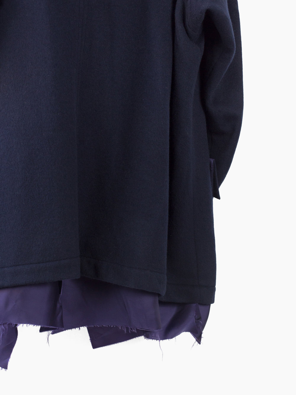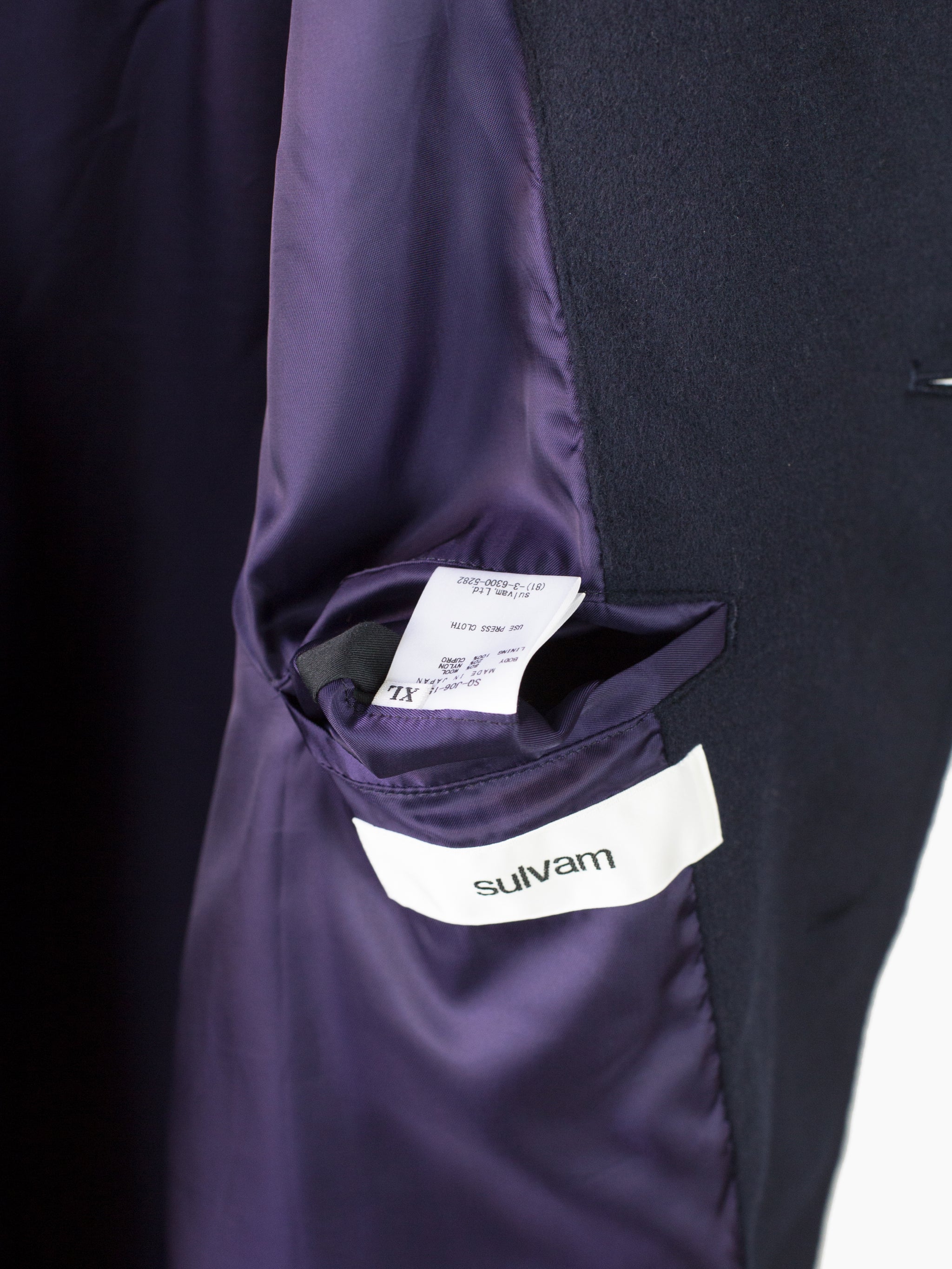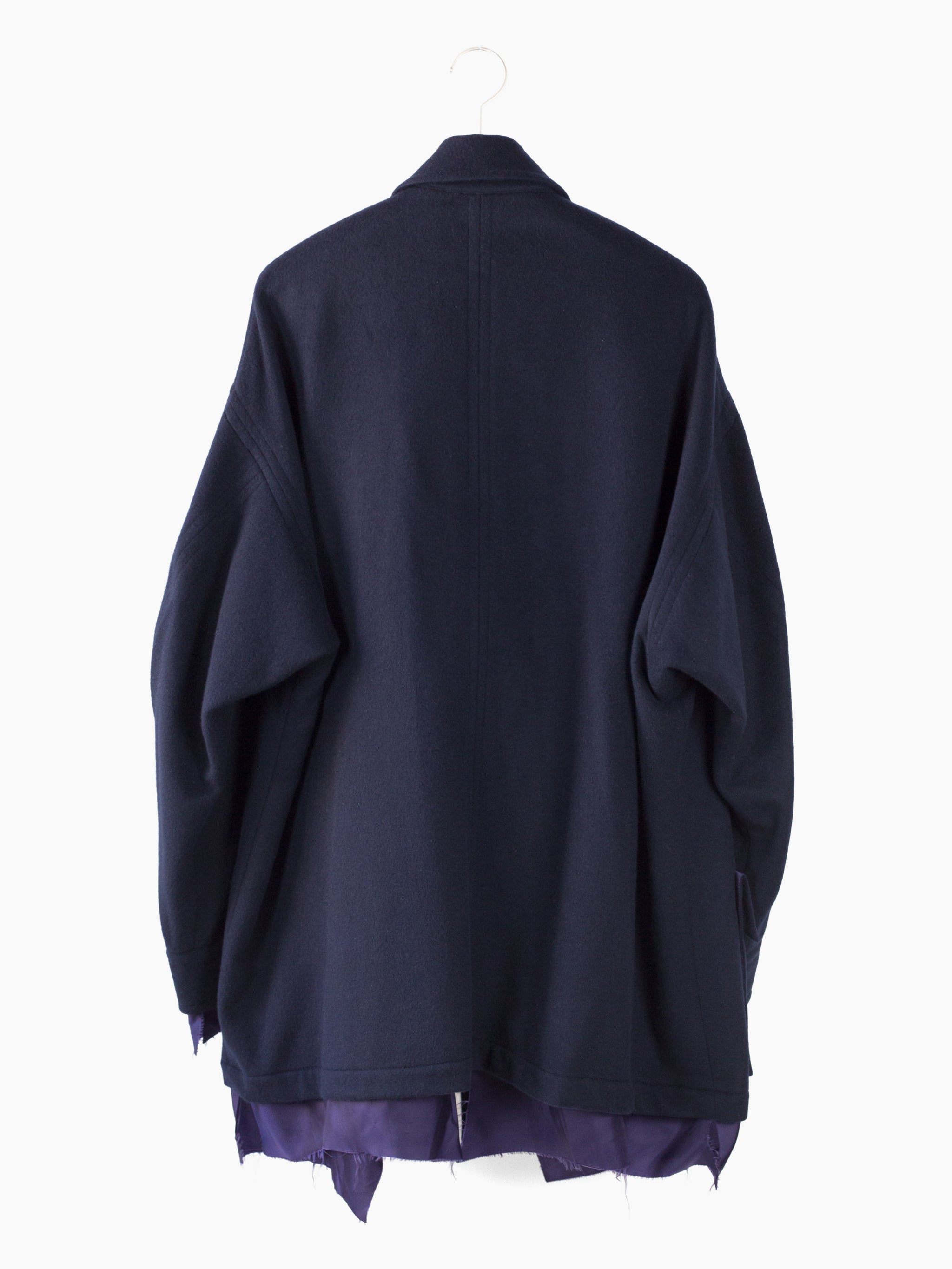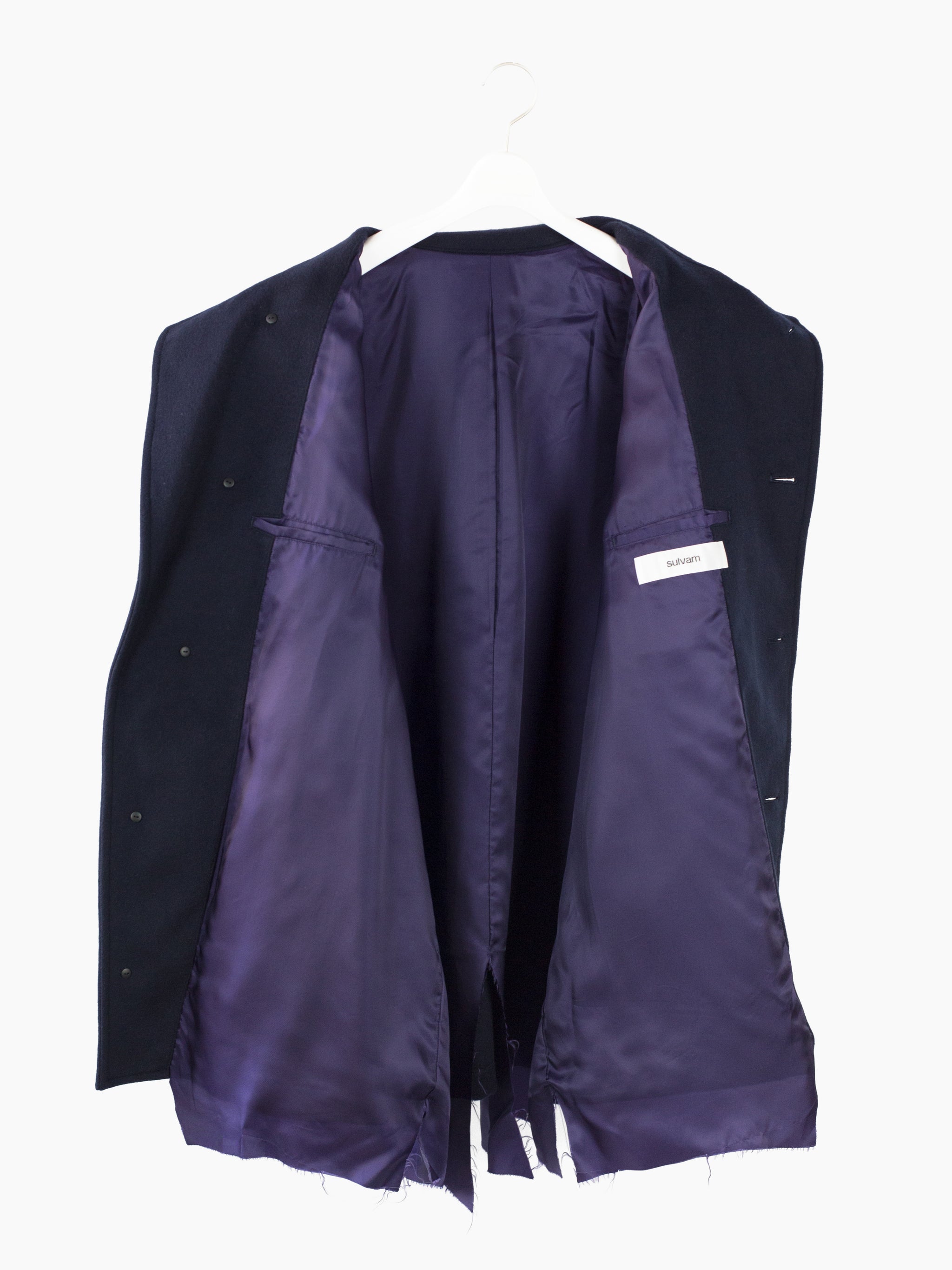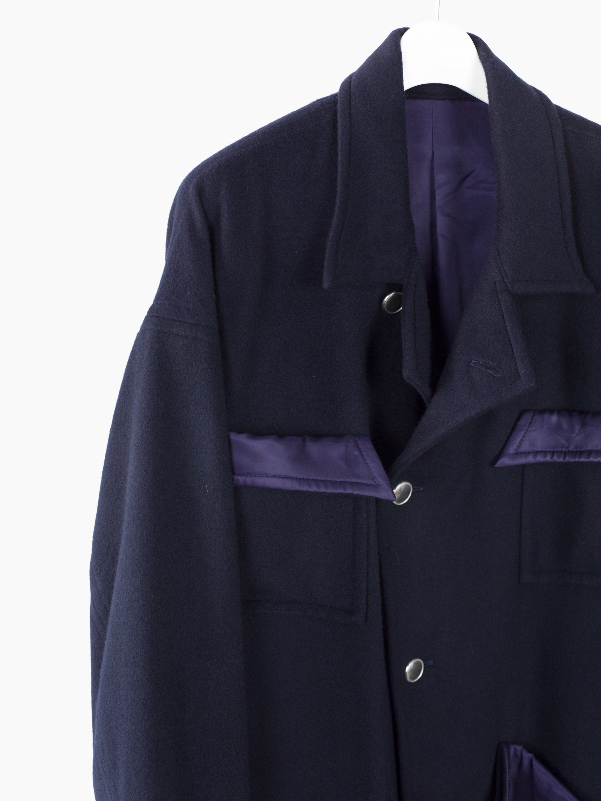 Wool Melton chore jacket with slightly asymmetrical front button closure and four pocket configuration with Sulvam signature flipped over top to expose contrast cupro lining. Metal buttons throughout serve as a decorative and textural accent. Inner lining features two chest pockets and is left floating at the bottom/ left raw for a lived in aesthetic. French seamed finish throughout.