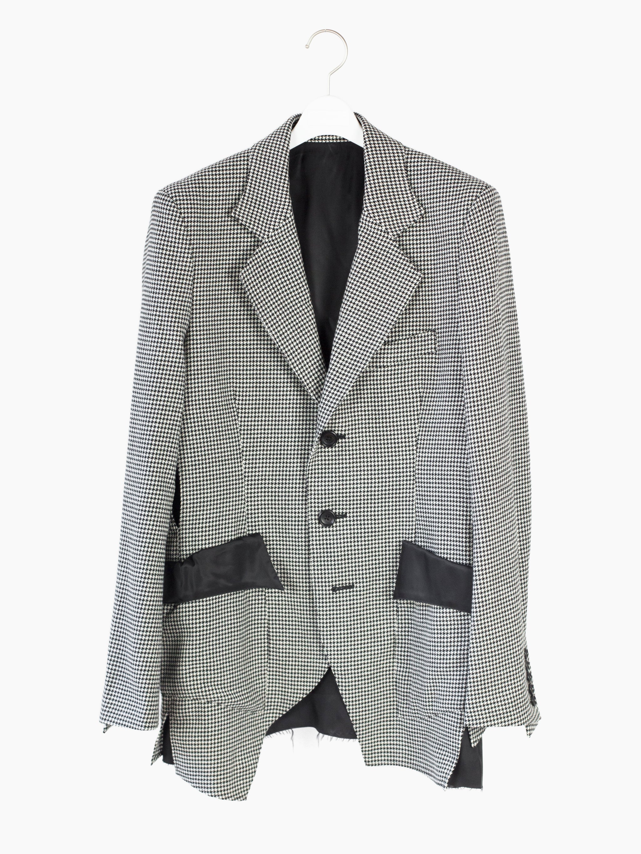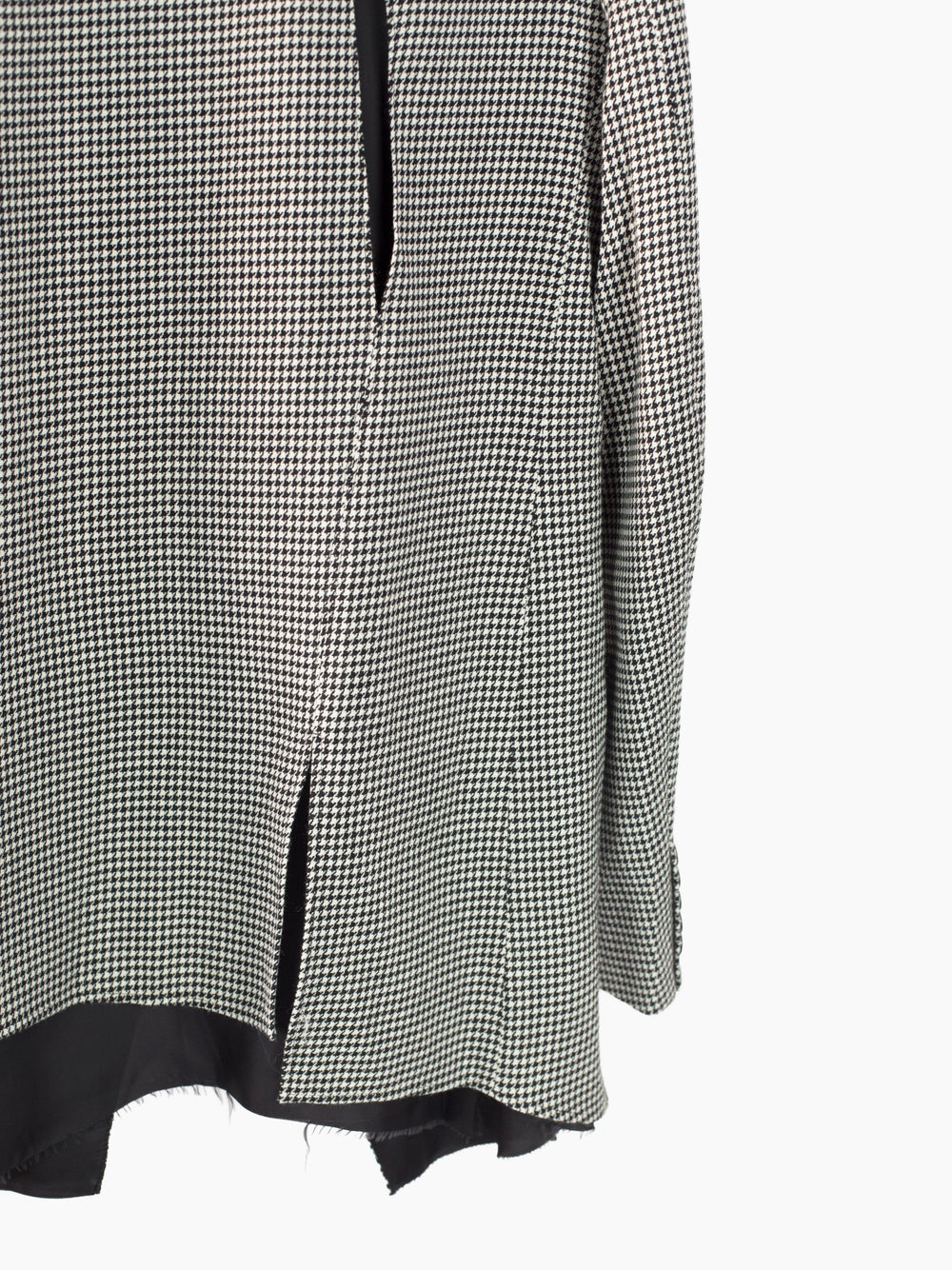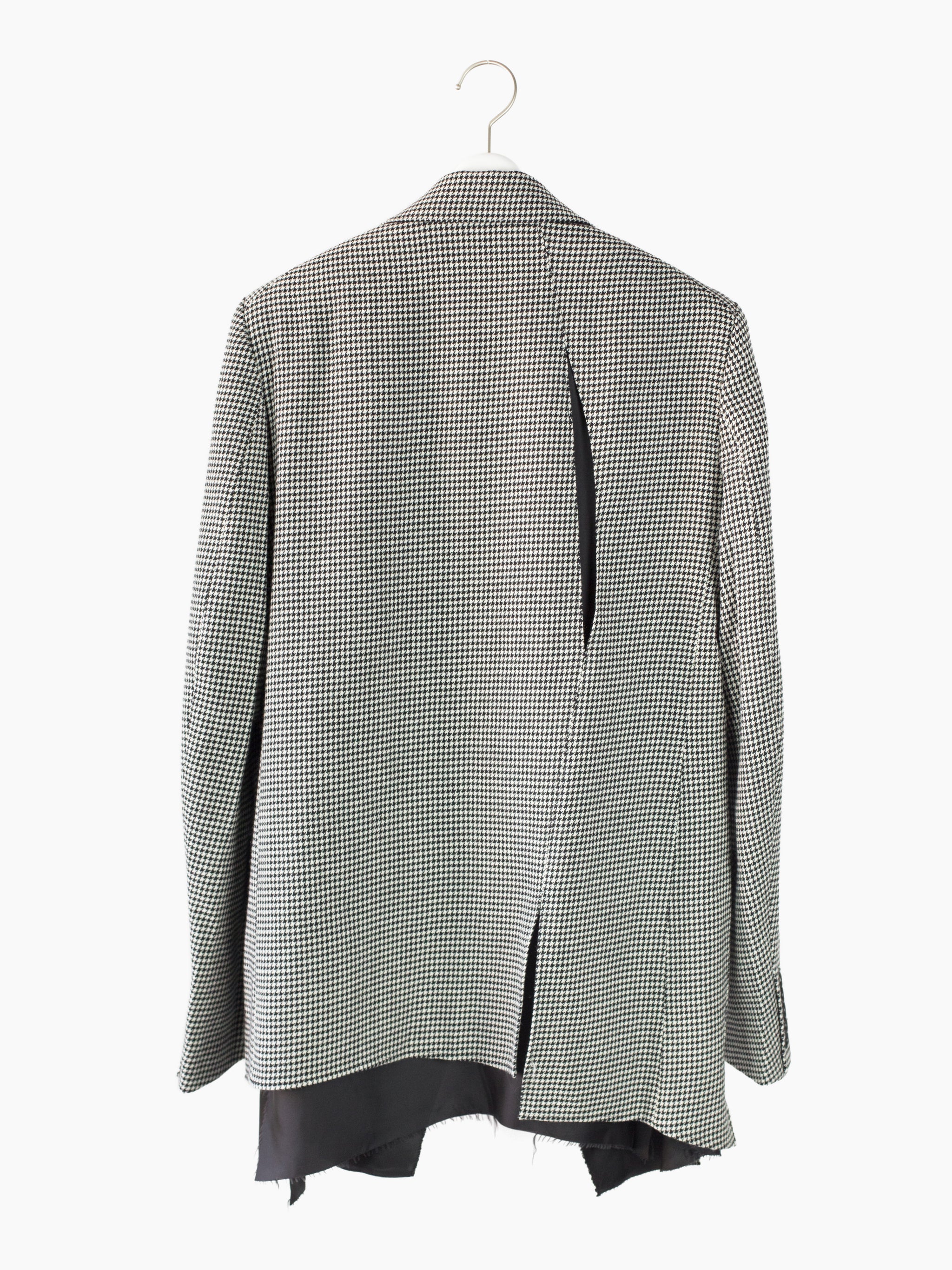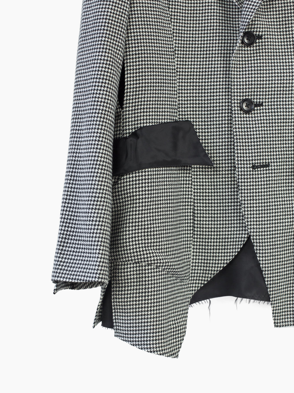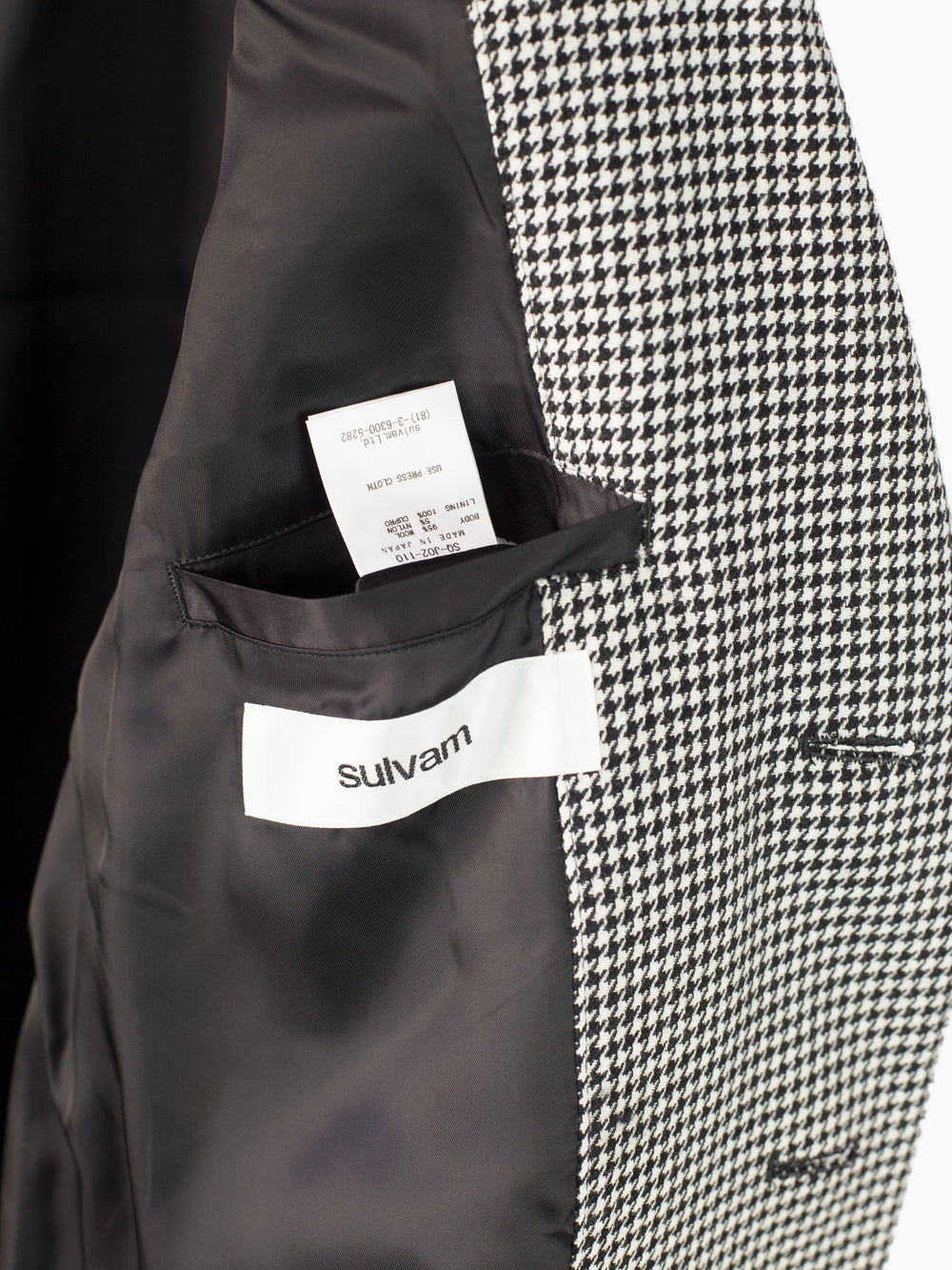 Houndstooth suit jacket with Sulvam signature details, including flip-over patch pockets that reveal contrast cupro lining, asymmetrical patterncutting, and open 'slits' throughout that expand to show the inner lining. Geometric cutaway effect at the hem and unconventional vents create a subversive, uncanny brand of tailoring that borders on surreal. Finished with angled chest pocket, front chest darts, wide subtlely curved lapels, functional button cuffs, two inner chest pockets, and floating inner lining that creates a raw edged layered effect at the hem.