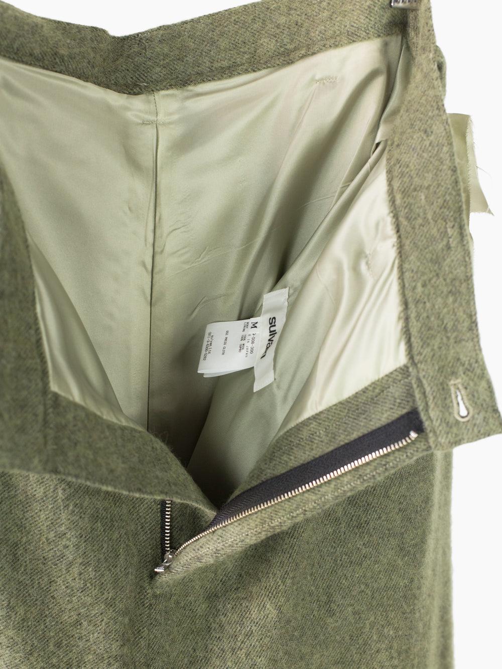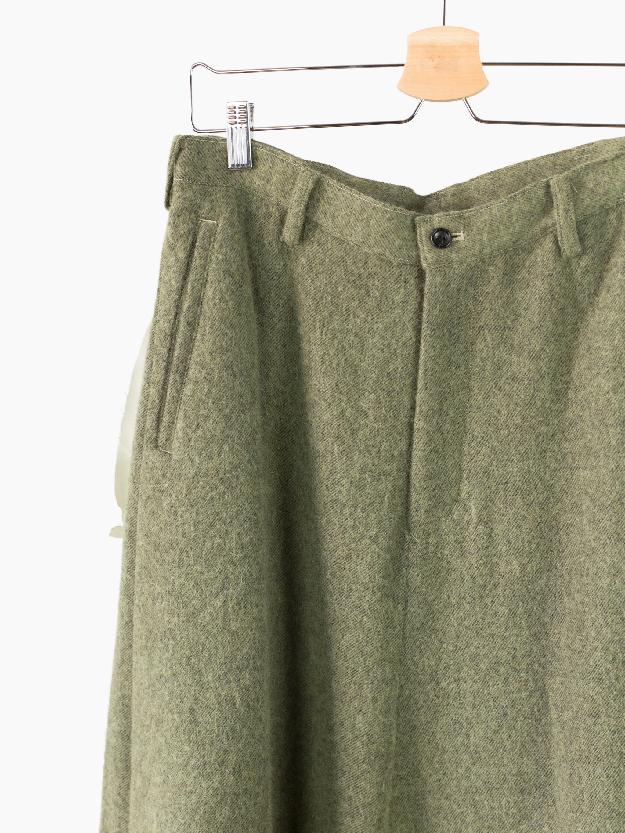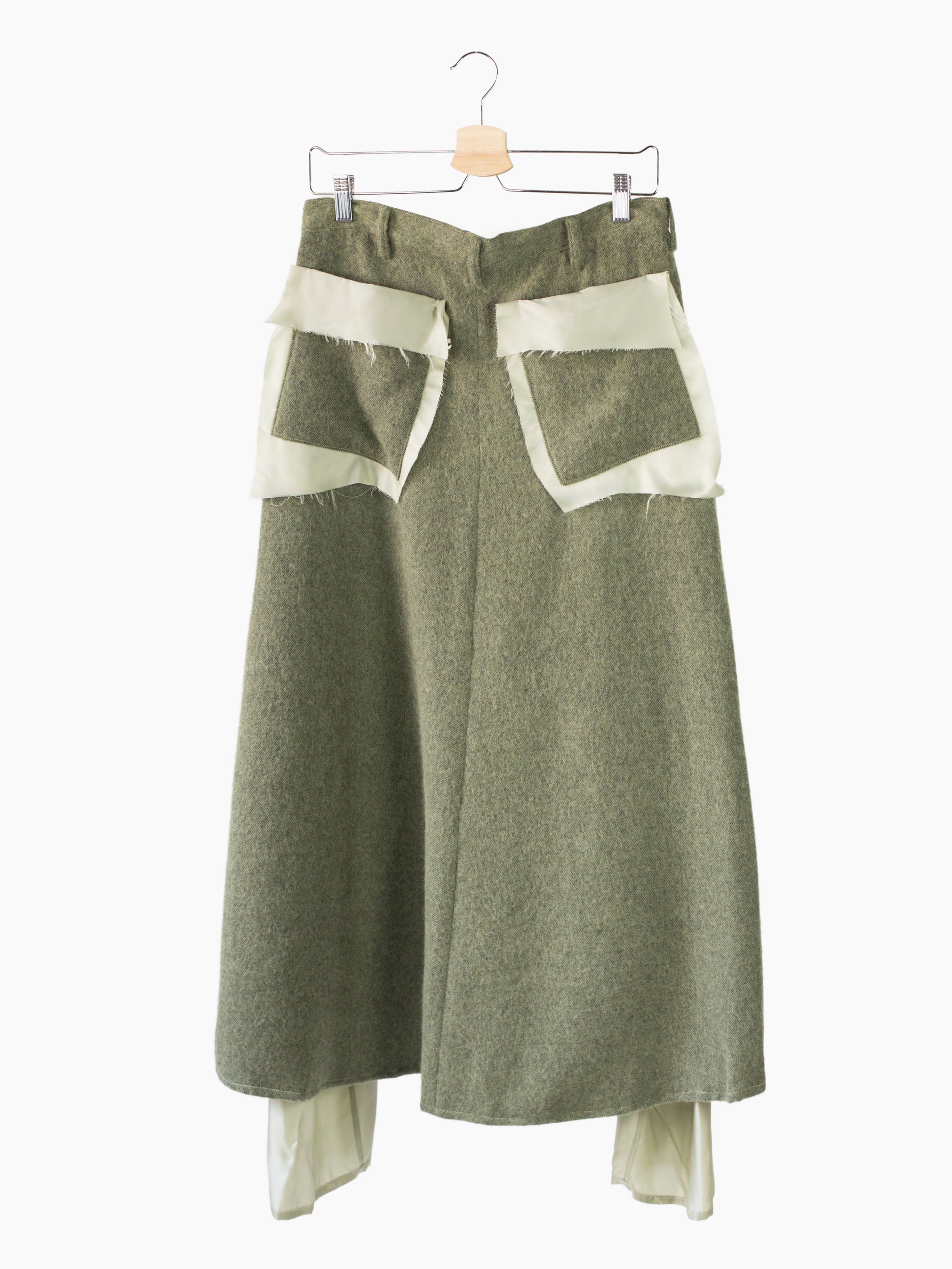 Layered skirted trousers in cozy, soft wool flannel twill. Mixed yarns create a beautiful olive green with mixed yellow and blue tones that bring an amazing visual depth. Fully constructed cream cupro trouser lining for comfort and modesty, bringing masculine and feminine styles together in a beautifully designed hybrid bottom. Back features Sulvam signature layered cupro/face fabric pocket construction that contrasts the raw and finished while creating two separate pocketbags in one. Finished with button waist closure and zipper fly, belt loops, and two front slash waist pockets.