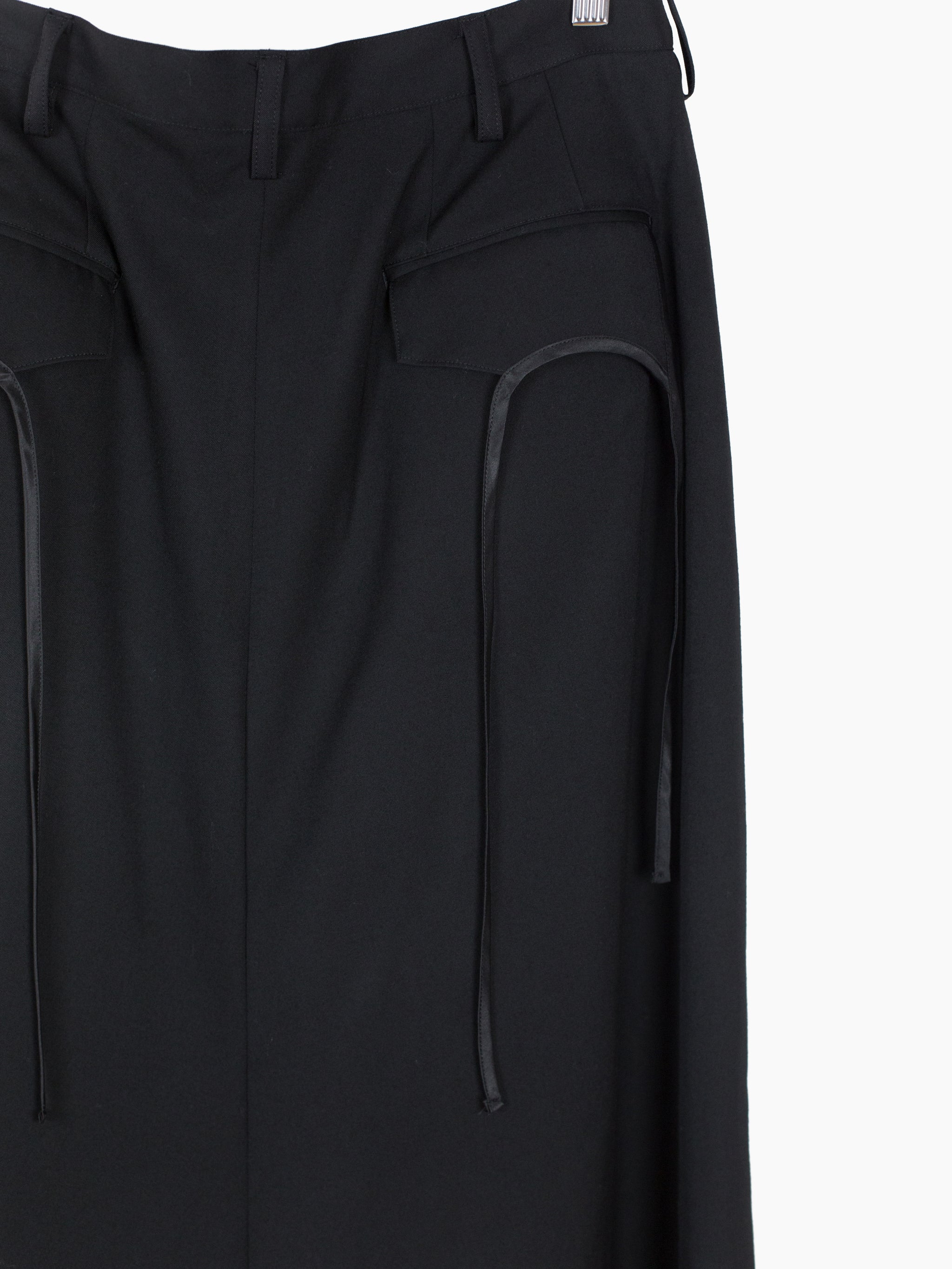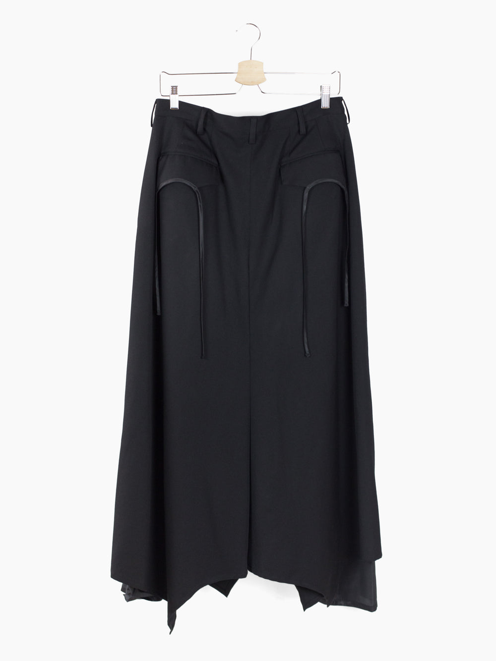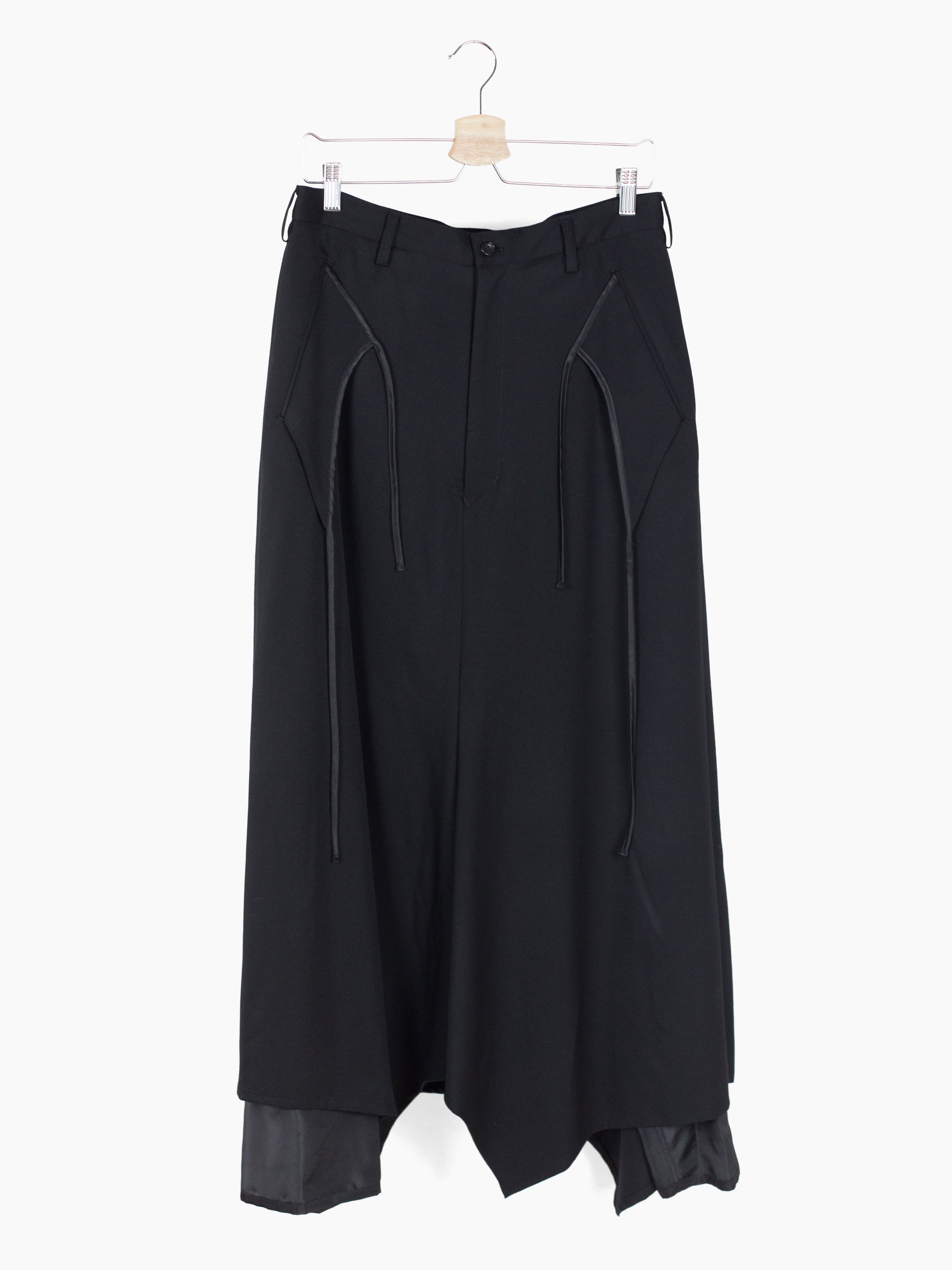 Sulvam signature layered skirt trousers, featuring wool gabardine outer layer with inner lining 'trousers' for comfort, peace of mind, and a layered visual effect. This season, the pocket flaps at diagonal waist and back welt pockets have their curved edges 'traced' with an extended silky piped binding that creates textural contrast and movement. Curved geometry is carried through at the skirt's hem, where the edge is cut asymmetrically and like a bat's wing webbing. Finished with button waist closure and zipper fly, and belt loops.