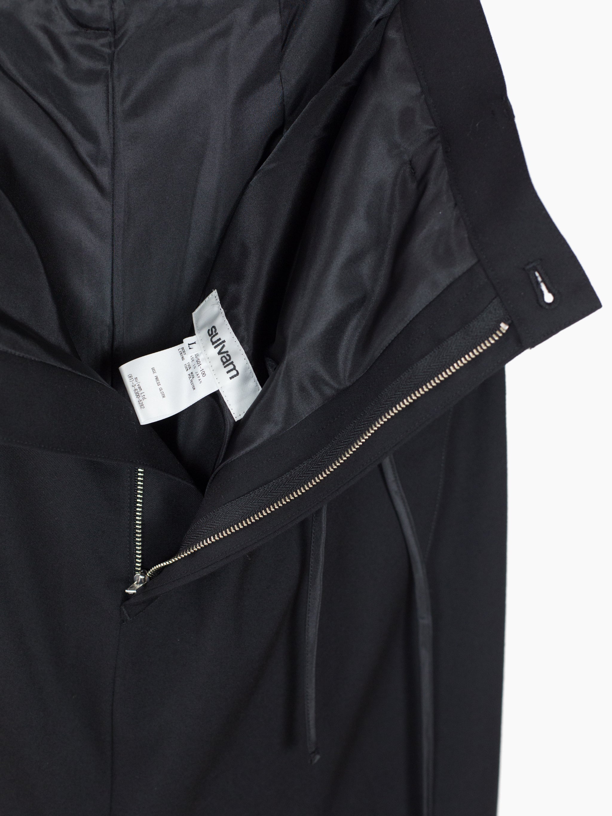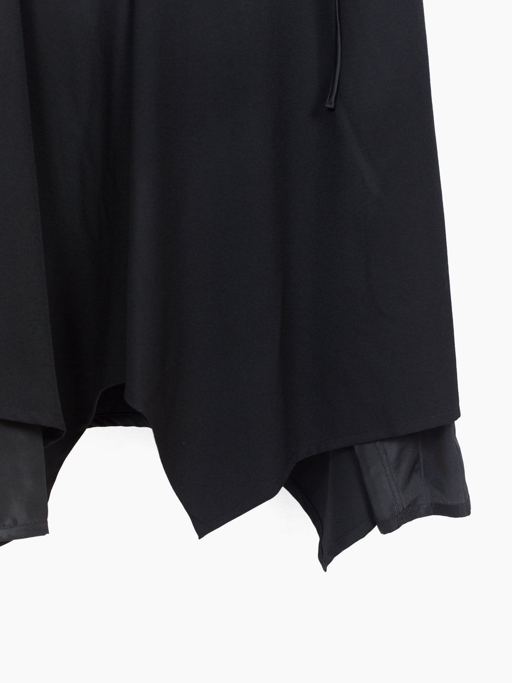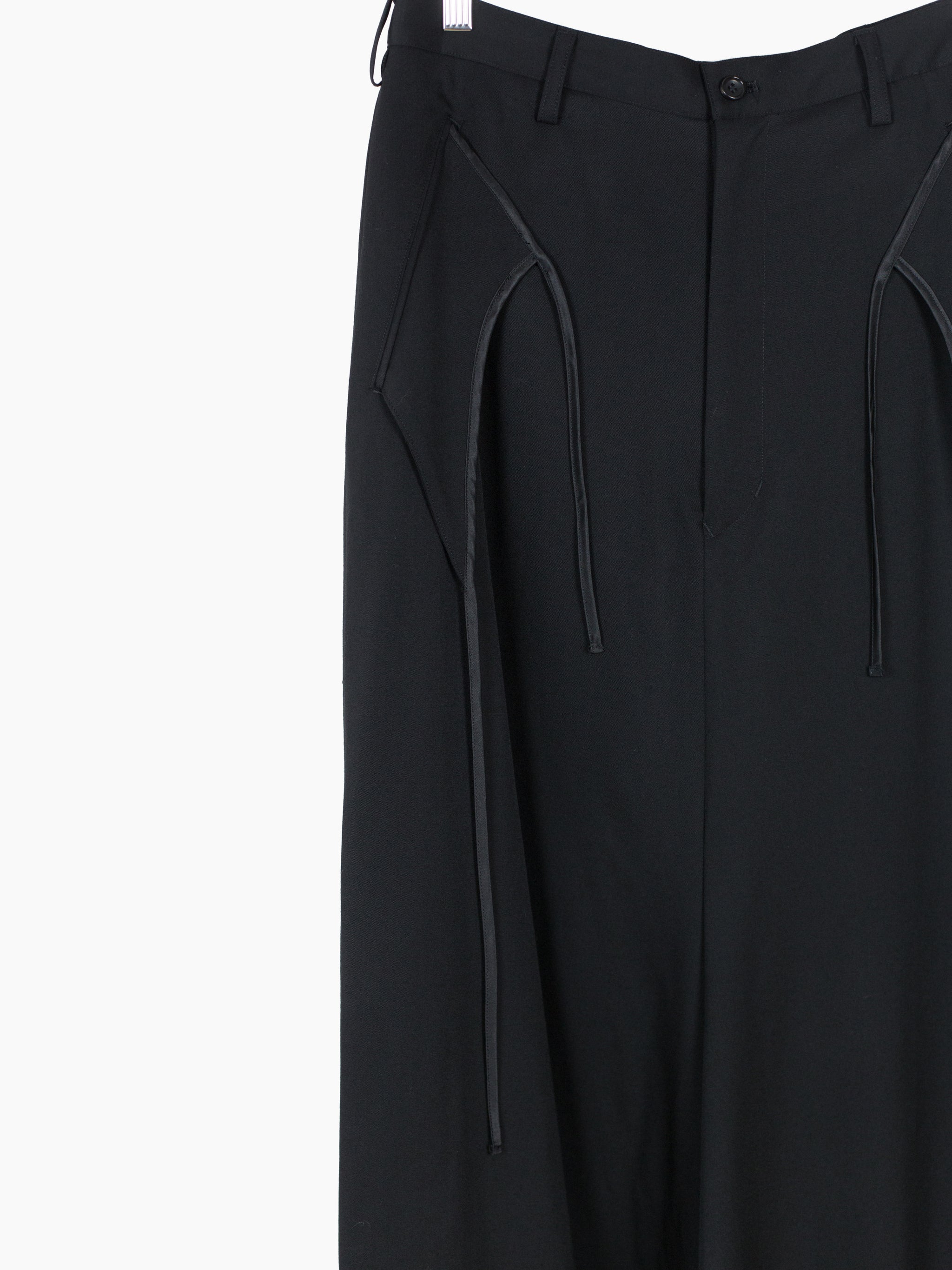 Sulvam signature layered skirt trousers, featuring wool gabardine outer layer with inner lining 'trousers' for comfort, peace of mind, and a layered visual effect. This season, the pocket flaps at diagonal waist and back welt pockets have their curved edges 'traced' with an extended silky piped binding that creates textural contrast and movement. Curved geometry is carried through at the skirt's hem, where the edge is cut asymmetrically and like a bat's wing webbing. Finished with button waist closure and zipper fly, and belt loops.