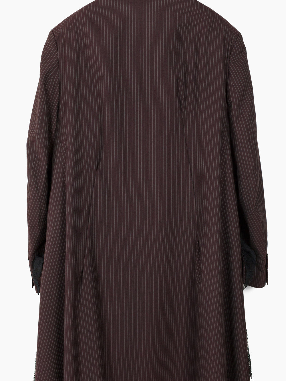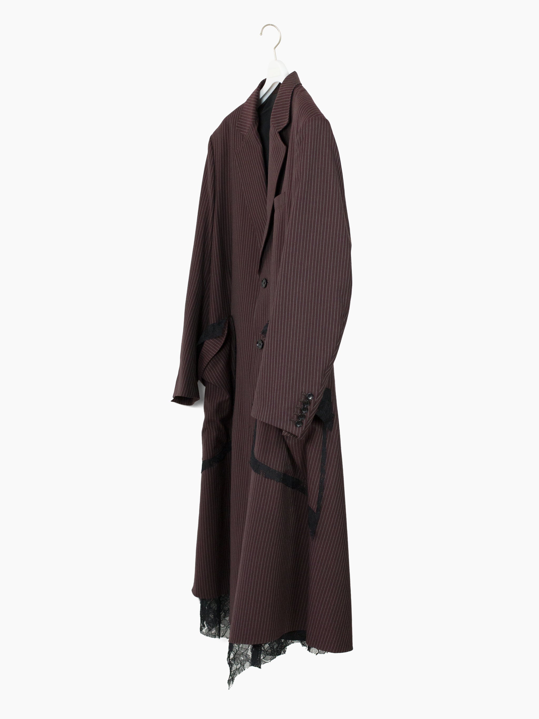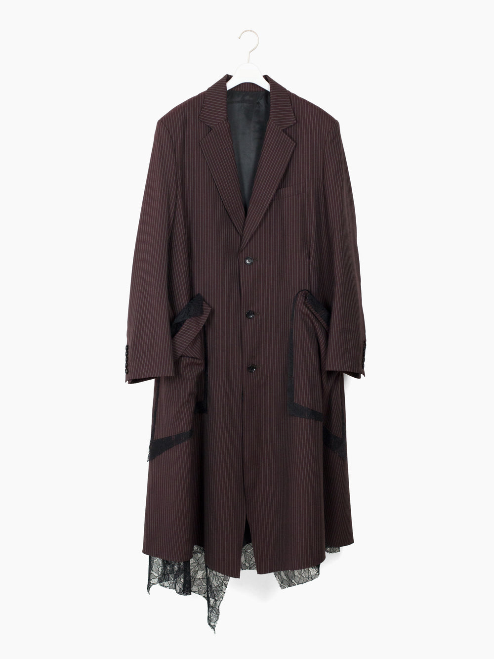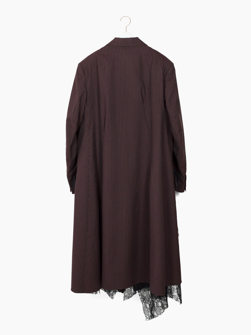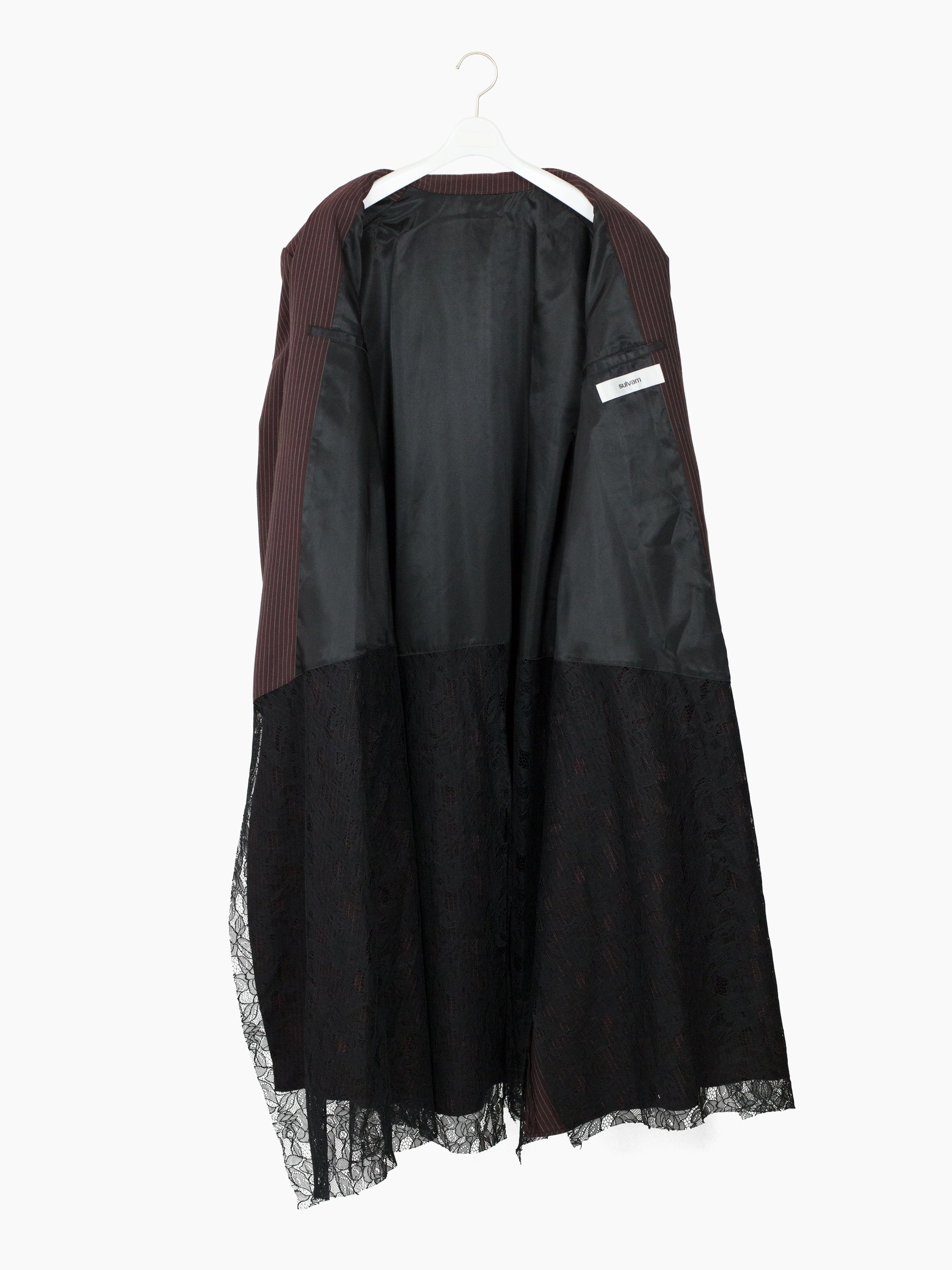 Maxi length chester coat with layered lace trim and lining. Structured, lightly padded shoulder and midweight suiting twill face fabric create a sense of stylistic ambiguity--deceptively light and fluid for a coat, with a surprising mix of formal and playful, masculine and feminine details. It could be described loosely as a tailored robe. It provides the wearer with an immense presence.