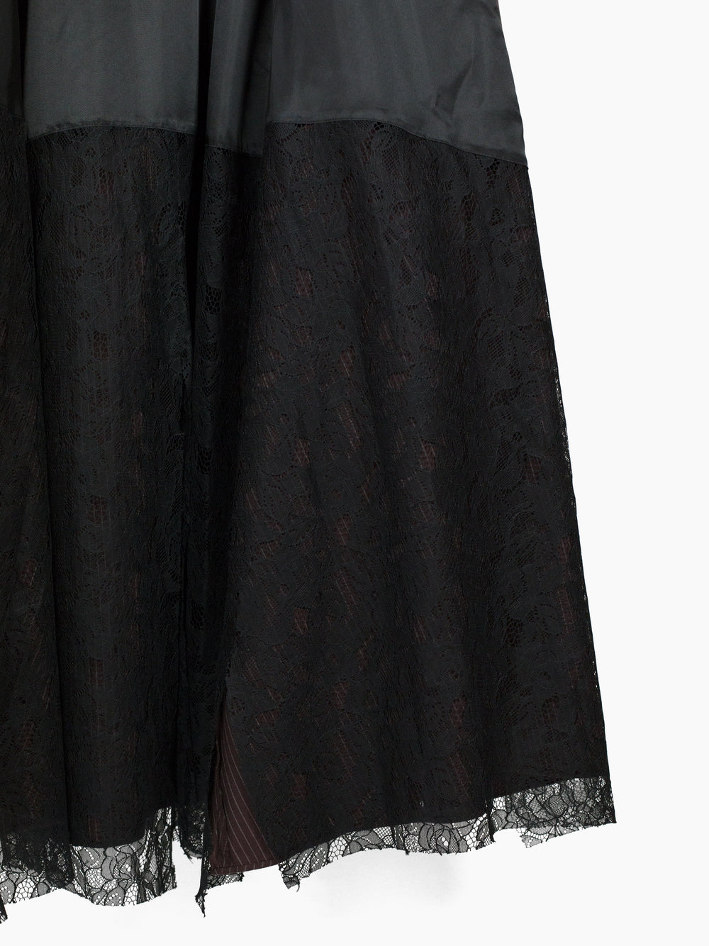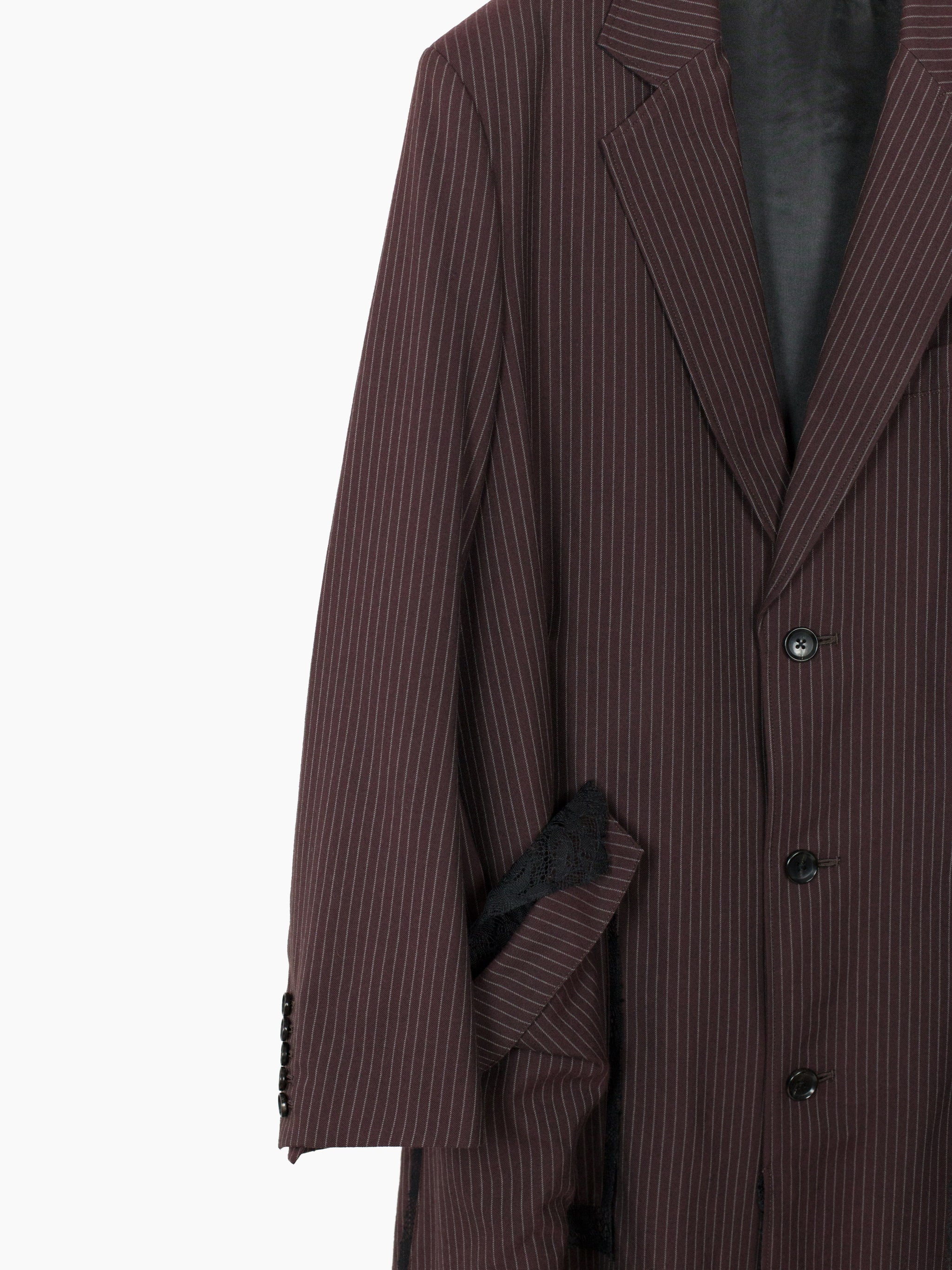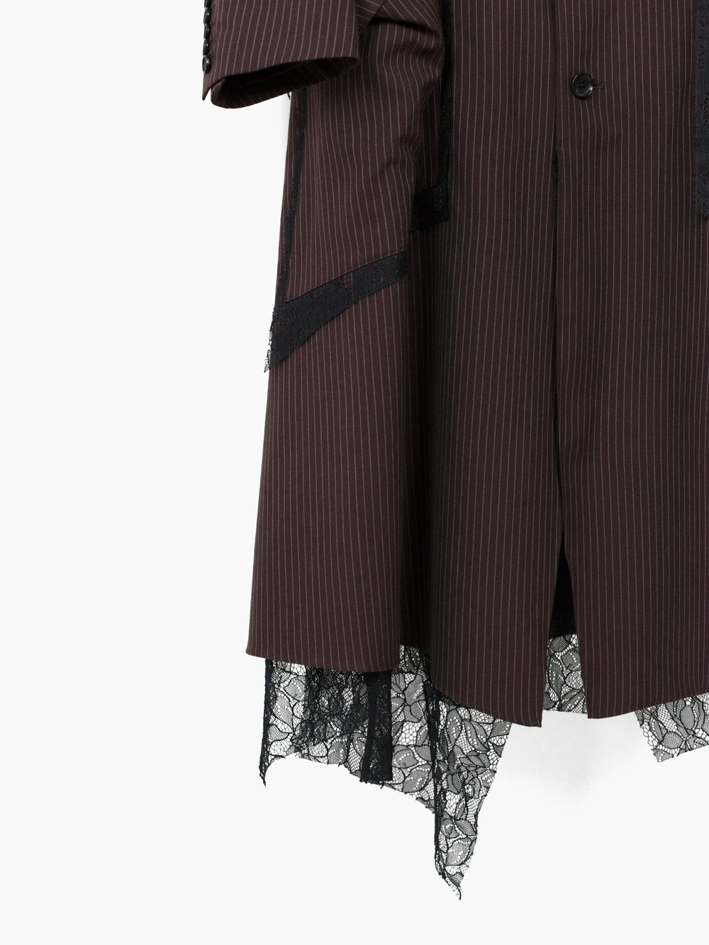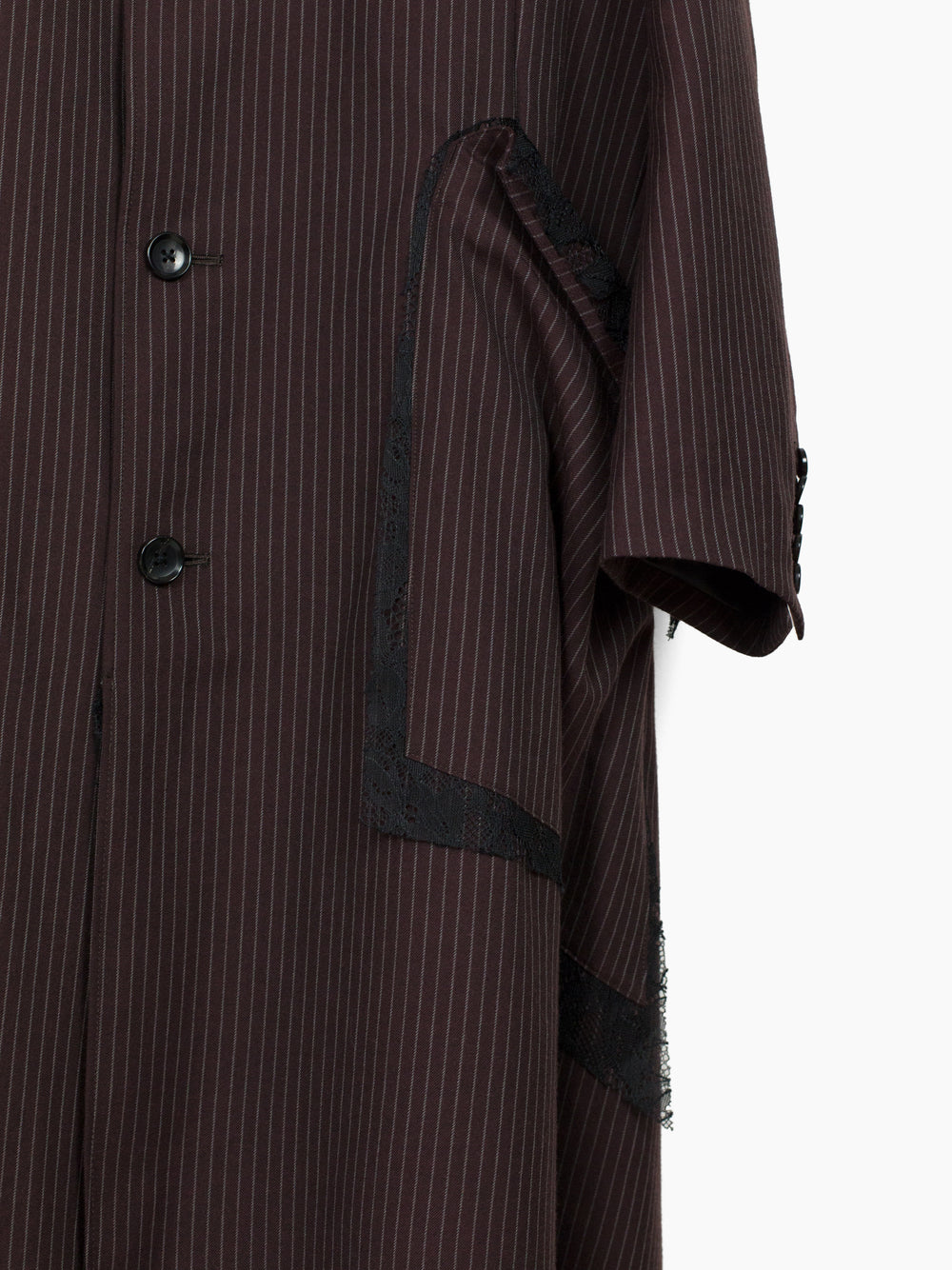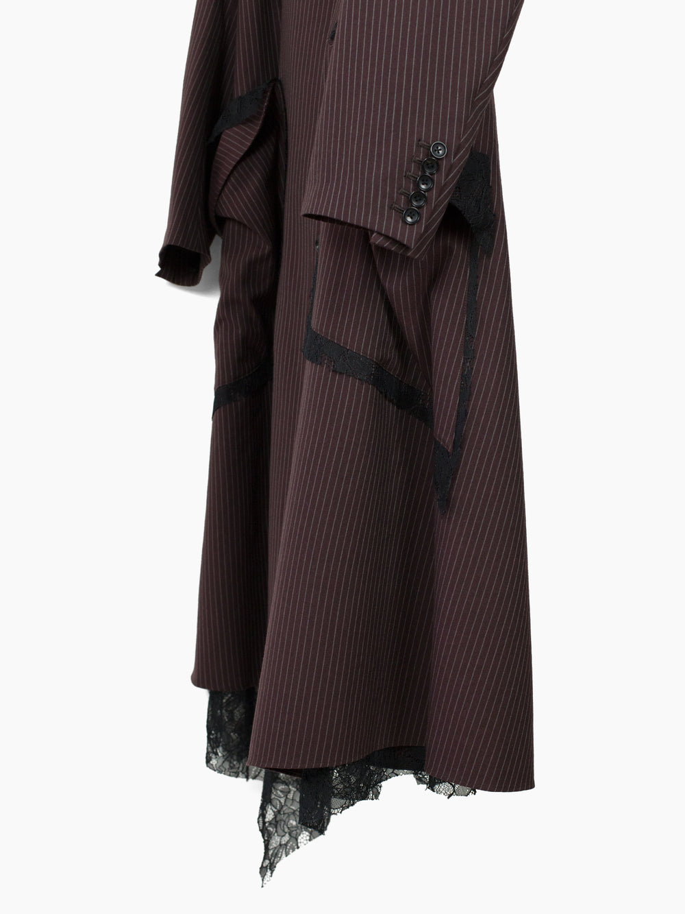 Maxi length chester coat with layered lace trim and lining. Structured, lightly padded shoulder and midweight suiting twill face fabric create a sense of stylistic ambiguity--deceptively light and fluid for a coat, with a surprising mix of formal and playful, masculine and feminine details. It could be described loosely as a tailored robe. It provides the wearer with an immense presence.