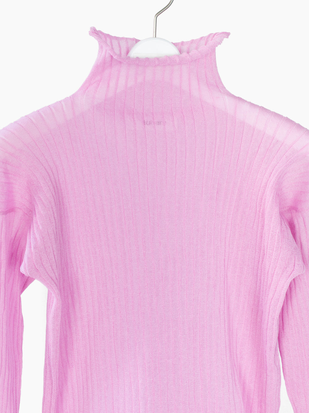 Turtleneck-style longsleeve cut in cotton/poly ribbed organza, formal in shape but deceptively alluring thanks to its diaphanous sheerness. Neck, cuff, and hems are all left raw in a design move that brings both brutalist and punk edge.