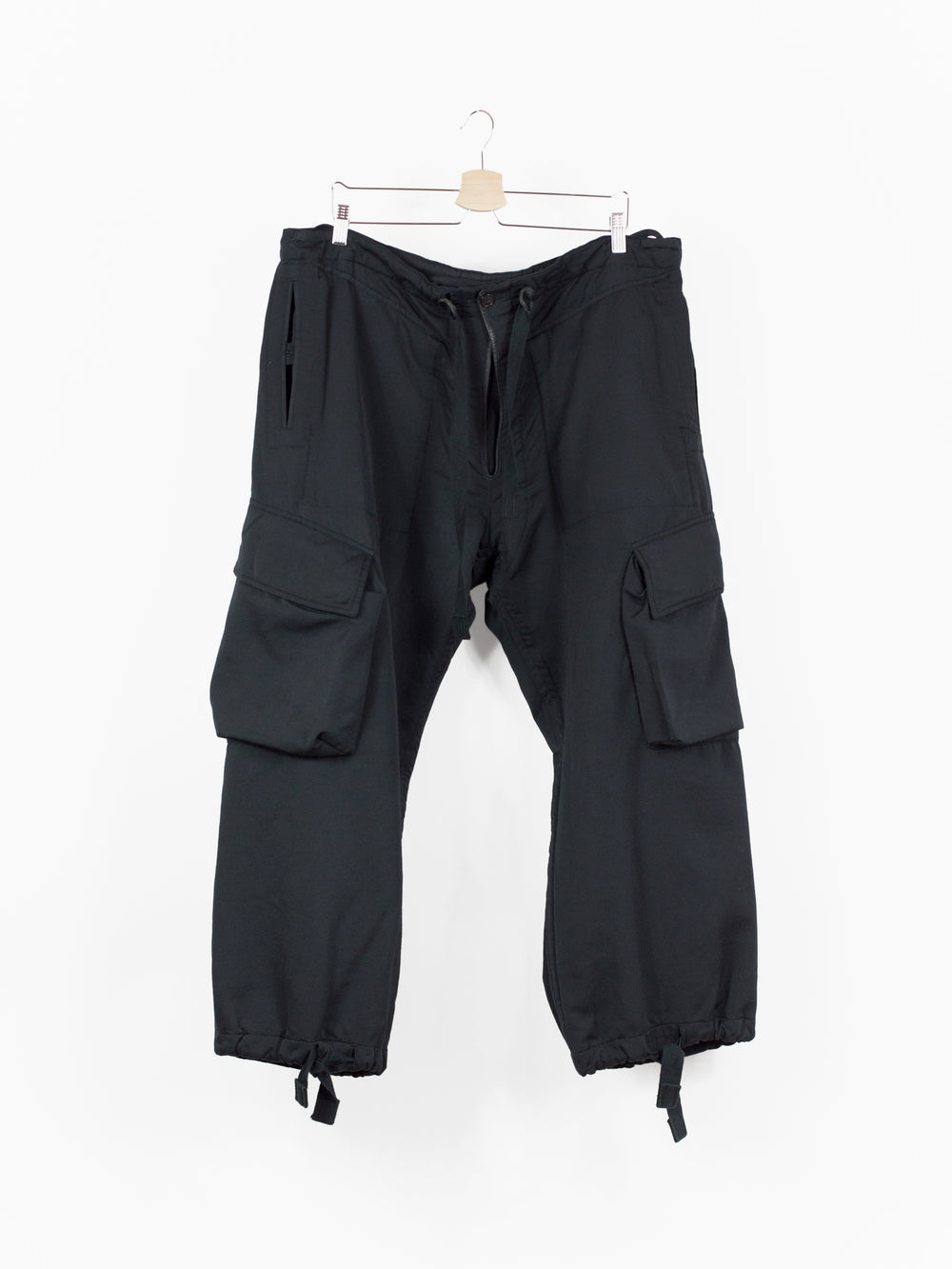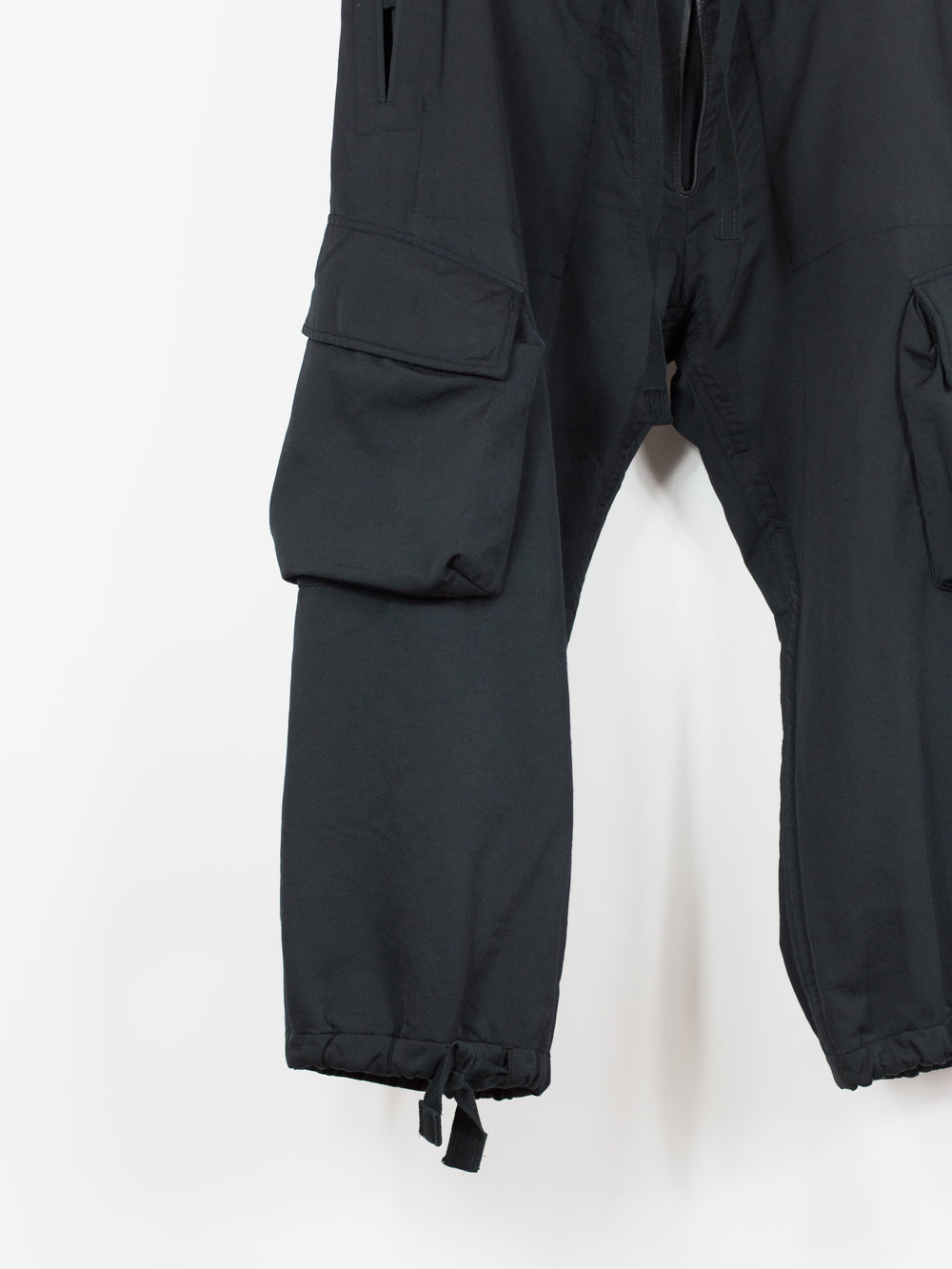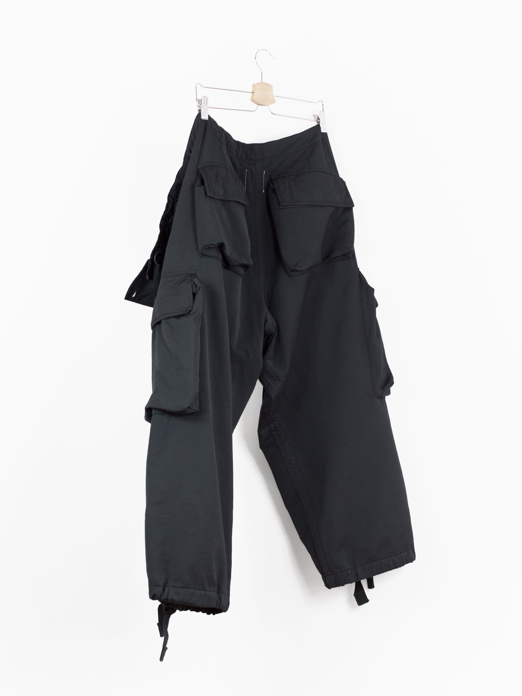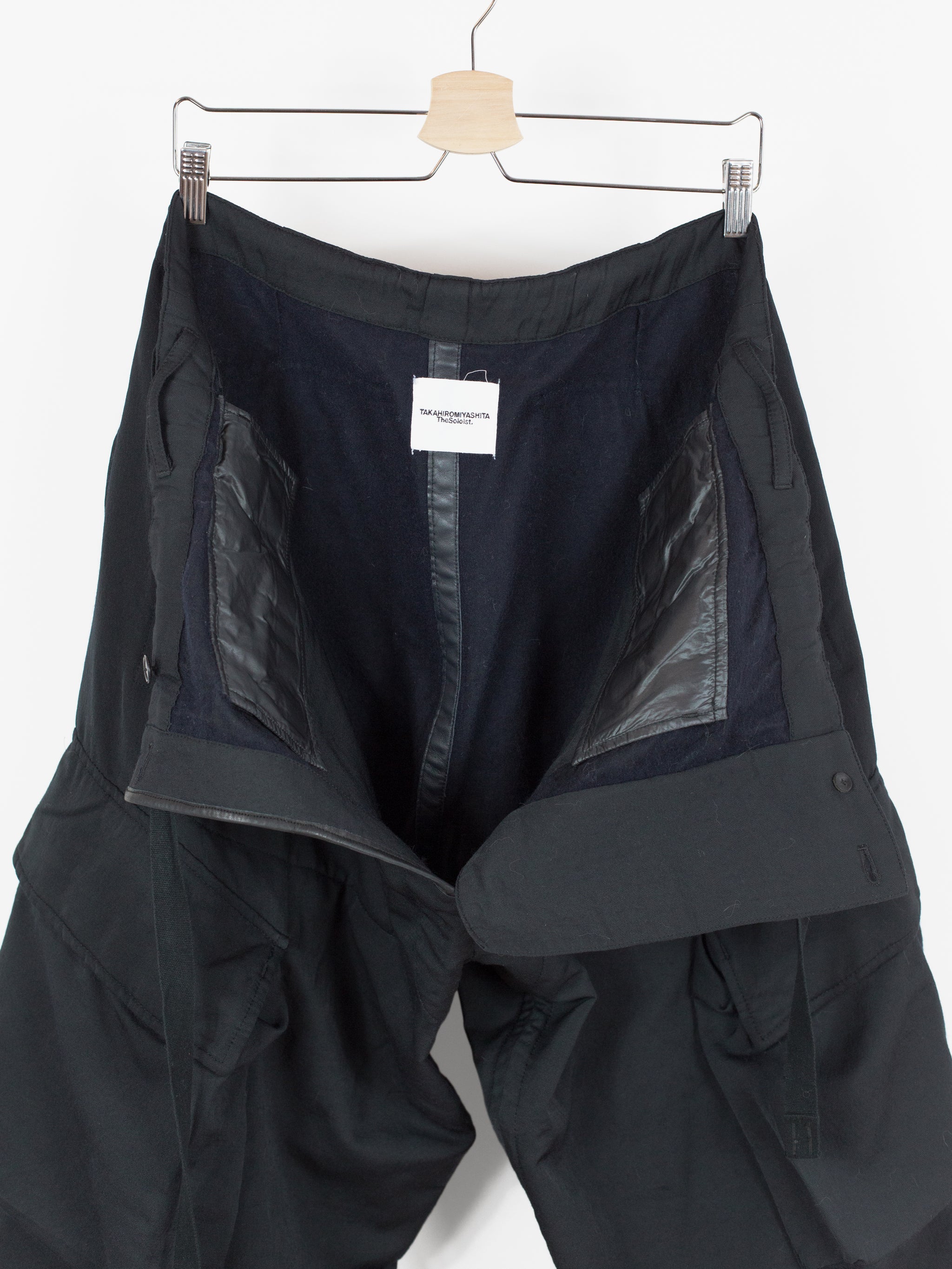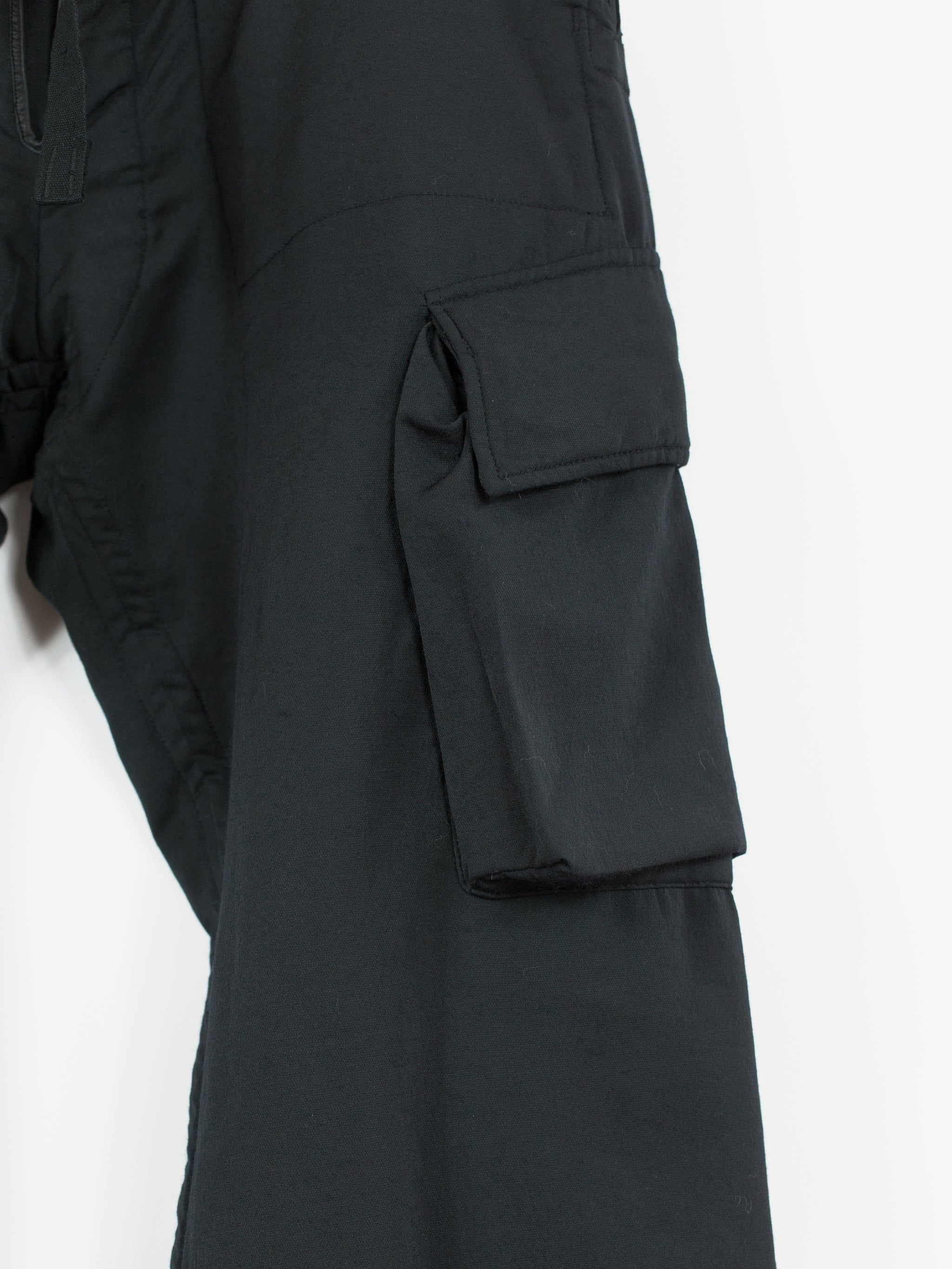 Takahiro Miyashita draws inspiration from the design of military overpants for this pair of ultra-wide baggy cargos. The rarest material version of these pants, this pair is fabricated in a technical polyester wool blend. The durable polyester face fabric has a luxuriously soft wool backing in a contrasting navy color, reading almost like a sweatpant loopback terry but elevated, sharp, and with a surprising lightness. It insulates yet has an airiness and openness that makes this a perfect 3 season pant (spring/fall/winter). The military bags rendered in this fabric fall with a round, sculptural drape, giving the silhouette a real sense of softness as can be seen in the 3D cargo pockets at the thighs and seat. The thigh and back pockets are finished with leather trim at the openings, giving them enough heft to stand off the body. Cut adjacent to the wool/cashmere lined front slash pockets are button-closed slits that echo those of military overpants, openings that allow the wearer to access the pockets of any trouser worn underneath. This pair also features nylon-taffeta patch pockets sewn to the inside of the pants adjacent to the opening. Additional vintage military overpant inspiration is found in the triple layer overlapped fly, here finished with leather bound edges and two buttons at the waist. The pant is rounded out with drawstring webbing at waist and hem to belt down the intentionally-oversized trouser and/or alter the fit at the leg opening.