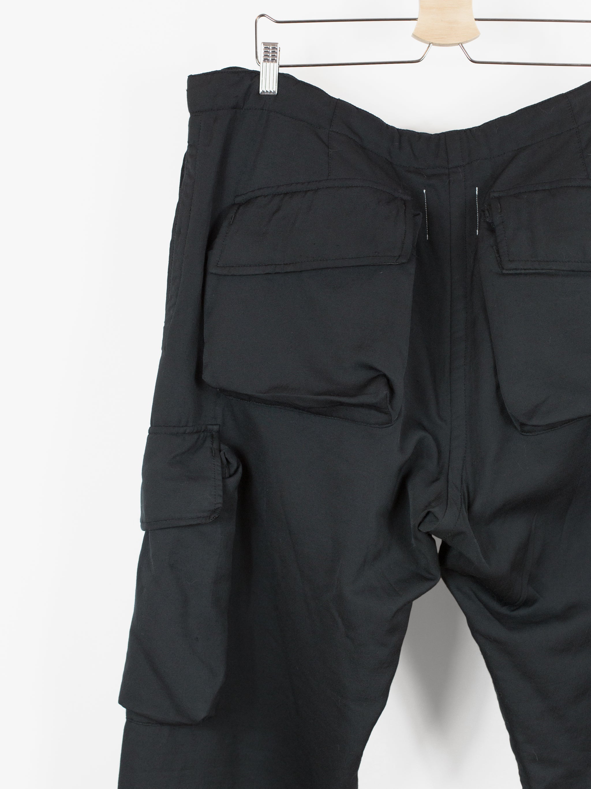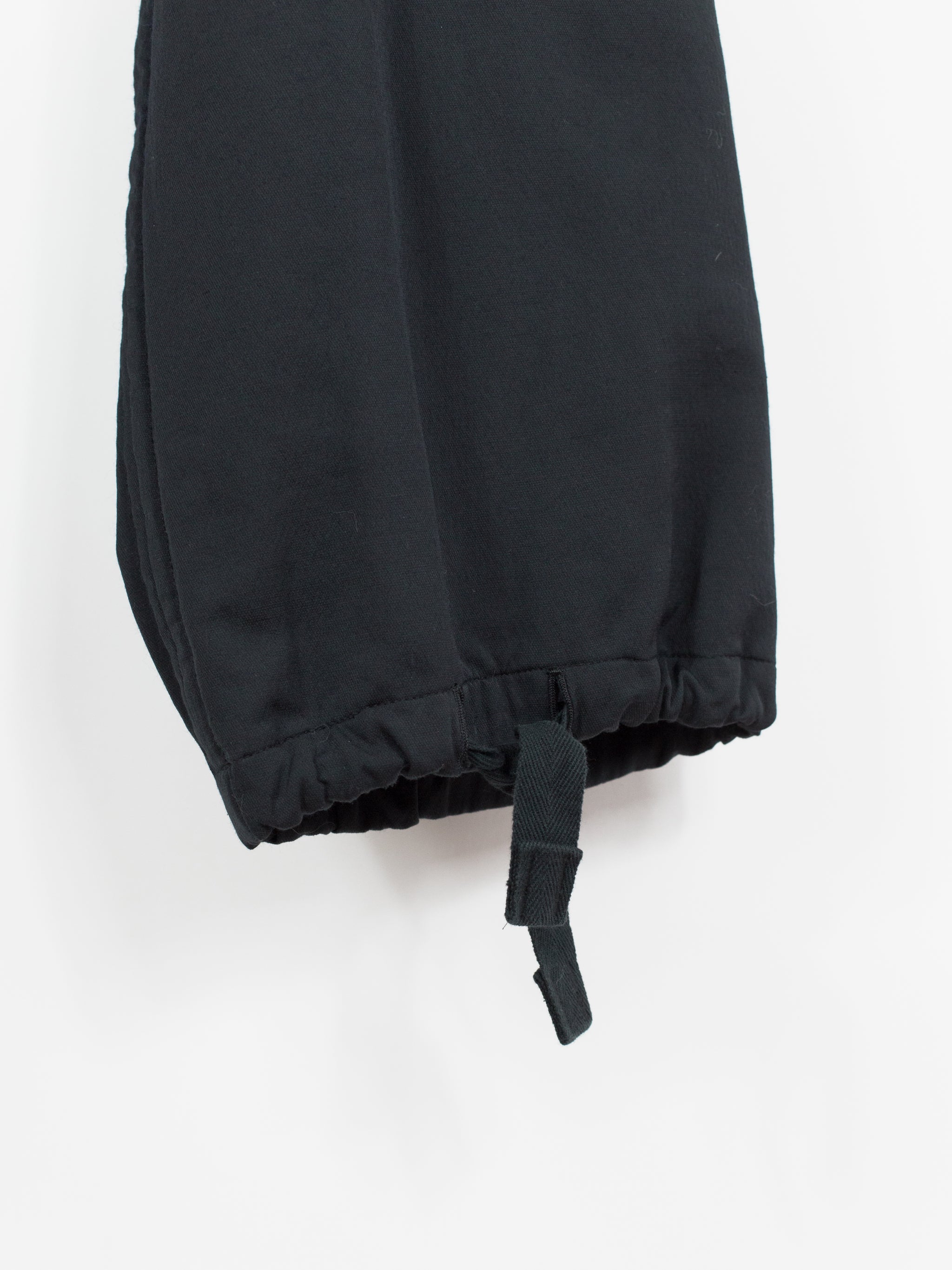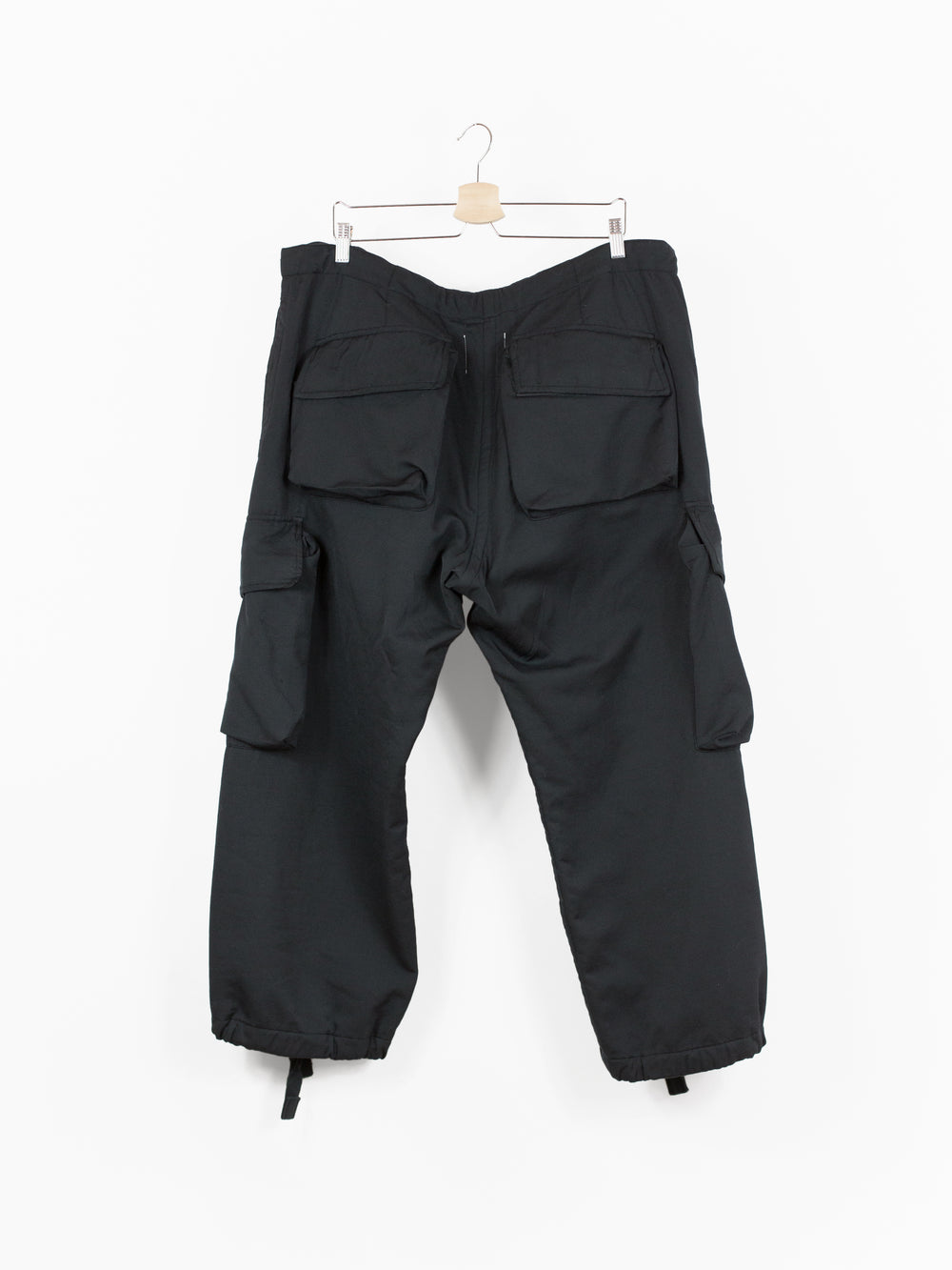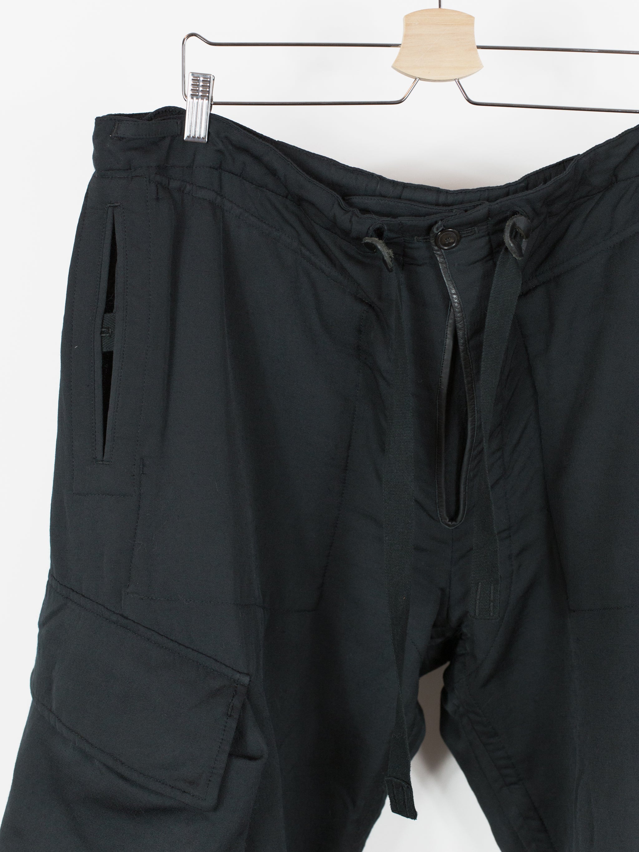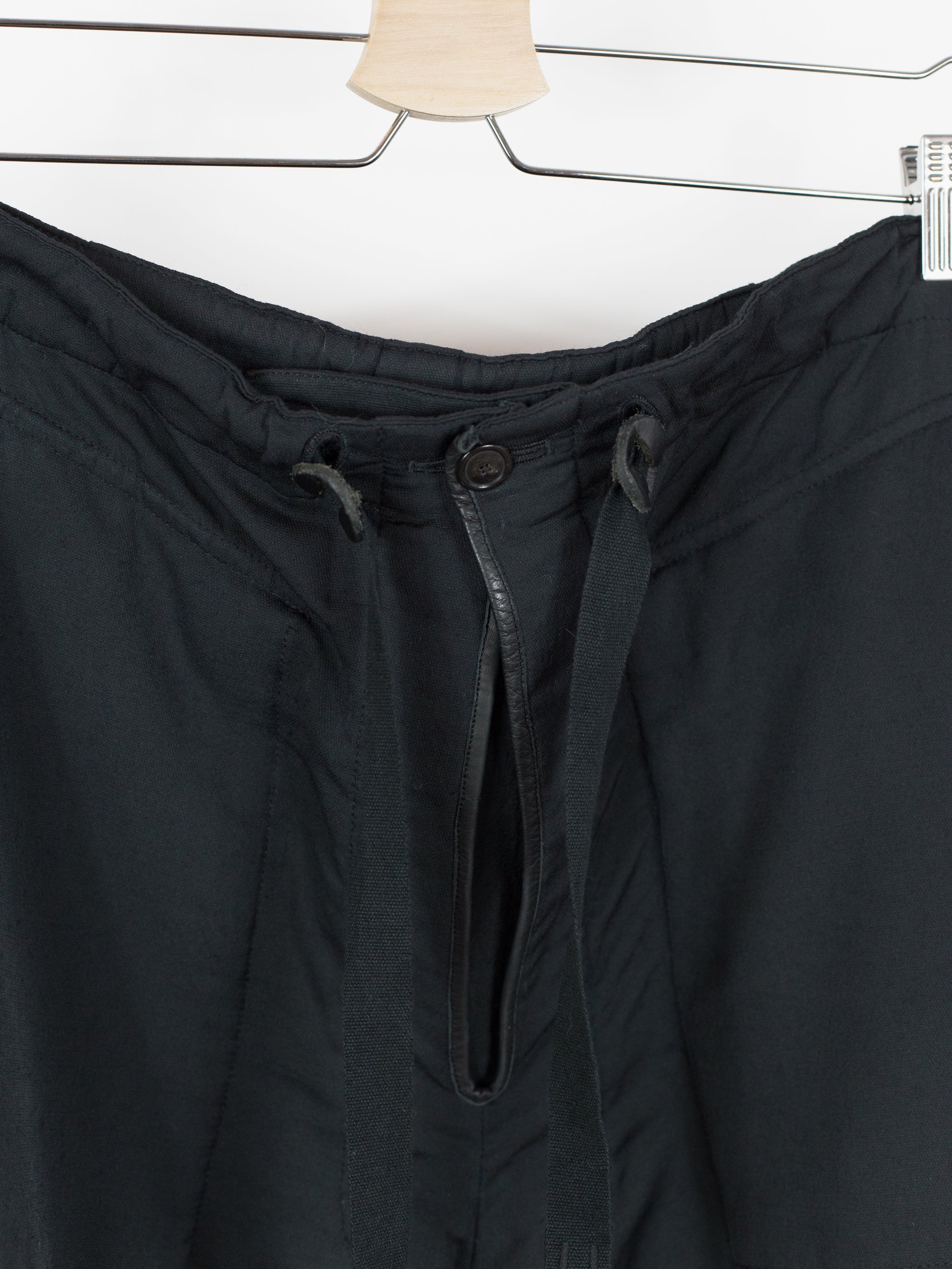 Takahiro Miyashita draws inspiration from the design of military overpants for this pair of ultra-wide baggy cargos. The rarest material version of these pants, this pair is fabricated in a technical polyester wool blend. The durable polyester face fabric has a luxuriously soft wool backing in a contrasting navy color, reading almost like a sweatpant loopback terry but elevated, sharp, and with a surprising lightness. It insulates yet has an airiness and openness that makes this a perfect 3 season pant (spring/fall/winter). The military bags rendered in this fabric fall with a round, sculptural drape, giving the silhouette a real sense of softness as can be seen in the 3D cargo pockets at the thighs and seat. The thigh and back pockets are finished with leather trim at the openings, giving them enough heft to stand off the body. Cut adjacent to the wool/cashmere lined front slash pockets are button-closed slits that echo those of military overpants, openings that allow the wearer to access the pockets of any trouser worn underneath. This pair also features nylon-taffeta patch pockets sewn to the inside of the pants adjacent to the opening. Additional vintage military overpant inspiration is found in the triple layer overlapped fly, here finished with leather bound edges and two buttons at the waist. The pant is rounded out with drawstring webbing at waist and hem to belt down the intentionally-oversized trouser and/or alter the fit at the leg opening.