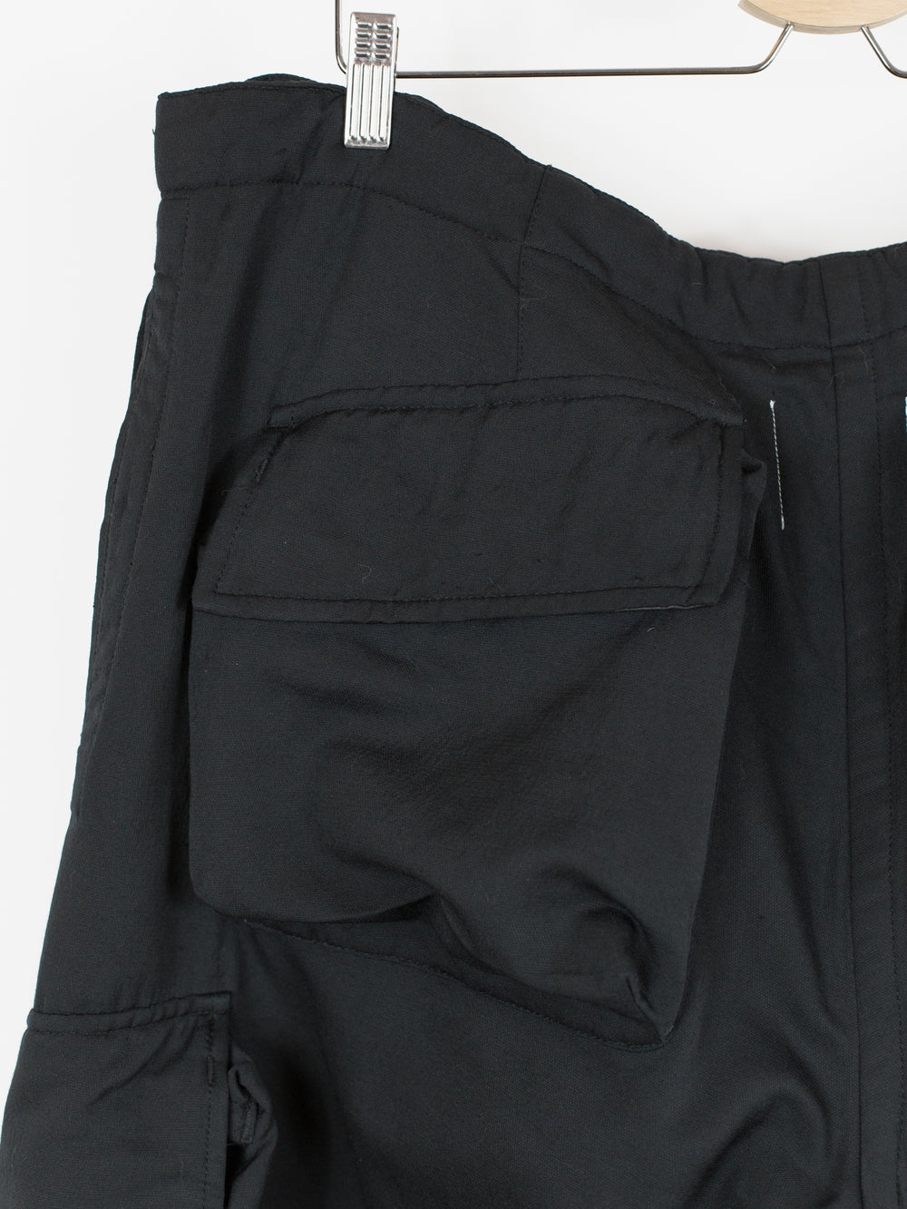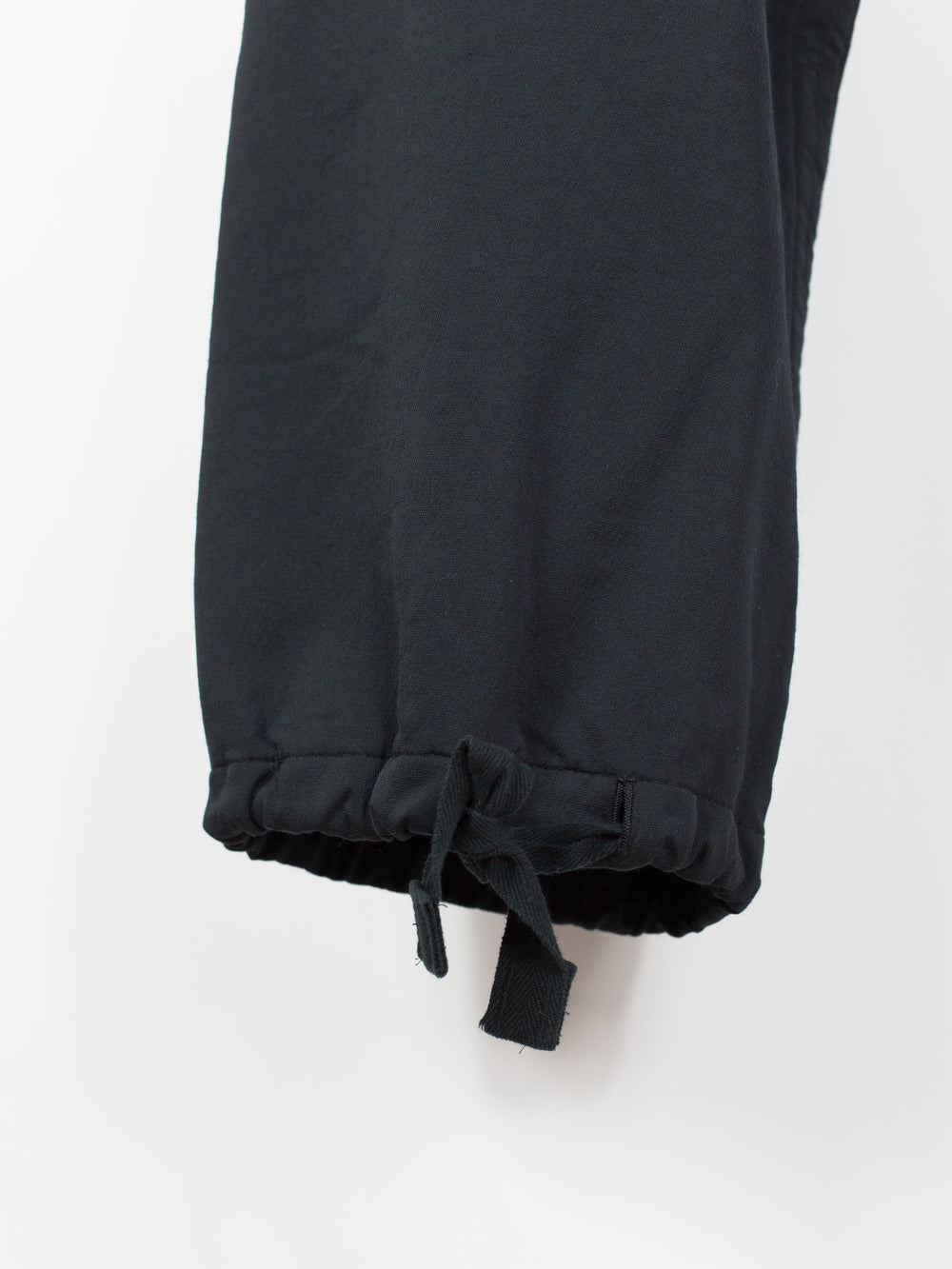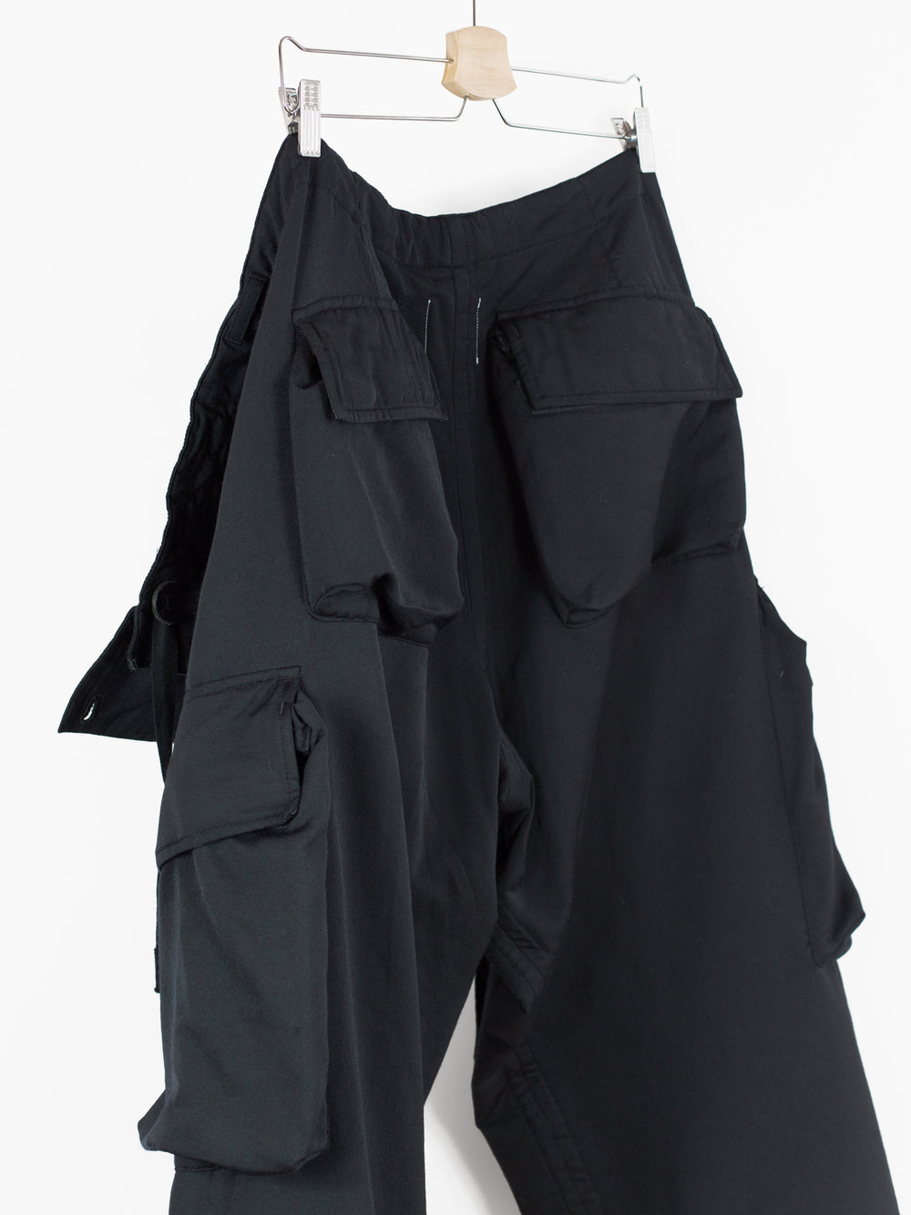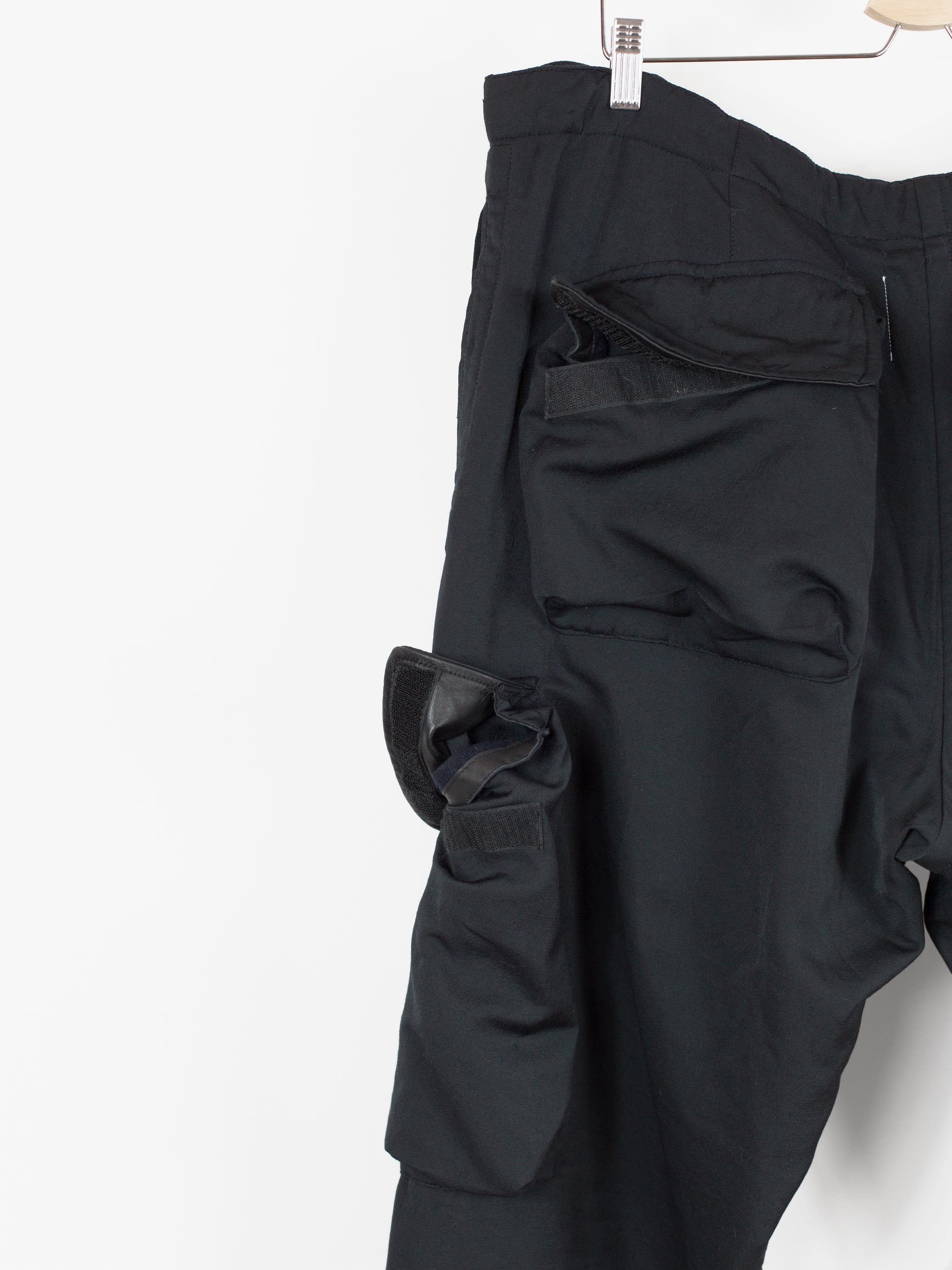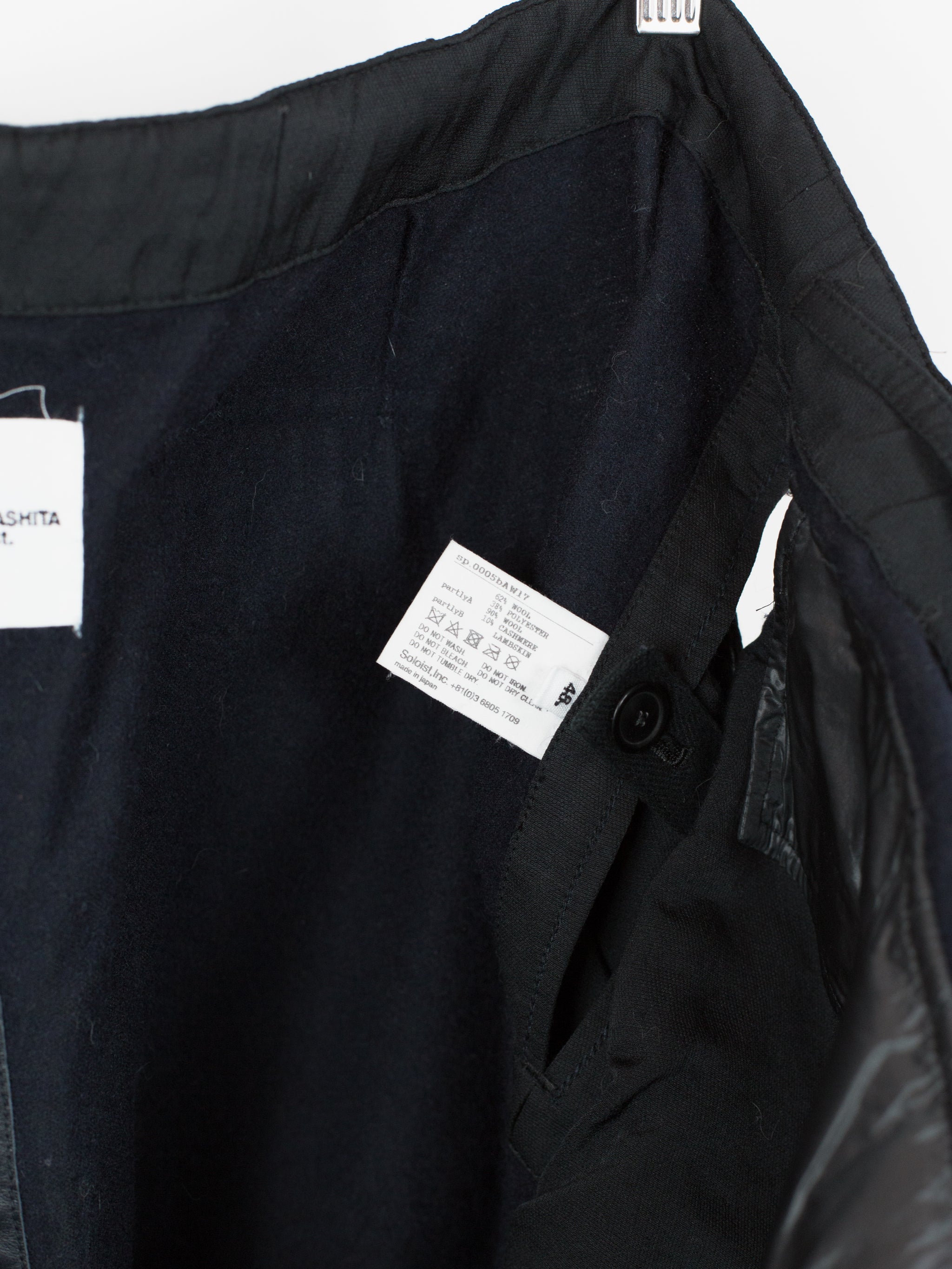 Takahiro Miyashita draws inspiration from the design of military overpants for this pair of ultra-wide baggy cargos. The rarest material version of these pants, this pair is fabricated in a technical polyester wool blend. The durable polyester face fabric has a luxuriously soft wool backing in a contrasting navy color, reading almost like a sweatpant loopback terry but elevated, sharp, and with a surprising lightness. It insulates yet has an airiness and openness that makes this a perfect 3 season pant (spring/fall/winter). The military bags rendered in this fabric fall with a round, sculptural drape, giving the silhouette a real sense of softness as can be seen in the 3D cargo pockets at the thighs and seat. The thigh and back pockets are finished with leather trim at the openings, giving them enough heft to stand off the body. Cut adjacent to the wool/cashmere lined front slash pockets are button-closed slits that echo those of military overpants, openings that allow the wearer to access the pockets of any trouser worn underneath. This pair also features nylon-taffeta patch pockets sewn to the inside of the pants adjacent to the opening. Additional vintage military overpant inspiration is found in the triple layer overlapped fly, here finished with leather bound edges and two buttons at the waist. The pant is rounded out with drawstring webbing at waist and hem to belt down the intentionally-oversized trouser and/or alter the fit at the leg opening.