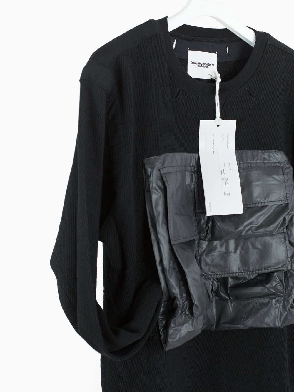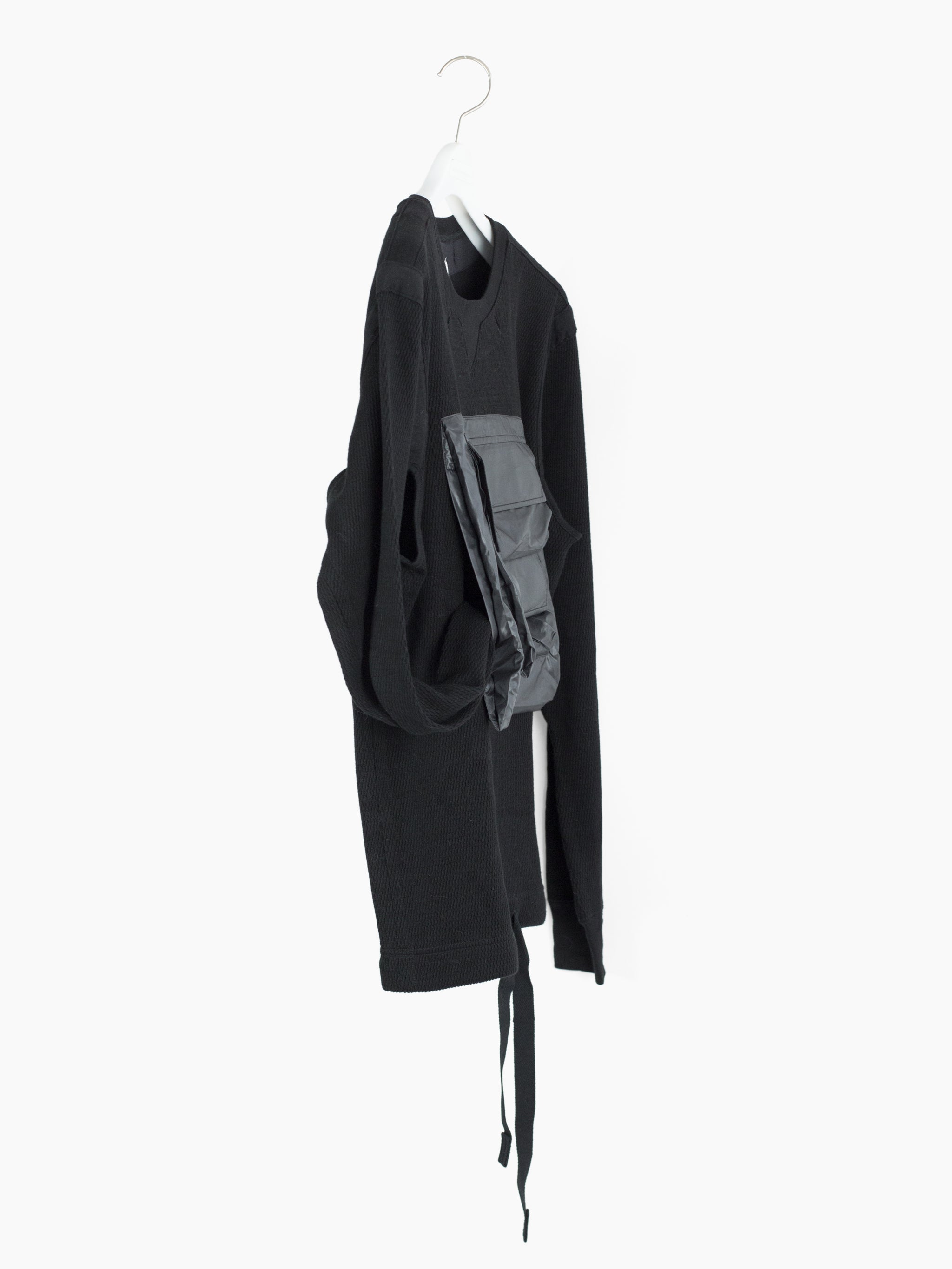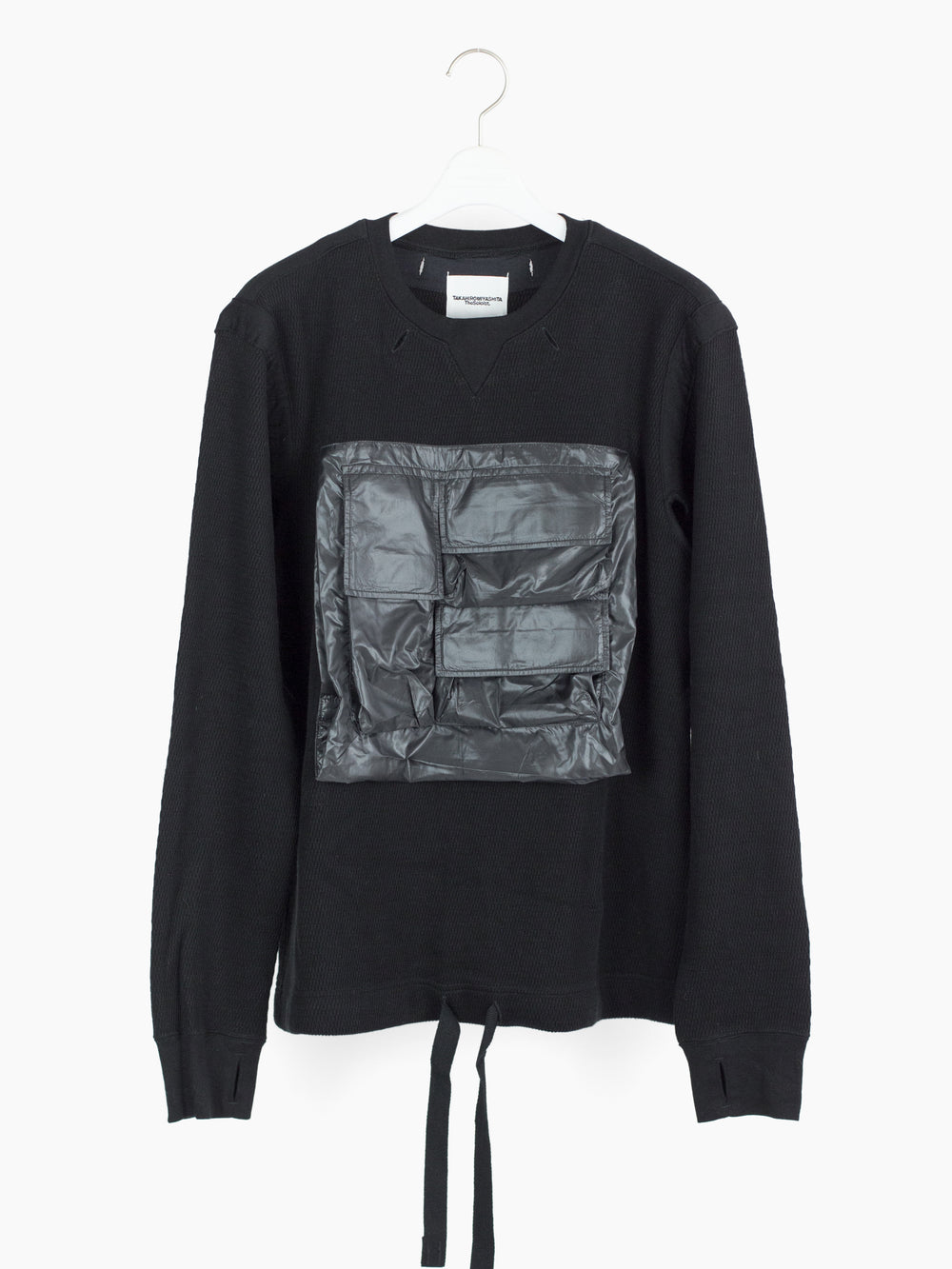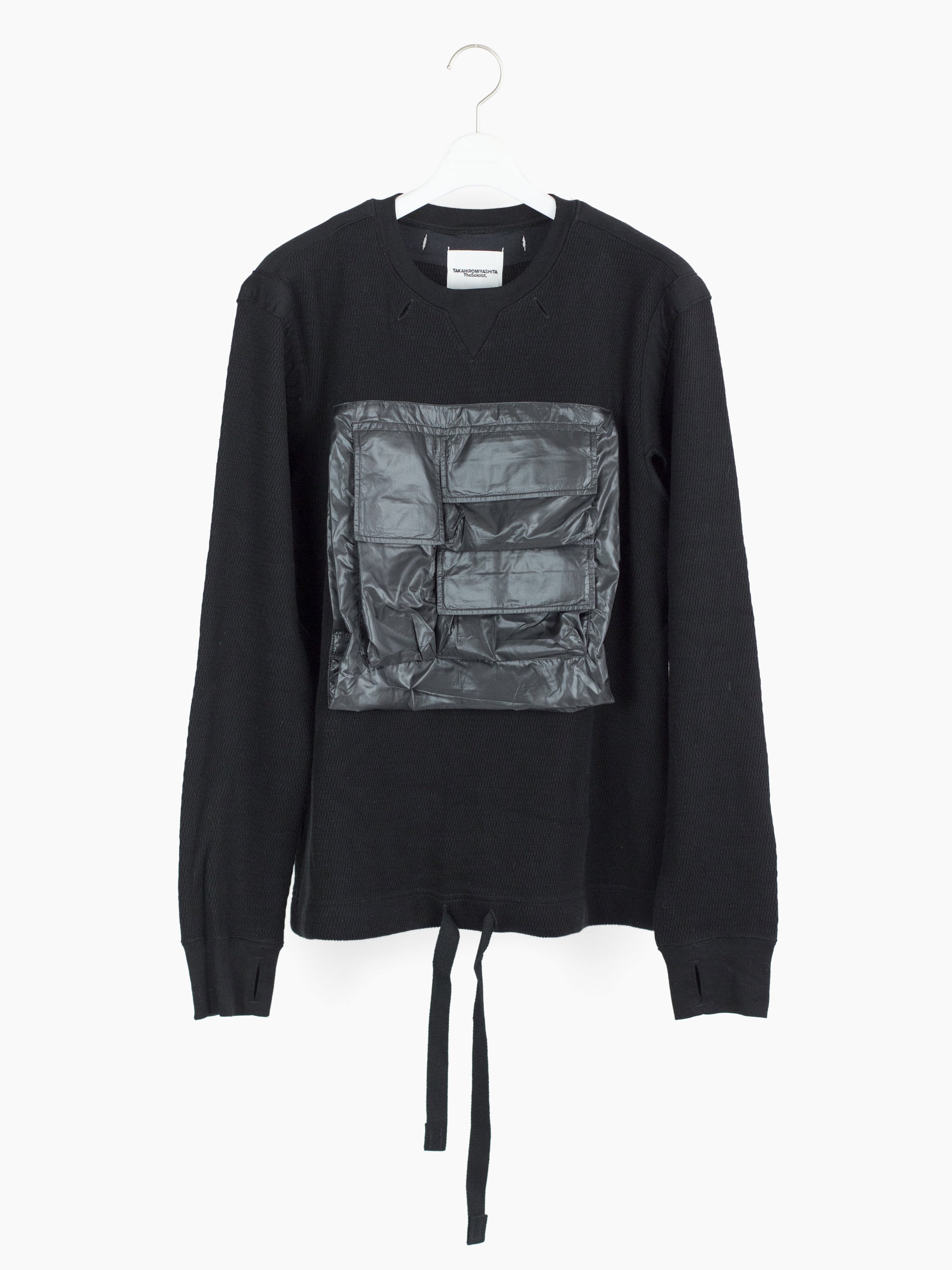 Longsleeve waffle top form Soloist's AW17 collection featuring the season's iconic multi-pocket cargo array detail at the center front. It features 3 different velcro-closed flap pockets set atop a huge rectangular panel that creates a kangaroo style front pocket with side entries. Thanks to the 20% silk content in the waffle fabric, it feels luxuriously soft next-to-skin, with an extremely smooth and fluid hand. Open armpits help with temperature regulation and layering, and thumb holes let you wear the cuffs over hands for more coverage. Stitched button-hole style openings at the neckline allow this piece to interface with the attachment hoods.