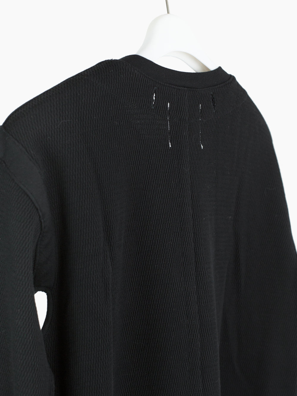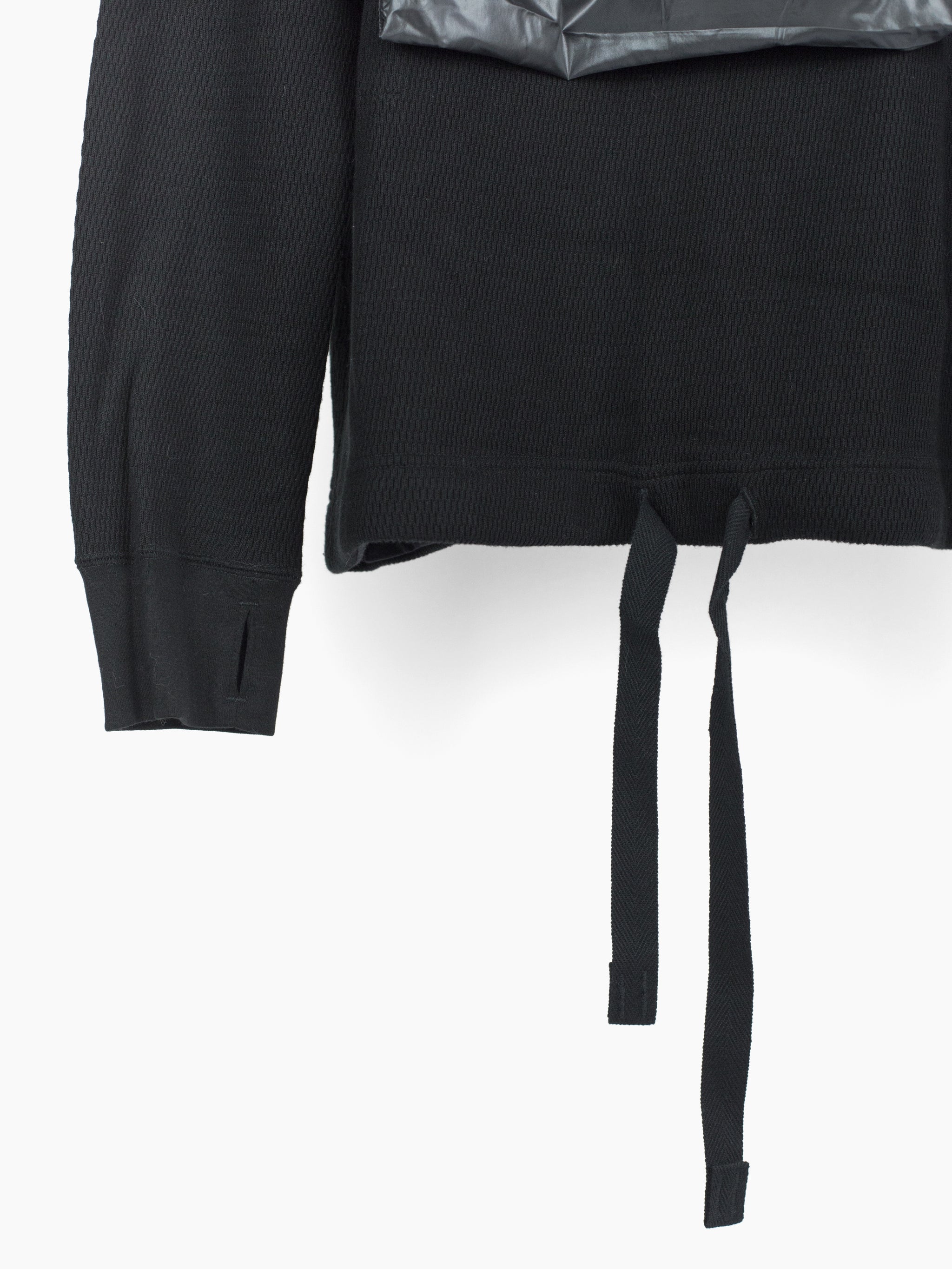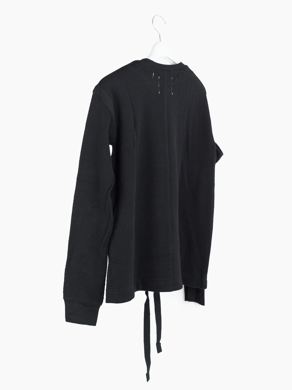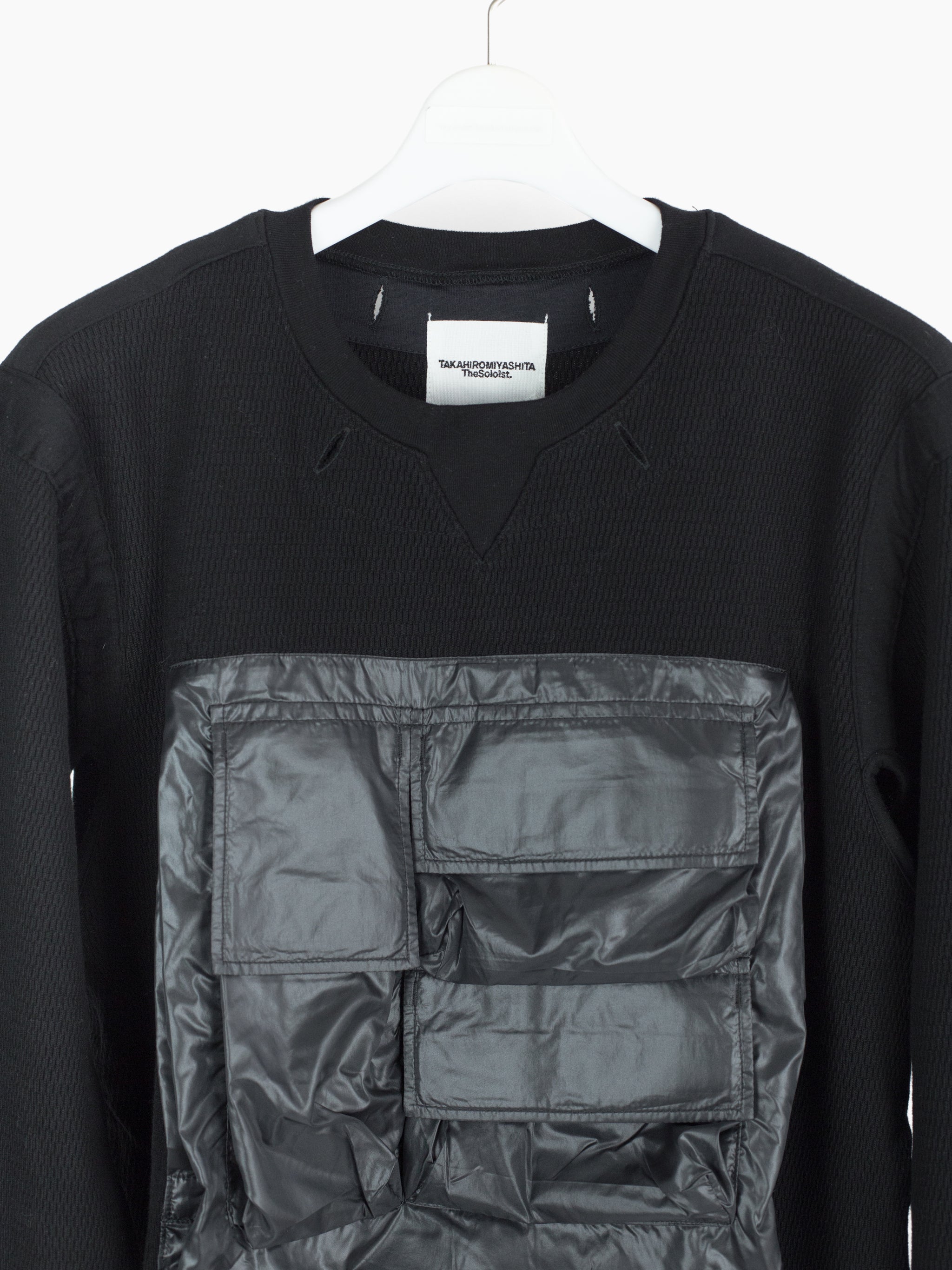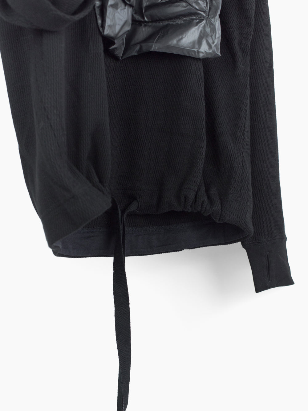 Longsleeve waffle top form Soloist's AW17 collection featuring the season's iconic multi-pocket cargo array detail at the center front. It features 3 different velcro-closed flap pockets set atop a huge rectangular panel that creates a kangaroo style front pocket with side entries. Thanks to the 20% silk content in the waffle fabric, it feels luxuriously soft next-to-skin, with an extremely smooth and fluid hand. Open armpits help with temperature regulation and layering, and thumb holes let you wear the cuffs over hands for more coverage. Stitched button-hole style openings at the neckline allow this piece to interface with the attachment hoods.