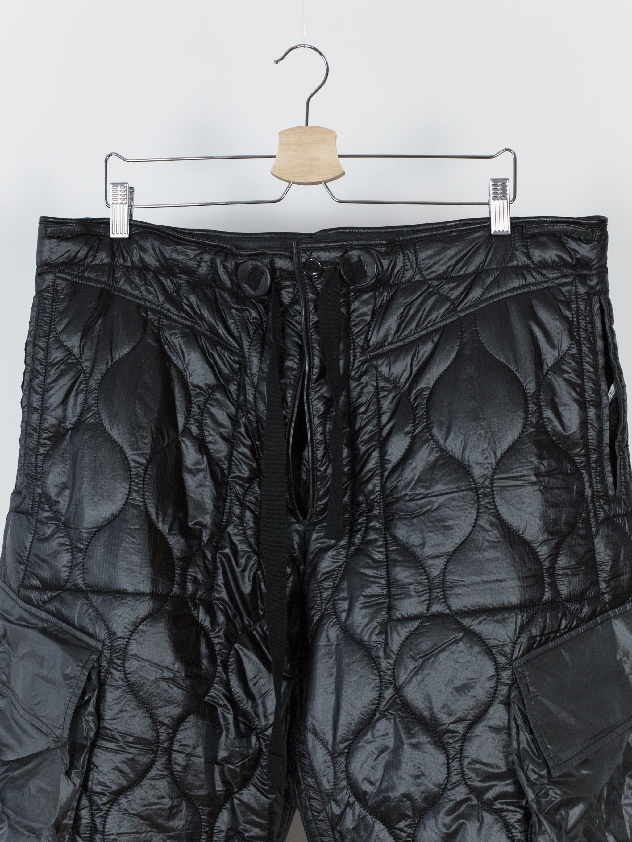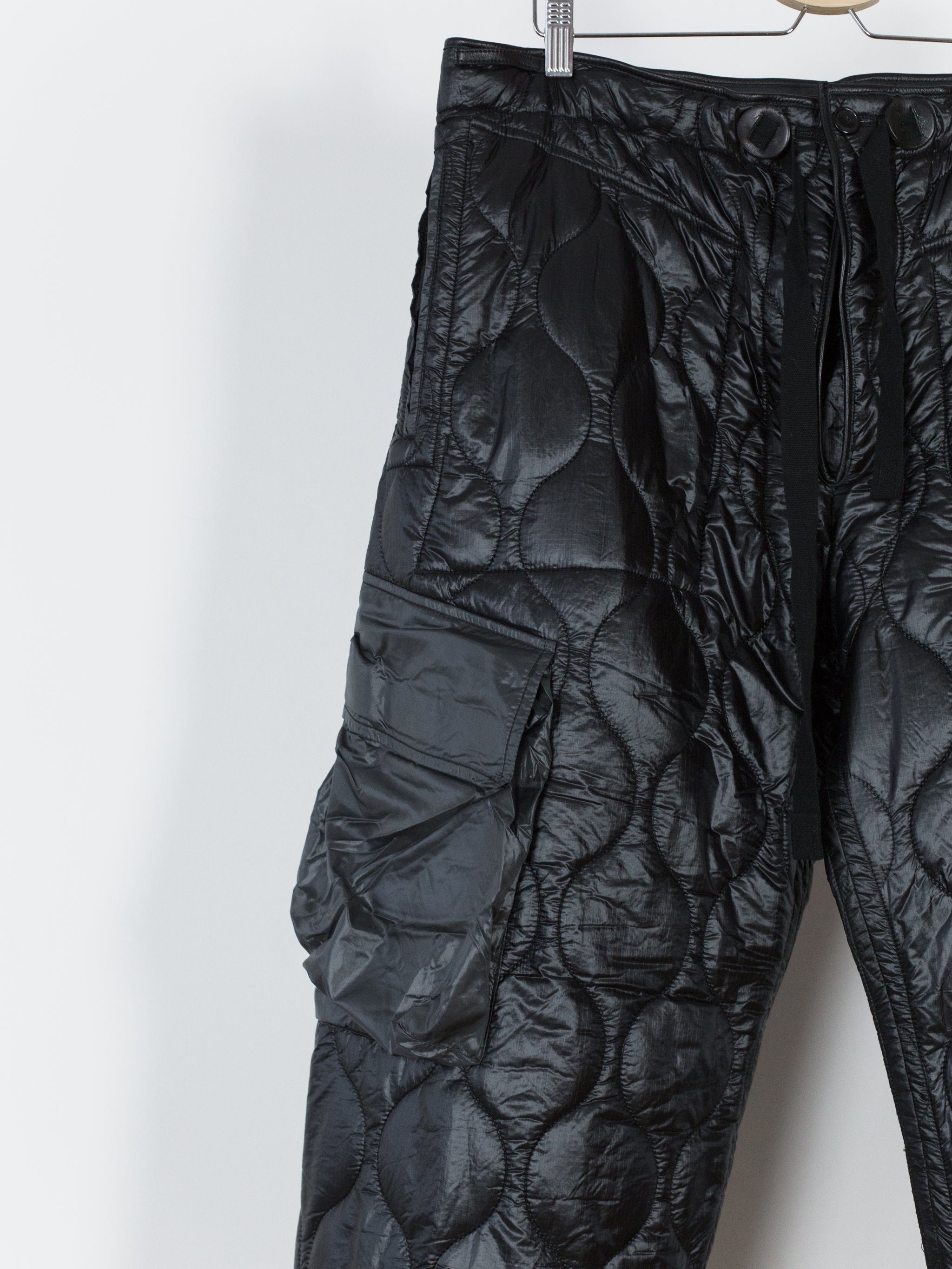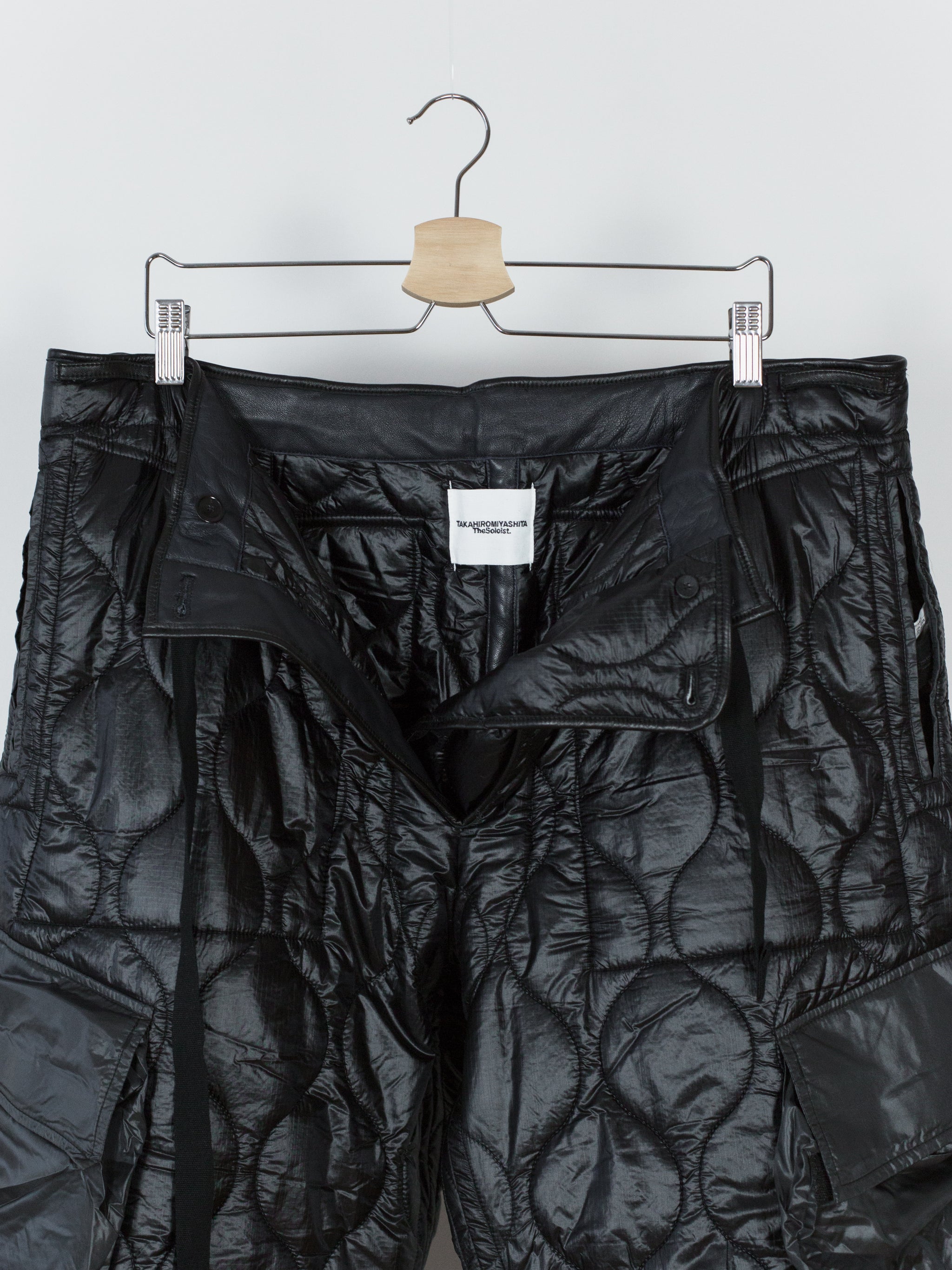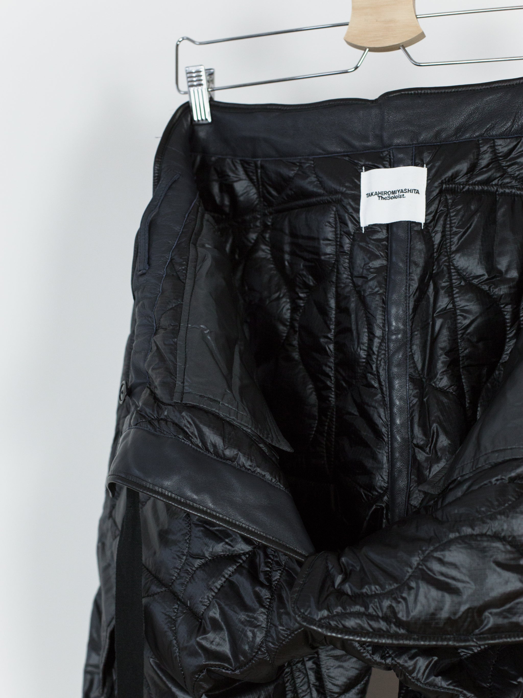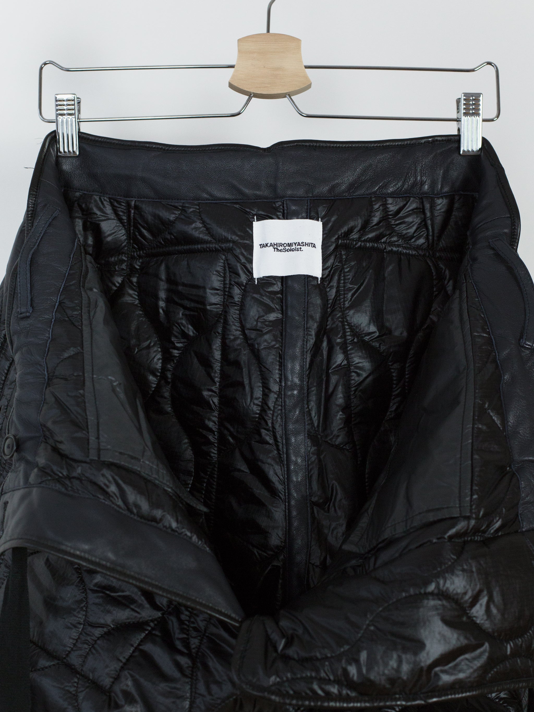 Takahiro Miyashita draws inspiration from the design of military overpants for this pair of ultra-wide baggy cargos. This iteration is cut in a quilted nylon taffeta with primaloft insulation that has become a sort of namesake fabric utilized by The Soloist (Across AW17, AW18, AW19). It is ultra lightweight yet, thanks to the insulation, very bouncy, windproof, and lightly structured, creating a voluminous 3D shroud of warmth when worn. It features a slightly different fabrication from the other materials as the edges are finished in leather binding and the casings for the waistband and hem are also cut in supple lambskin. The patch pockets on this iteration are done in a super lightweight nylon taffeta and visually break up the quilted pattern. Cut adjacent to the wool/cashmere lined front slash pockets are button-closed slits that echo those of military overpants, openings that allow the wearer to access the pockets of any trouser worn underneath. The pants feature nylon-taffeta patch pockets sewn to the inside of the pants adjacent to the opening. Additional vintage military overpant inspiration is found in the triple layer overlapped fly, here finished with leather bound edges and two buttons at the waist. The pant is rounded out with drawstring webbing at waist and hem to belt down the intentionally-oversized trouser and/or alter the fit at the leg opening.