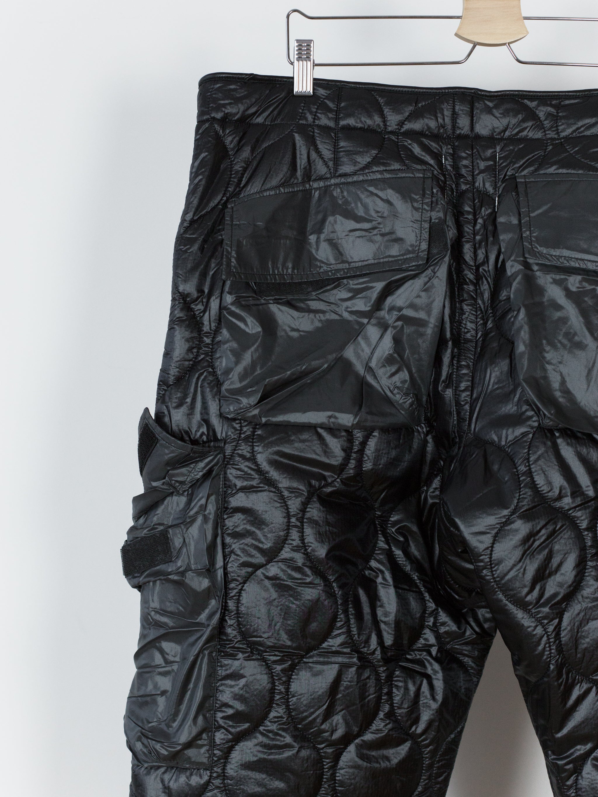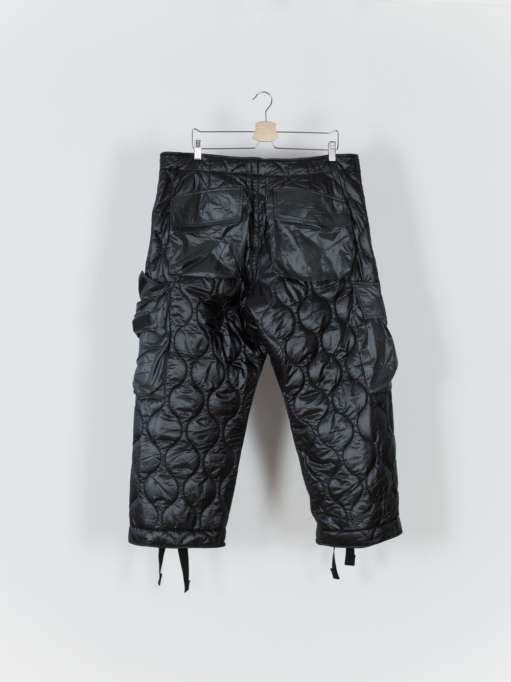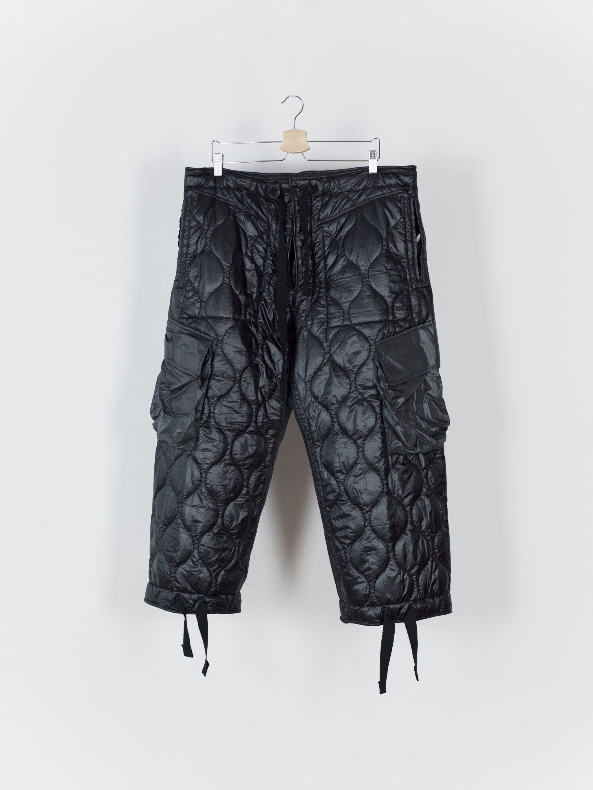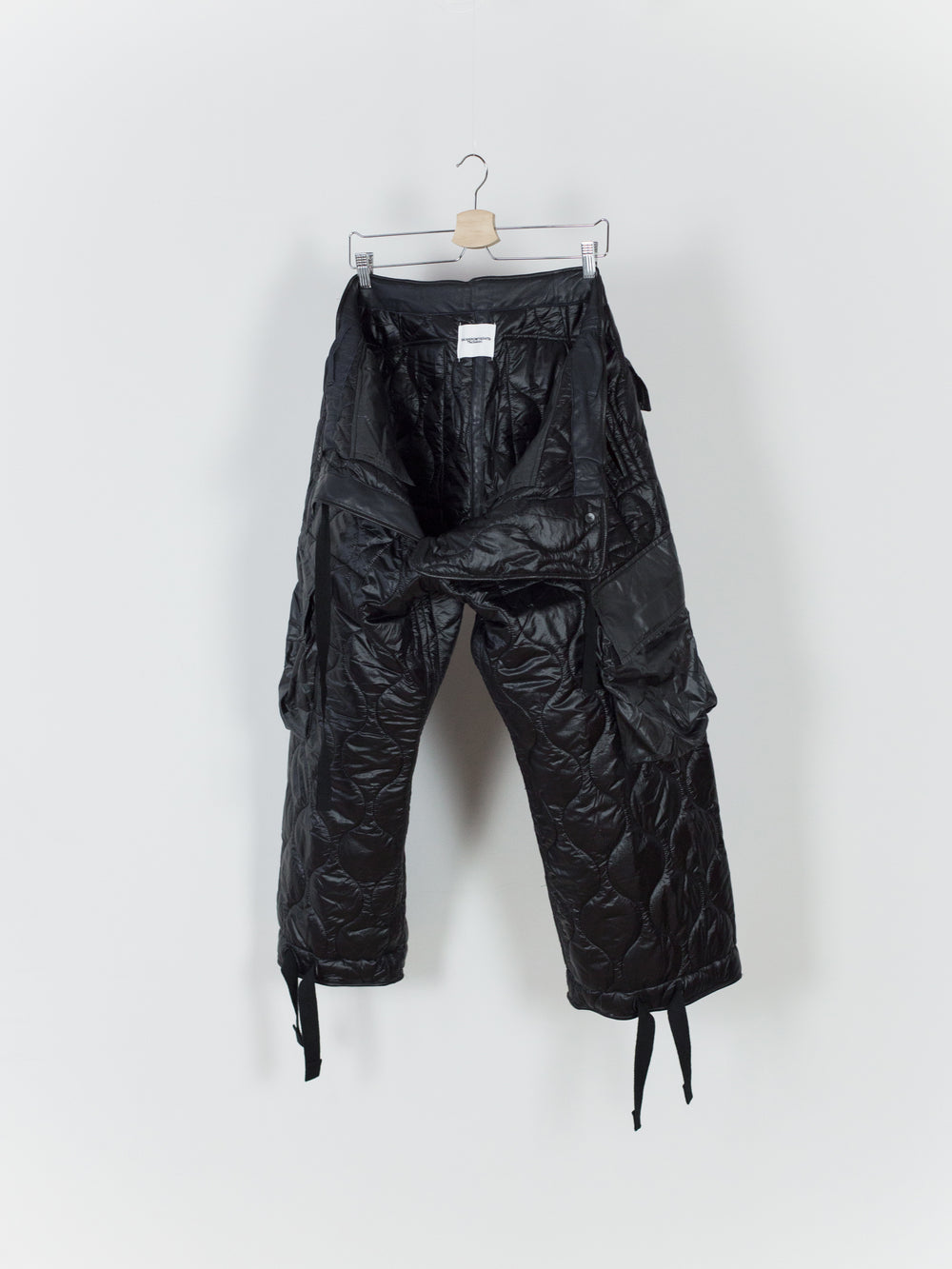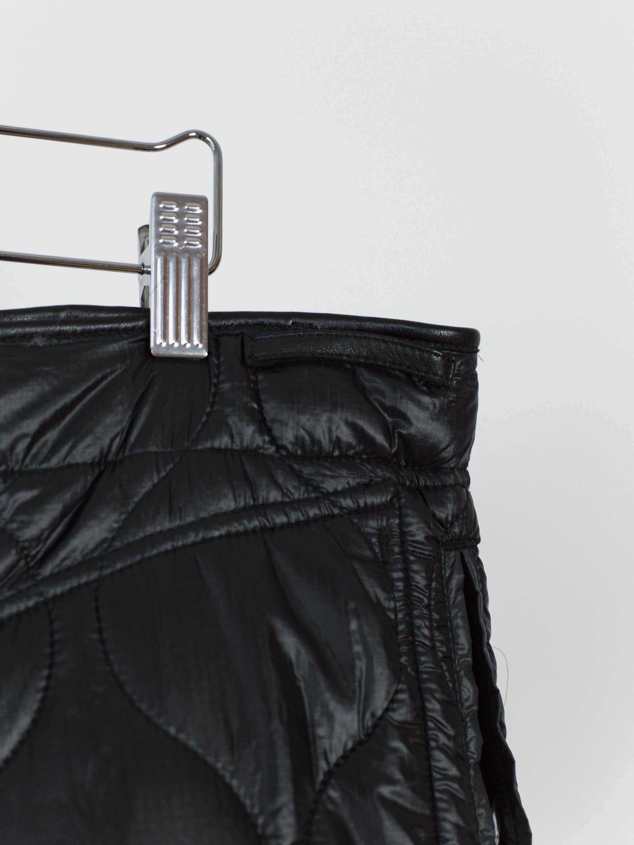 Takahiro Miyashita draws inspiration from the design of military overpants for this pair of ultra-wide baggy cargos. This iteration is cut in a quilted nylon taffeta with primaloft insulation that has become a sort of namesake fabric utilized by The Soloist (Across AW17, AW18, AW19). It is ultra lightweight yet, thanks to the insulation, very bouncy, windproof, and lightly structured, creating a voluminous 3D shroud of warmth when worn. It features a slightly different fabrication from the other materials as the edges are finished in leather binding and the casings for the waistband and hem are also cut in supple lambskin. The patch pockets on this iteration are done in a super lightweight nylon taffeta and visually break up the quilted pattern. Cut adjacent to the wool/cashmere lined front slash pockets are button-closed slits that echo those of military overpants, openings that allow the wearer to access the pockets of any trouser worn underneath. The pants feature nylon-taffeta patch pockets sewn to the inside of the pants adjacent to the opening. Additional vintage military overpant inspiration is found in the triple layer overlapped fly, here finished with leather bound edges and two buttons at the waist. The pant is rounded out with drawstring webbing at waist and hem to belt down the intentionally-oversized trouser and/or alter the fit at the leg opening.