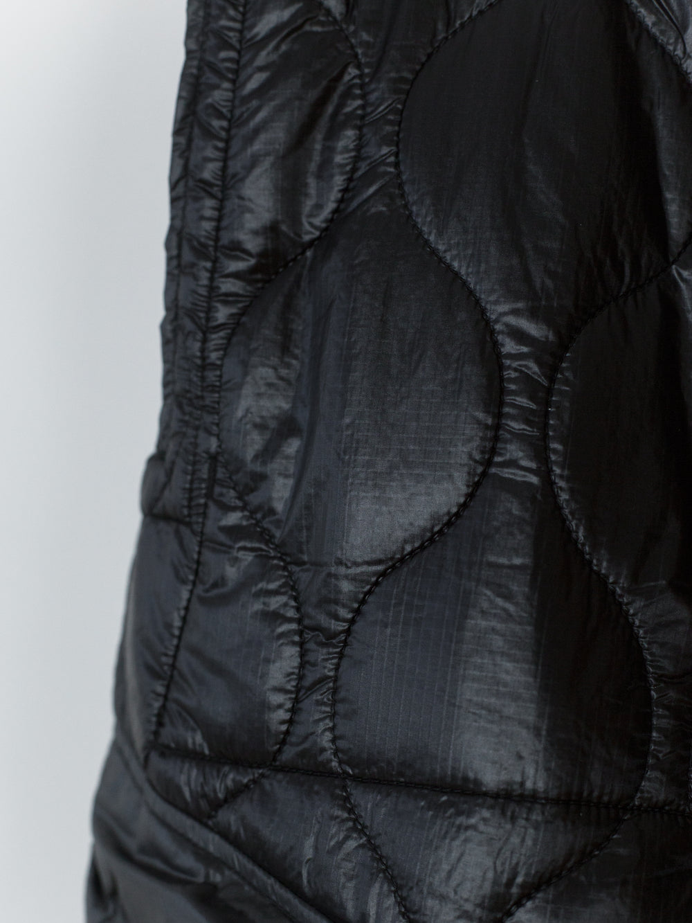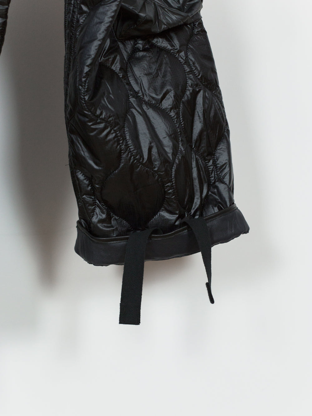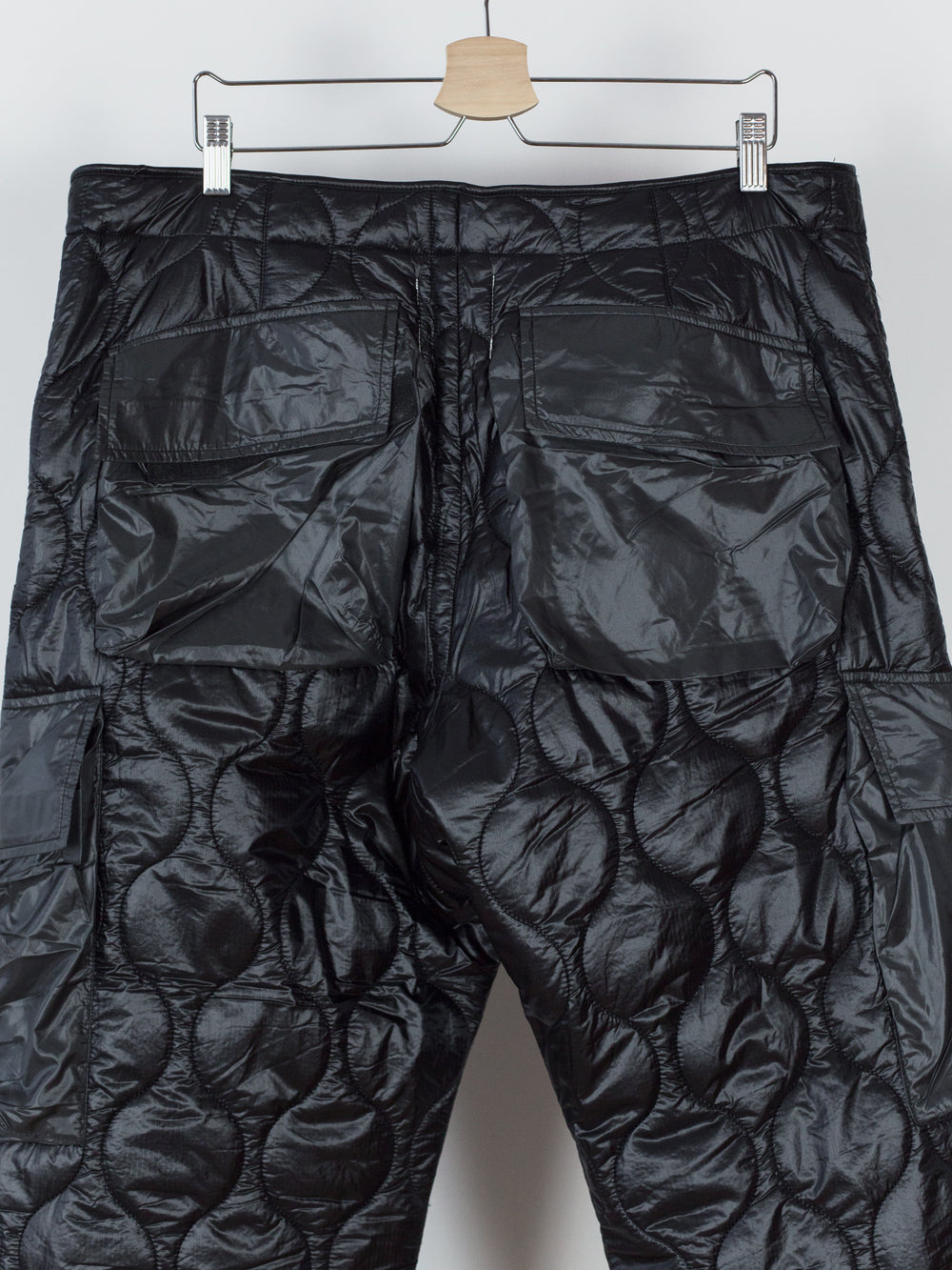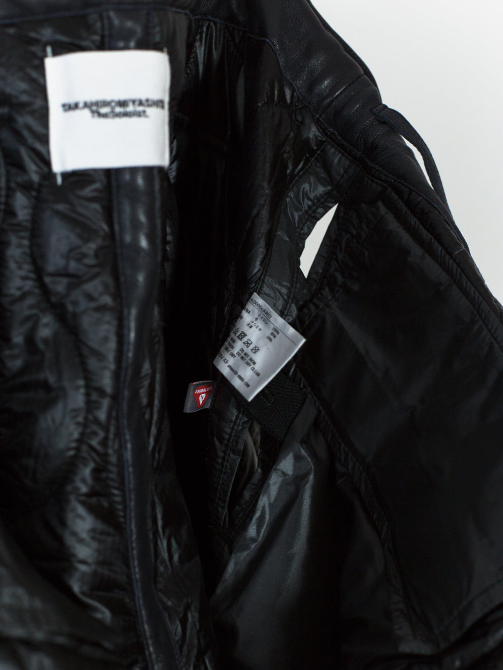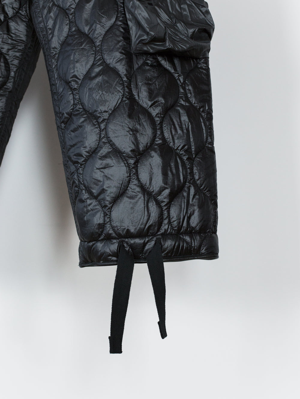 Takahiro Miyashita draws inspiration from the design of military overpants for this pair of ultra-wide baggy cargos. This iteration is cut in a quilted nylon taffeta with primaloft insulation that has become a sort of namesake fabric utilized by The Soloist (Across AW17, AW18, AW19). It is ultra lightweight yet, thanks to the insulation, very bouncy, windproof, and lightly structured, creating a voluminous 3D shroud of warmth when worn. It features a slightly different fabrication from the other materials as the edges are finished in leather binding and the casings for the waistband and hem are also cut in supple lambskin. The patch pockets on this iteration are done in a super lightweight nylon taffeta and visually break up the quilted pattern. Cut adjacent to the wool/cashmere lined front slash pockets are button-closed slits that echo those of military overpants, openings that allow the wearer to access the pockets of any trouser worn underneath. The pants feature nylon-taffeta patch pockets sewn to the inside of the pants adjacent to the opening. Additional vintage military overpant inspiration is found in the triple layer overlapped fly, here finished with leather bound edges and two buttons at the waist. The pant is rounded out with drawstring webbing at waist and hem to belt down the intentionally-oversized trouser and/or alter the fit at the leg opening.
