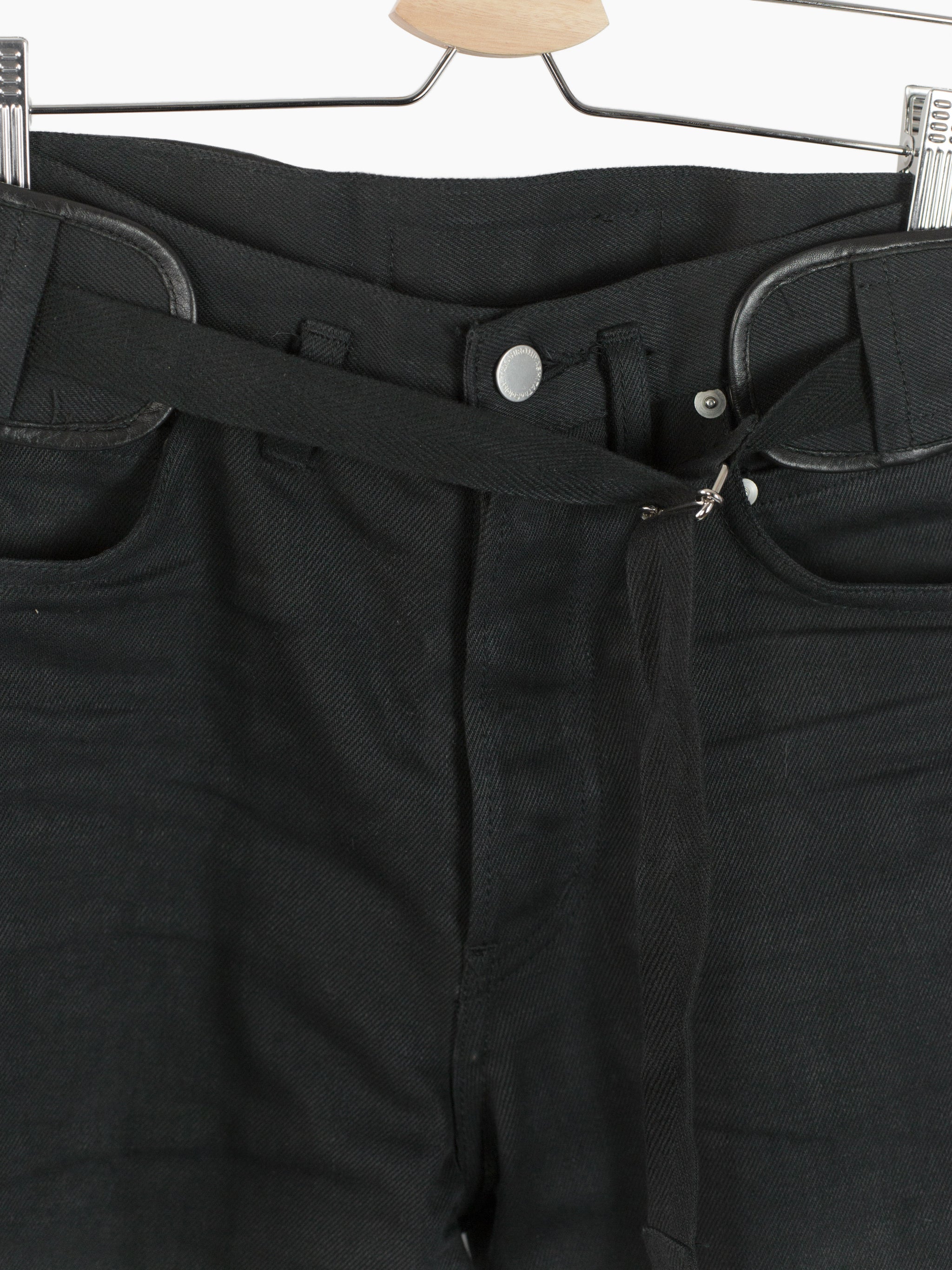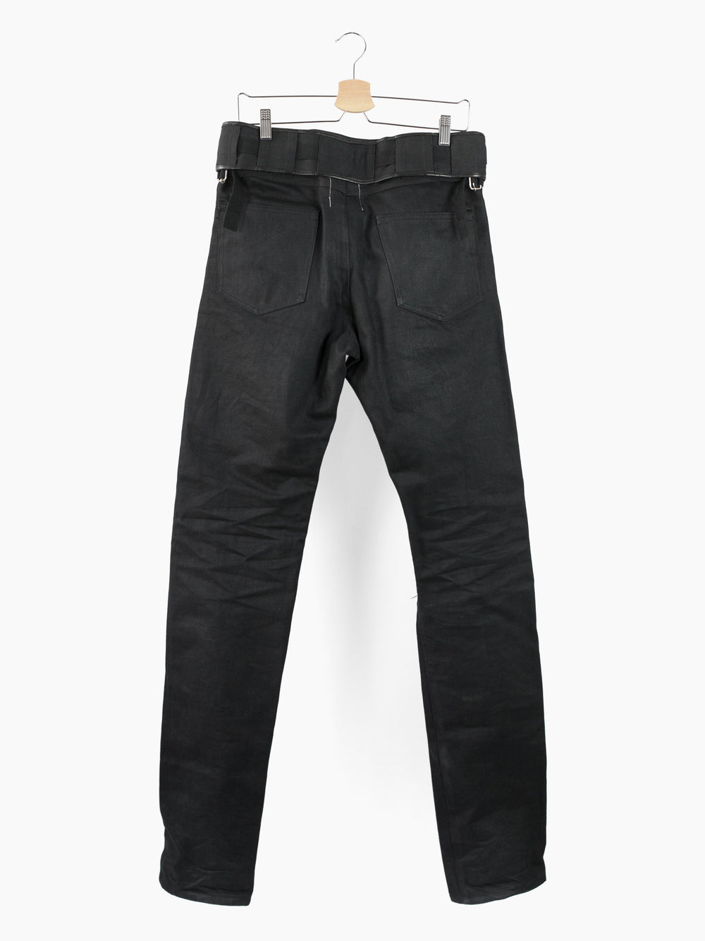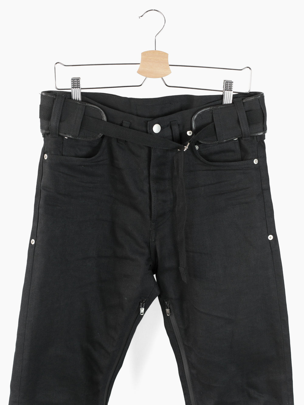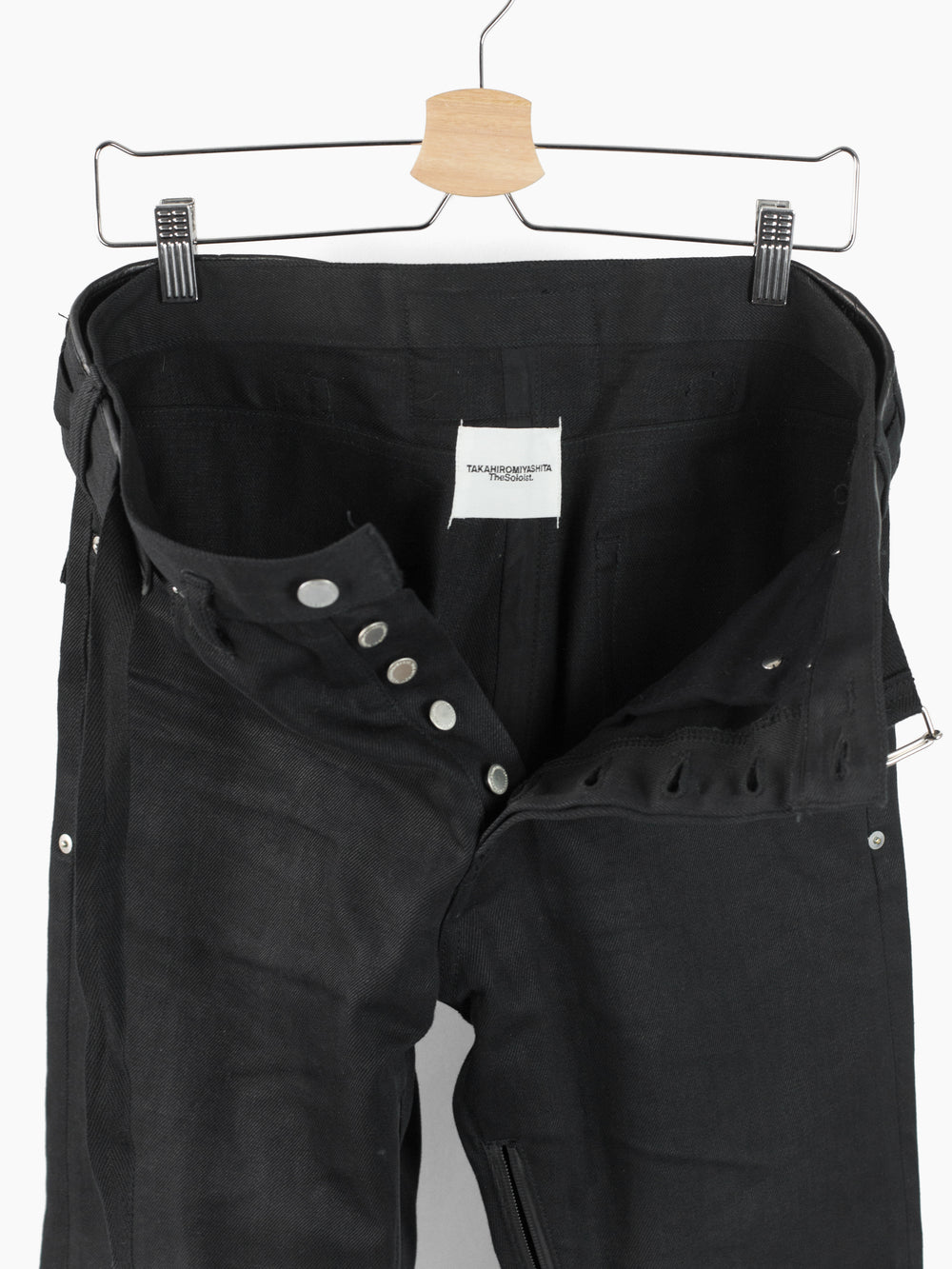 Staple selvedge black jeans with from Takahiromiyashita The Soloist, featuring seasonal signature detailing throughout including hip-strap/corset style waist belt, double symmetrical coin pockets, inner thigh snowboard-style aquaguard zippers for ventilation, and additional ornamental rivets at the hips. The denim itself falls with an impressive structure, with a very subtle coating that brings just the slightest sheen.