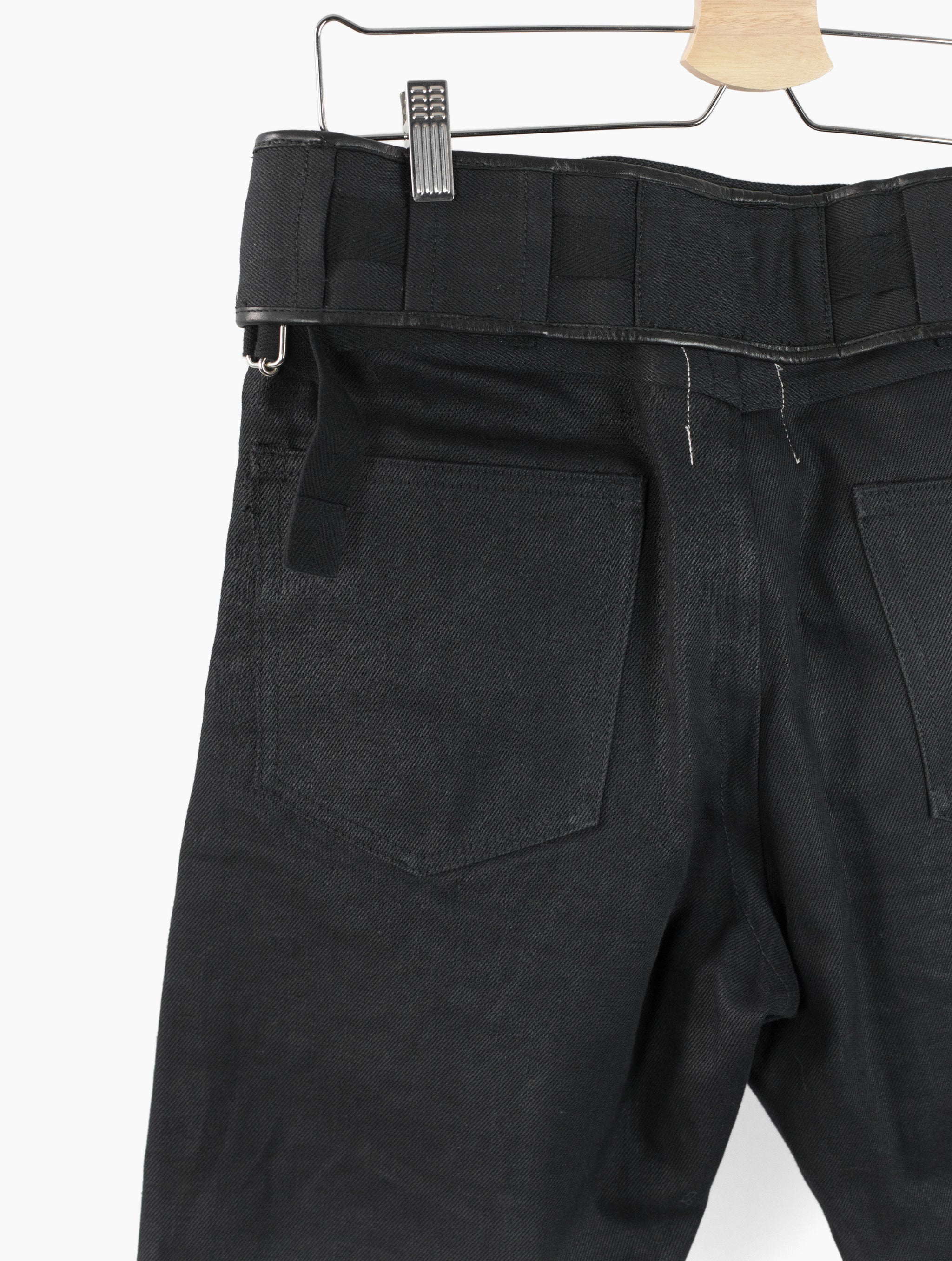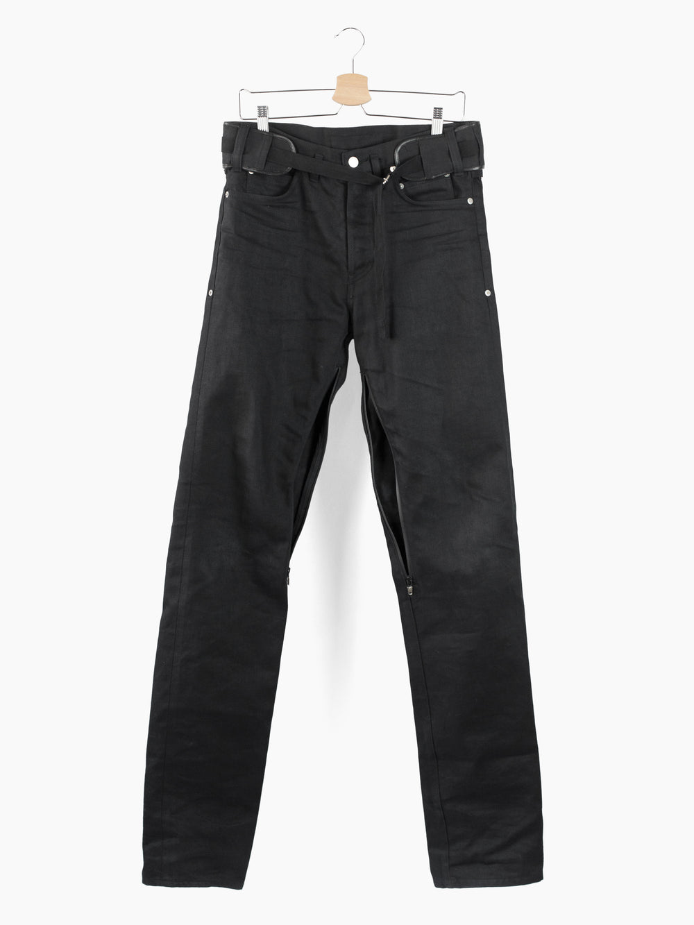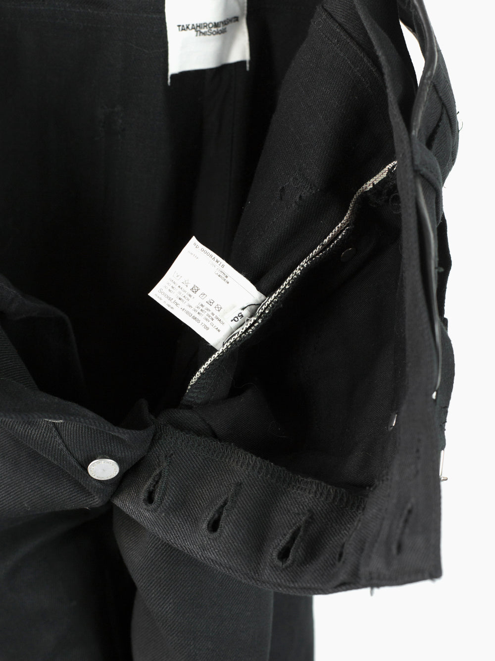 Staple selvedge black jeans with from Takahiromiyashita The Soloist, featuring seasonal signature detailing throughout including hip-strap/corset style waist belt, double symmetrical coin pockets, inner thigh snowboard-style aquaguard zippers for ventilation, and additional ornamental rivets at the hips. The denim itself falls with an impressive structure, with a very subtle coating that brings just the slightest sheen.