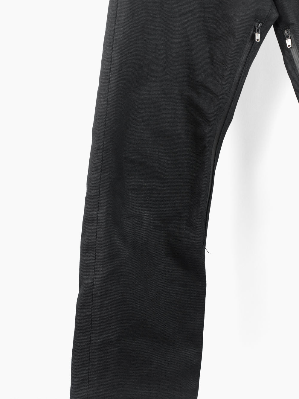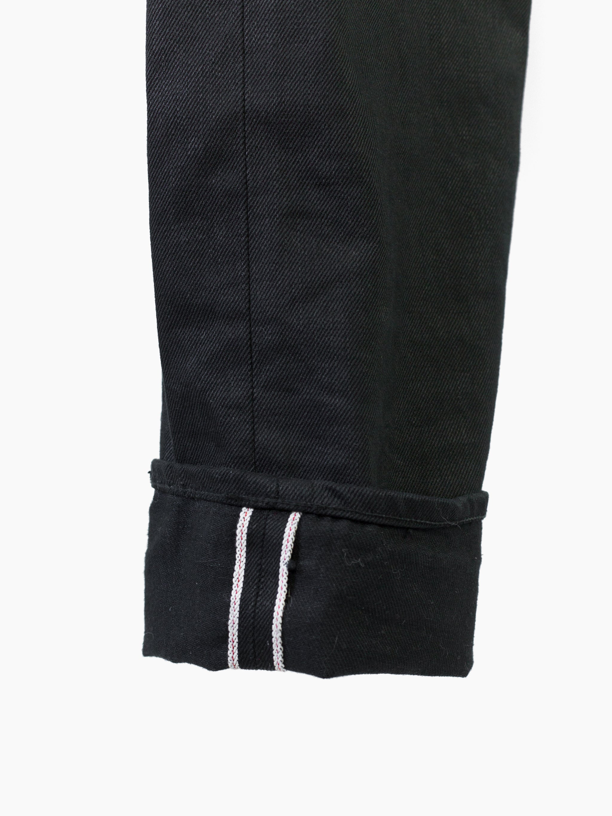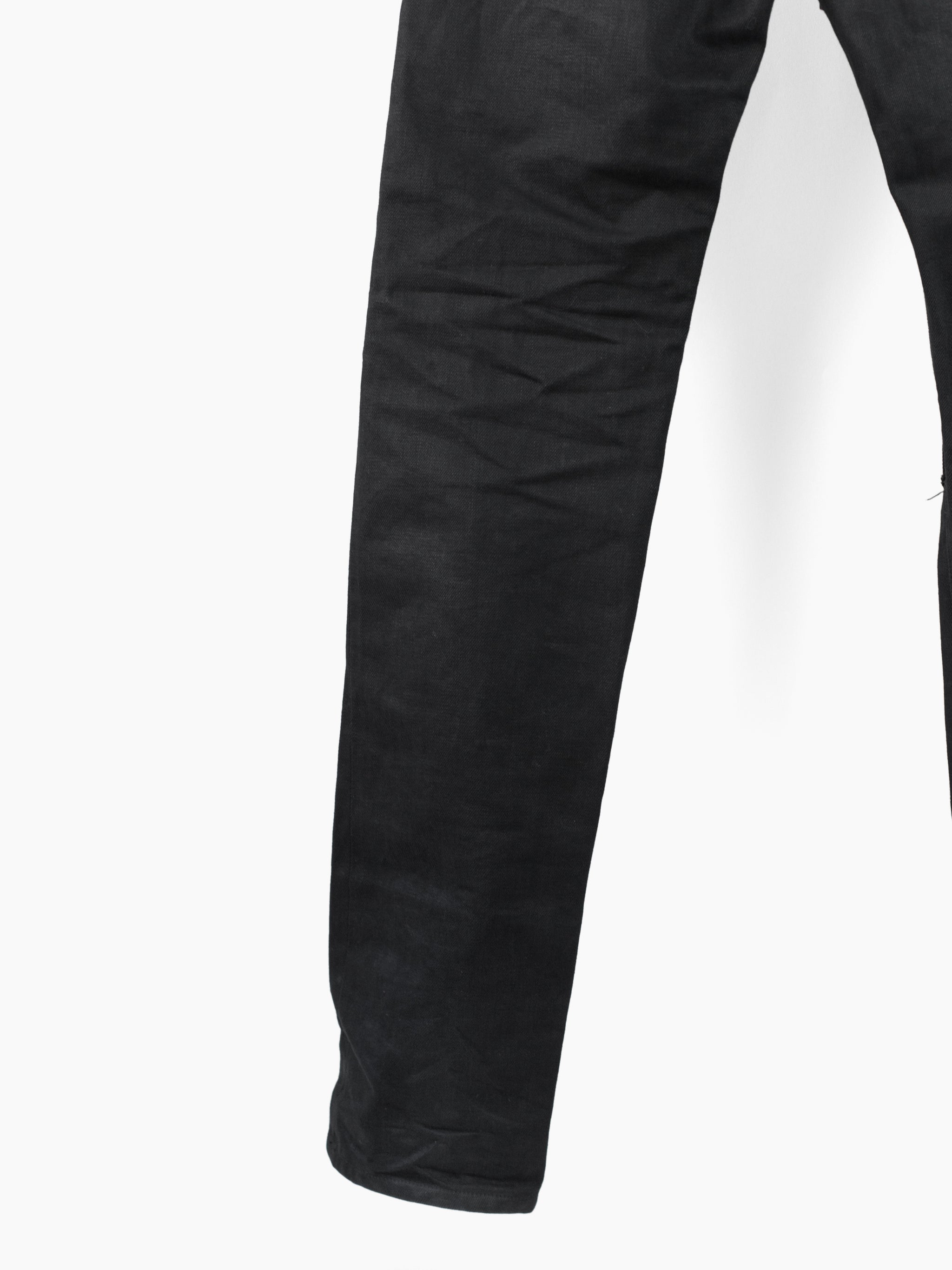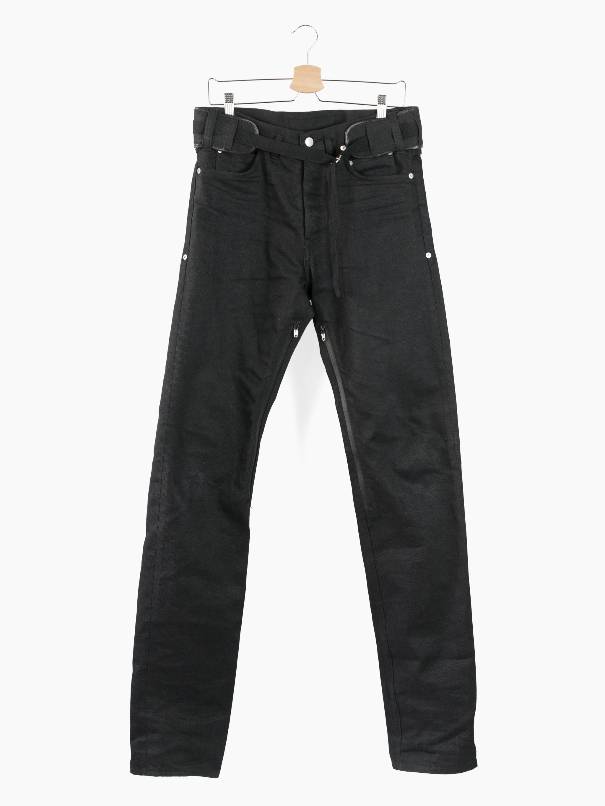 Staple selvedge black jeans with from Takahiromiyashita The Soloist, featuring seasonal signature detailing throughout including hip-strap/corset style waist belt, double symmetrical coin pockets, inner thigh snowboard-style aquaguard zippers for ventilation, and additional ornamental rivets at the hips. The denim itself falls with an impressive structure, with a very subtle coating that brings just the slightest sheen.