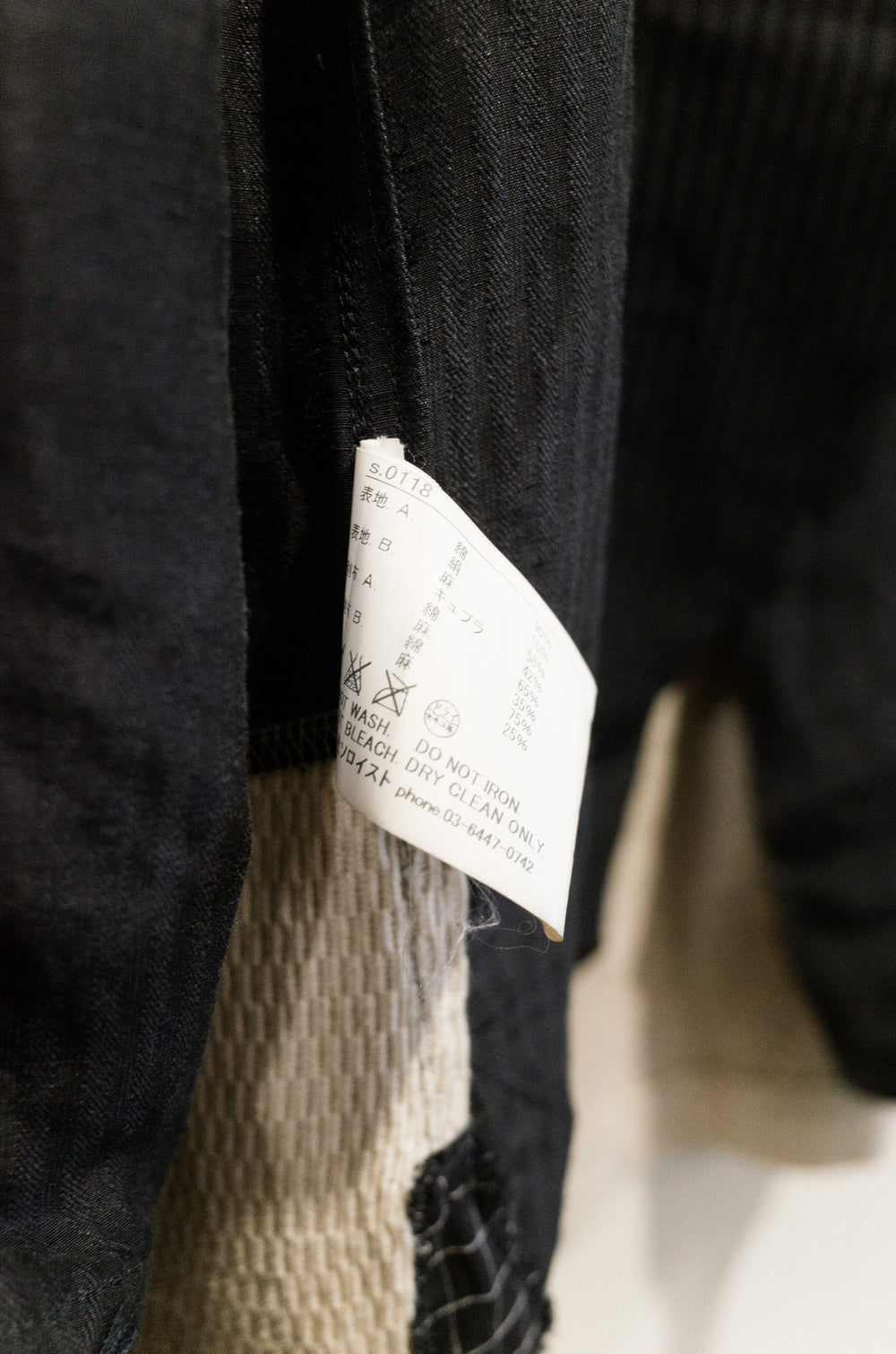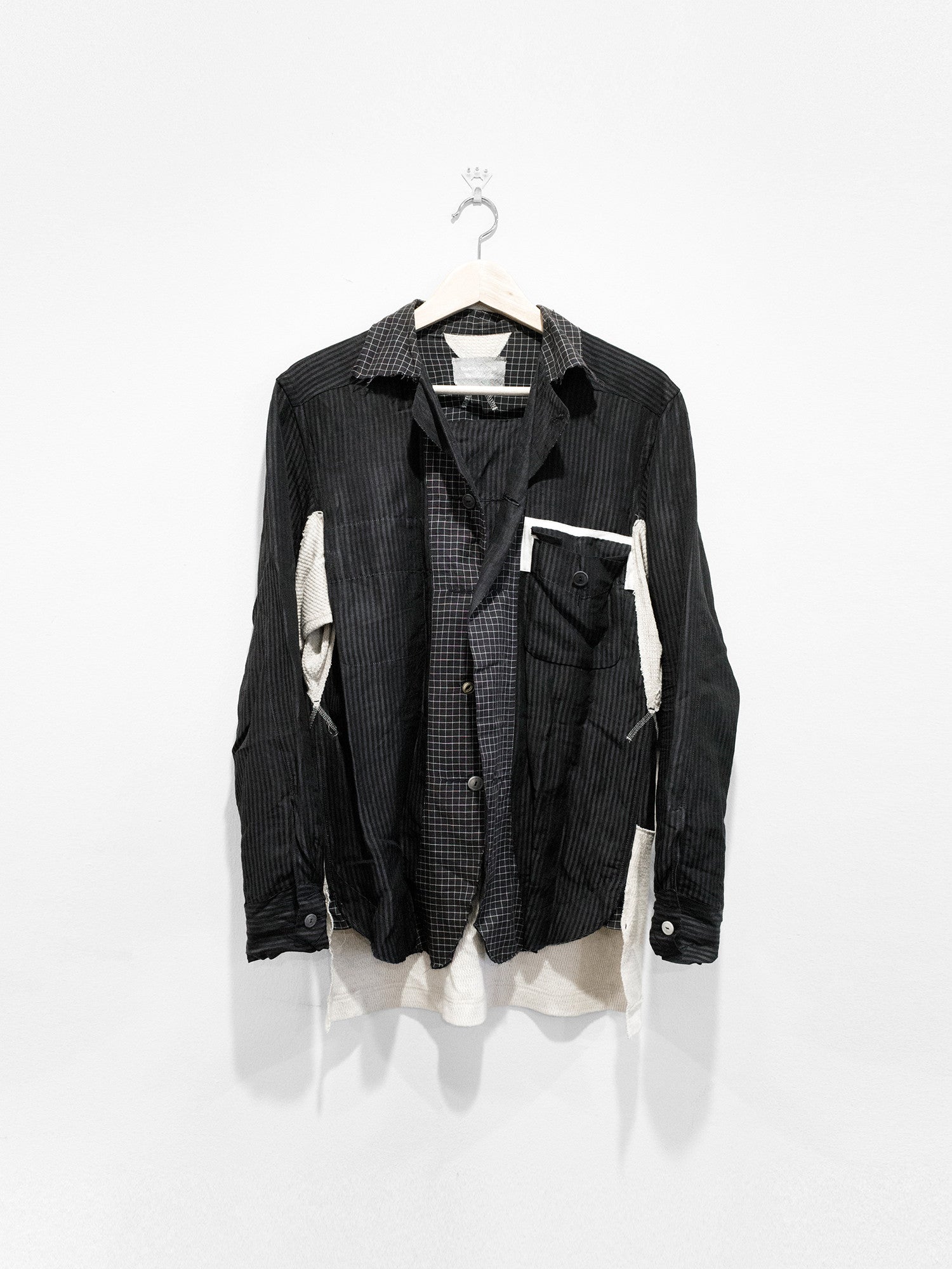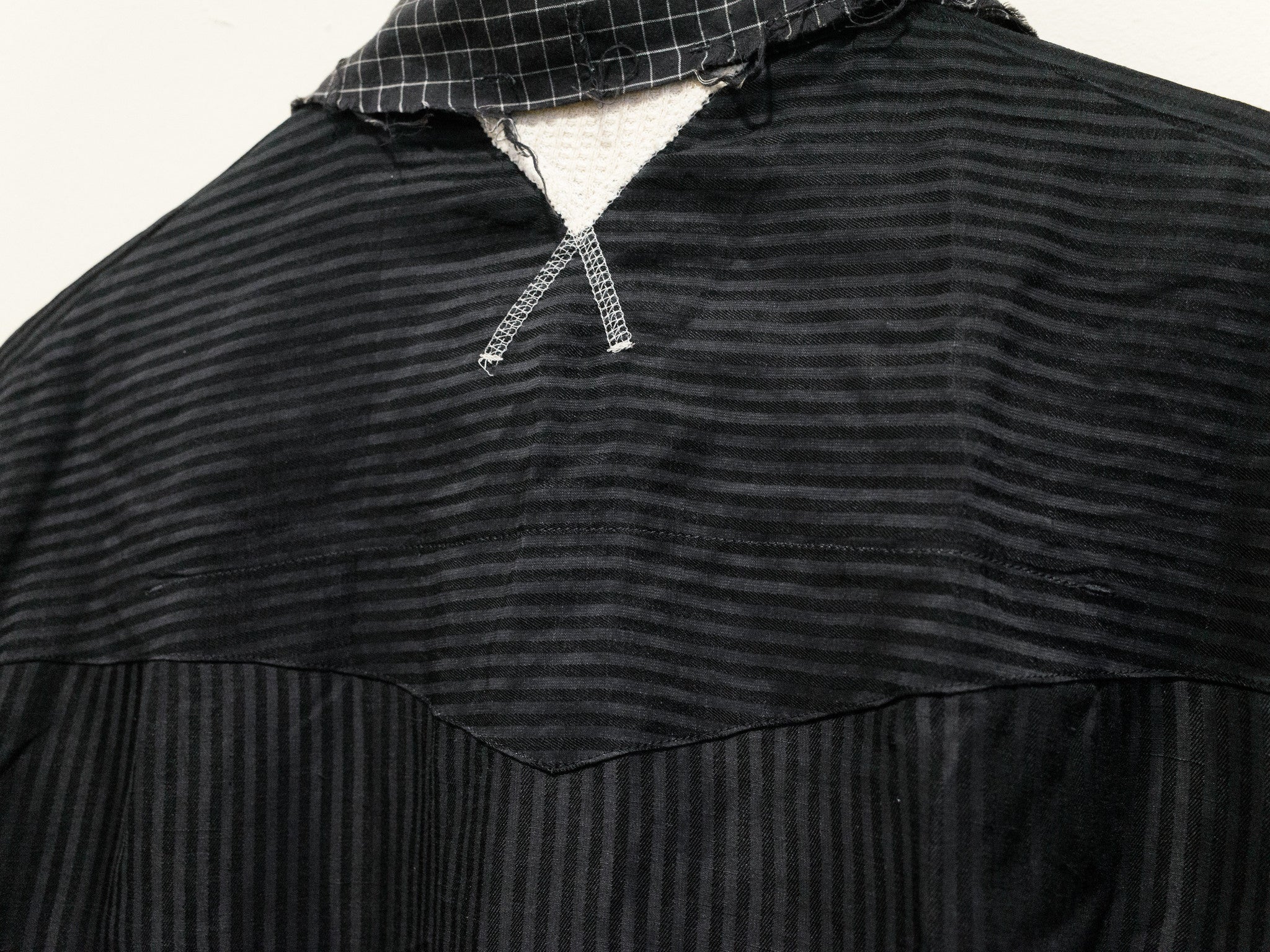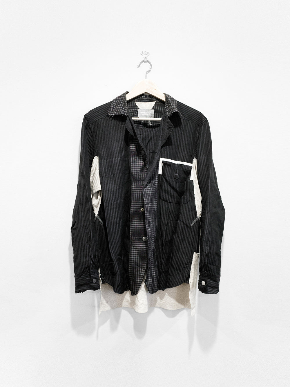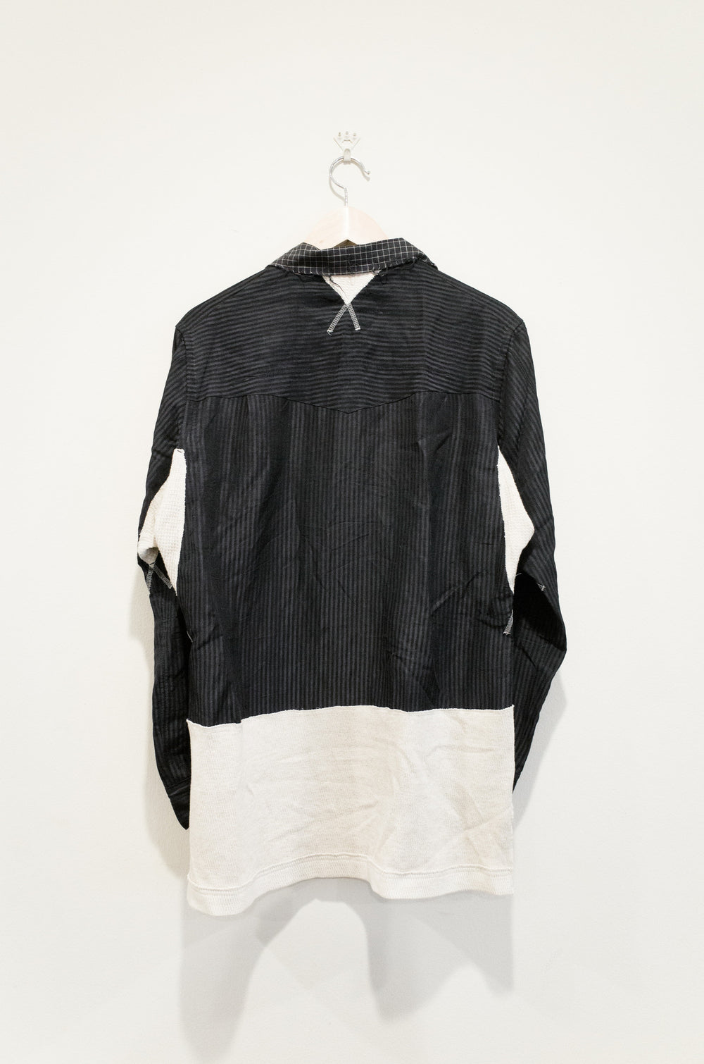 Navy/Beige An early piece from Takahiro Miyashita's current project, the soloist. This is the renowned cowboy shirt, a piece that encapsulates a lot of the design ethos of this contemporary line--raw edges, intricate construction (with a double placket), contrast waffle paneling for comfort and mobility, mismatched buttons, and a well-travelled stylistic sensibility found in the color and pattern choice. This shirt is the perfect spring/summer toss on and go piece.