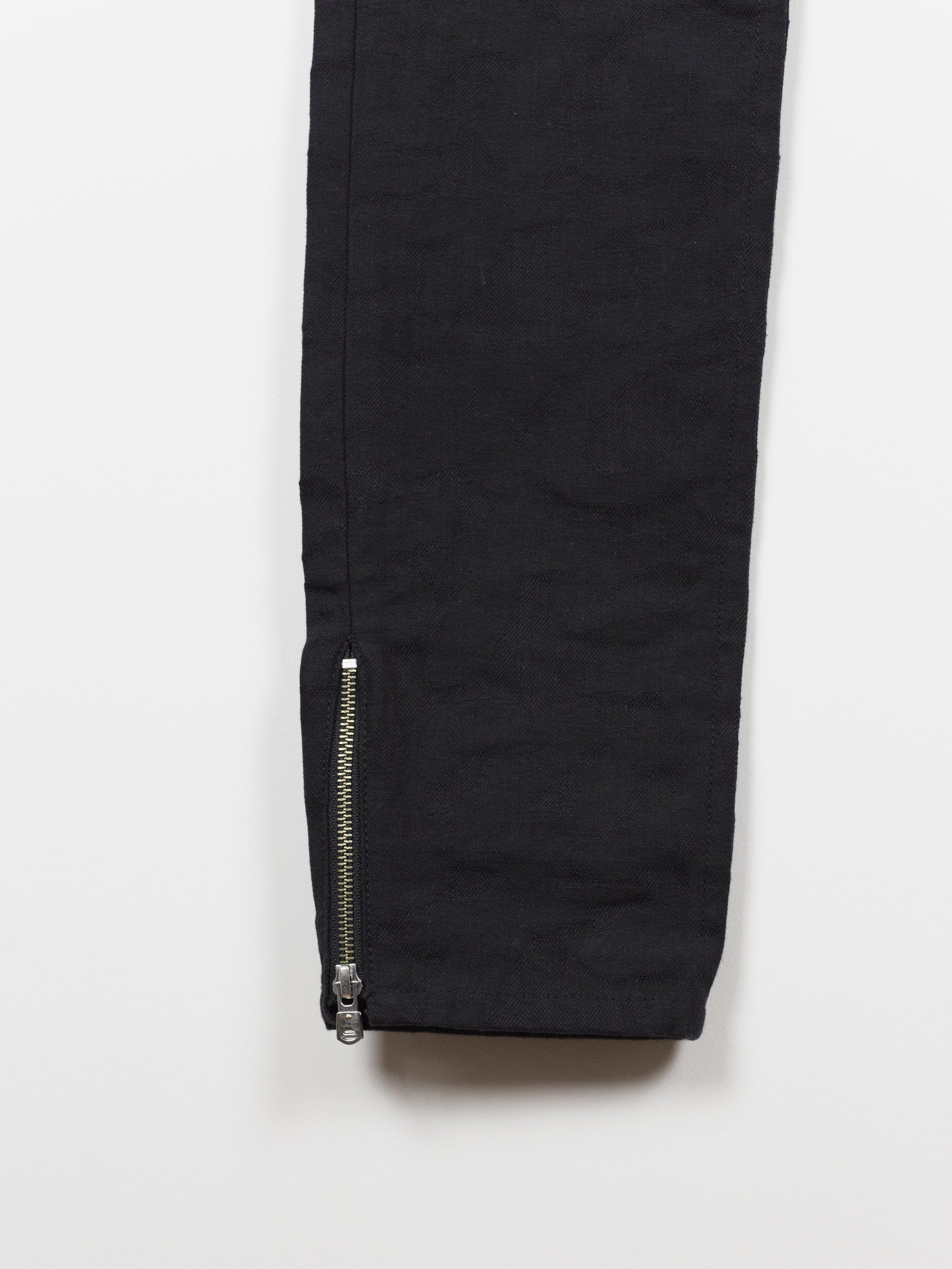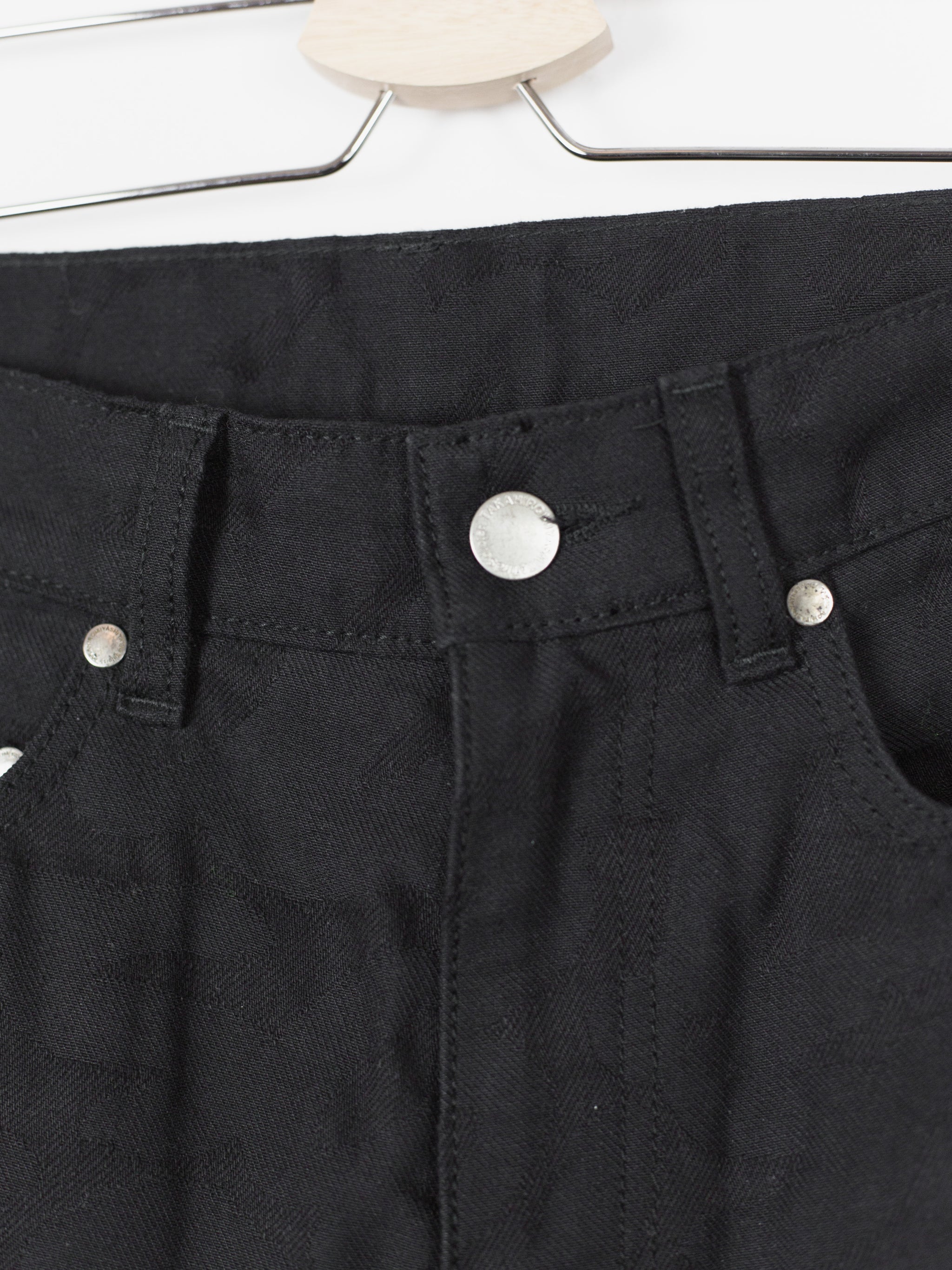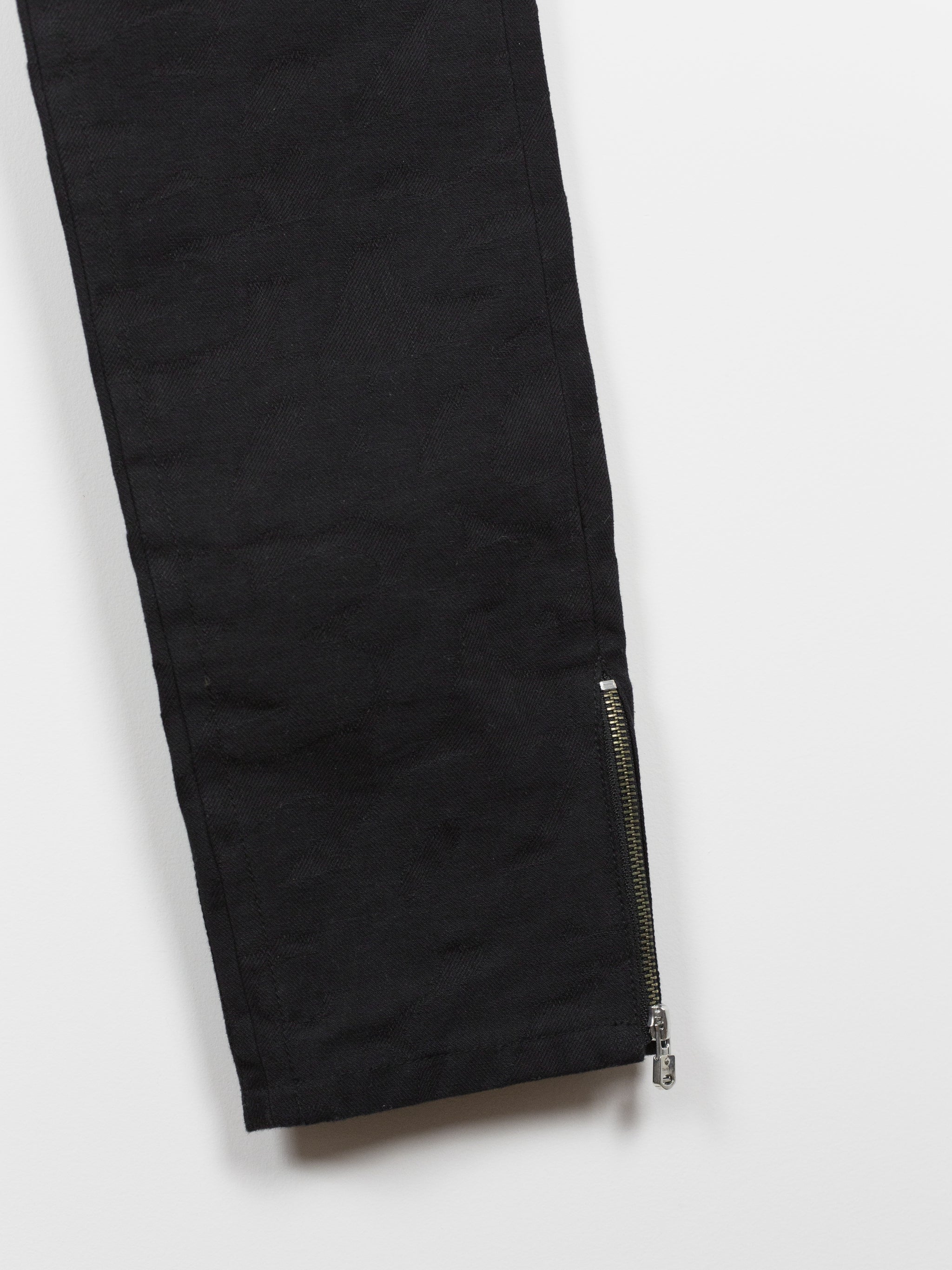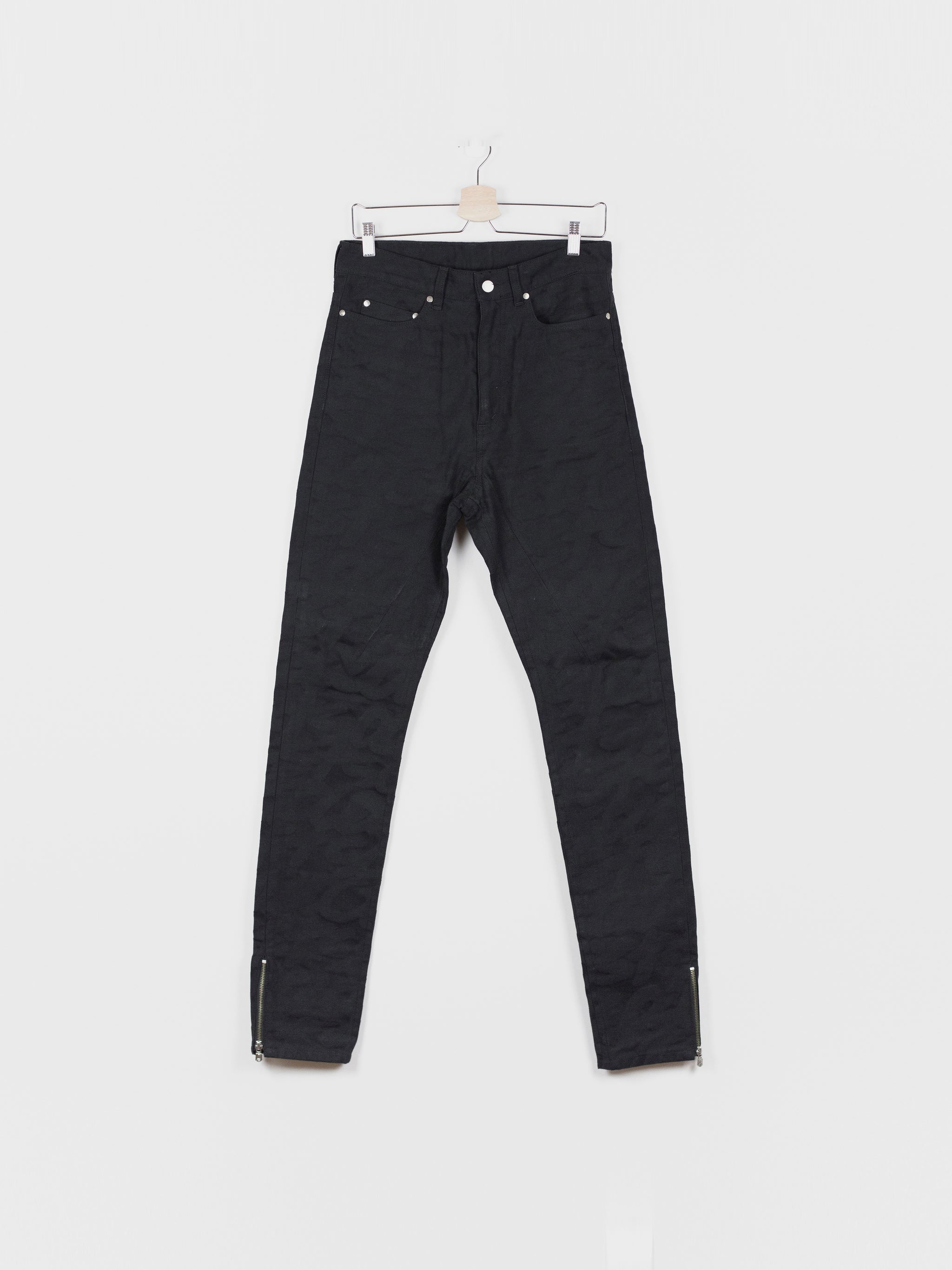 High-waisted skinny denim from Takahiromiyashita The Soloist, featuring a tapered cut with zipped hem openings. The jeans feature the season's statement 'Skoloct' script pattern woven as a jacquard into the denim itself creating a subtle yet unmistakable graphic impression. Finished with branded shank and rivets, and sterling silver tipped zipper pulls produced in collaboration with END Jewellers.