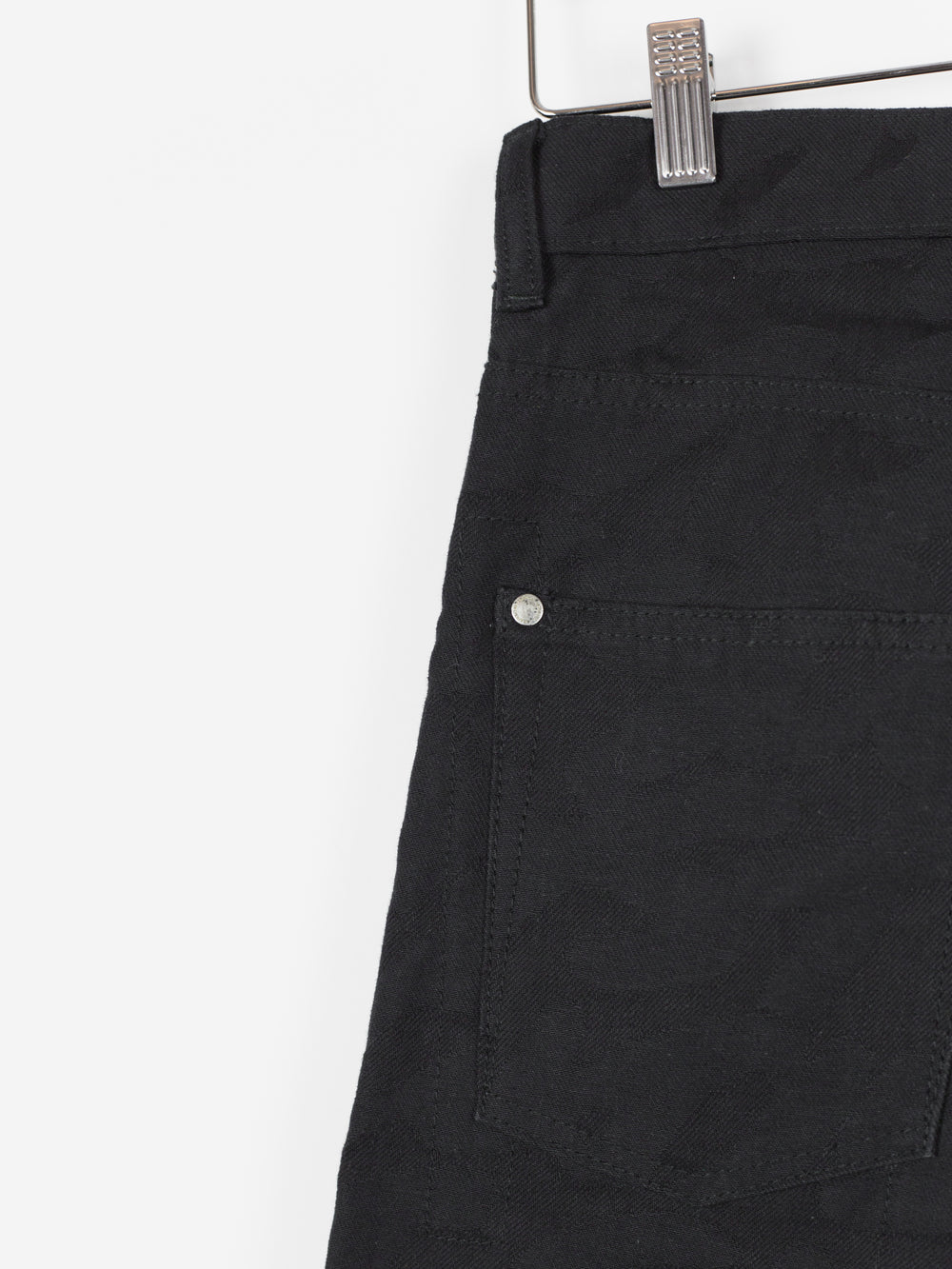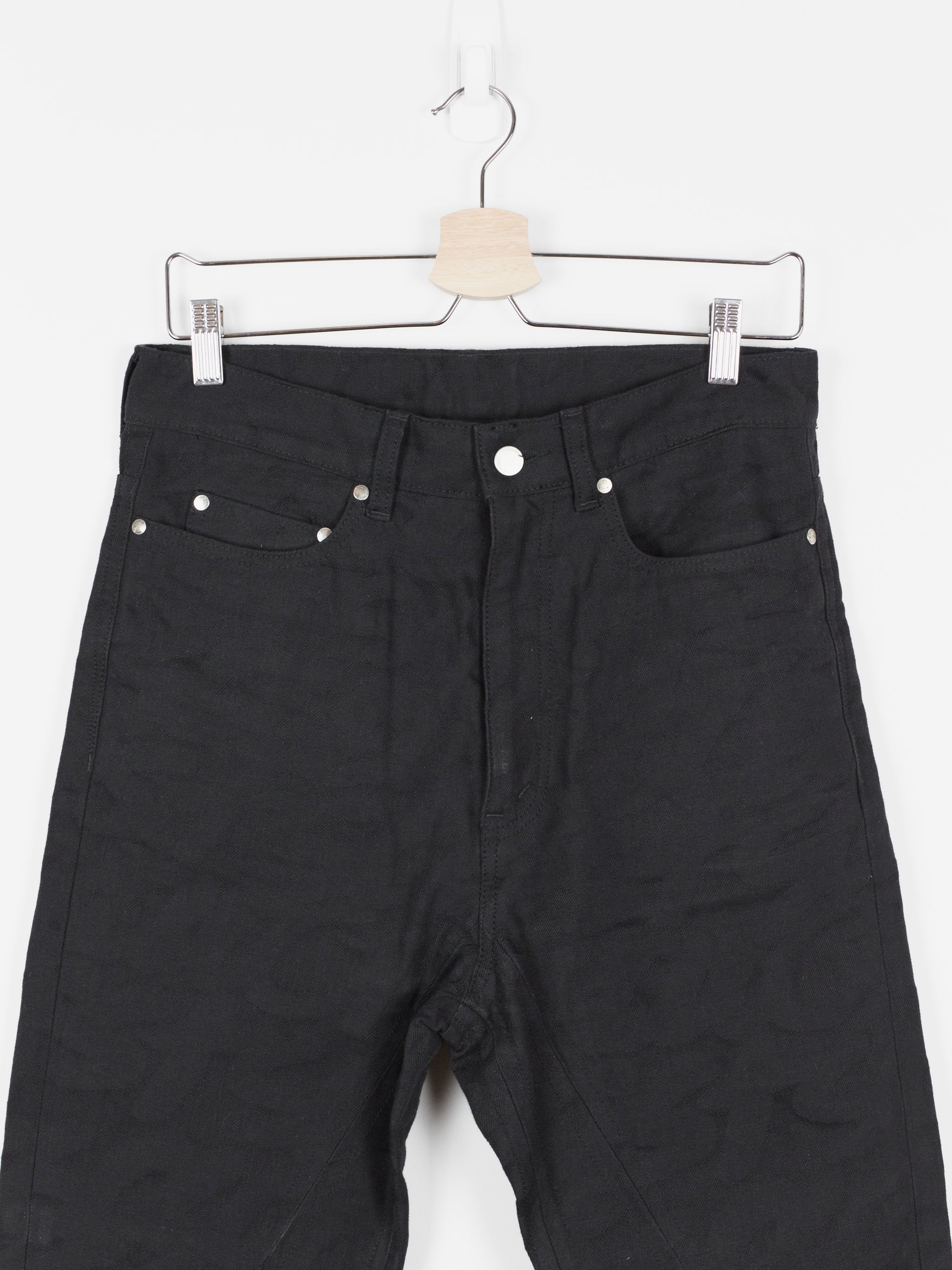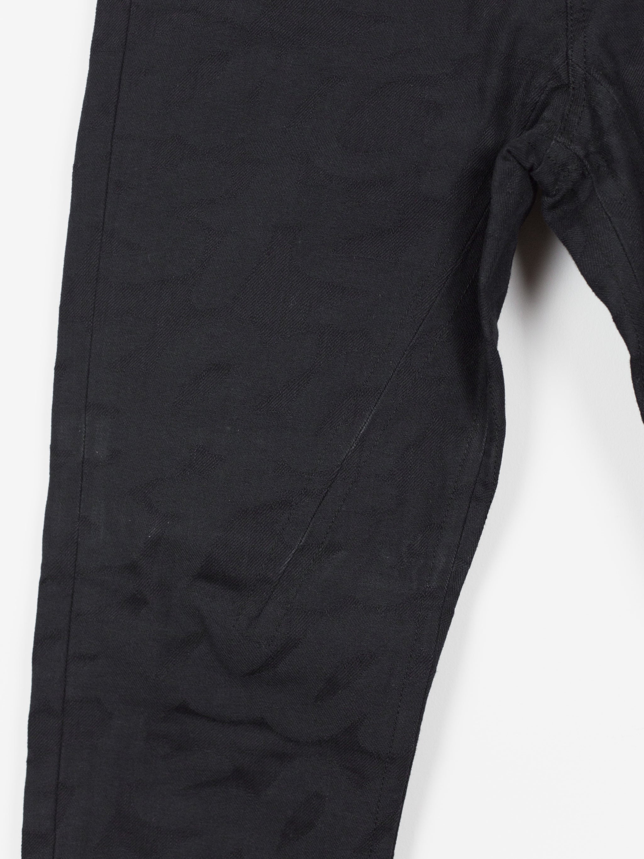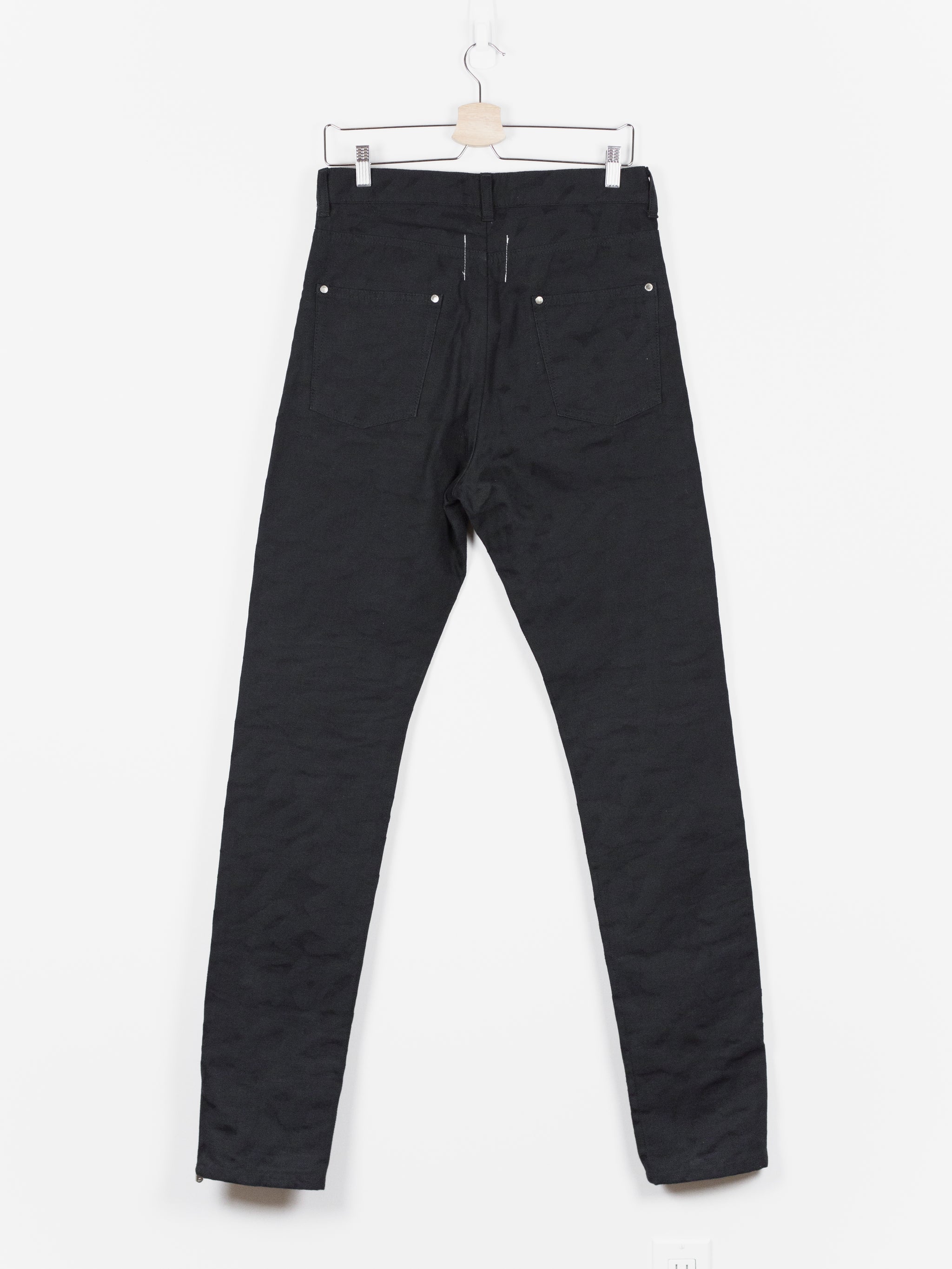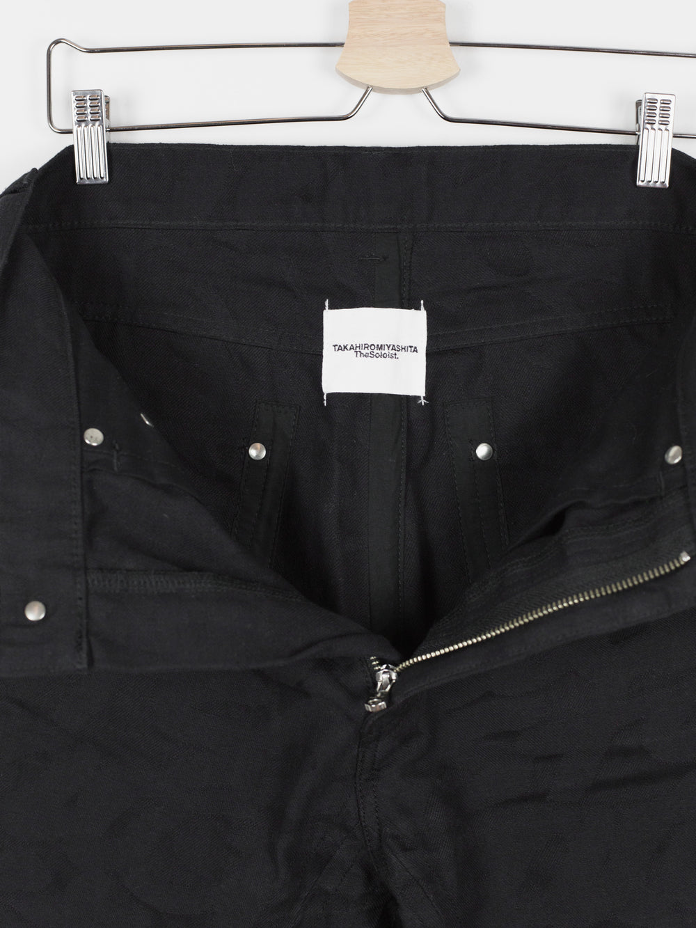 High-waisted skinny denim from Takahiromiyashita The Soloist, featuring a tapered cut with zipped hem openings. The jeans feature the season's statement 'Skoloct' script pattern woven as a jacquard into the denim itself creating a subtle yet unmistakable graphic impression. Finished with branded shank and rivets, and sterling silver tipped zipper pulls produced in collaboration with END Jewellers.