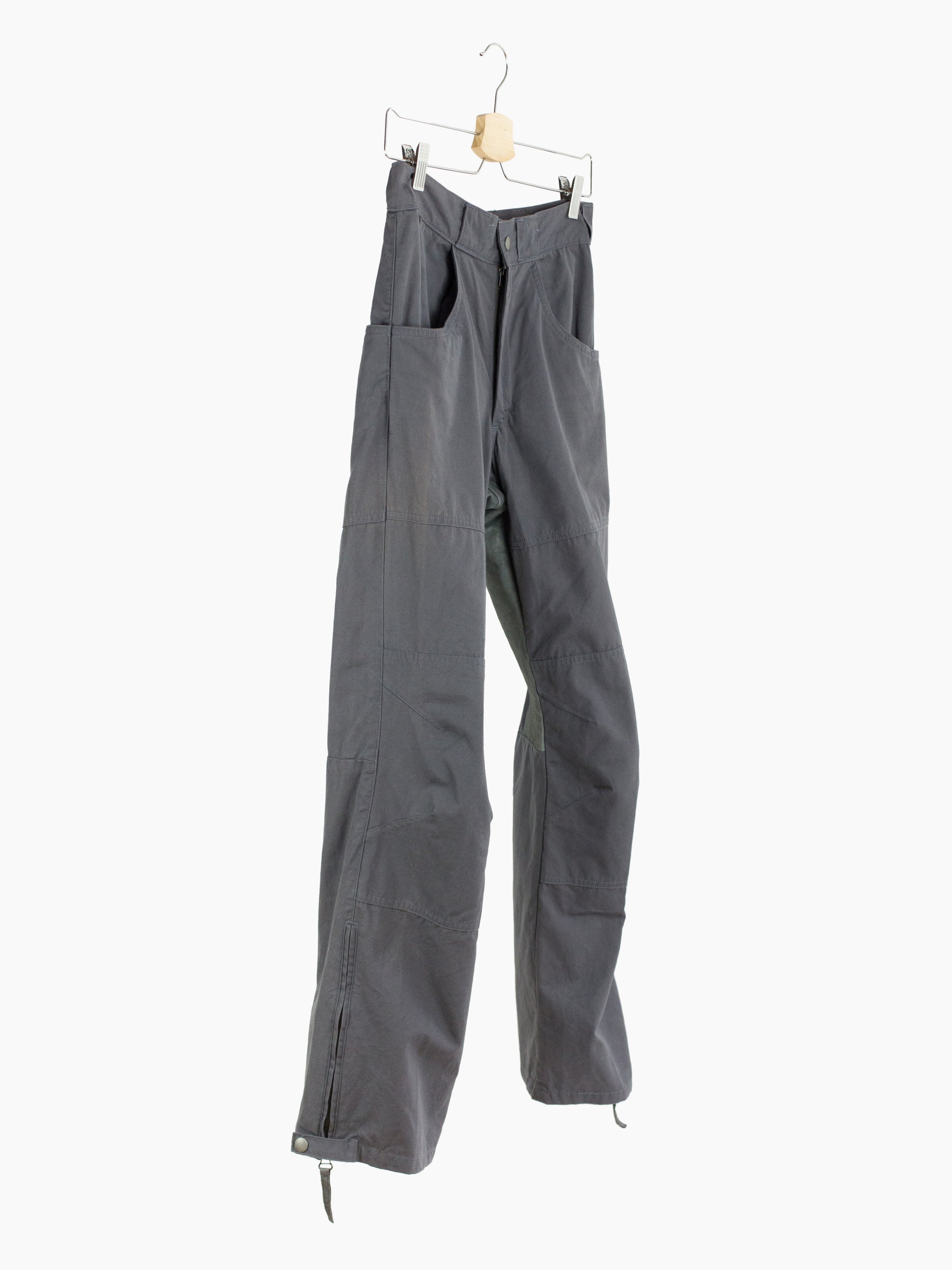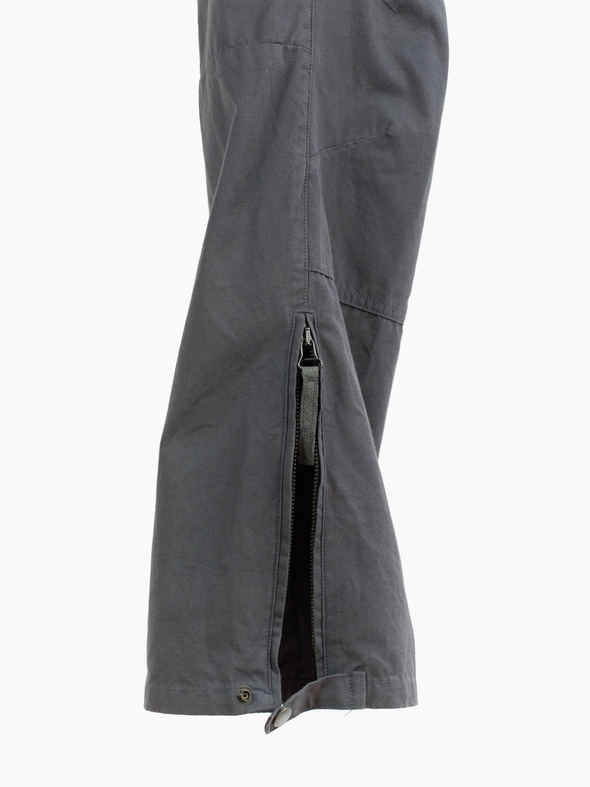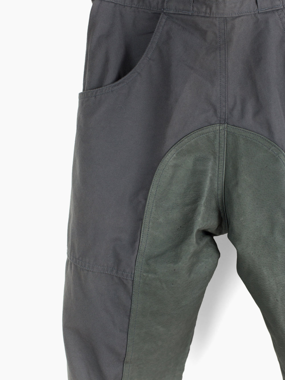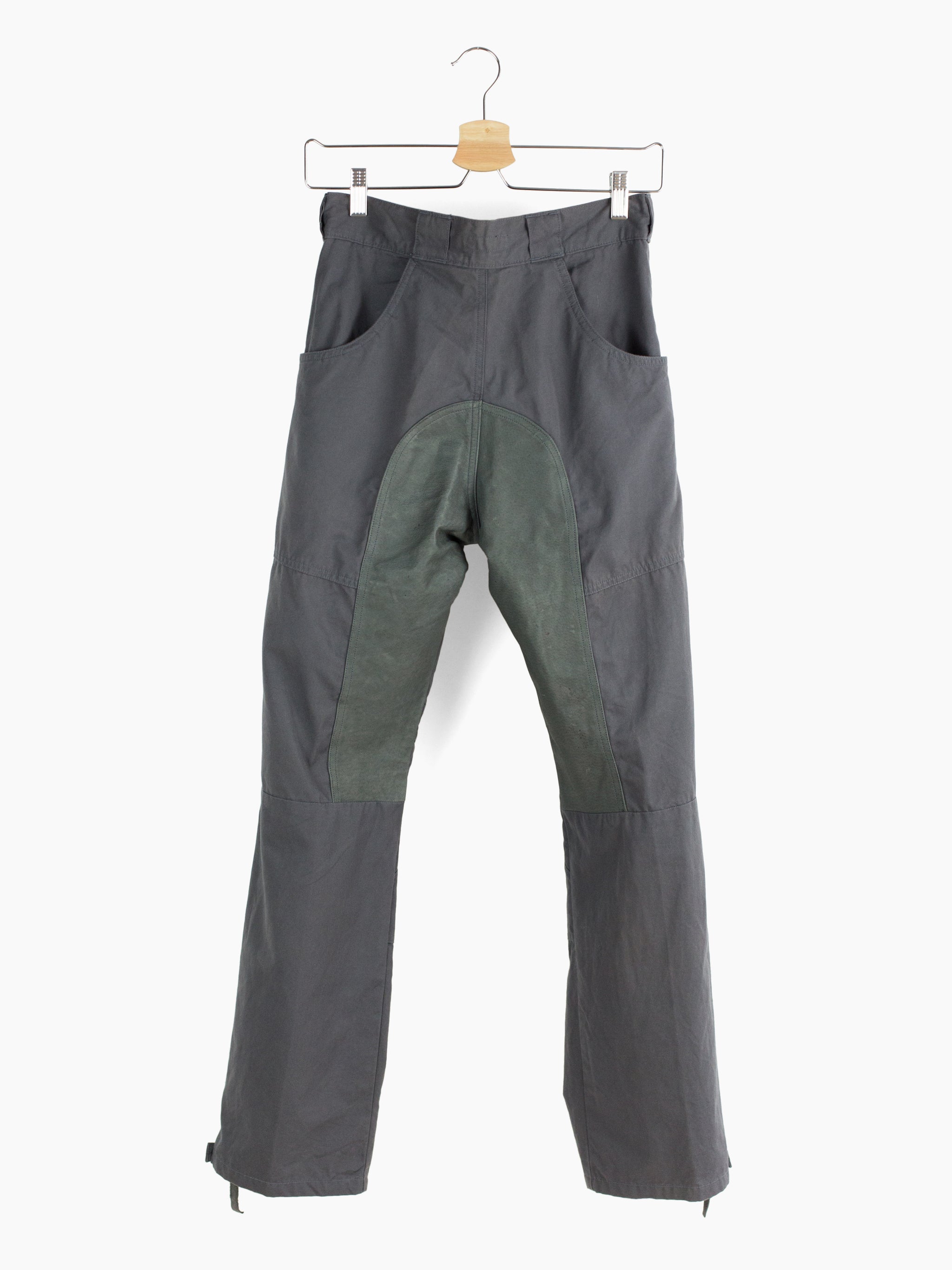 Grey cotton moto trousers from 90s brand Toilet. Features considered utilitarian design features such as darted articulated and reinforced knees, pigskin leather crotch and inner leg patch for comfort and durability, and scooped, lateral entry back pockets that mirror the low J-style front pockets. Zipper and snap closure at the hem lets the wearer open the hem to fit the lower leg over boots or to regulate temperature by ventilating. Finished with snap button waist closure and zipper fly, and extra-wide workwear style belt loops,