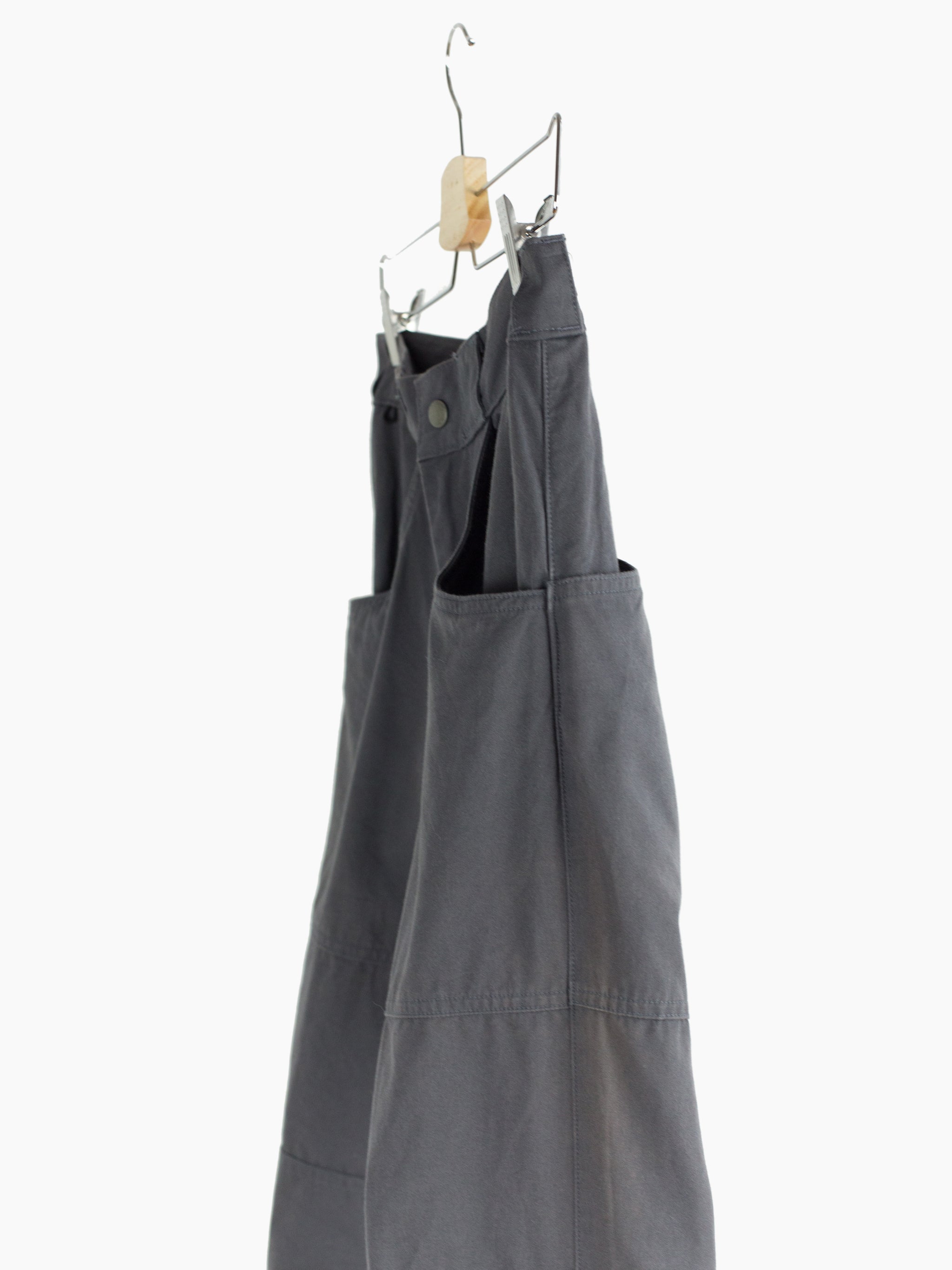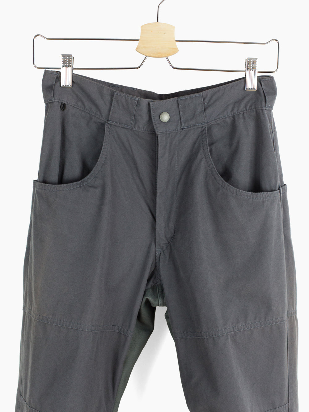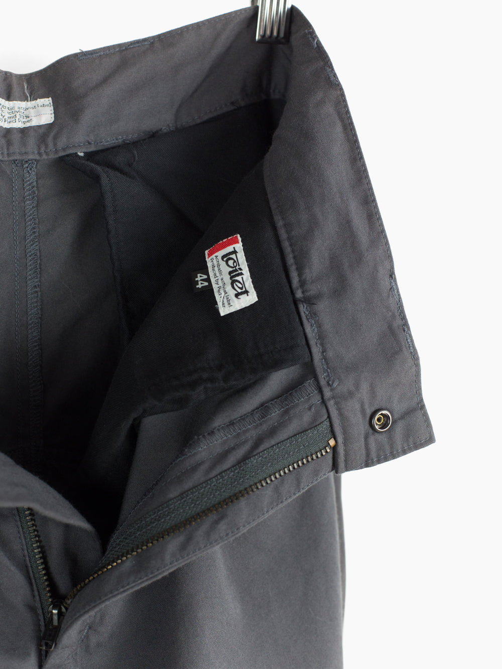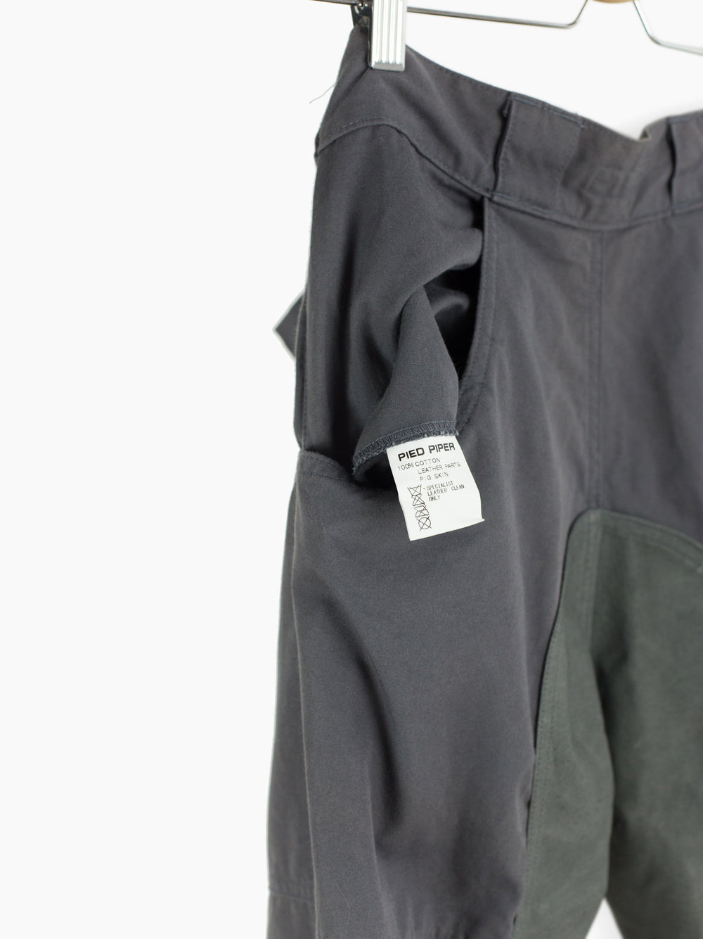 Grey cotton moto trousers from 90s brand Toilet. Features considered utilitarian design features such as darted articulated and reinforced knees, pigskin leather crotch and inner leg patch for comfort and durability, and scooped, lateral entry back pockets that mirror the low J-style front pockets. Zipper and snap closure at the hem lets the wearer open the hem to fit the lower leg over boots or to regulate temperature by ventilating. Finished with snap button waist closure and zipper fly, and extra-wide workwear style belt loops,