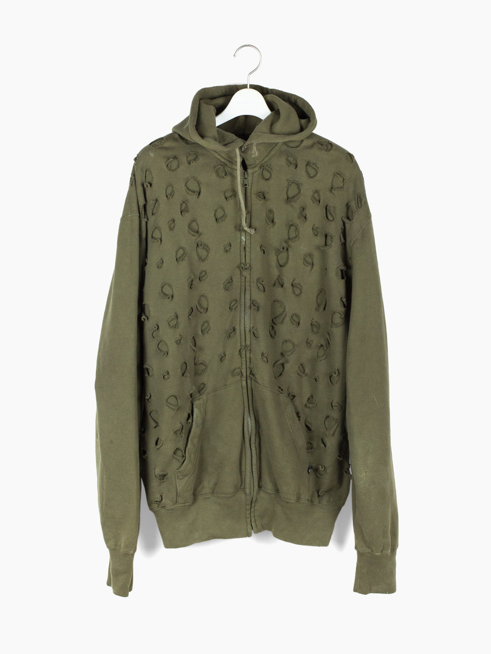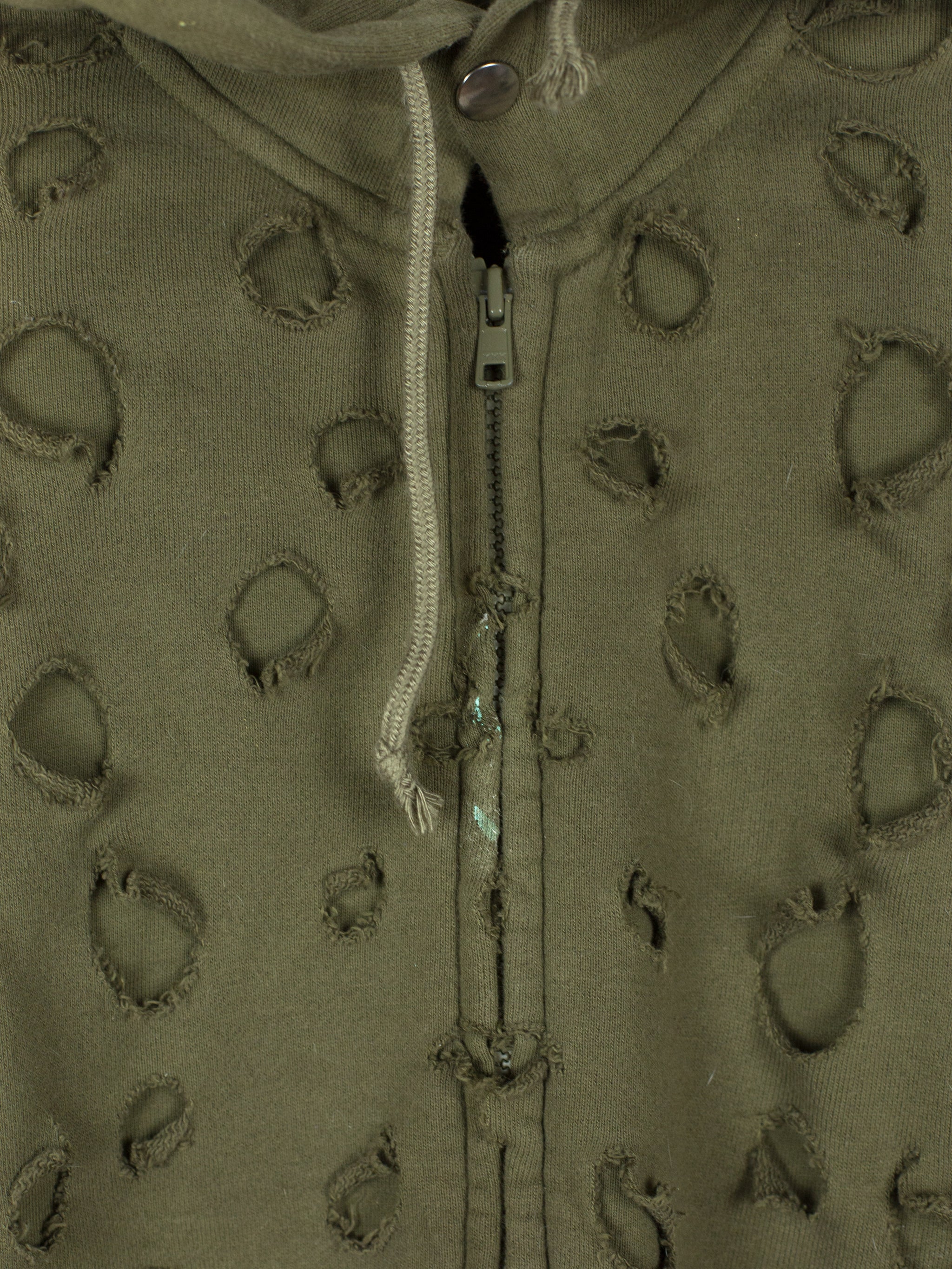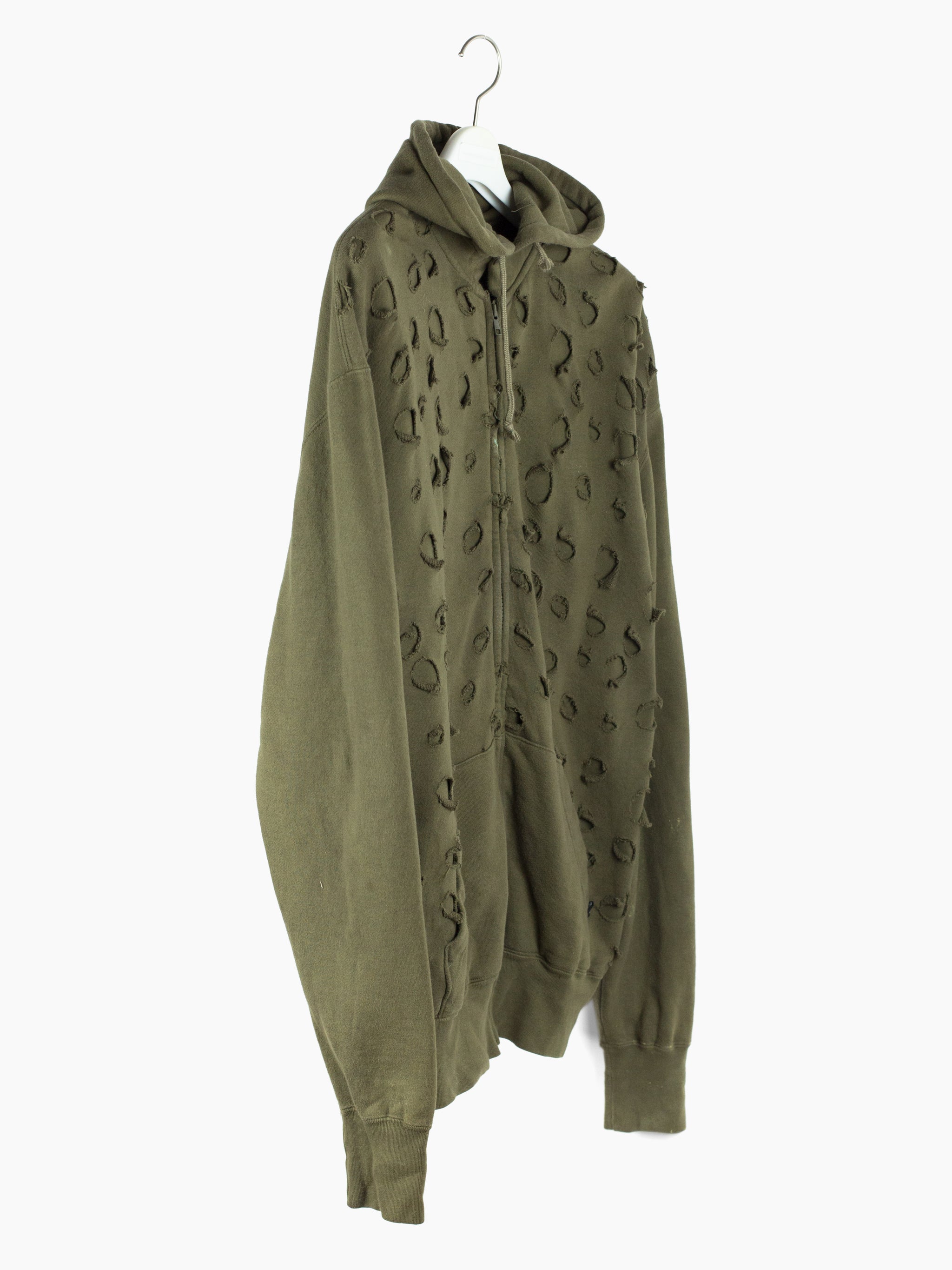 Olive zip-up hoodie from Japanese brand Toilet, featuring a double-layered front whose outer layer is riddled with circular holes punched out of the material. The effect creates a post-apocalyptic, militaristic texture and aesthetic, halfway between acid disintegrated and bladecut military netting.