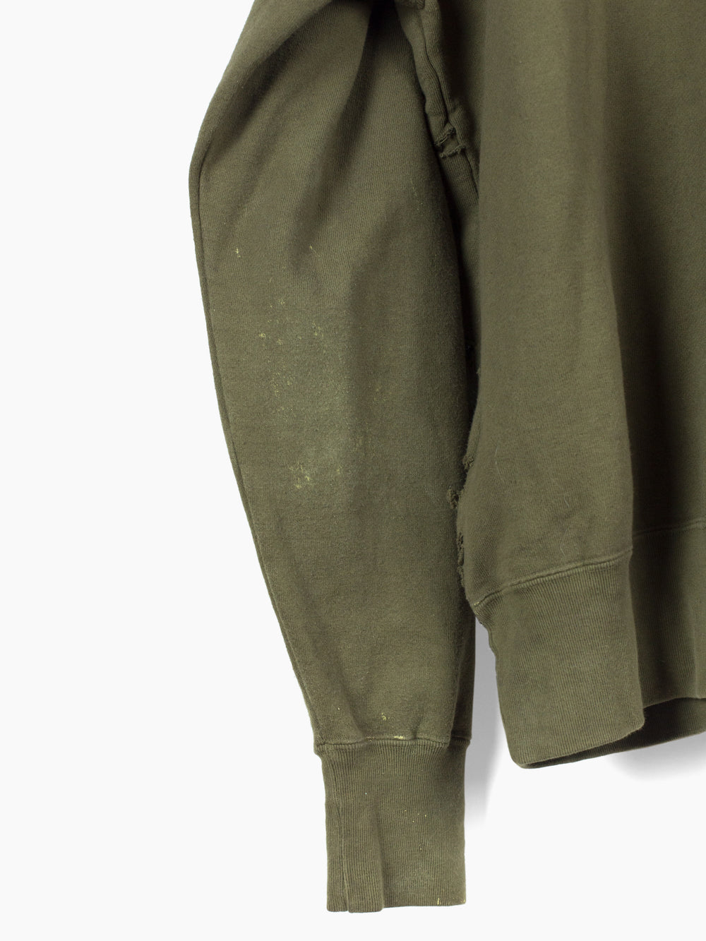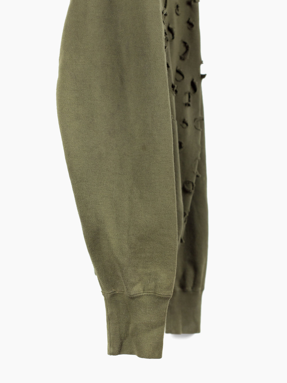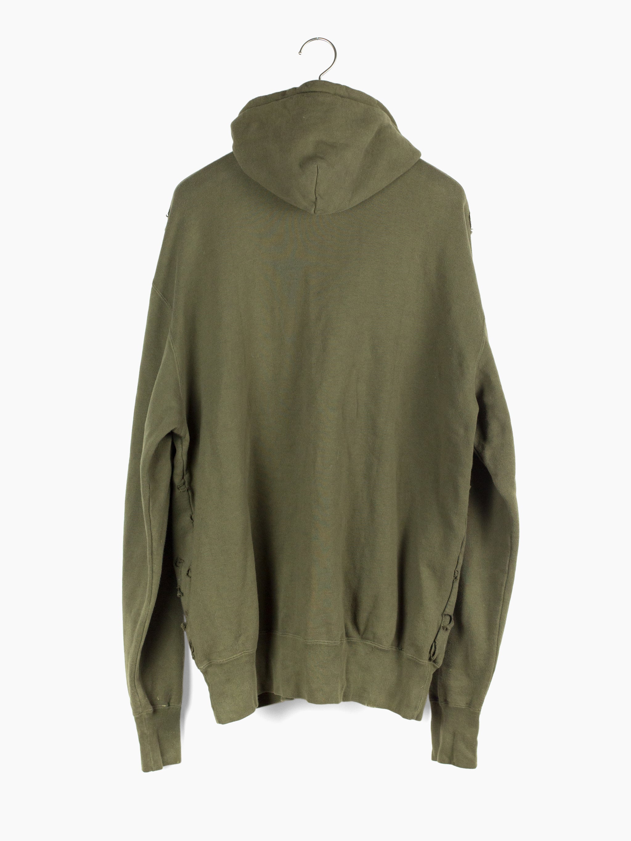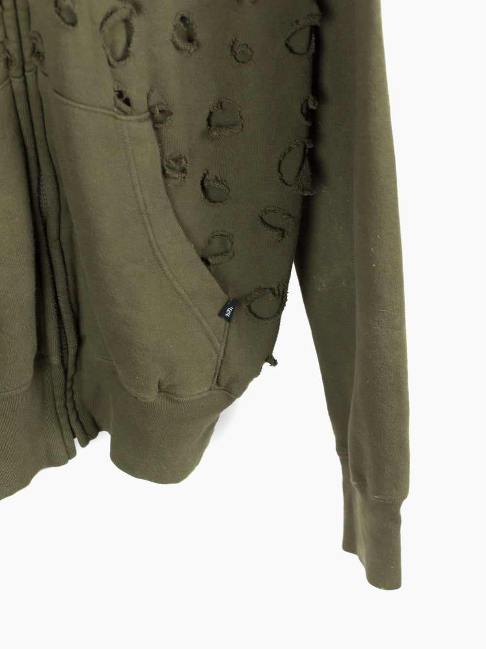 Olive zip-up hoodie from Japanese brand Toilet, featuring a double-layered front whose outer layer is riddled with circular holes punched out of the material. The effect creates a post-apocalyptic, militaristic texture and aesthetic, halfway between acid disintegrated and bladecut military netting.