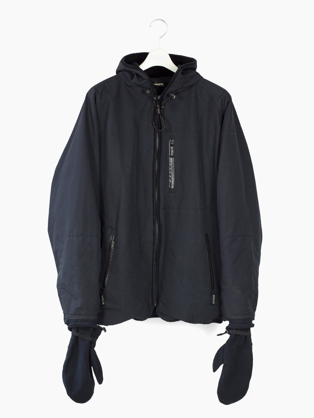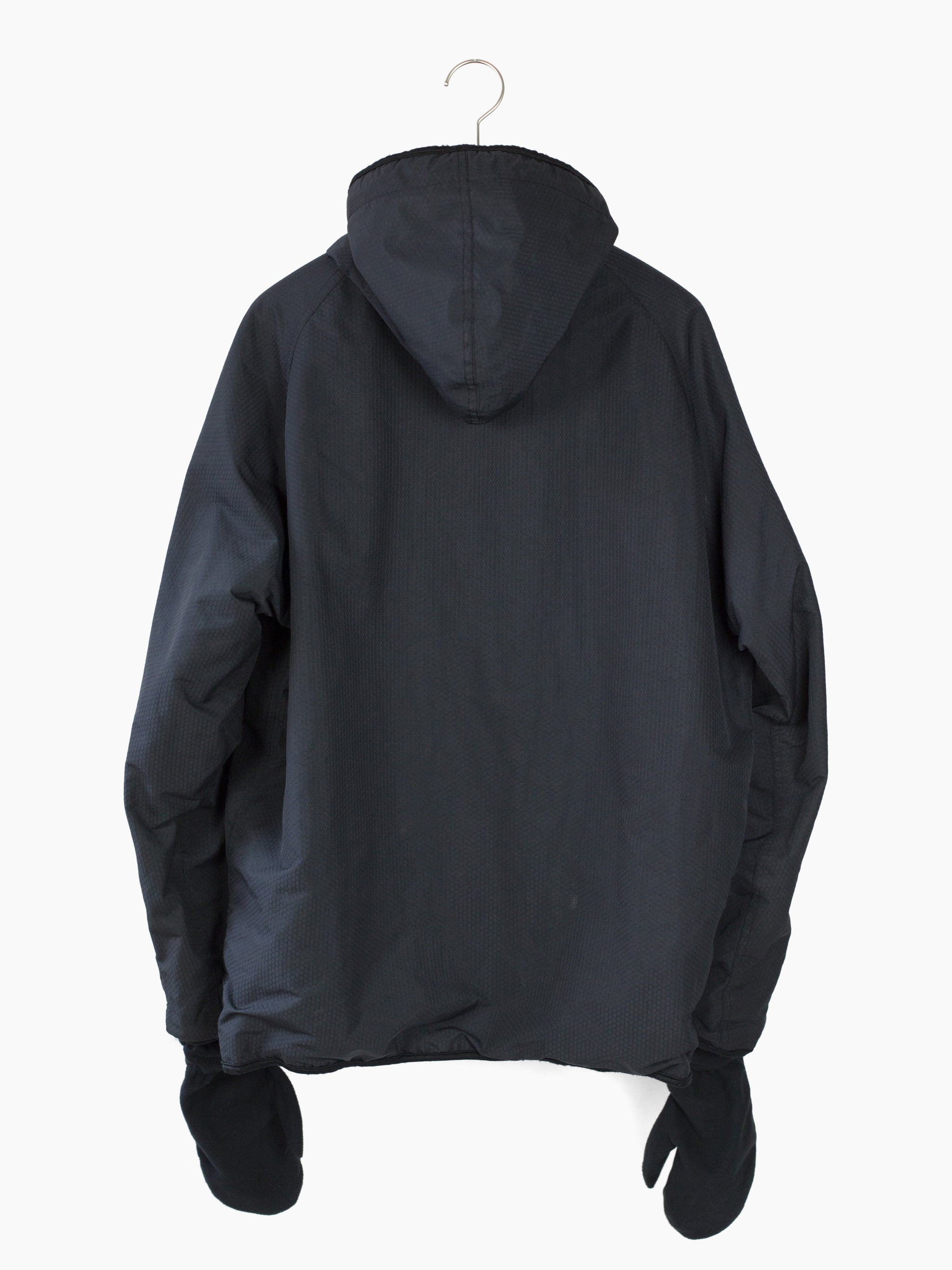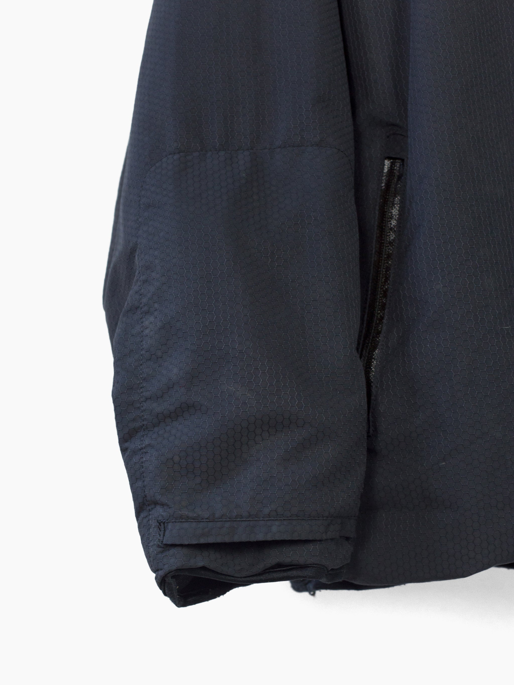 Cold weather technical parka from 90s-00s Japanese streetwear brand Toilet, featuring hexagonal ripstop nylon face fabric that’s both weather and wind resistant, with full micro fleece lining for warmth. Attached fleece mittens deploy from and stow into forearm pockets, so you’re never without gloves when they’re needed. Hood drawcord system snakes through small webbing loops, reducing dangling excess when cinched and creating a visual detail around the neckline. Finished with single chest pocket at wearer’s left, two waist pockets, and watertight zippers throughout.