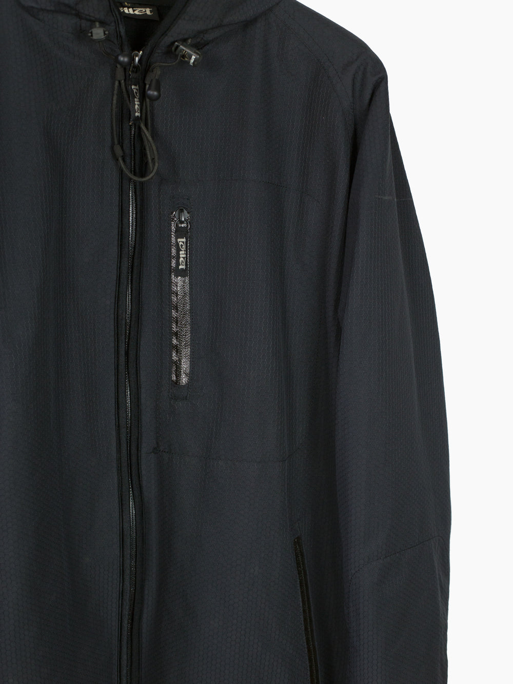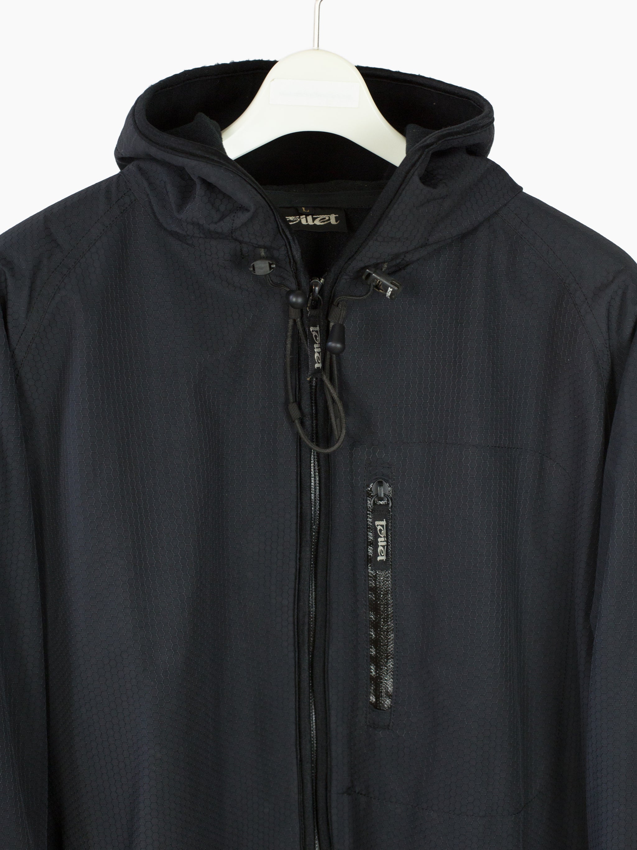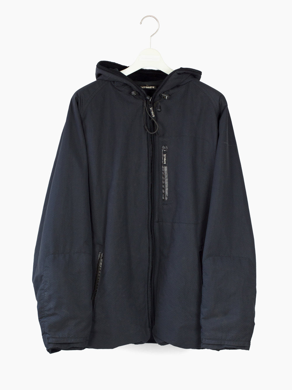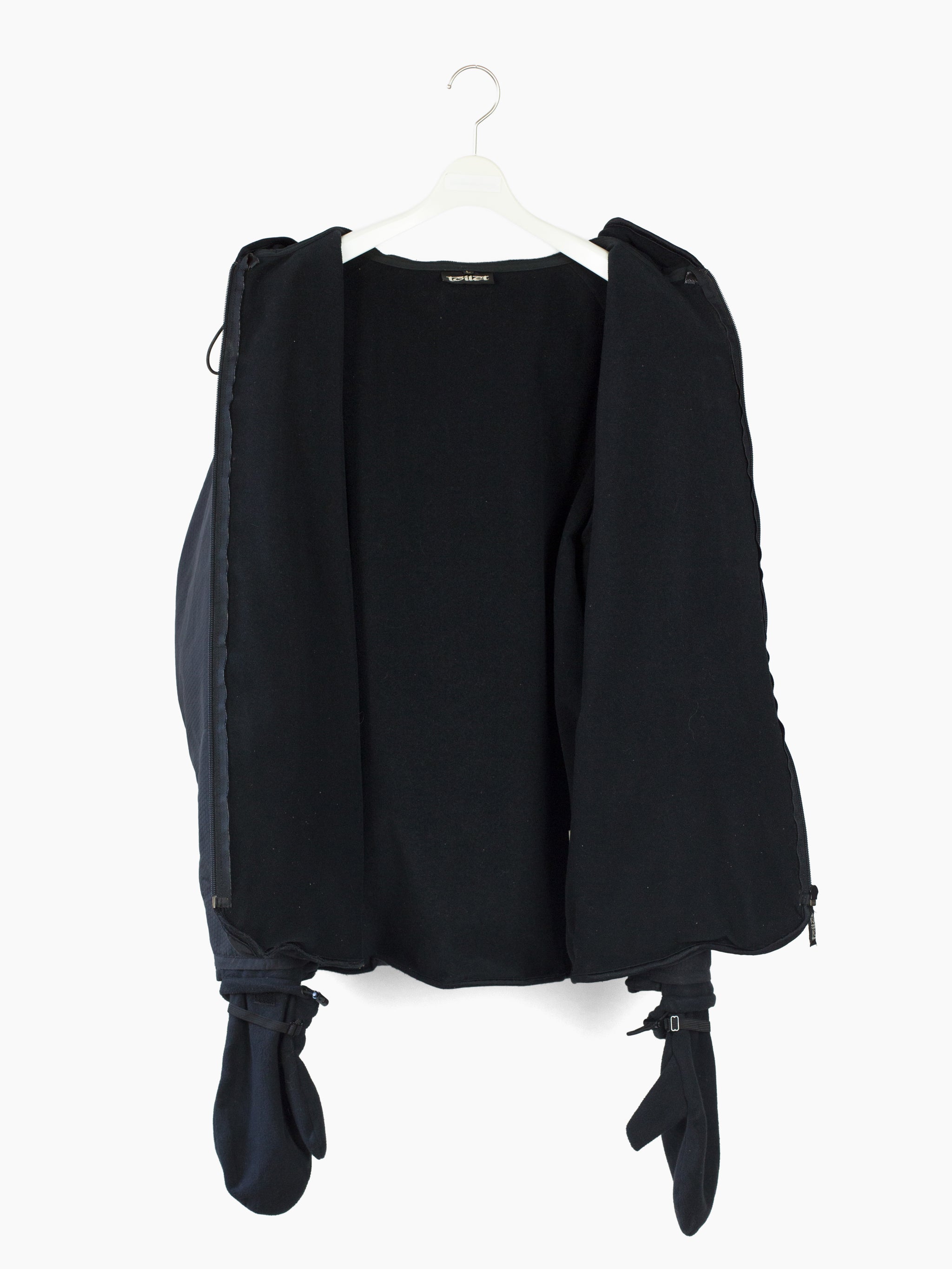Cold weather technical parka from 90s-00s Japanese streetwear brand Toilet, featuring hexagonal ripstop nylon face fabric that’s both weather and wind resistant, with full micro fleece lining for warmth. Attached fleece mittens deploy from and stow into forearm pockets, so you’re never without gloves when they’re needed. Hood drawcord system snakes through small webbing loops, reducing dangling excess when cinched and creating a visual detail around the neckline. Finished with single chest pocket at wearer’s left, two waist pockets, and watertight zippers throughout.