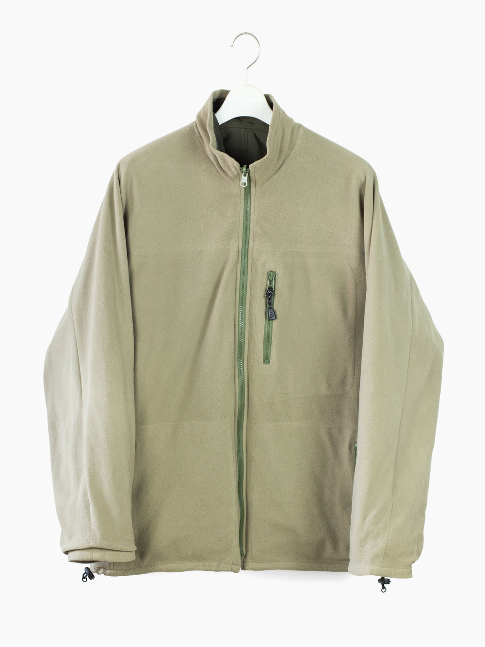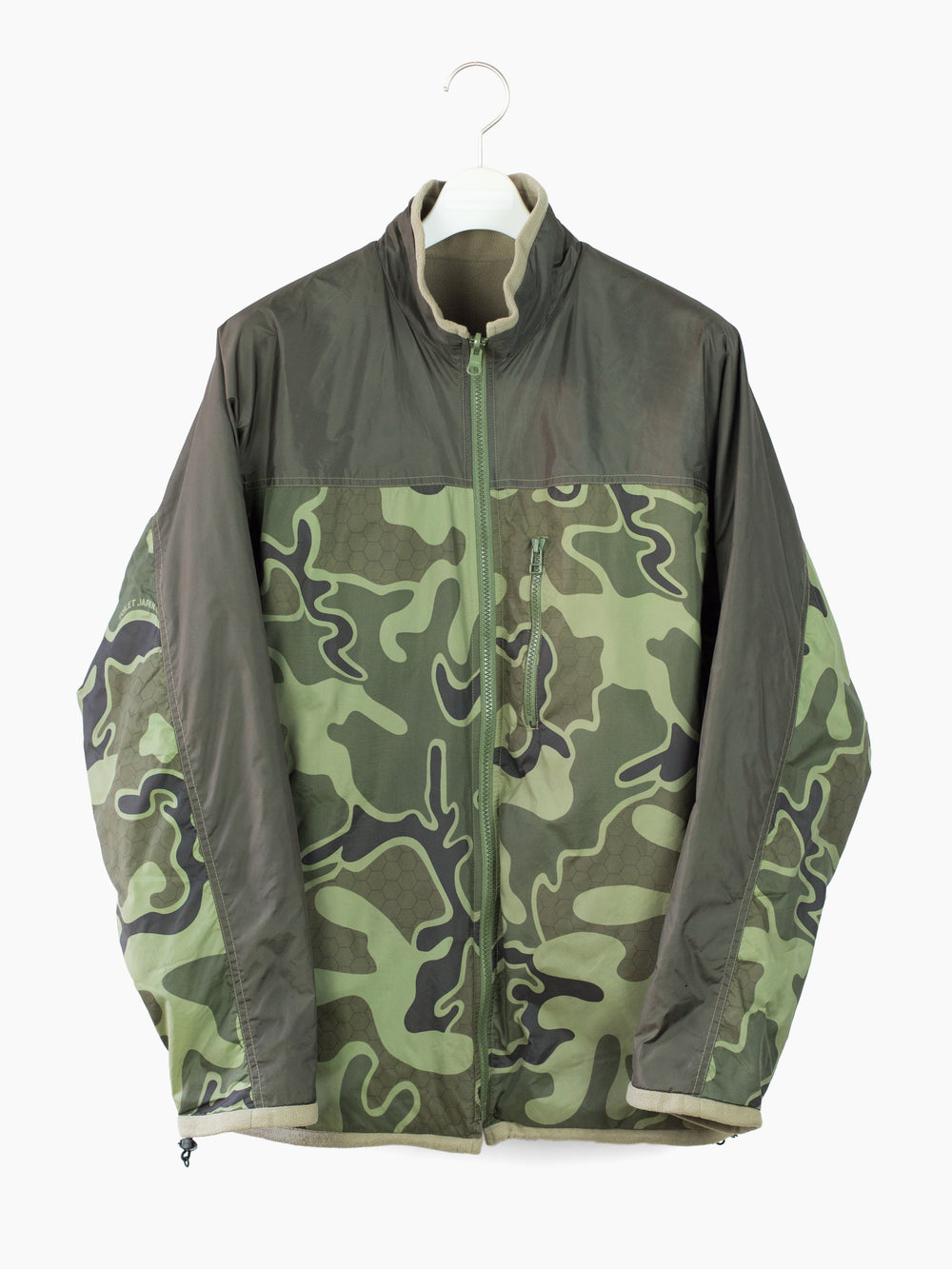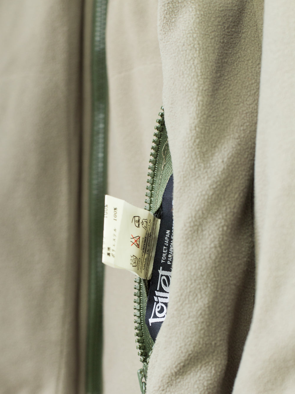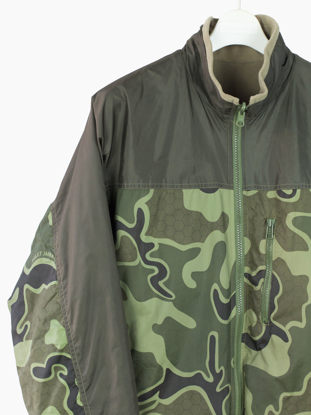 Fully reversible nylon-face fleece from Japanese brand Toilet, featuring a two-tone plain/camo nylon outer and contrast beige fleece interior. Both sides feature vertical zip-closed chest pocket at wearer's left and lower waist pockets. Beige fleece side features artfully cut curved-corner pocketbags for a subtle retro-mountaineering aesthetic. Incredibly versatile and wearable.