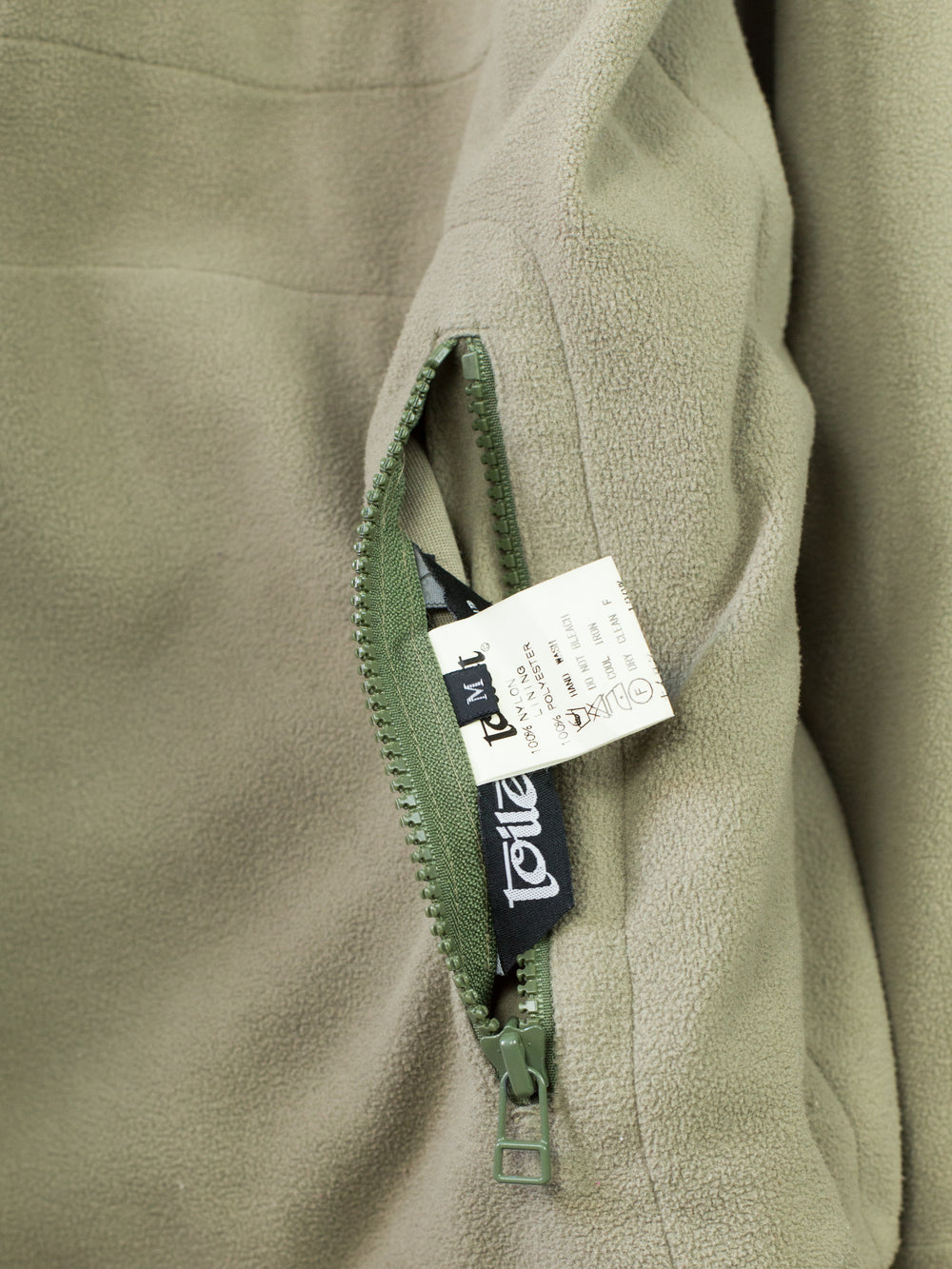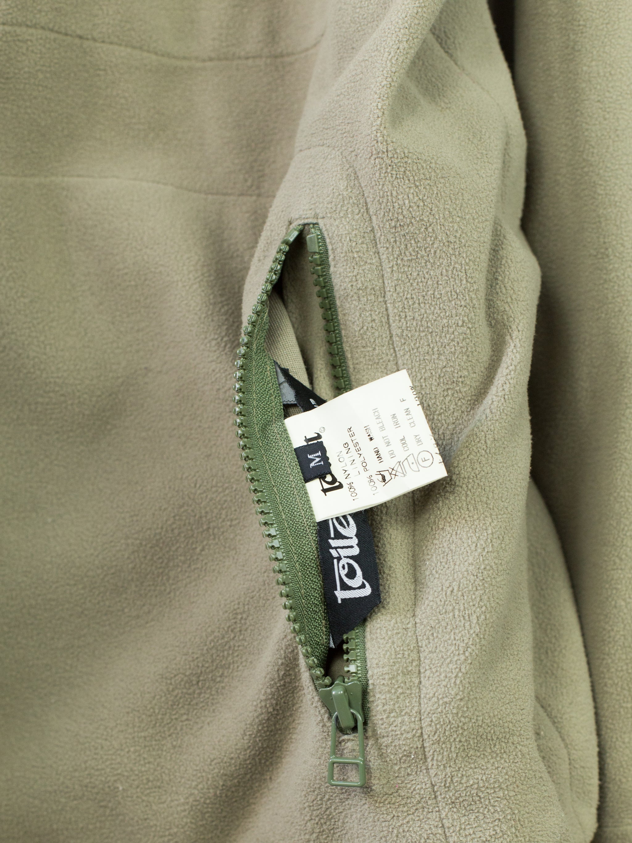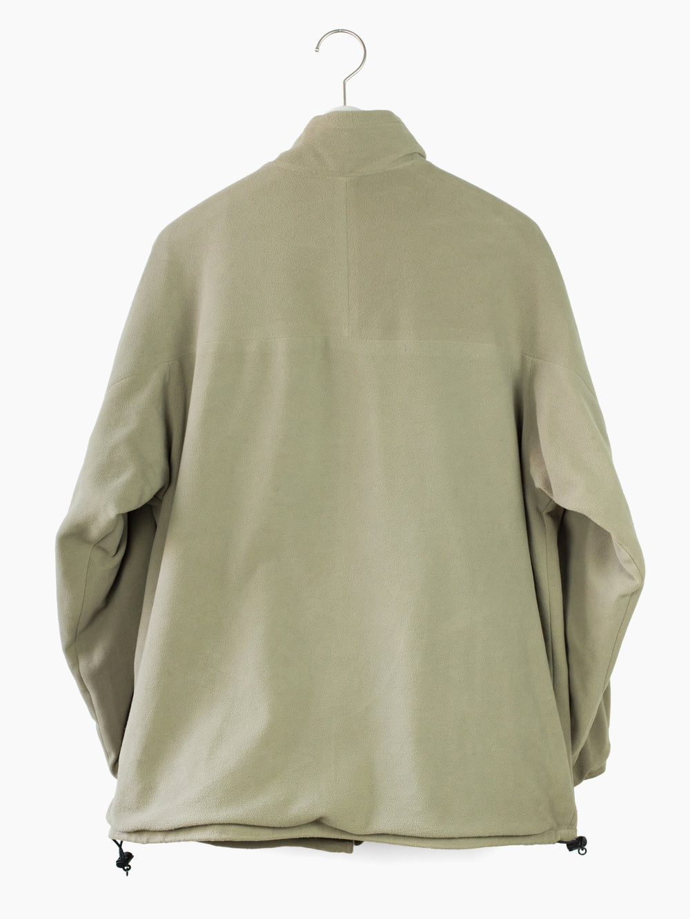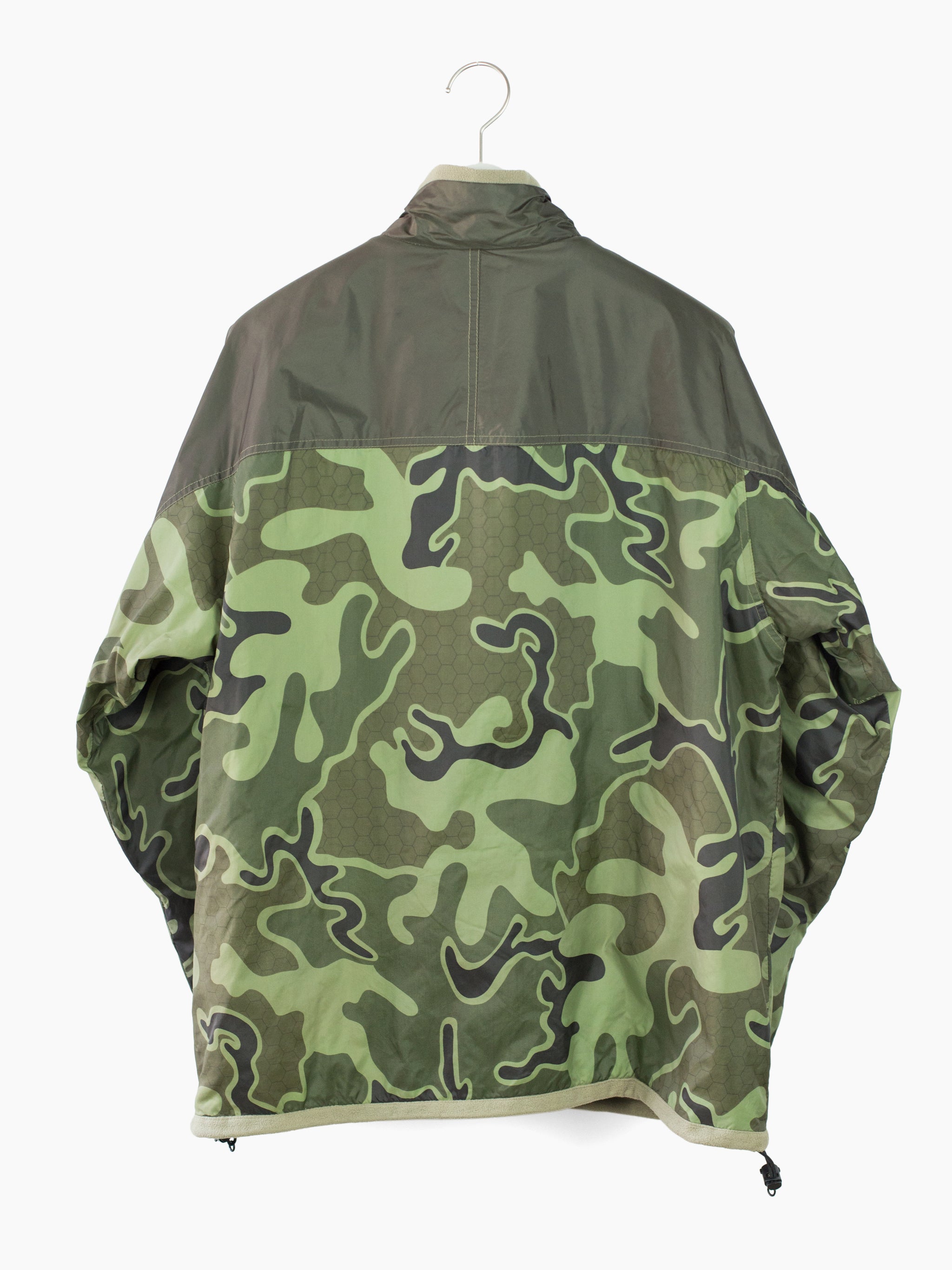 Fully reversible nylon-face fleece from Japanese brand Toilet, featuring a two-tone plain/camo nylon outer and contrast beige fleece interior. Both sides feature vertical zip-closed chest pocket at wearer's left and lower waist pockets. Beige fleece side features artfully cut curved-corner pocketbags for a subtle retro-mountaineering aesthetic. Incredibly versatile and wearable.