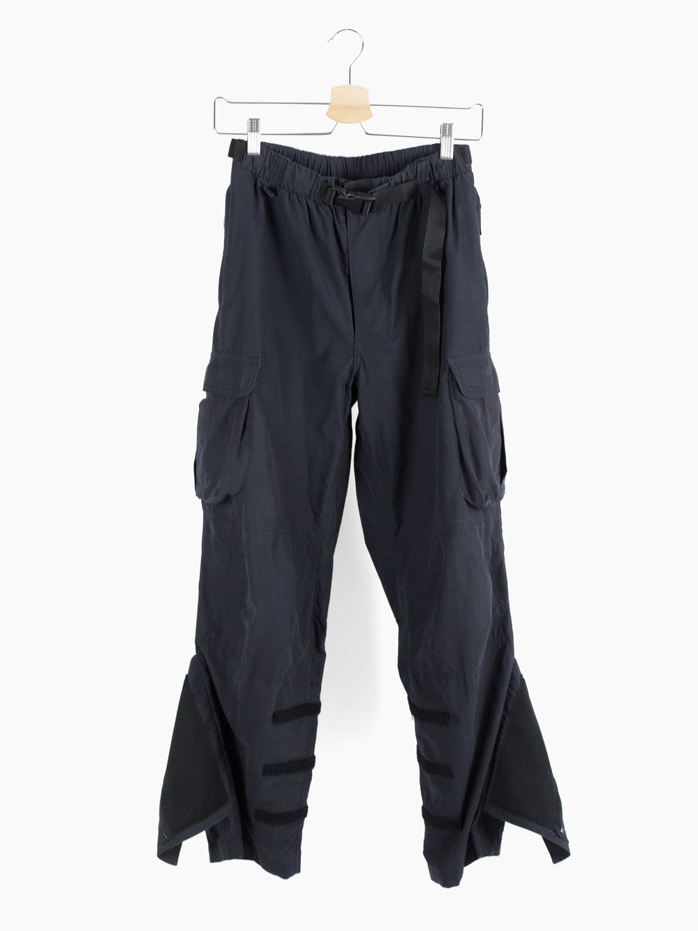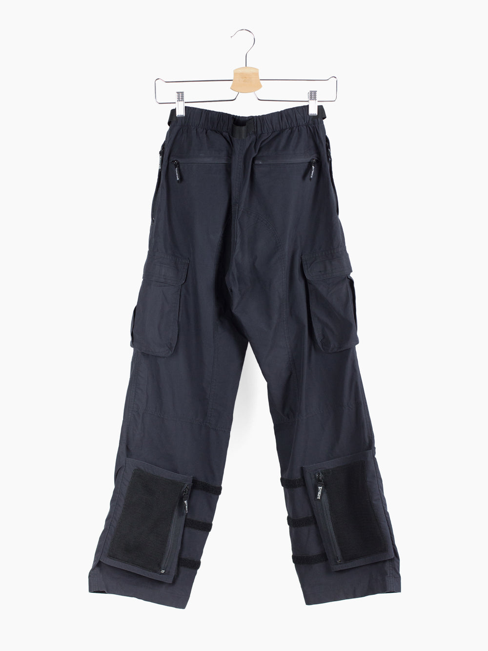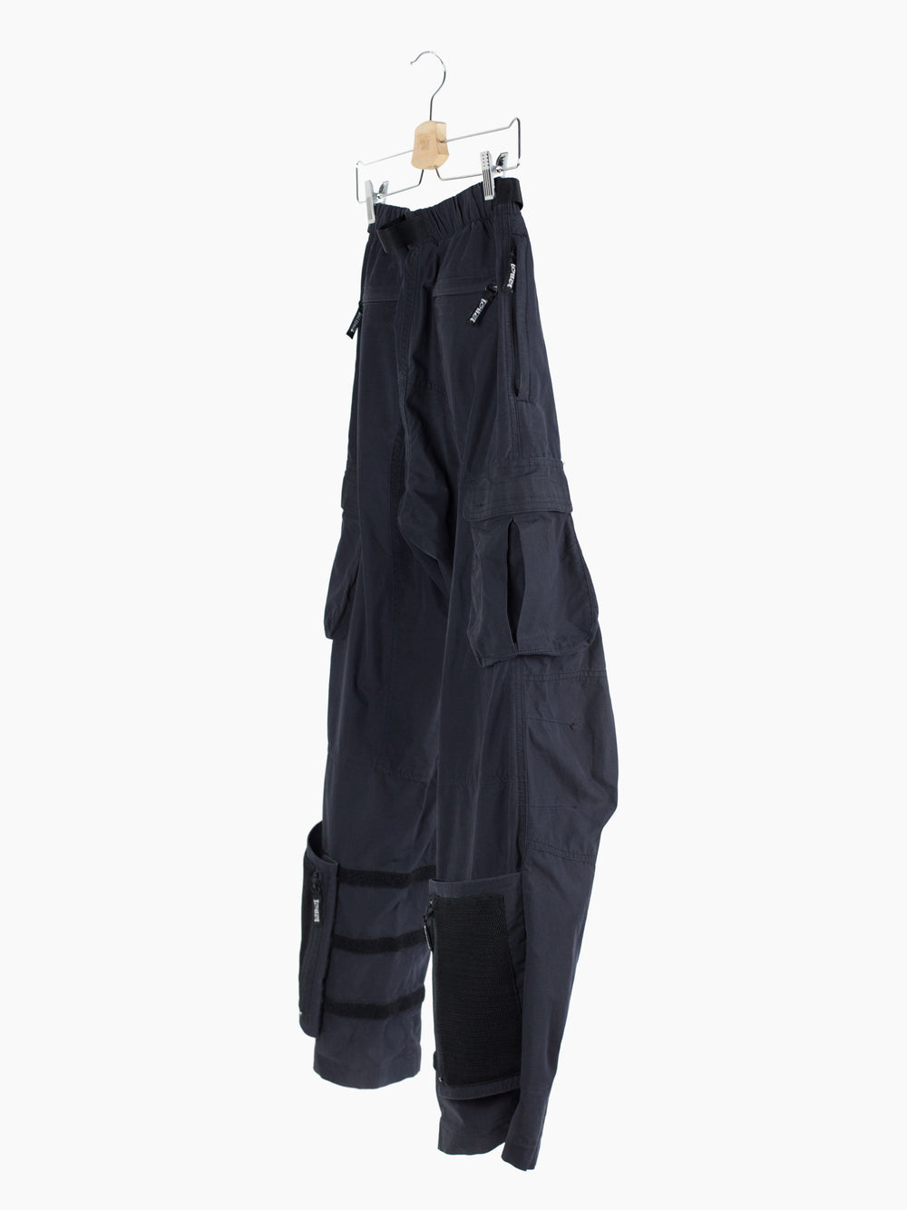 Articulated utility riding pant from Japanese brand Toilet, featuring statement lower leg zippered mesh calf pockets. They're stitched onto the outseam on one side with a velcro strip on the other that lets it adjust the lower leg profile depending on wearer's preference. They can be left hanging as well for a dynamic fin-like silhouette.