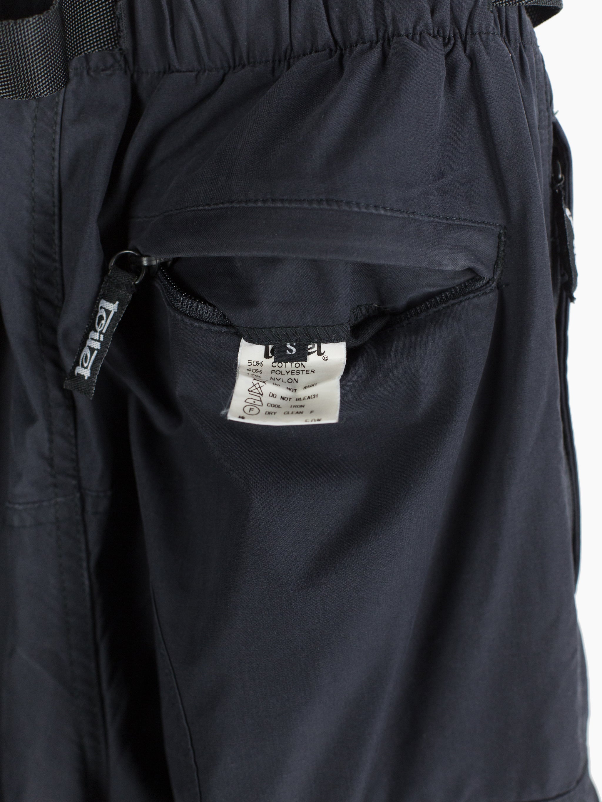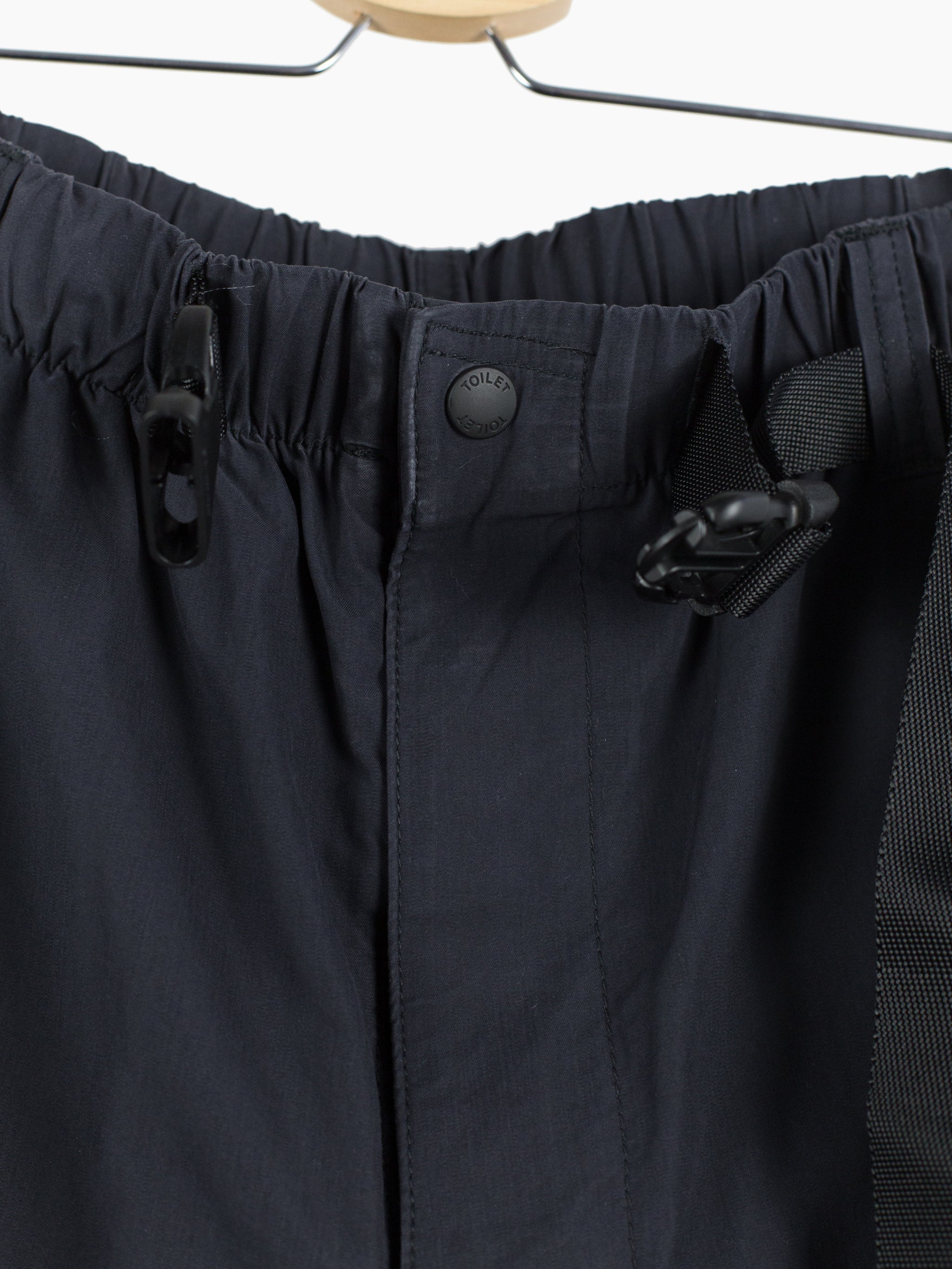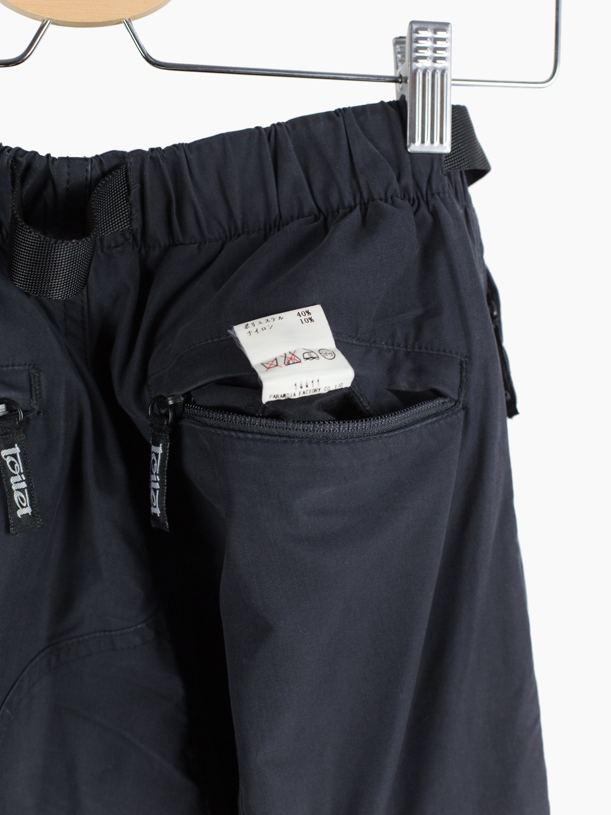 Articulated utility riding pant from Japanese brand Toilet, featuring statement lower leg zippered mesh calf pockets. They're stitched onto the outseam on one side with a velcro strip on the other that lets it adjust the lower leg profile depending on wearer's preference. They can be left hanging as well for a dynamic fin-like silhouette.