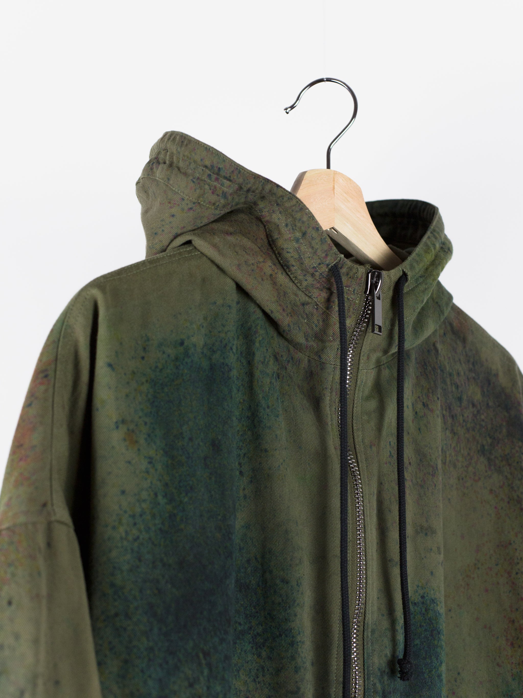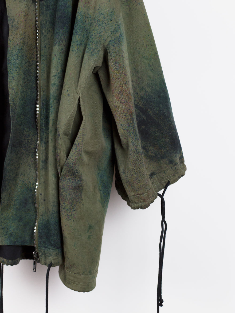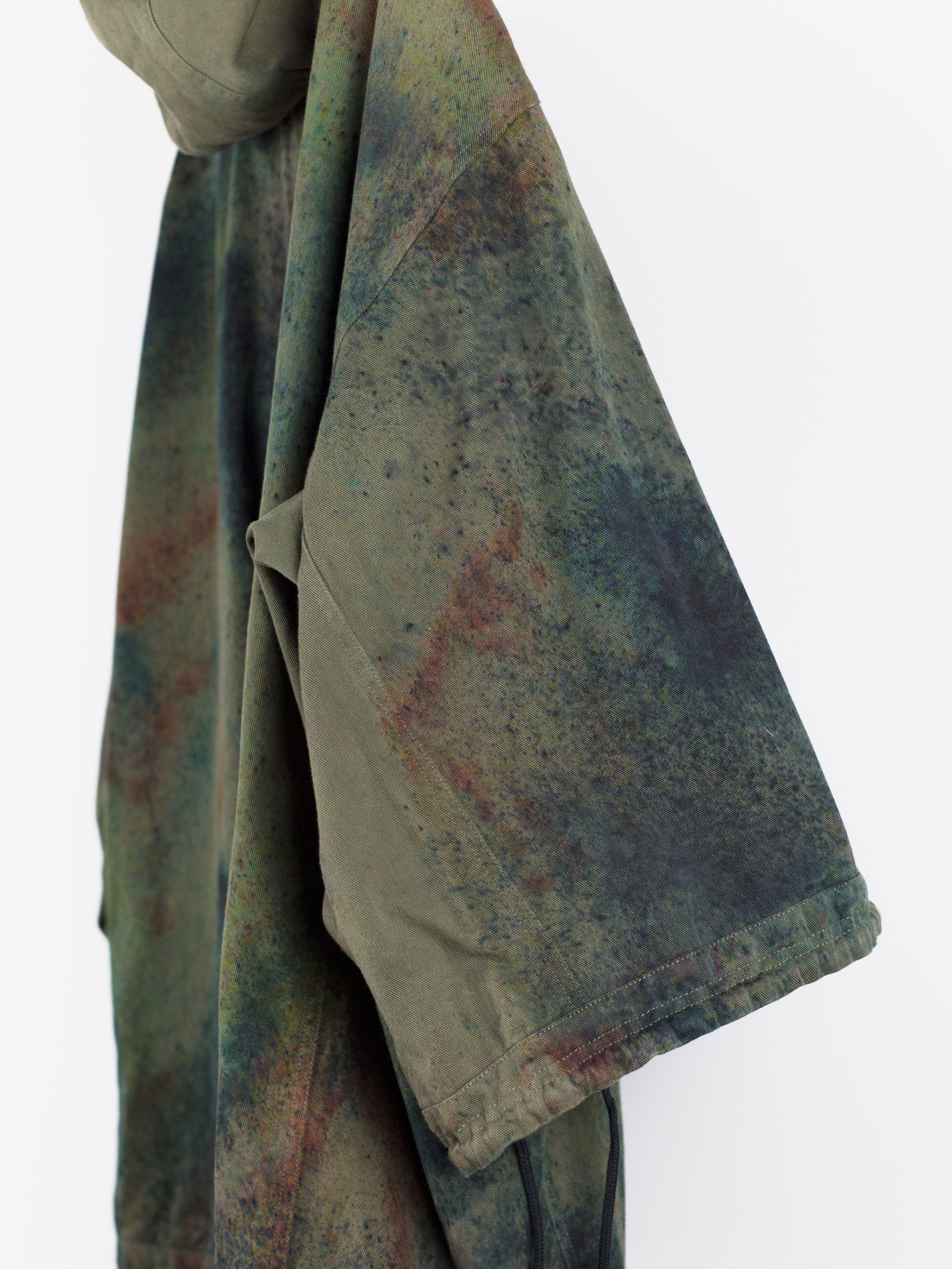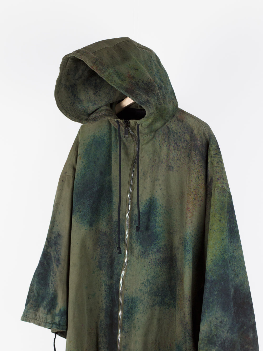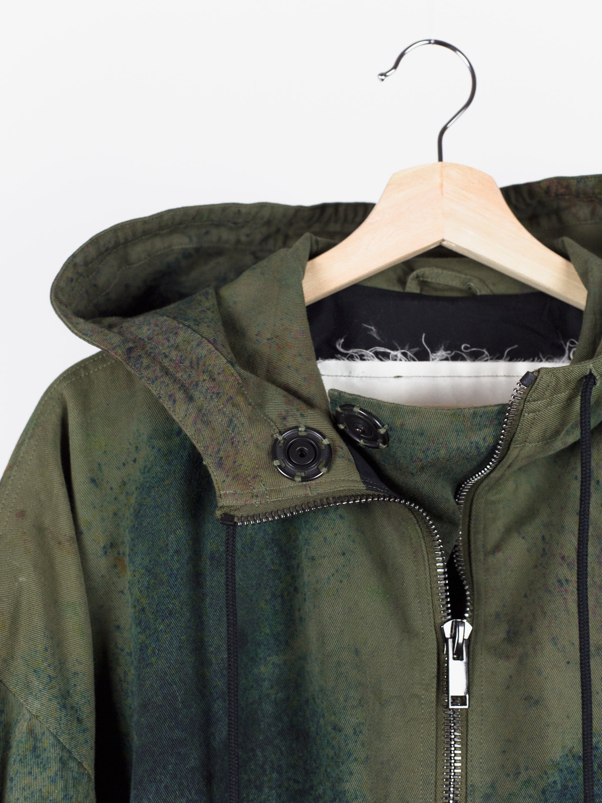 Collection 6 Explorer Coat, in a beautiful olive green cotton face fabric with hand sprayed and hand painted finish. Mossy earthen greens, rusted orange, and deep ink blacks come together to form an abstract landscape on the garment. The coat is finished with chunky center front zip as a textural accent and extended drawcords at hood, hem, and sleeve for adjustability. It's cut with gusseted sleeves that lend a three dimensional character to the silhouette as well as on-seam side entry pockets at the waist. The mammoth oversize fit and large curved hood provide a palpable sense of protection.