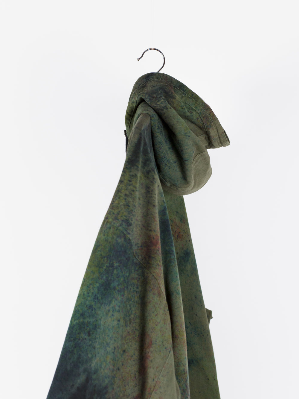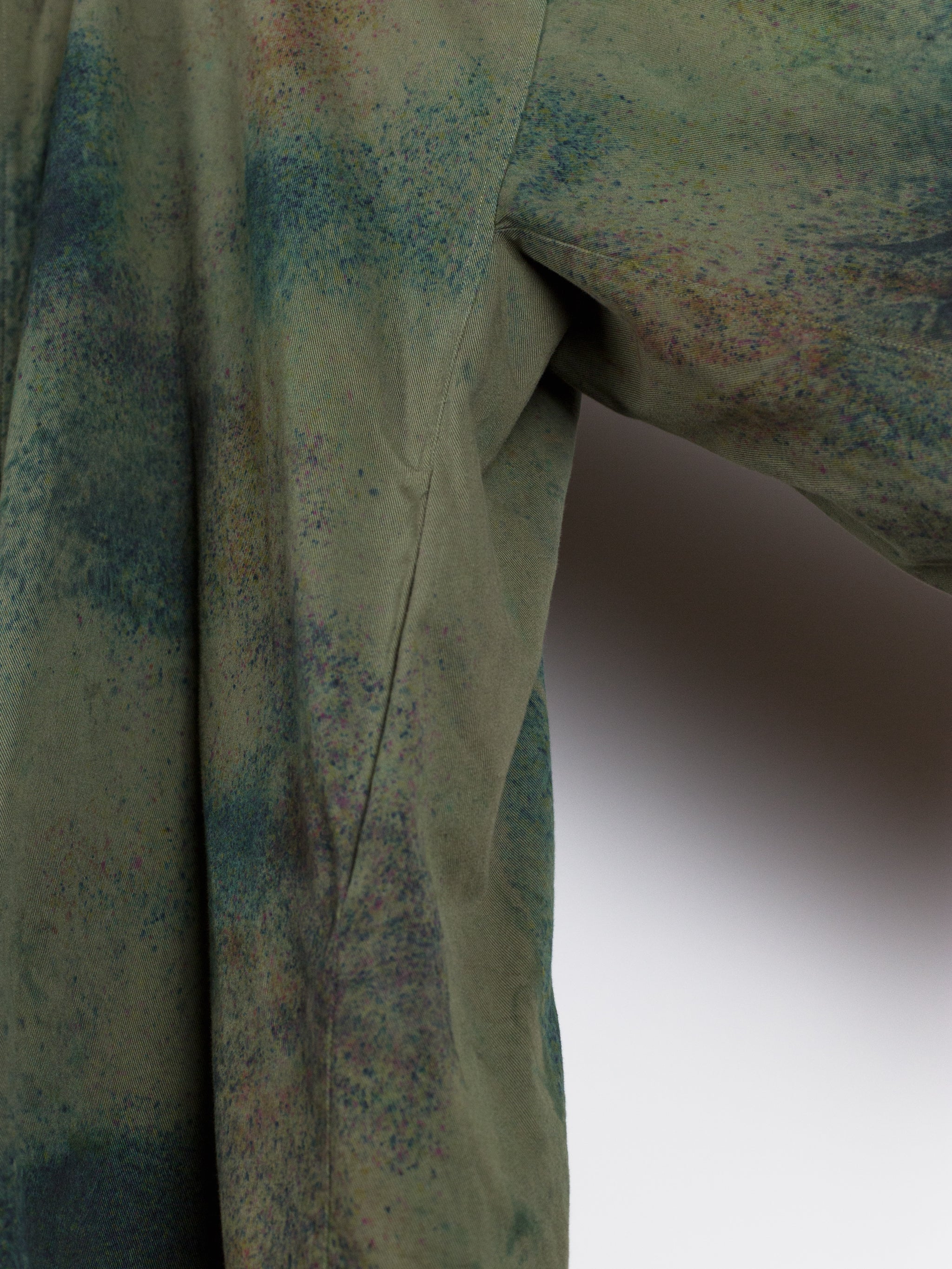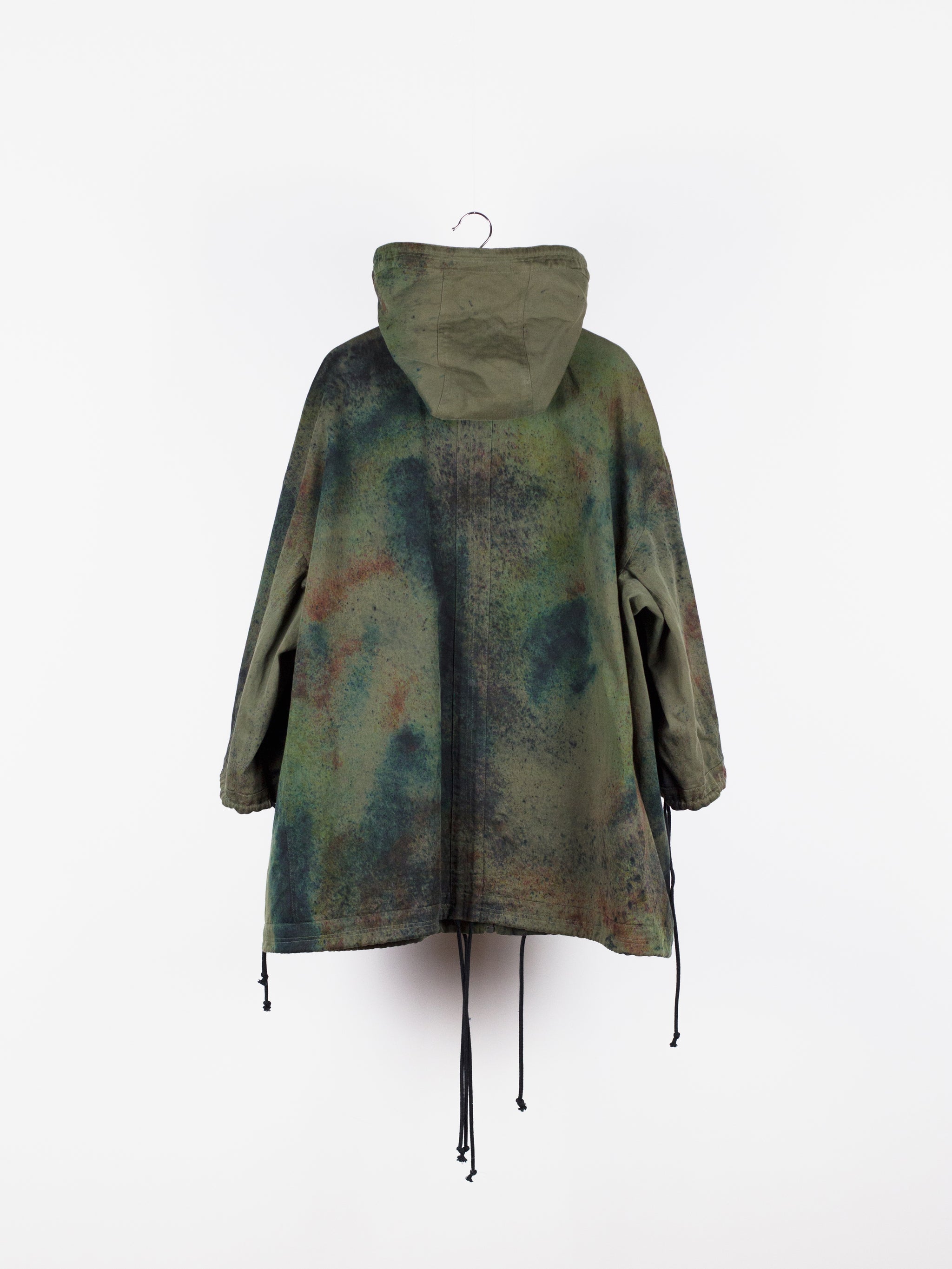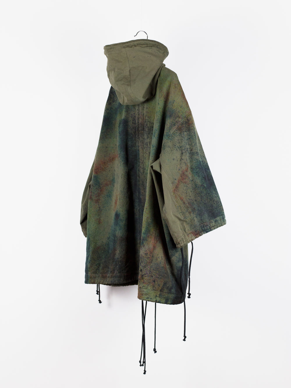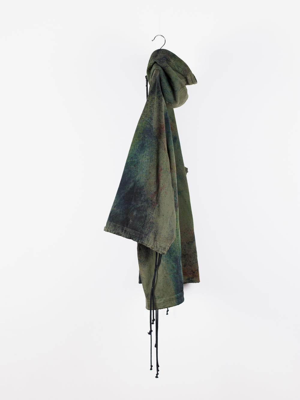 Collection 6 Explorer Coat, in a beautiful olive green cotton face fabric with hand sprayed and hand painted finish. Mossy earthen greens, rusted orange, and deep ink blacks come together to form an abstract landscape on the garment. The coat is finished with chunky center front zip as a textural accent and extended drawcords at hood, hem, and sleeve for adjustability. It's cut with gusseted sleeves that lend a three dimensional character to the silhouette as well as on-seam side entry pockets at the waist. The mammoth oversize fit and large curved hood provide a palpable sense of protection.
