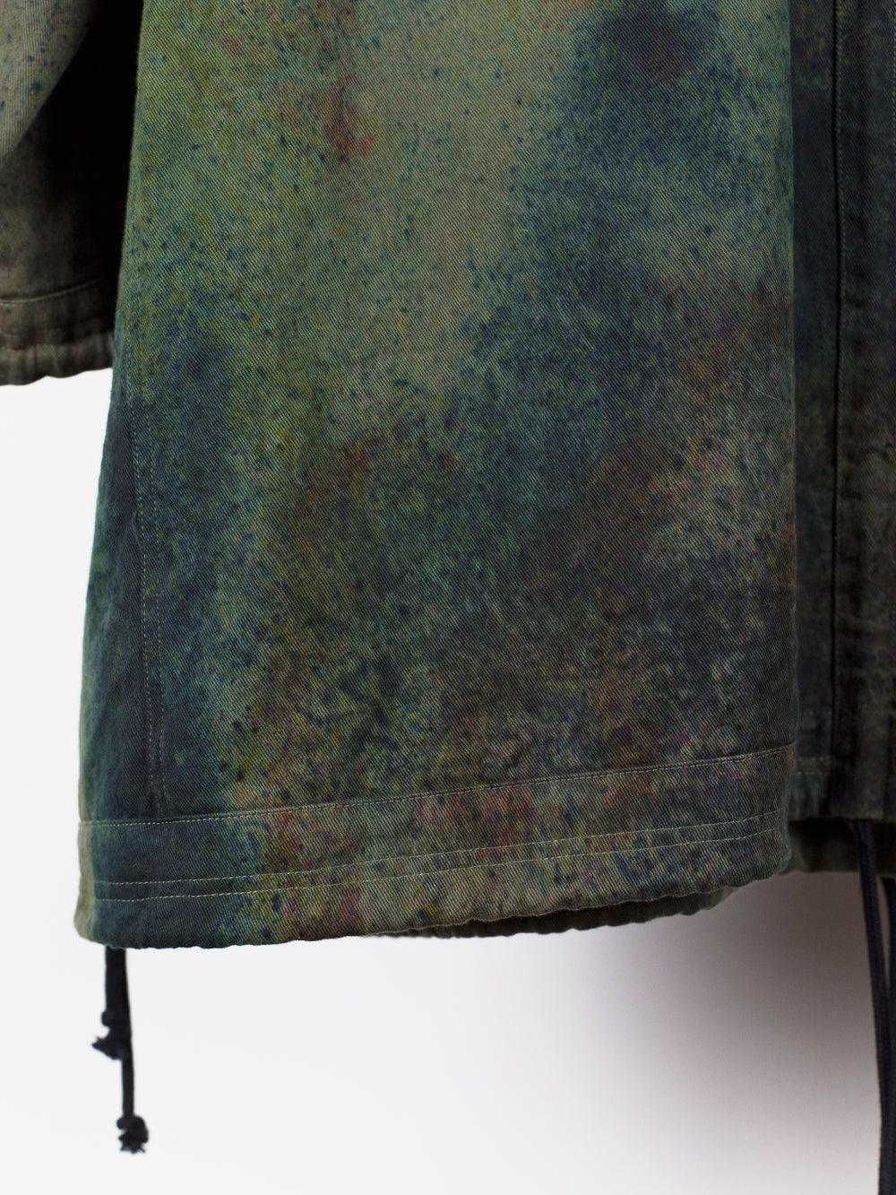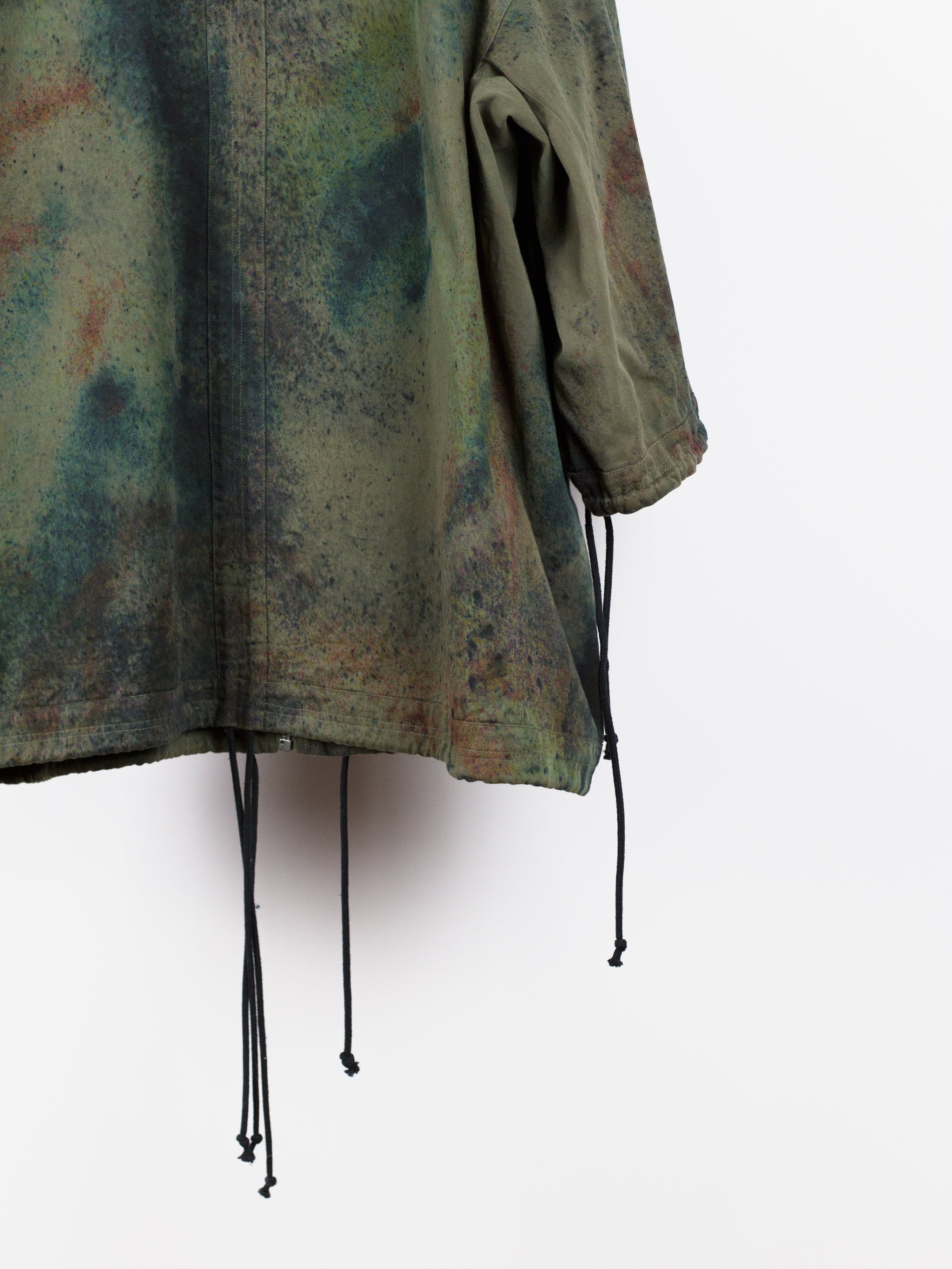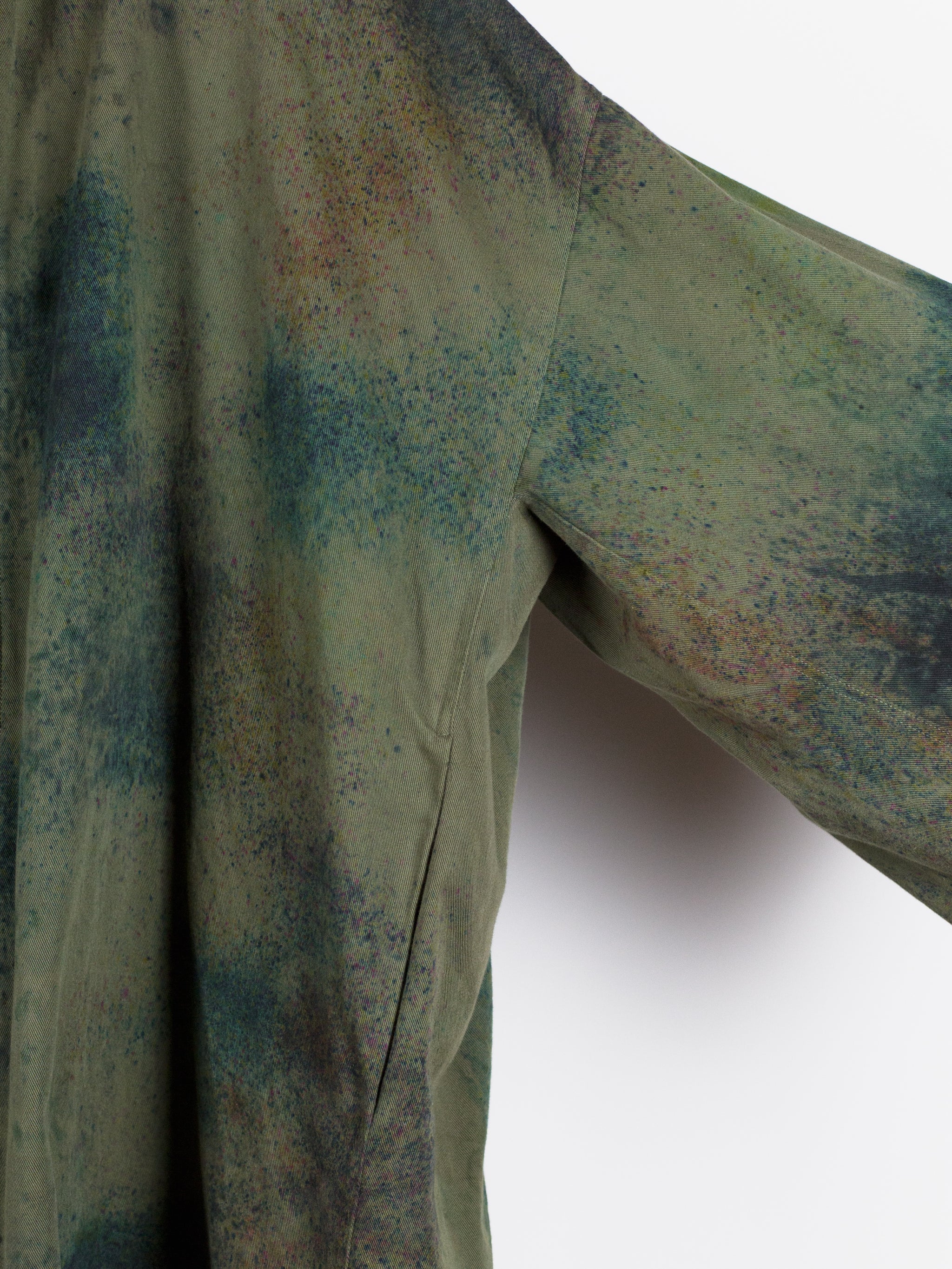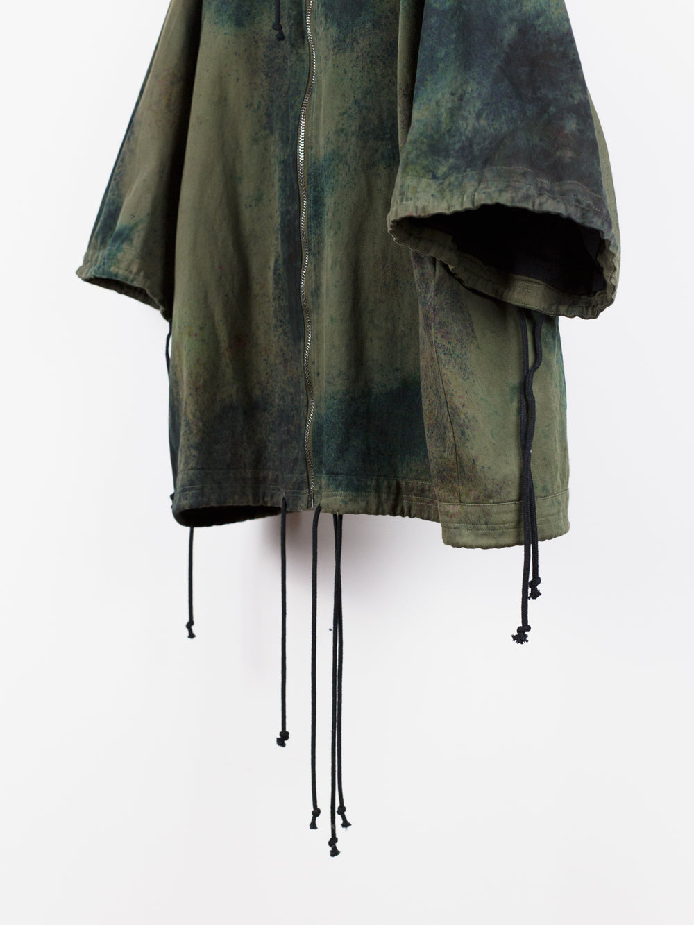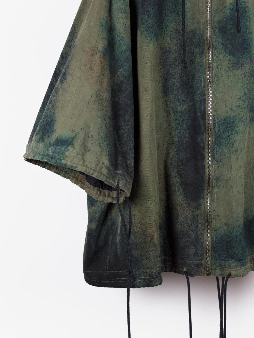 Collection 6 Explorer Coat, in a beautiful olive green cotton face fabric with hand sprayed and hand painted finish. Mossy earthen greens, rusted orange, and deep ink blacks come together to form an abstract landscape on the garment. The coat is finished with chunky center front zip as a textural accent and extended drawcords at hood, hem, and sleeve for adjustability. It's cut with gusseted sleeves that lend a three dimensional character to the silhouette as well as on-seam side entry pockets at the waist. The mammoth oversize fit and large curved hood provide a palpable sense of protection.
