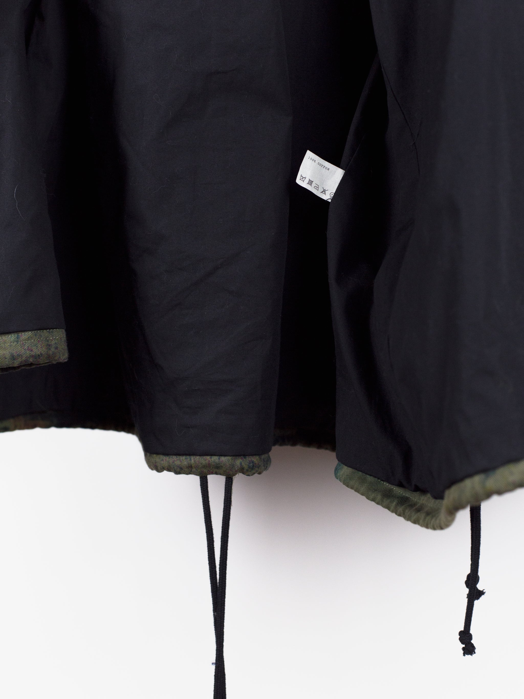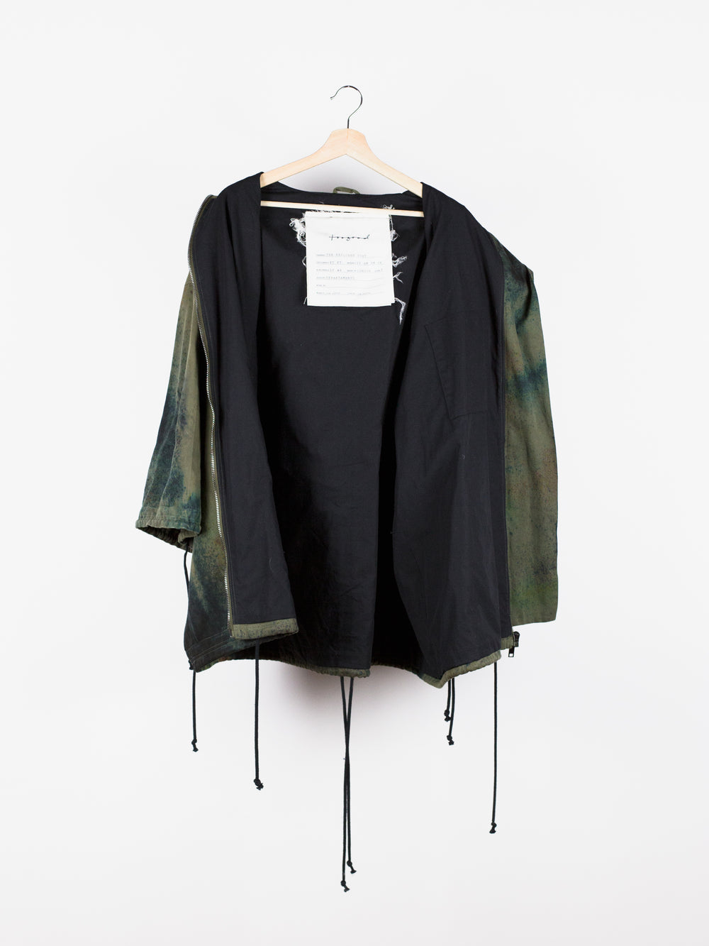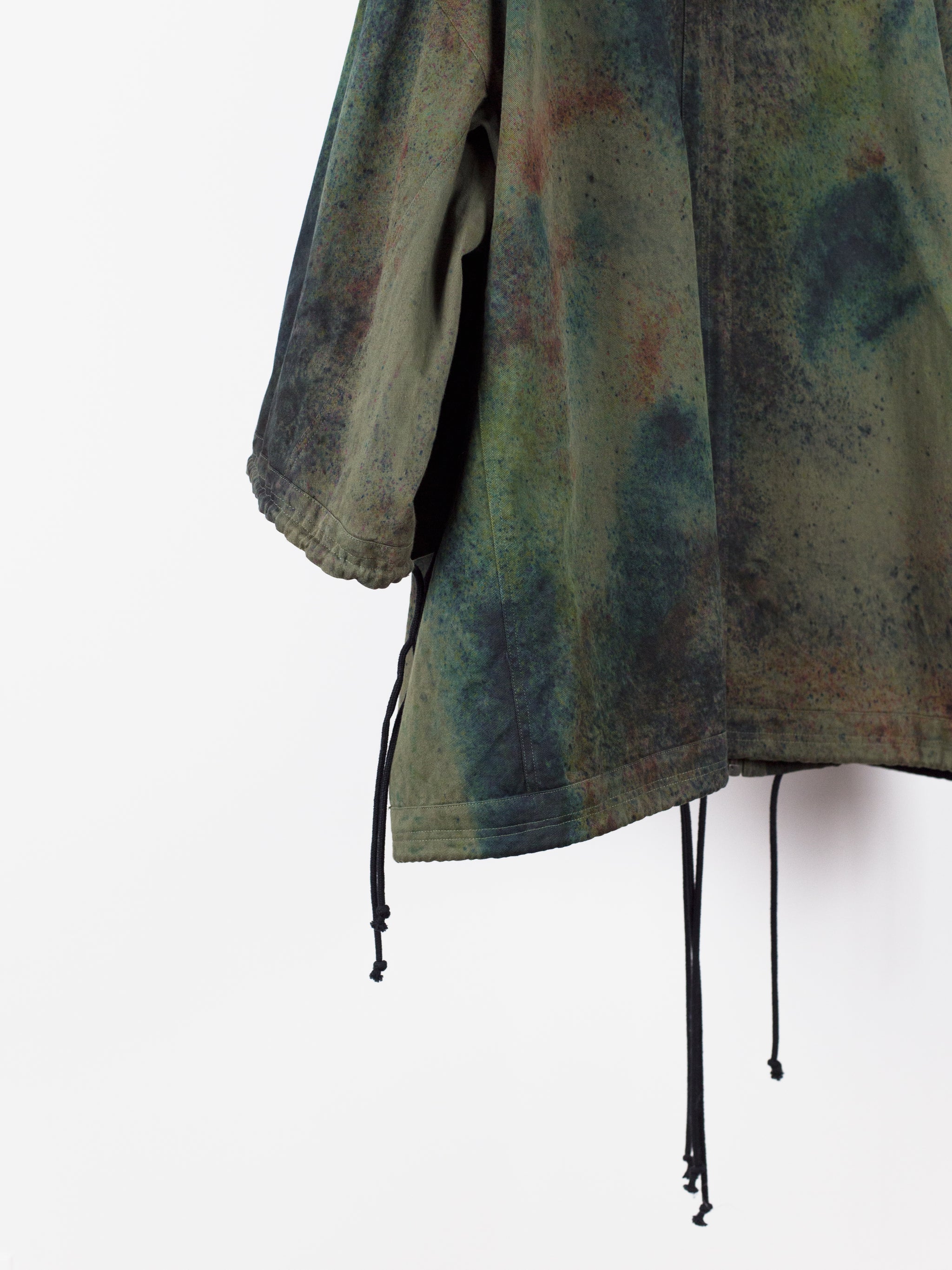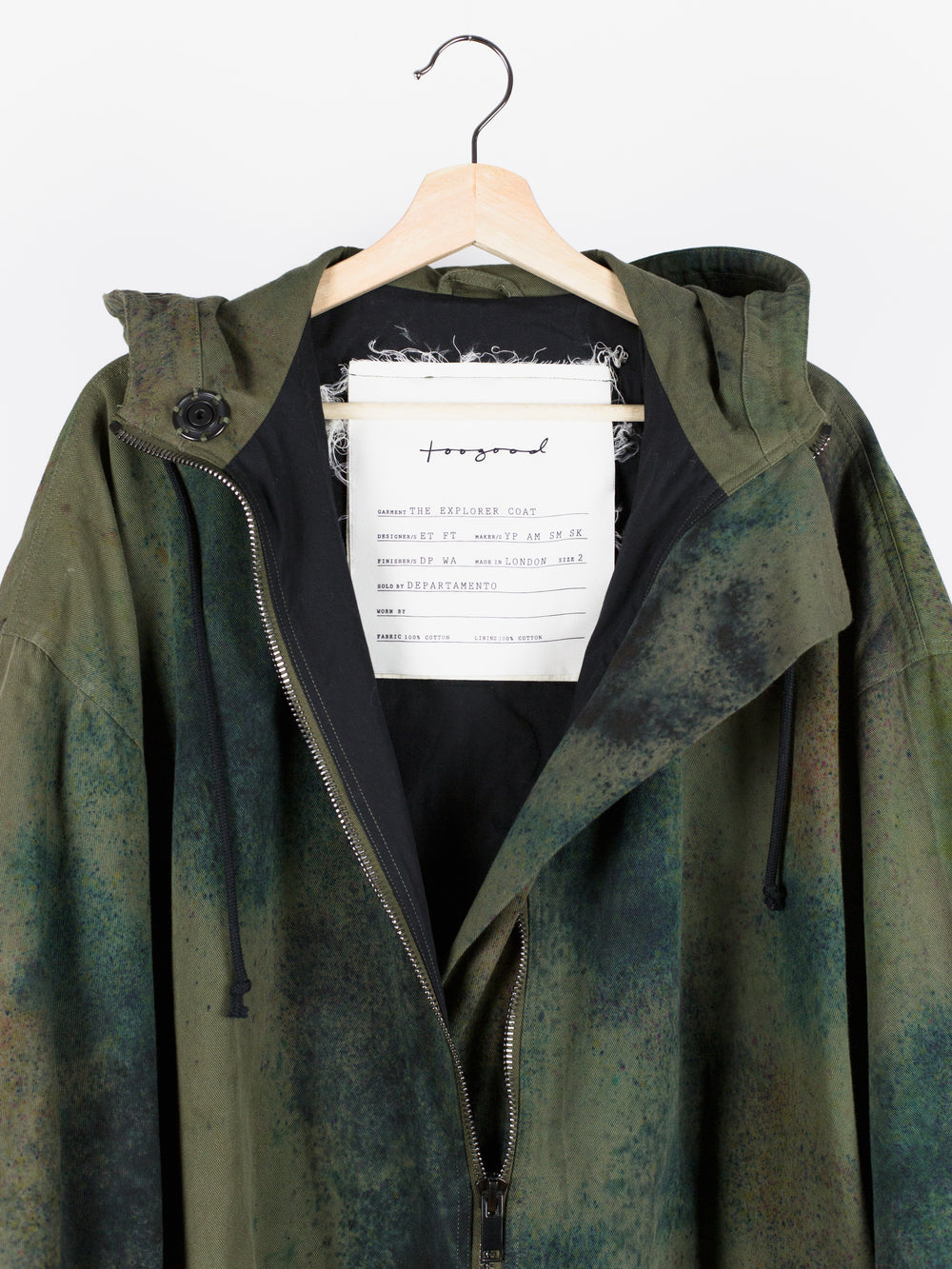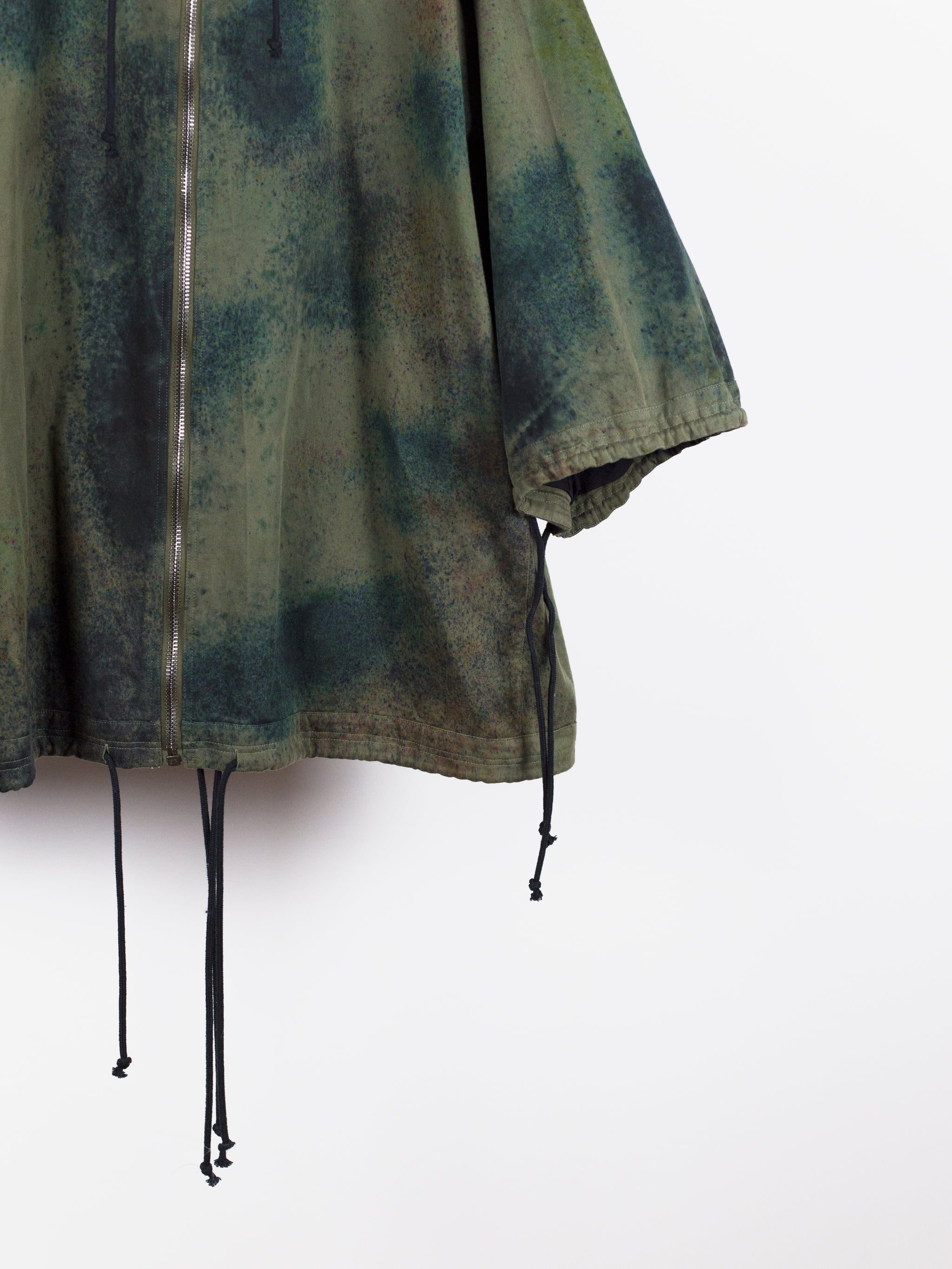 Collection 6 Explorer Coat, in a beautiful olive green cotton face fabric with hand sprayed and hand painted finish. Mossy earthen greens, rusted orange, and deep ink blacks come together to form an abstract landscape on the garment. The coat is finished with chunky center front zip as a textural accent and extended drawcords at hood, hem, and sleeve for adjustability. It's cut with gusseted sleeves that lend a three dimensional character to the silhouette as well as on-seam side entry pockets at the waist. The mammoth oversize fit and large curved hood provide a palpable sense of protection.
