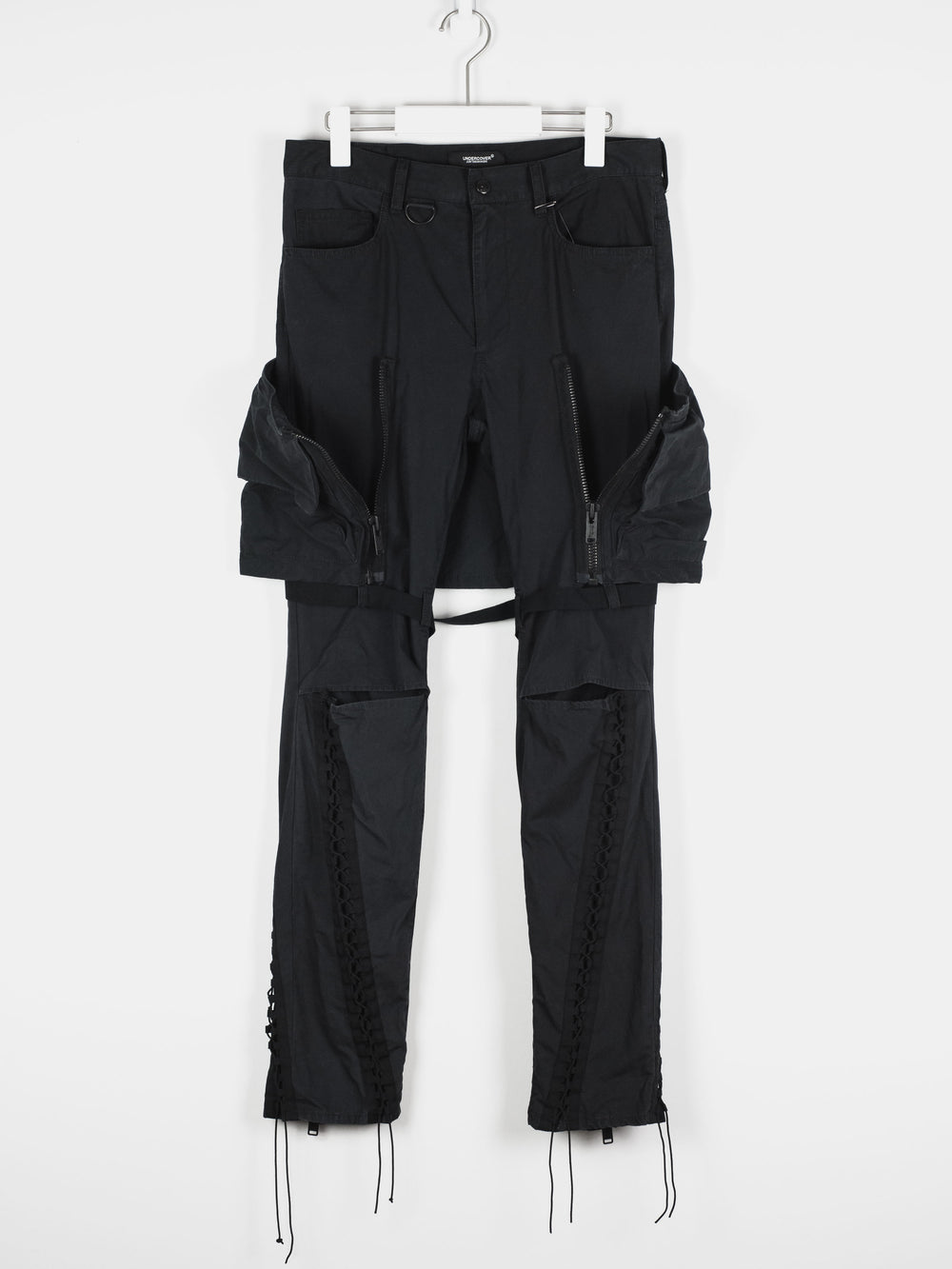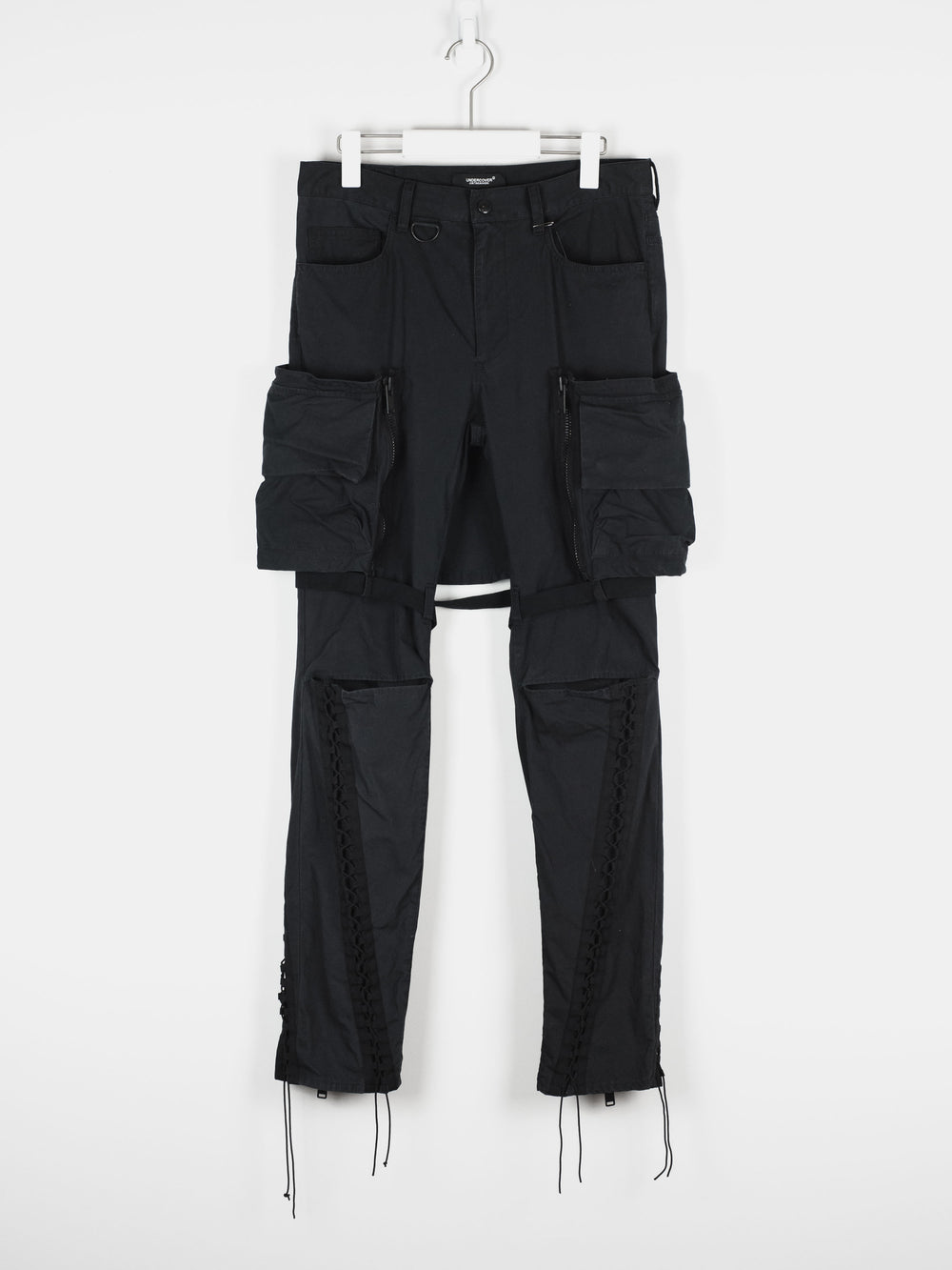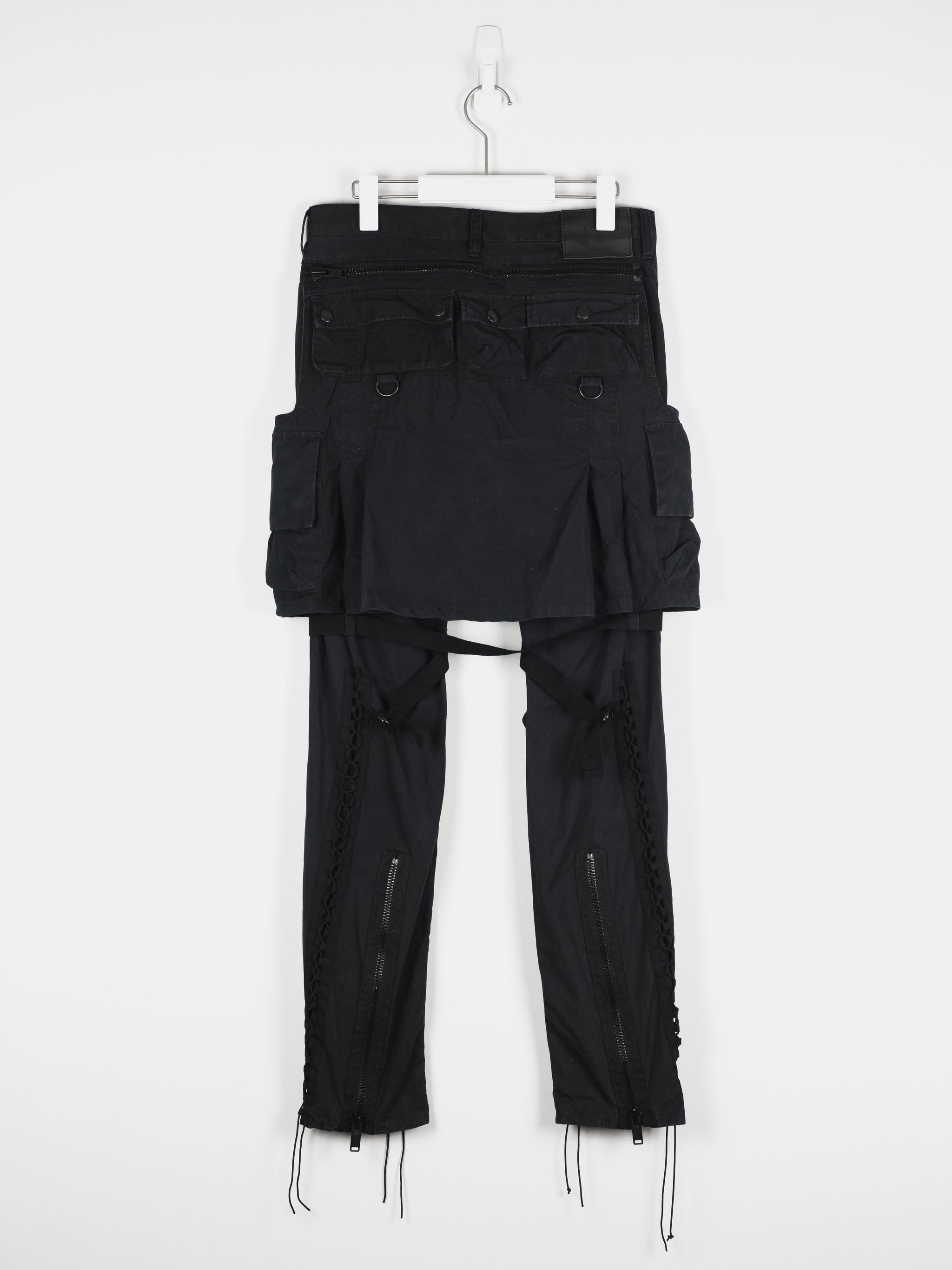 Incredible trousers from one of Undercover's best recent seasons, which revisits many established motifs in an interesting thematic collection by presenting 8 fictional factions. These trousers embody a beautiful combination of influences, with a detachable skirted panel and bondage details evoking Vivienne Westwood era punk influences, as well as numerous cargo pockets and aviator lacing inspired by military garments.