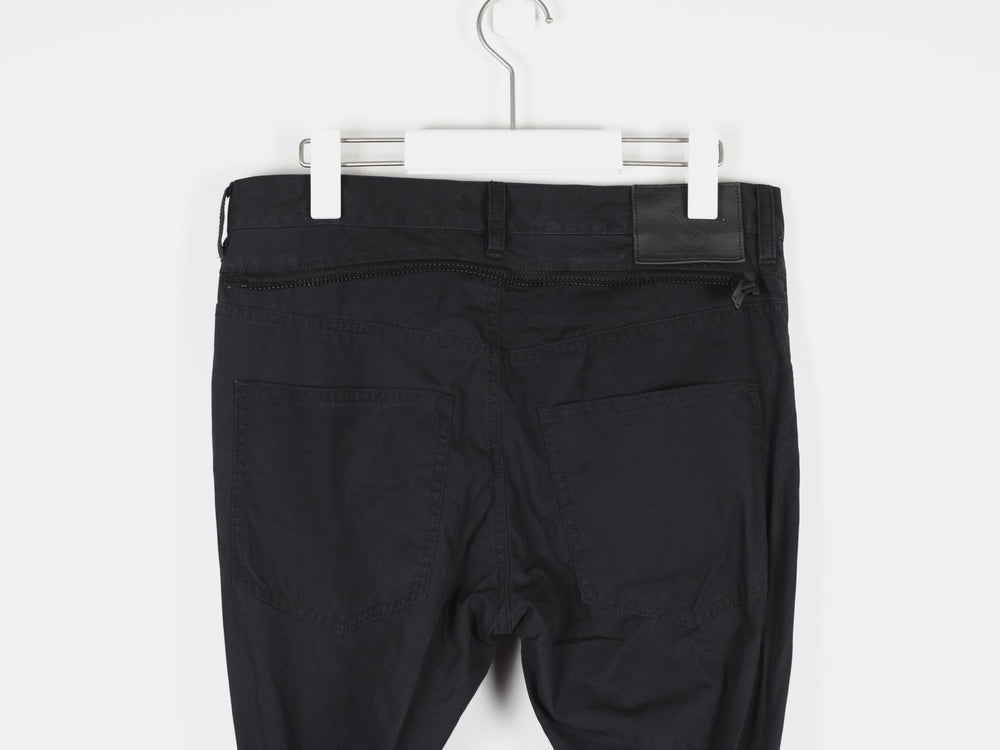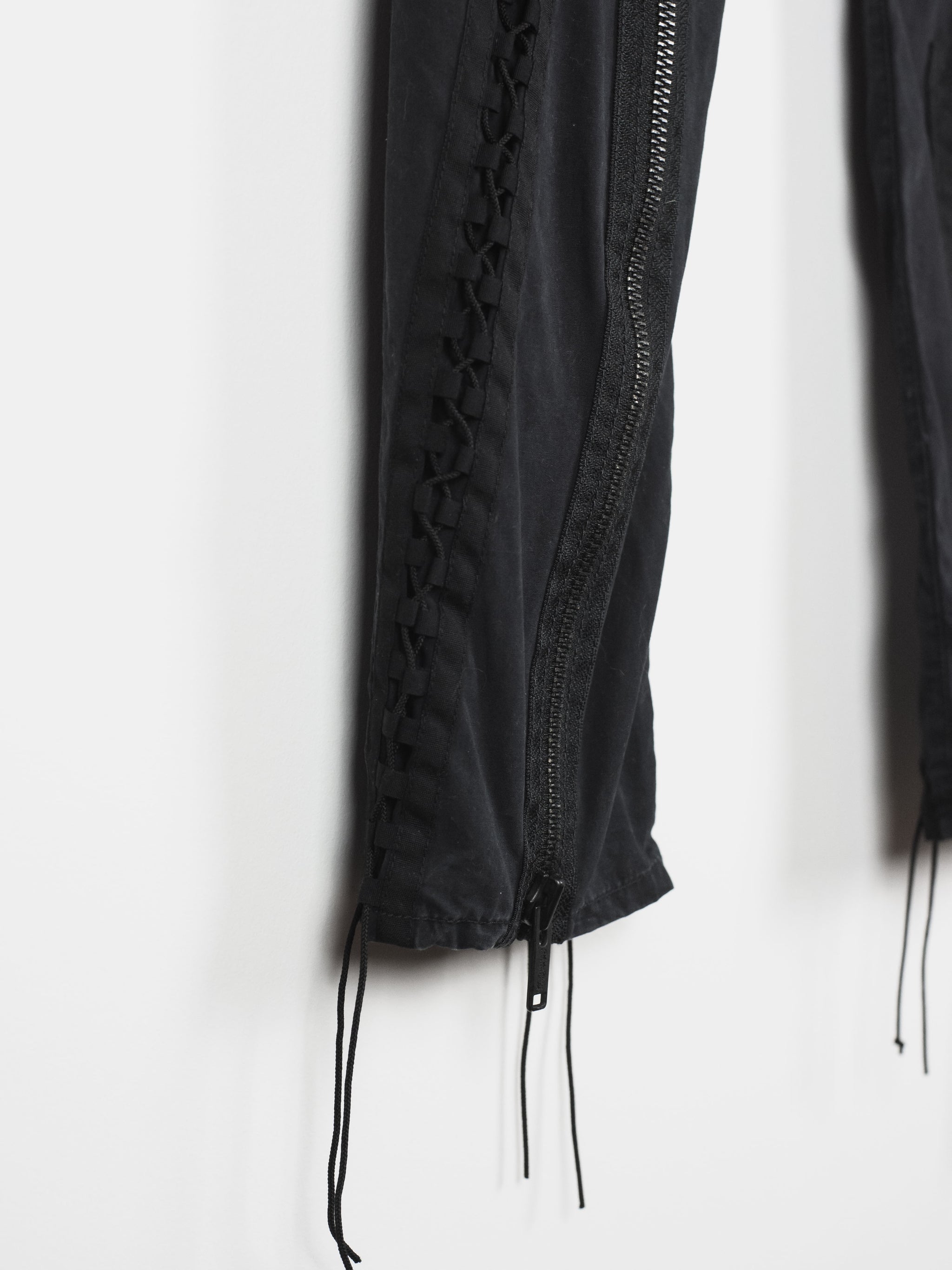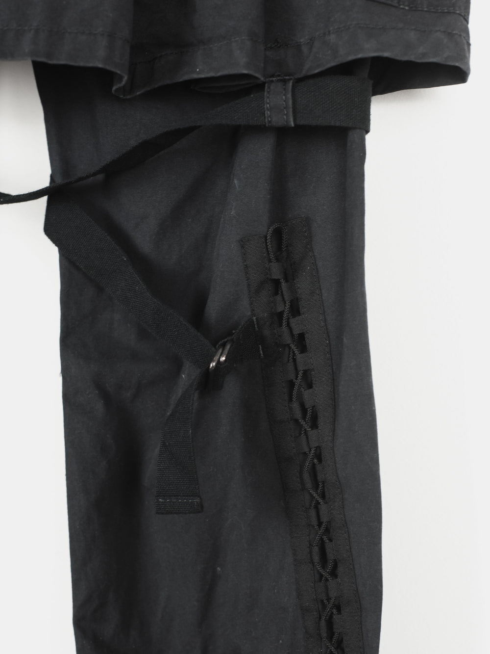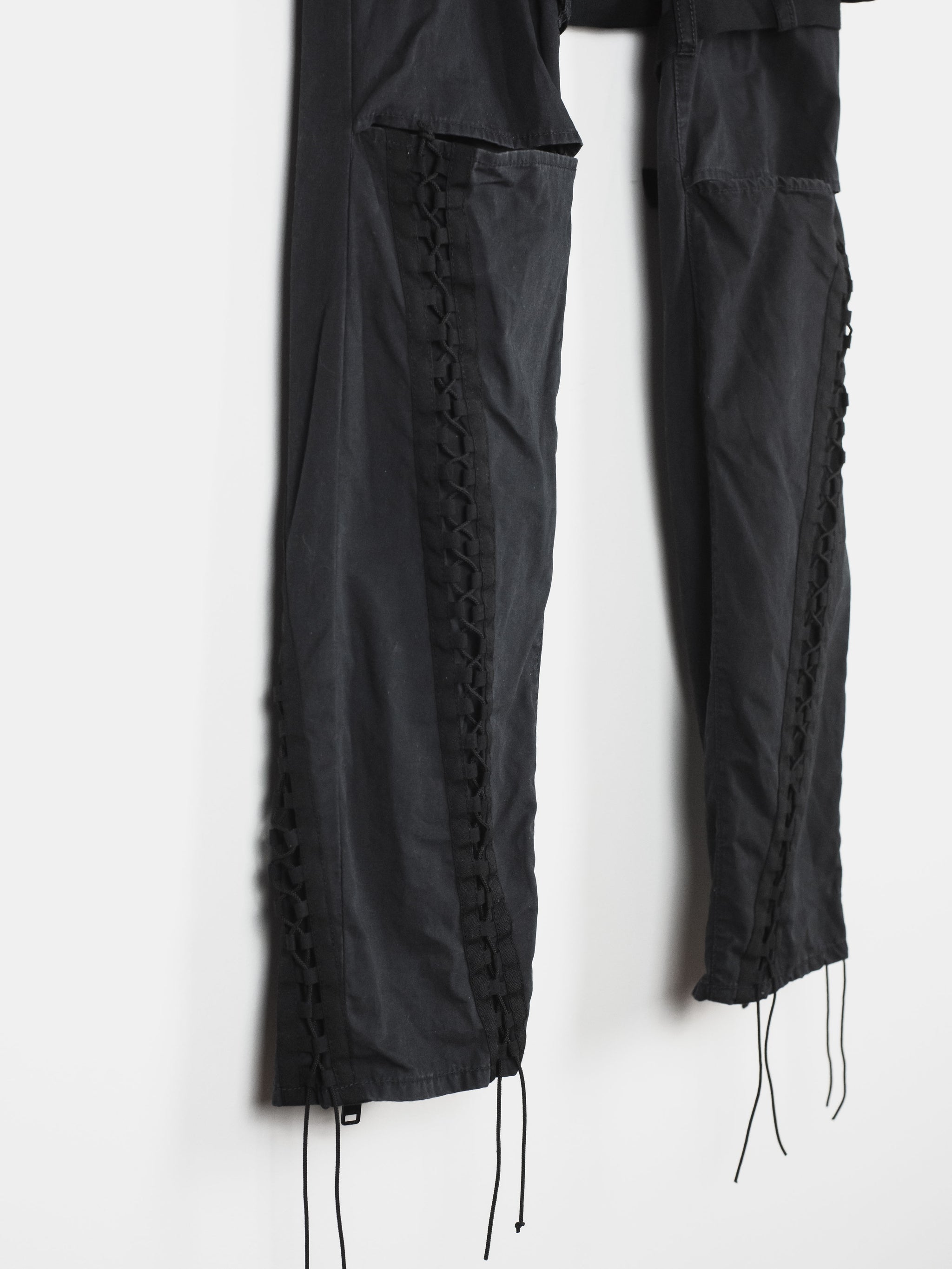 Incredible trousers from one of Undercover's best recent seasons, which revisits many established motifs in an interesting thematic collection by presenting 8 fictional factions. These trousers embody a beautiful combination of influences, with a detachable skirted panel and bondage details evoking Vivienne Westwood era punk influences, as well as numerous cargo pockets and aviator lacing inspired by military garments.