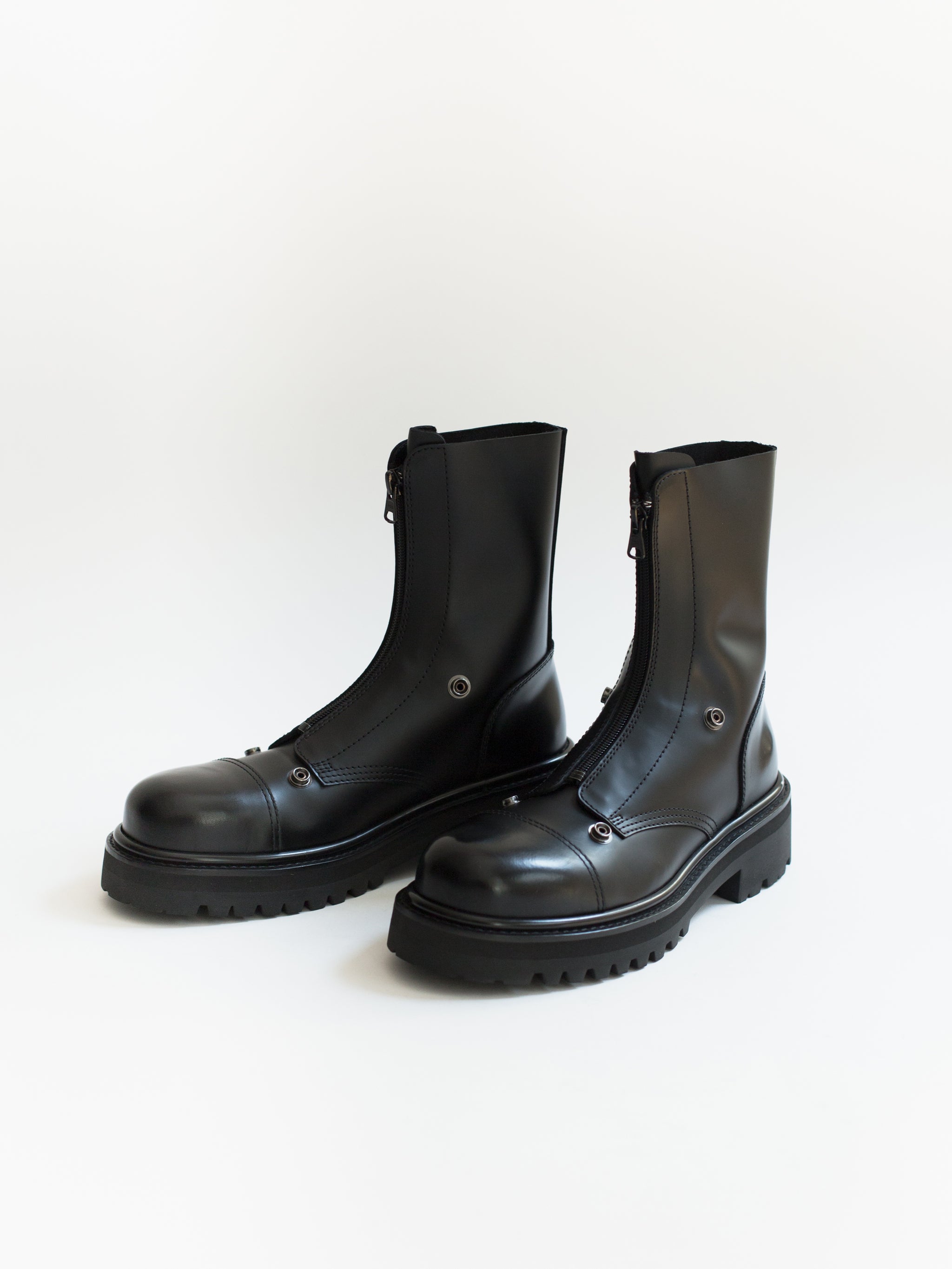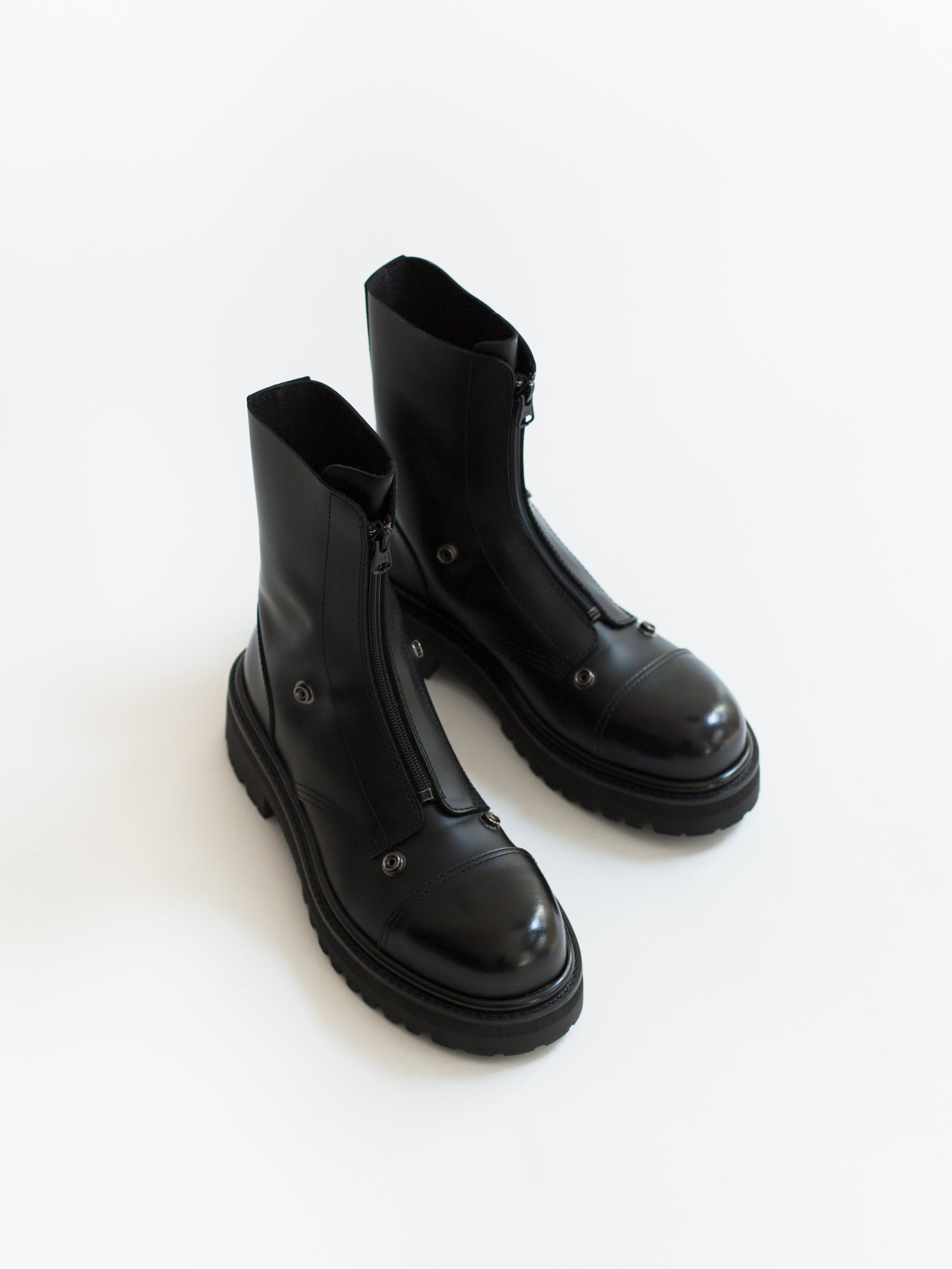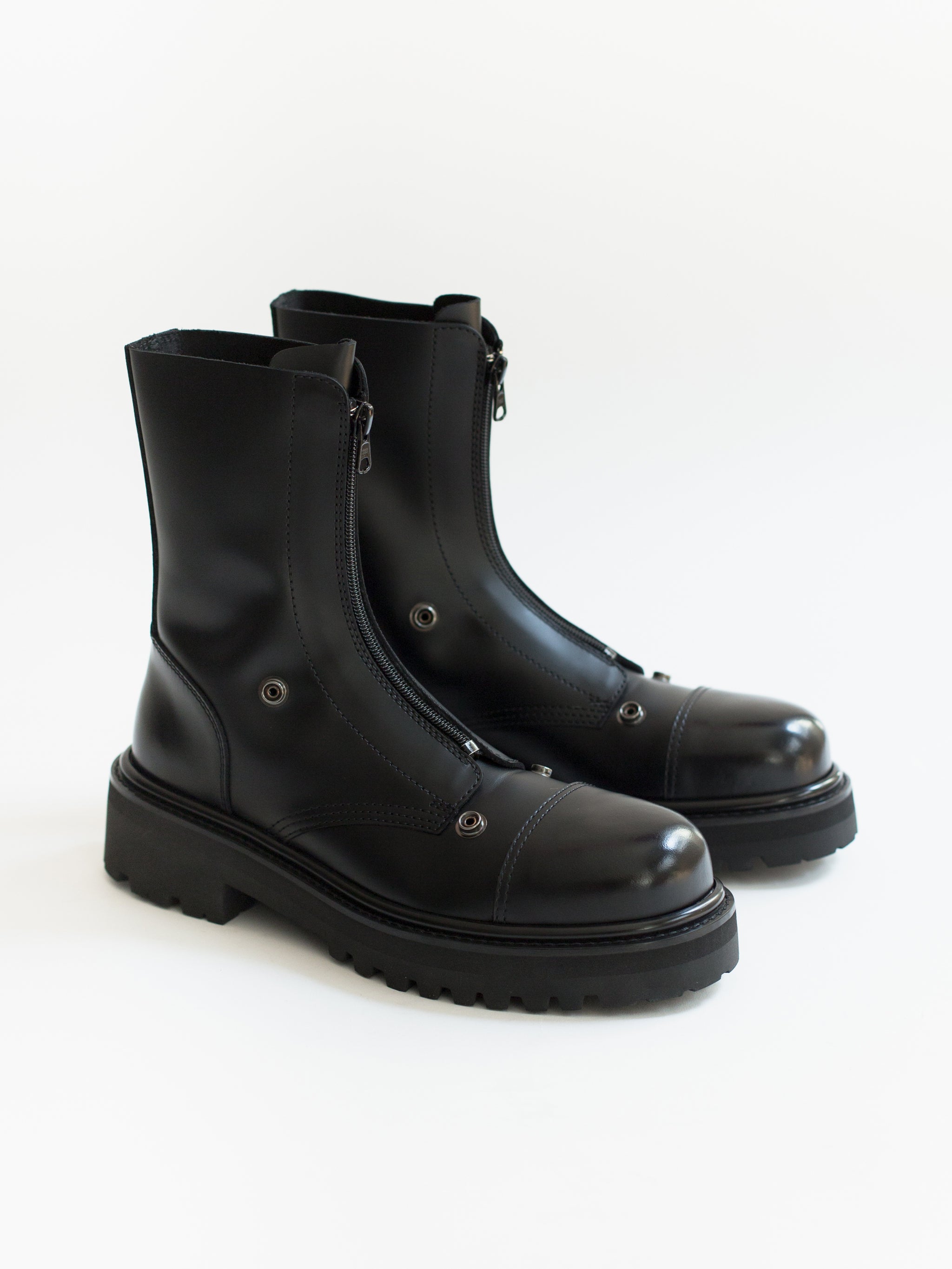 Polished leather with a buffed high-shine cap toe. Four snaps along each shoe's upper with center-zip front closure. Sewn welt with screws securing lug outsole.
