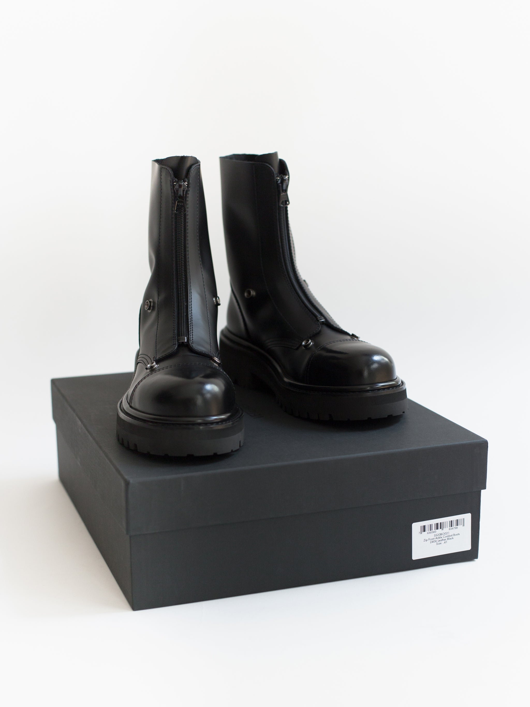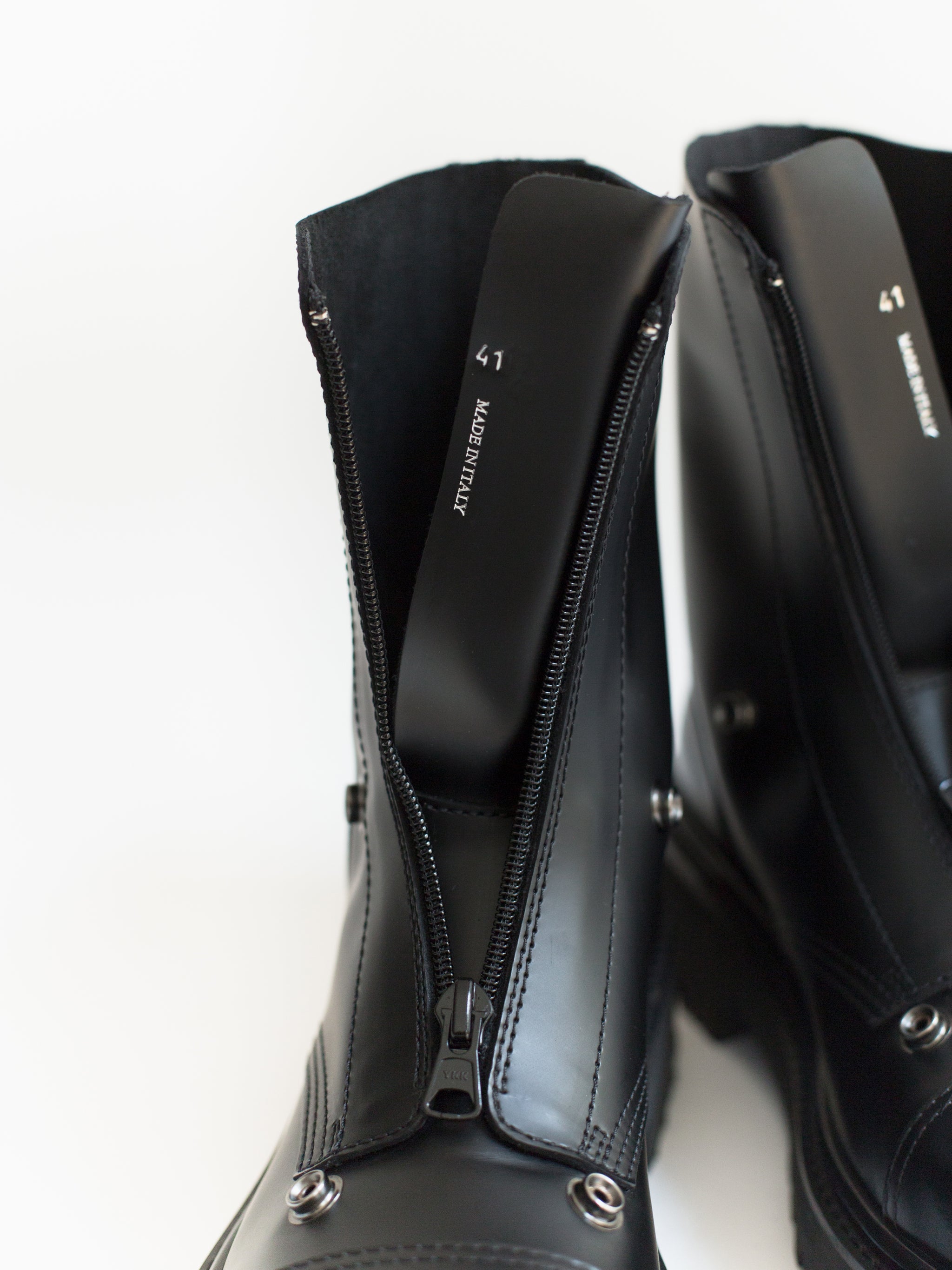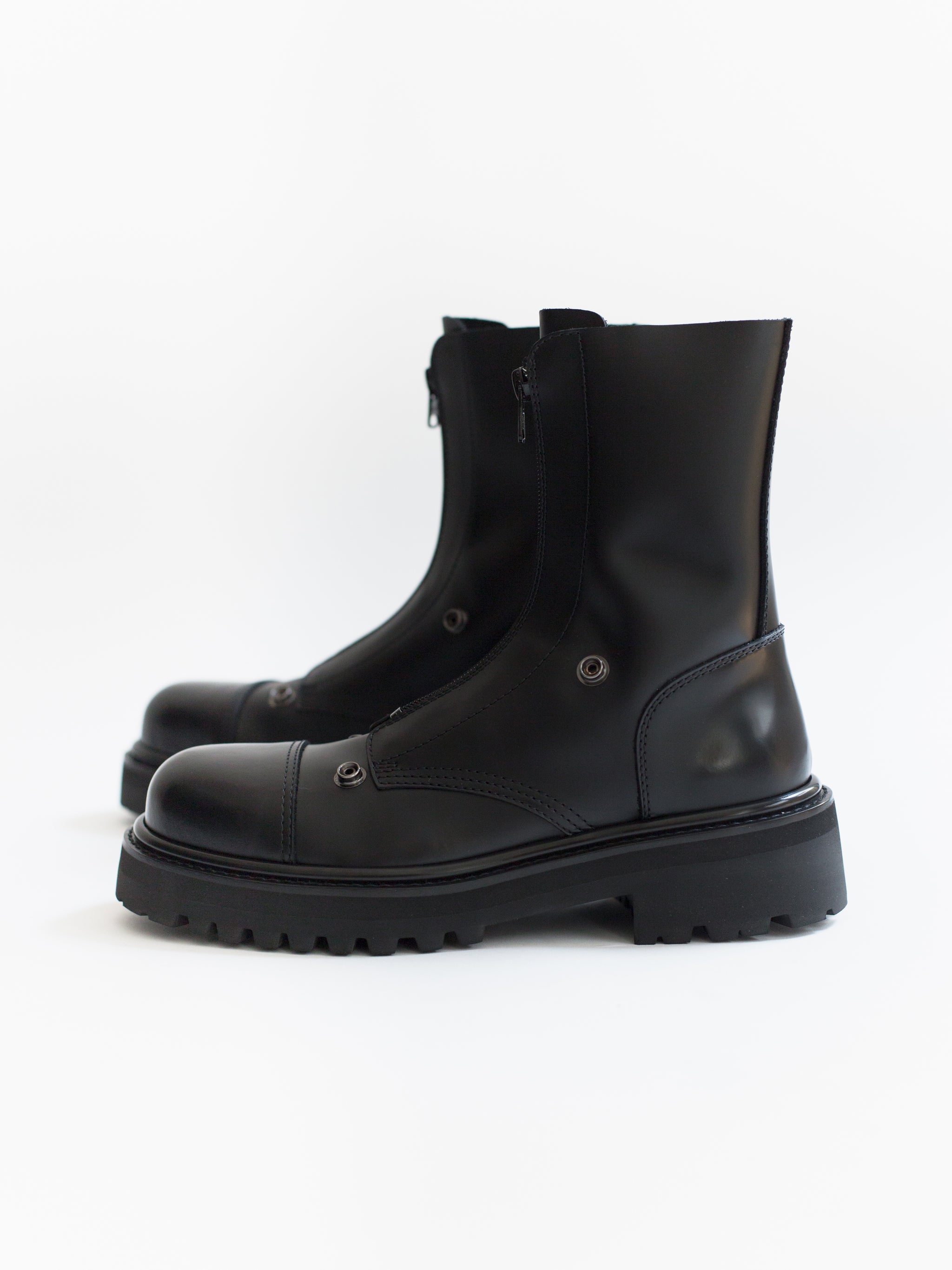 Polished leather with a buffed high-shine cap toe. Four snaps along each shoe's upper with center-zip front closure. Sewn welt with screws securing lug outsole.