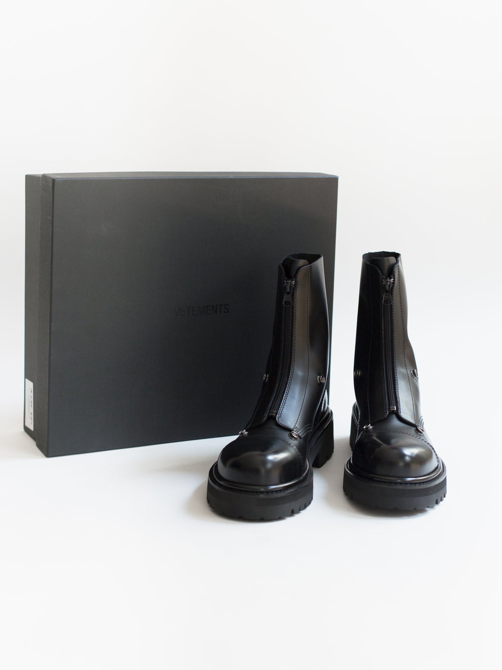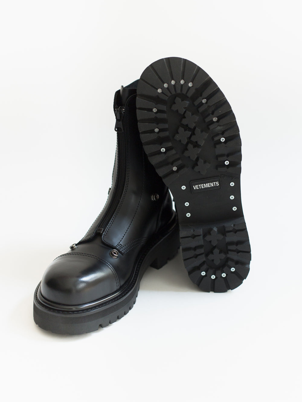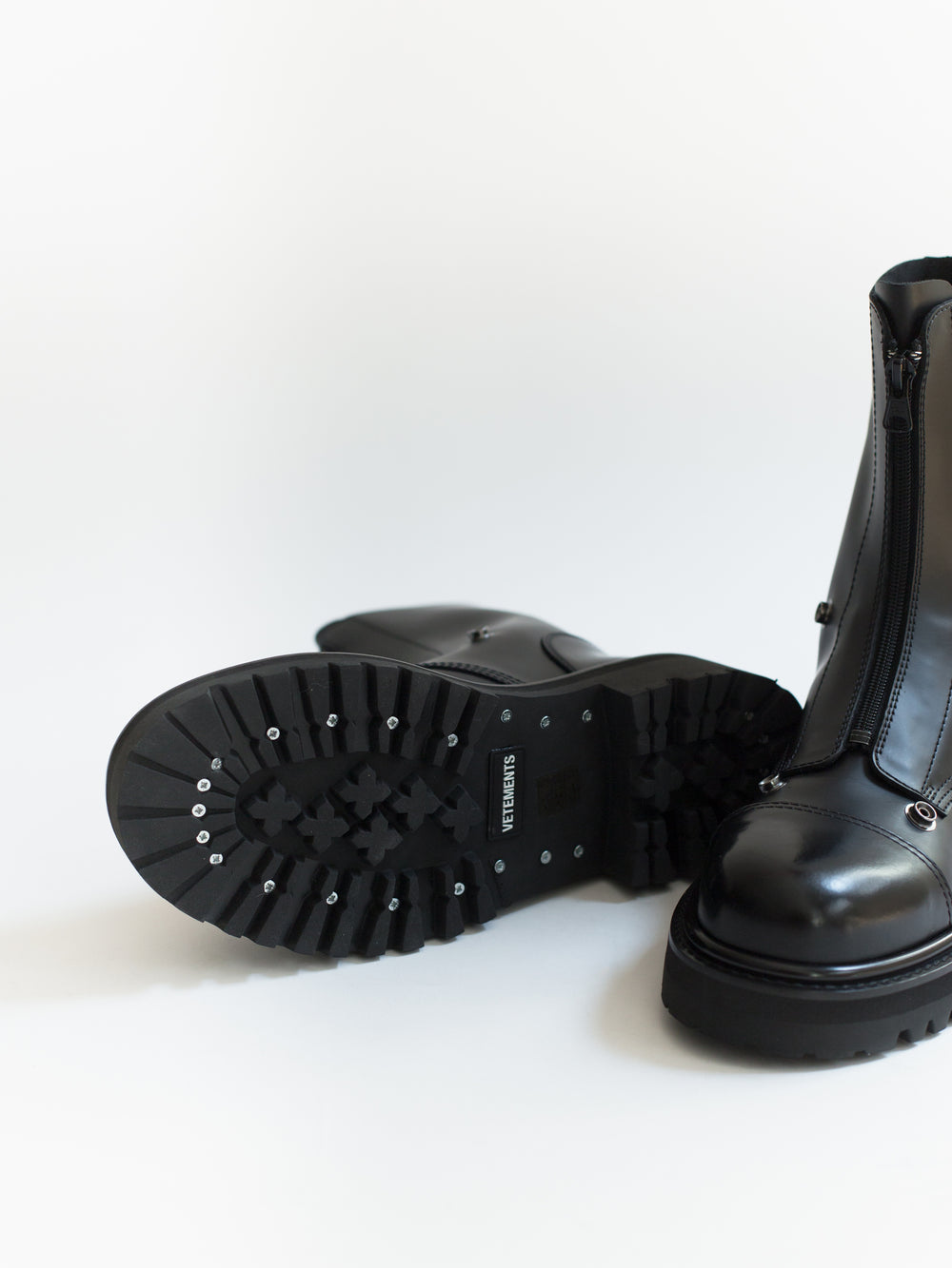 For his final collection at Vetements, Demna played on the uniforms and archetypes found in urban life as he always does, sending models through the McDonald's-turned-runway in mock police uniforms, bathrobes, wrinkled suiting, and sportswear. He has always reminded us of the power of uniform and the authority imbued in it, but also the possibility to appropriate it, twist it, and reuse it for ones own purpose. Since the beginning, he has spoken about wearing secondhand uniforms and being mistaken for security at events. These boots showcase that idea: as the runway evolves from authoritative to managerial to celebrity, then finally to the everyday city-goer, the clothes and costumes change but the boots remain throughout, as if the adoption and appropriation of this aggressive and militaristic footwear has already happened during the course of the show.