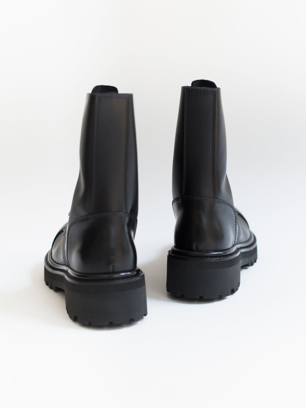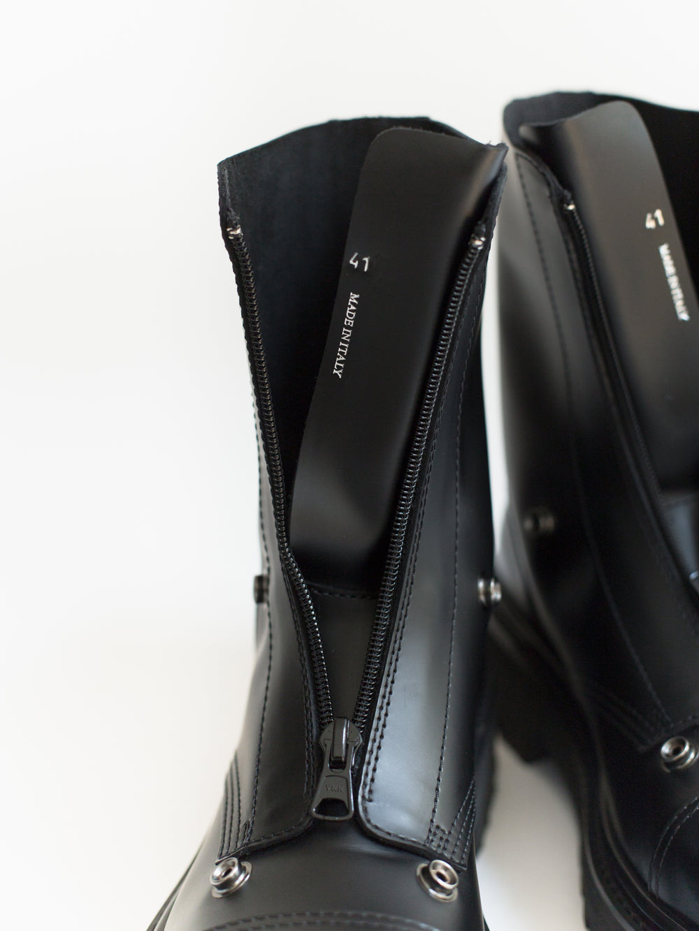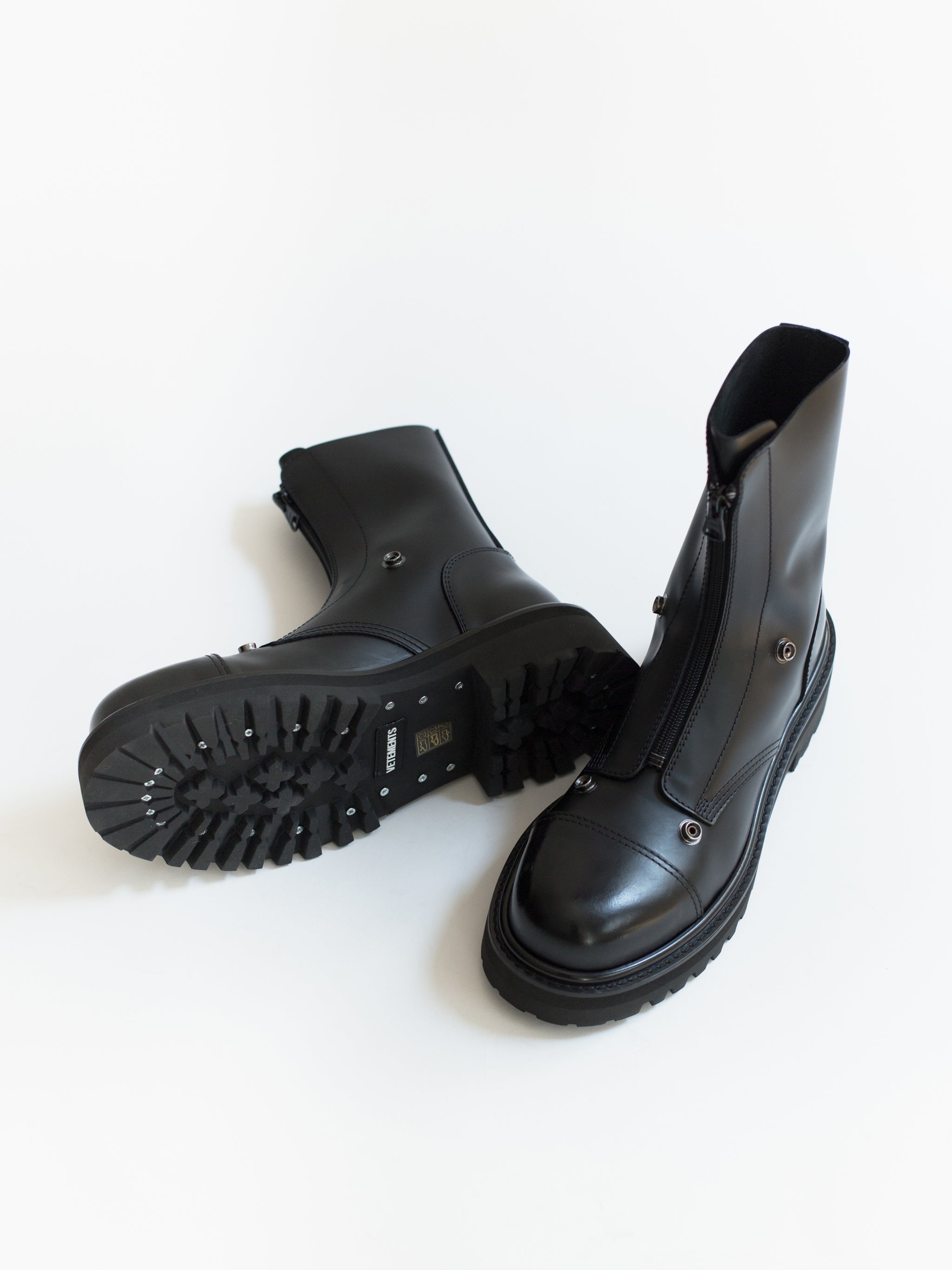 For his final collection at Vetements, Demna played on the uniforms and archetypes found in urban life as he always does, sending models through the McDonald's-turned-runway in mock police uniforms, bathrobes, wrinkled suiting, and sportswear. He has always reminded us of the power of uniform and the authority imbued in it, but also the possibility to appropriate it, twist it, and reuse it for ones own purpose. Since the beginning, he has spoken about wearing secondhand uniforms and being mistaken for security at events. These boots showcase that idea: as the runway evolves from authoritative to managerial to celebrity, then finally to the everyday city-goer, the clothes and costumes change but the boots remain throughout, as if the adoption and appropriation of this aggressive and militaristic footwear has already happened during the course of the show.