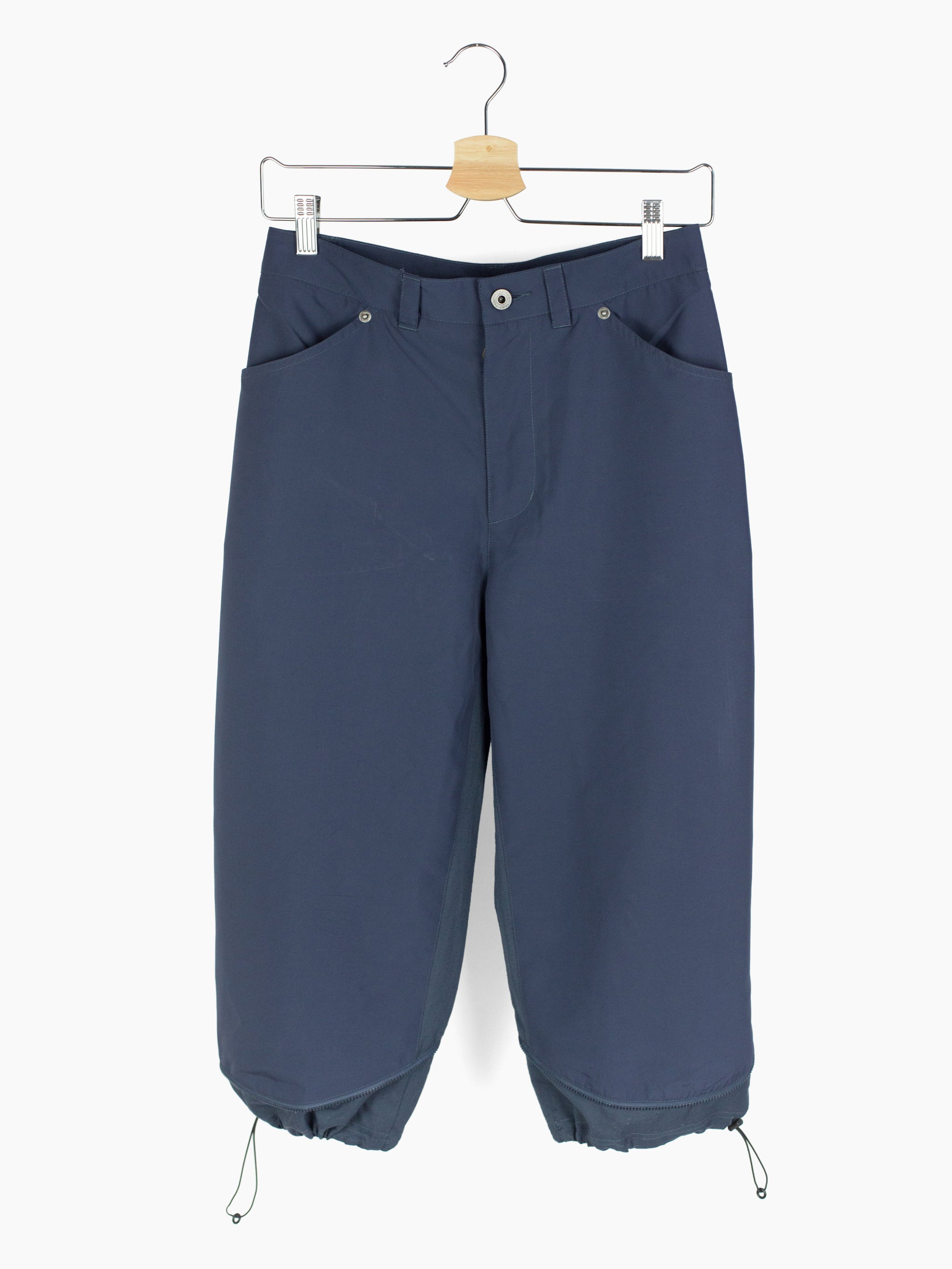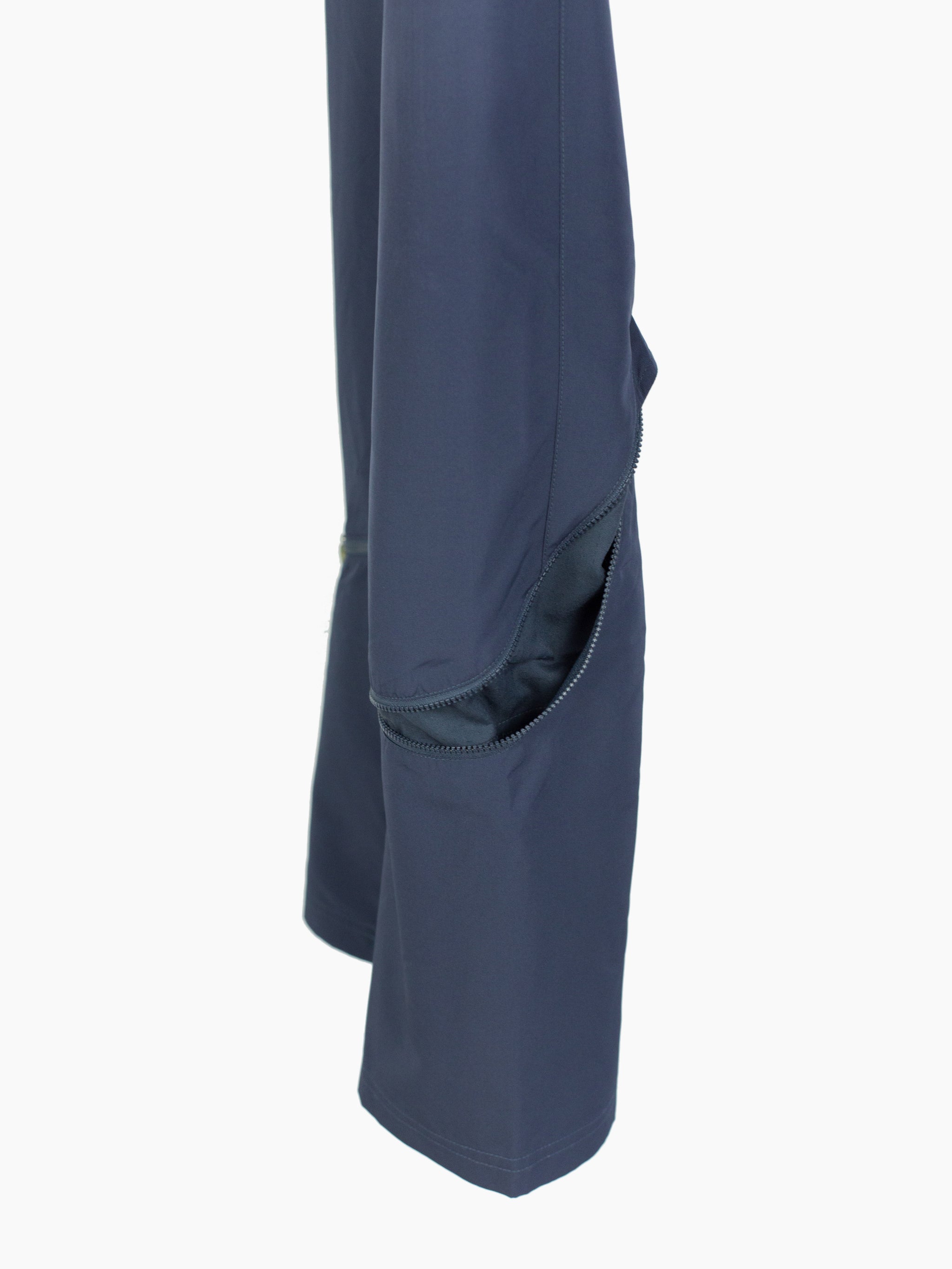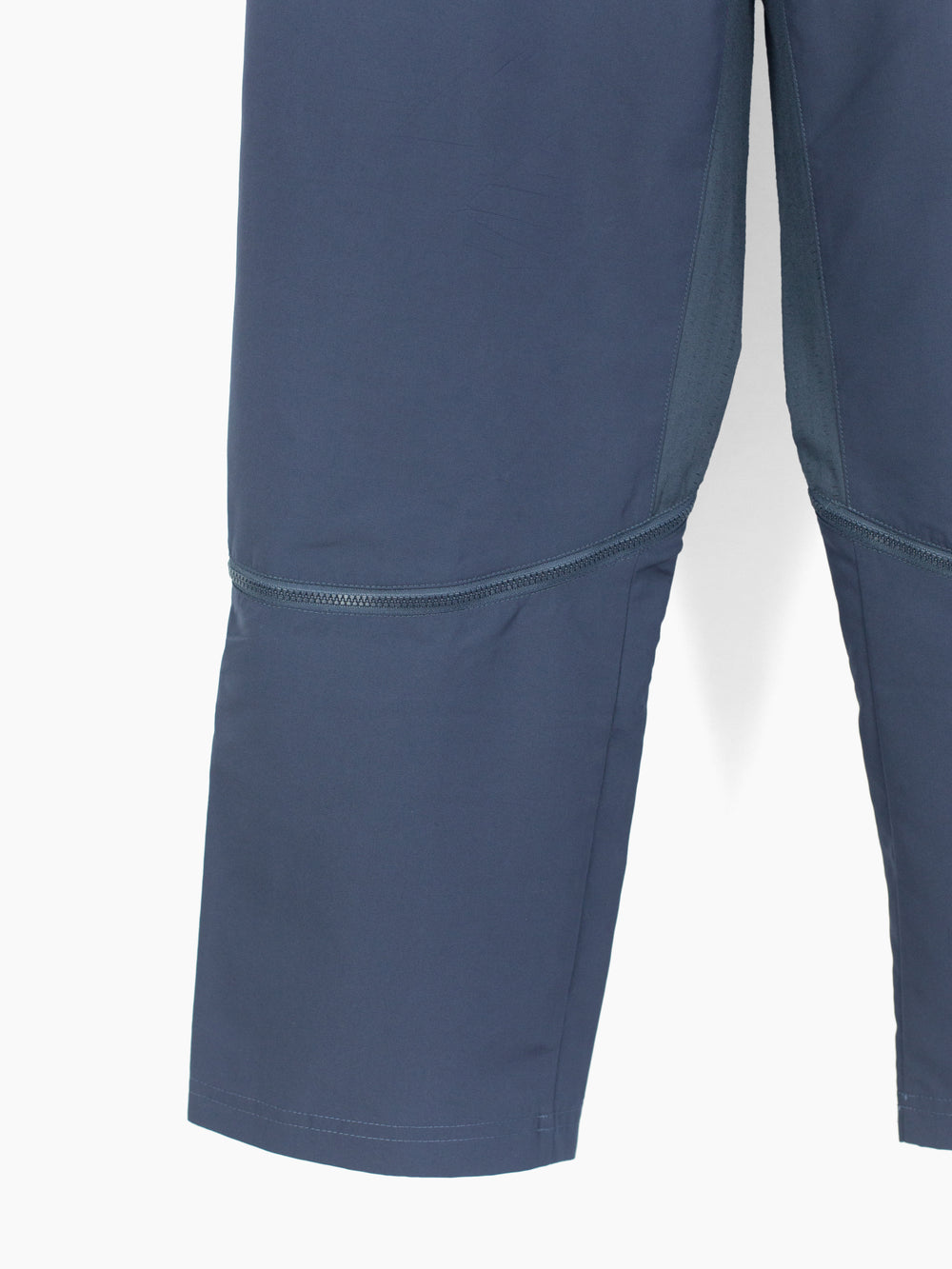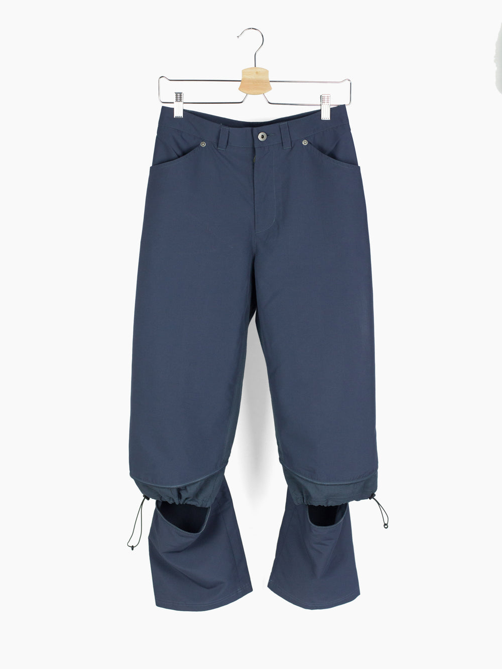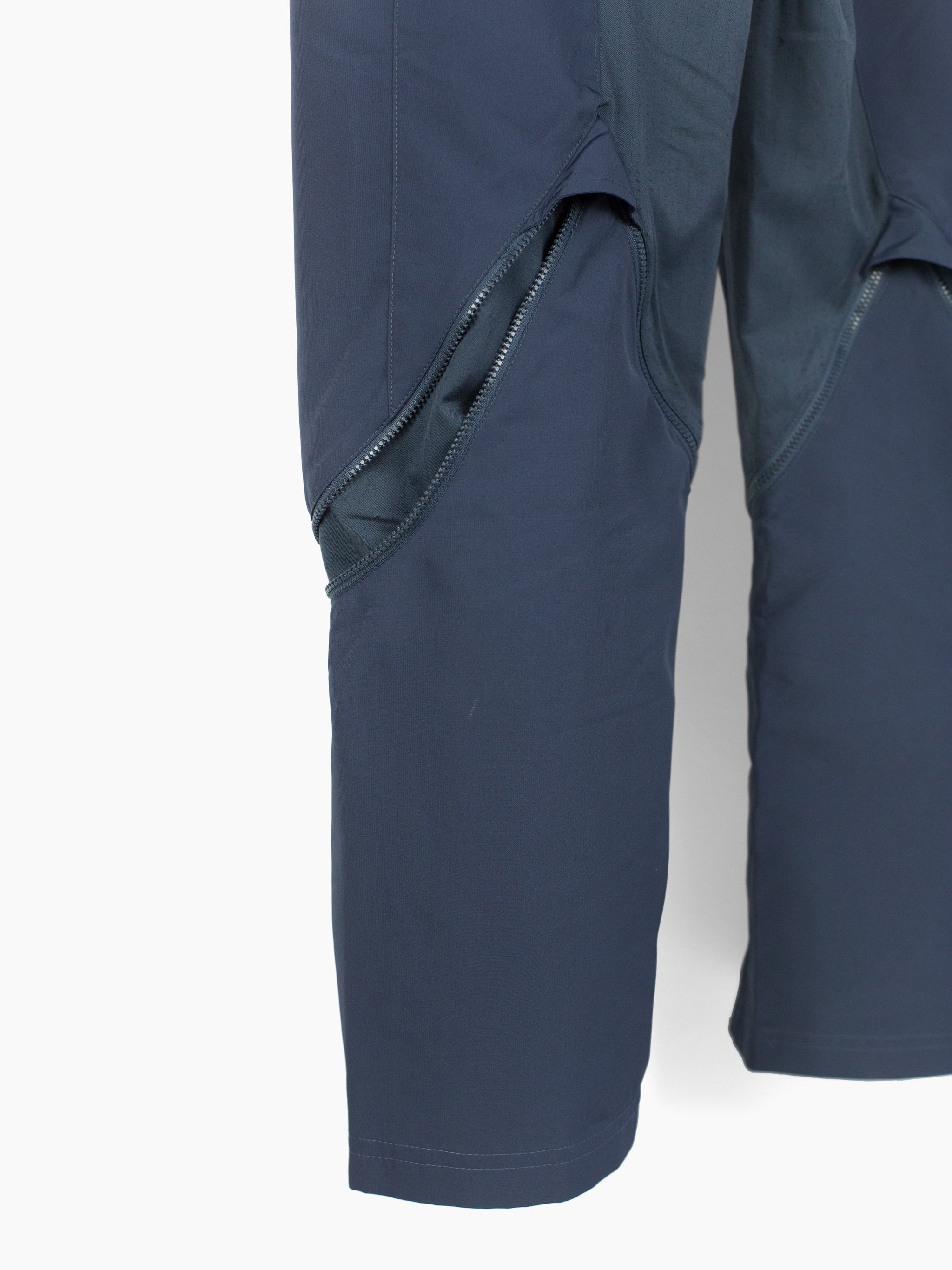 These Vexed Generation Puma trousers address the needs of active urban inhabitants with their convertible, composite construction. Iterating on a traditional jean-style trouser, these pants are able to transform from a full length trouser into a 3/4 short with curved zippers set at the lower leg. They feature highly breathable laser-cut softshell zoned in high exertion/perspiration areas like at the crotch/inner legs and behind the knee where a cinchable layered gaiter provides below-the-knee coverage when the lower legs are removed. The seat flips the traditional yoke by setting a center hook loop and two back pockets onto the seam (secured by rivets). Their tapered, canted openings keep items secure while their curved inner corners further the organic-anatomical-technical aesthetic put forth by the sweeping leg zippers.