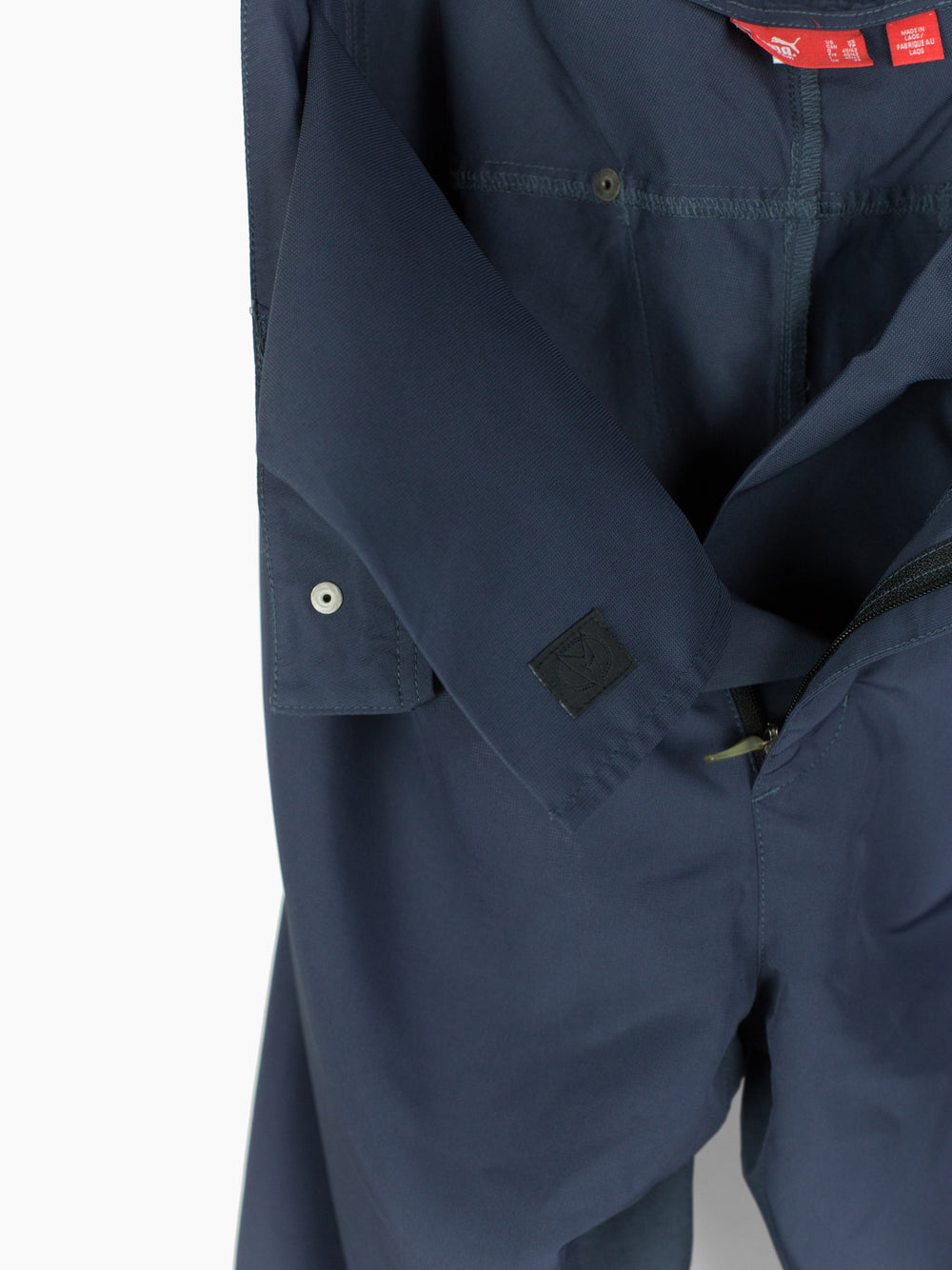 Finished with shank button waist closure and zipper fly, riveted pocket corners, and shockcord cinch at interior layered leg gaiter.