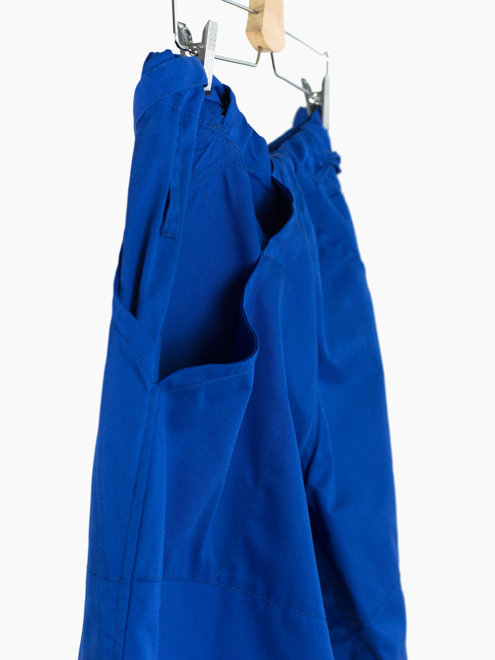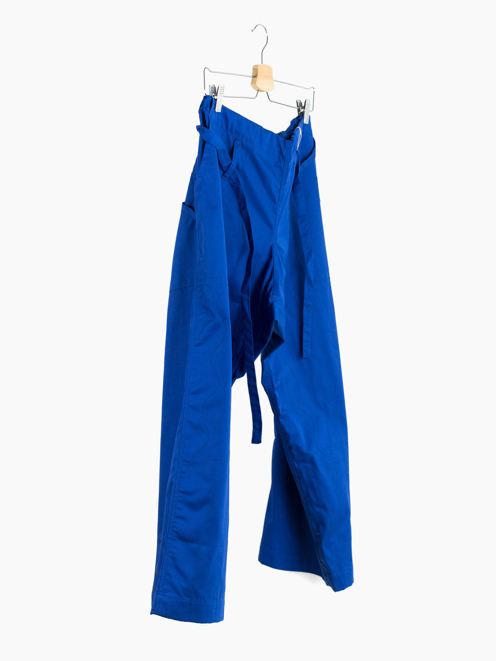 From the inaugural Wave of Sand collection, the Bagi is a wide, cropped iteration of the Gigi, both fusing the hard-wearing utilitarian fabric of workwear and free-flowing accommodating form of martial arts gi pants. They feature an oversize tie-down waist and gusseted crotch for freedom of movement. The front is double-faced for added durability, with the extra layer of fabric reinforcement attached with a 'wave' pattern quiltstitch. The back features innovative construction, with an angled fabric panel acting as back pocket, seat reinforcement, and belt loop all in one. Finished with reflective branded logo patch at the wearer's left hip and two slash front pockets.