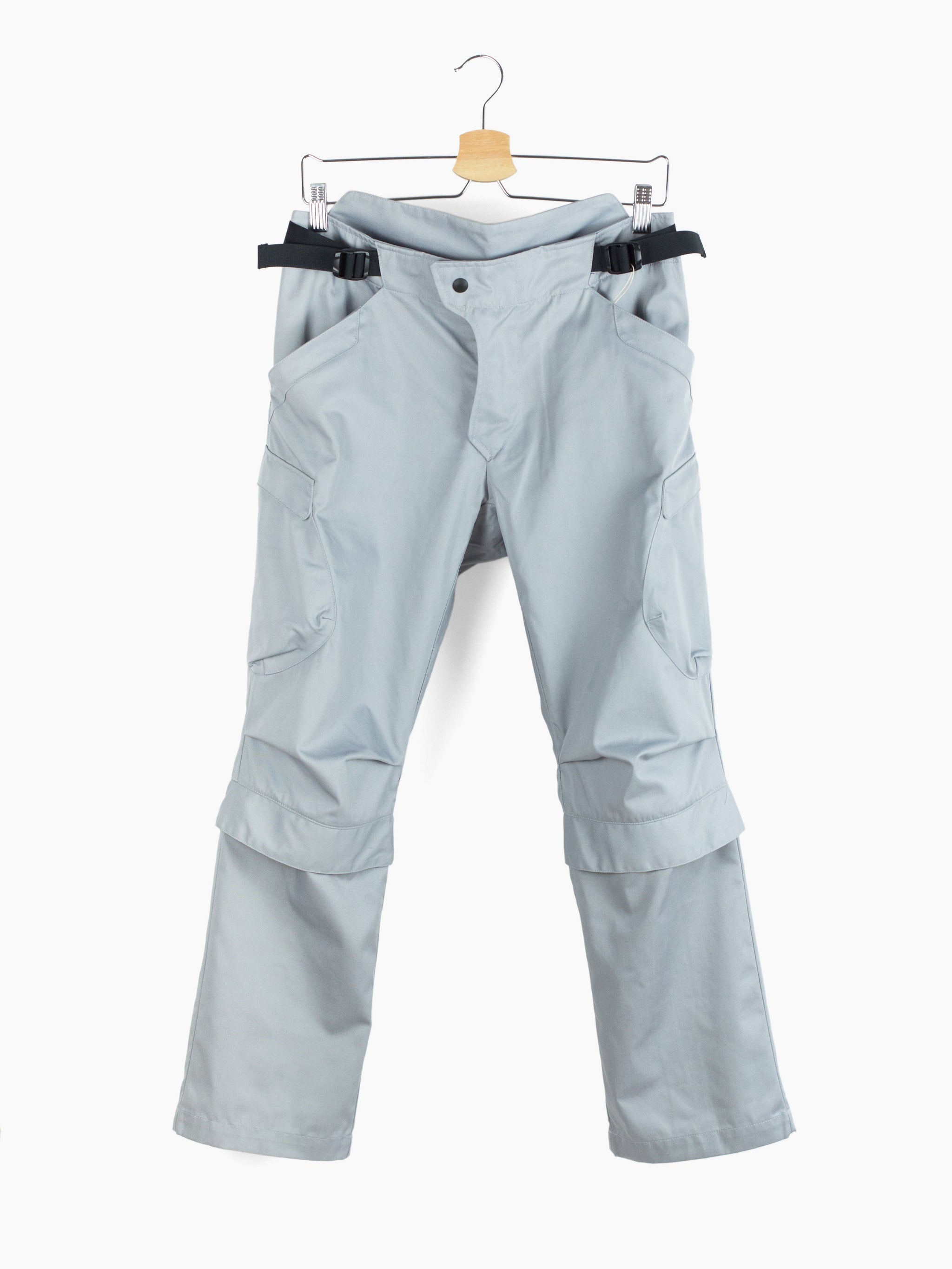 Cut with a mid rise, straight leg and slight taper. Pleated articulated knee creates a bent leg shape while adjustable back calf cinch can create a subtle kick flare silhouette.